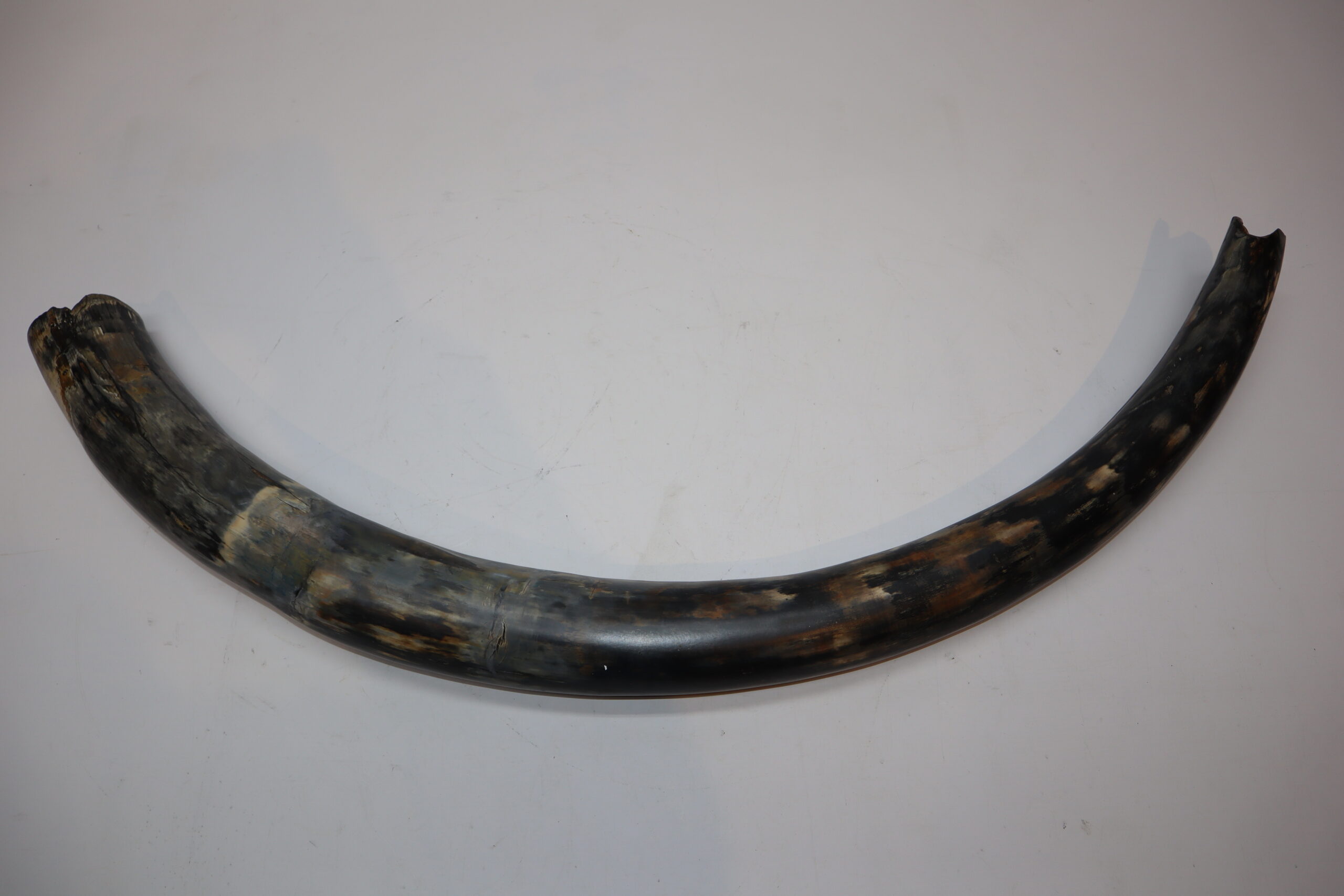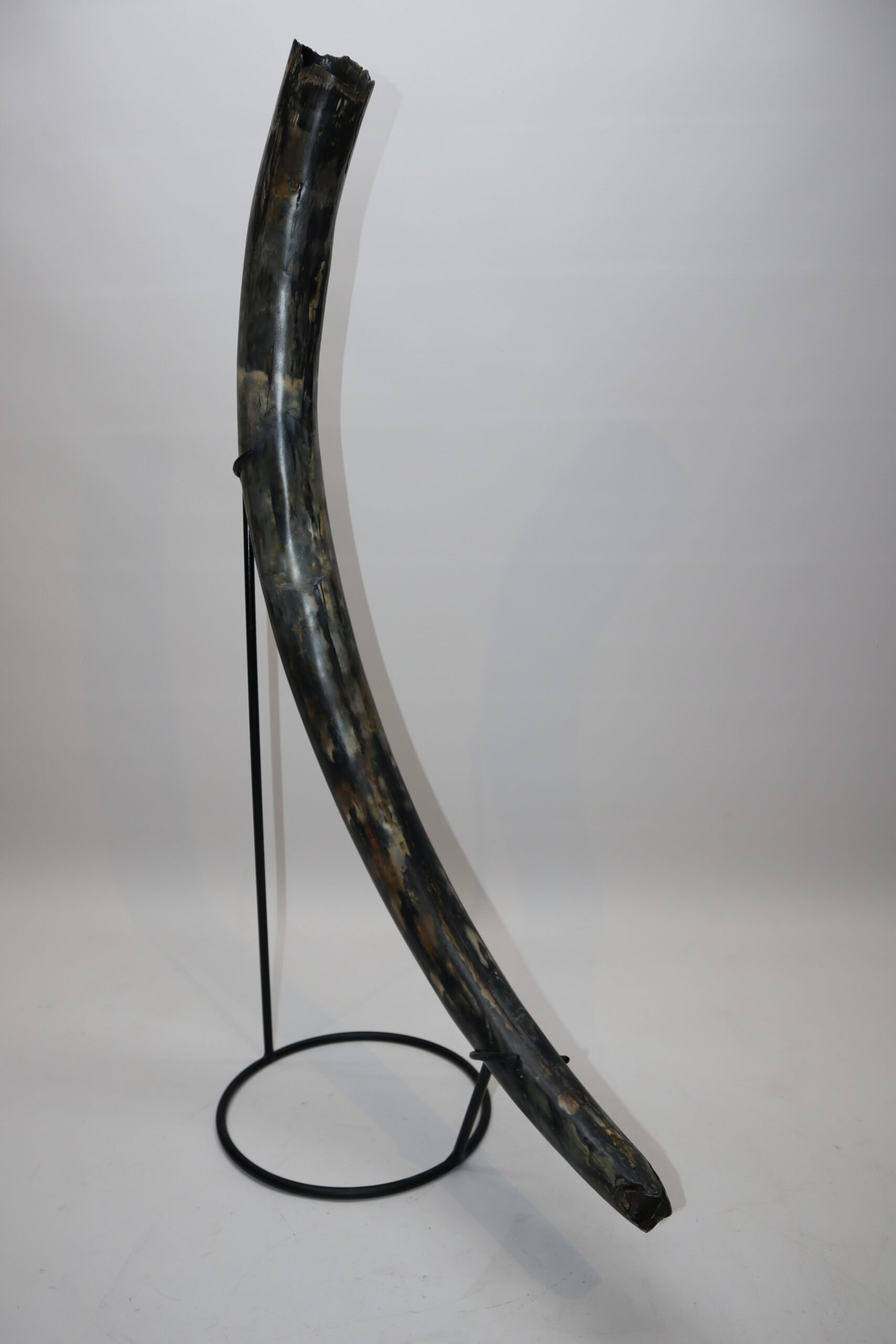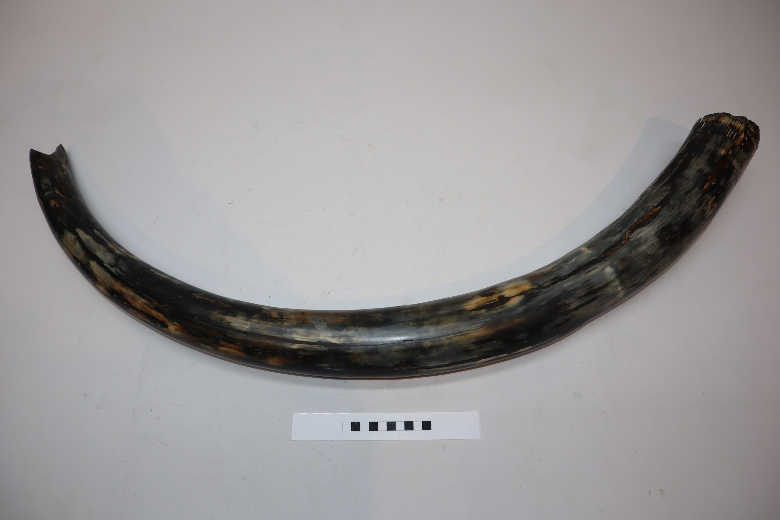 On offer is a complete and beautiful tusk of a Woolly Mammoth from the Pleistocene era. The tusk measures 120 cm (47.2 in) over the curve and is a truly marvellous piece. The item has a nice strong curve and beautiful elegant shape. The fantastic colouring is mostly black but also wonderful and rare blue and grey ivory, and with stunning patterning. The item will not only be the jewel of your collection, but will also make for a very impressive addition to your home. The pictures speak for themselves! This tusk would have belonged to an old female Mammoth and is in wonderful and nearly intact condition, only the tip of the tusk is missing. A crack has been repaired as seen in the photos, otherwise there is no restoration whatsoever. Most interesting piece. A matt finish has been applied to this piece, but it is also possible to order it with a glossy finish. The black-and-white section of the ruler represents 10 cm / 3.9 inch.