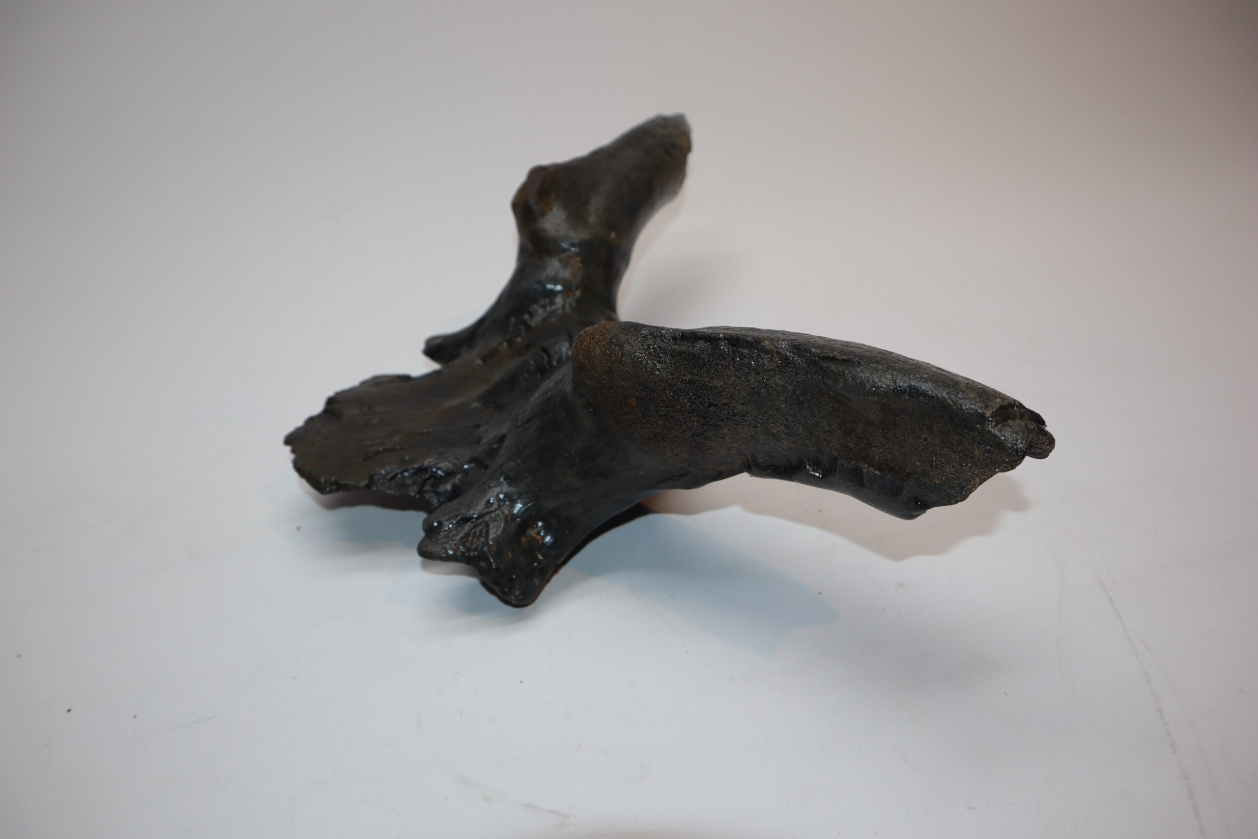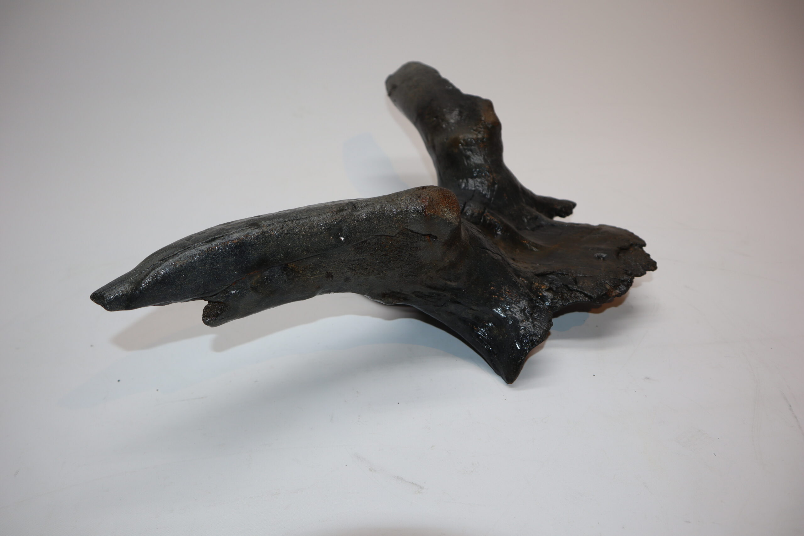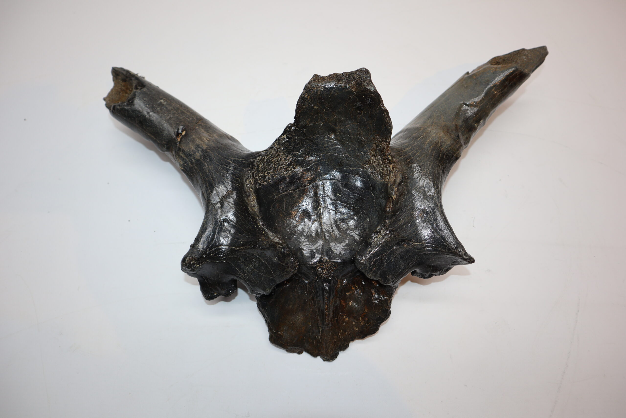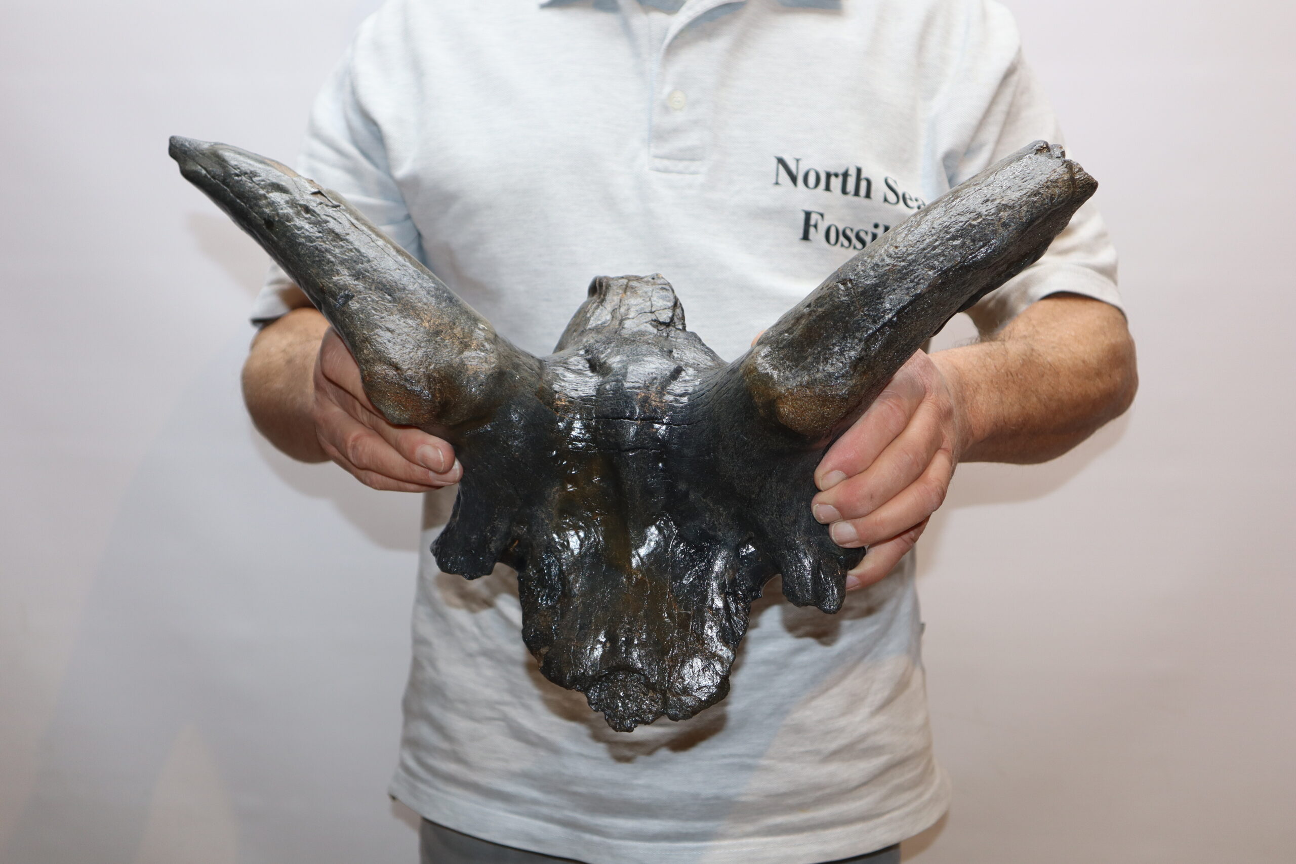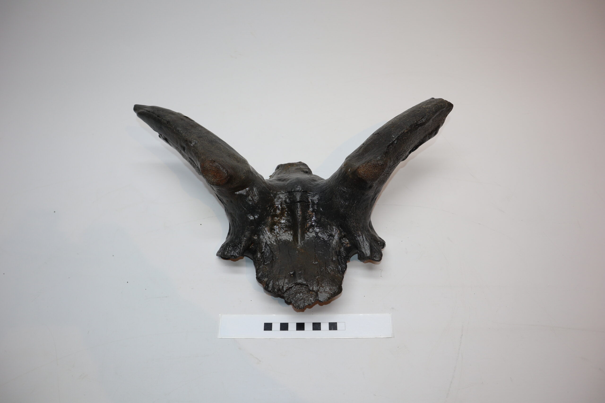 Irish elk was one of the most impressive creatures to inhabit the North Sea area. Its amazing antlers could grow to enormous sizes and are among the most sought after and expensive fossils. On offer is a large portion of the cranium of this animal, including two partially preserved antlers. The cranium is not complete (as they rarely are), but is in nice condition. No restoration whatsoever. The black-and-white section of the ruler in the image represents 10 cm / 3.9 inch.