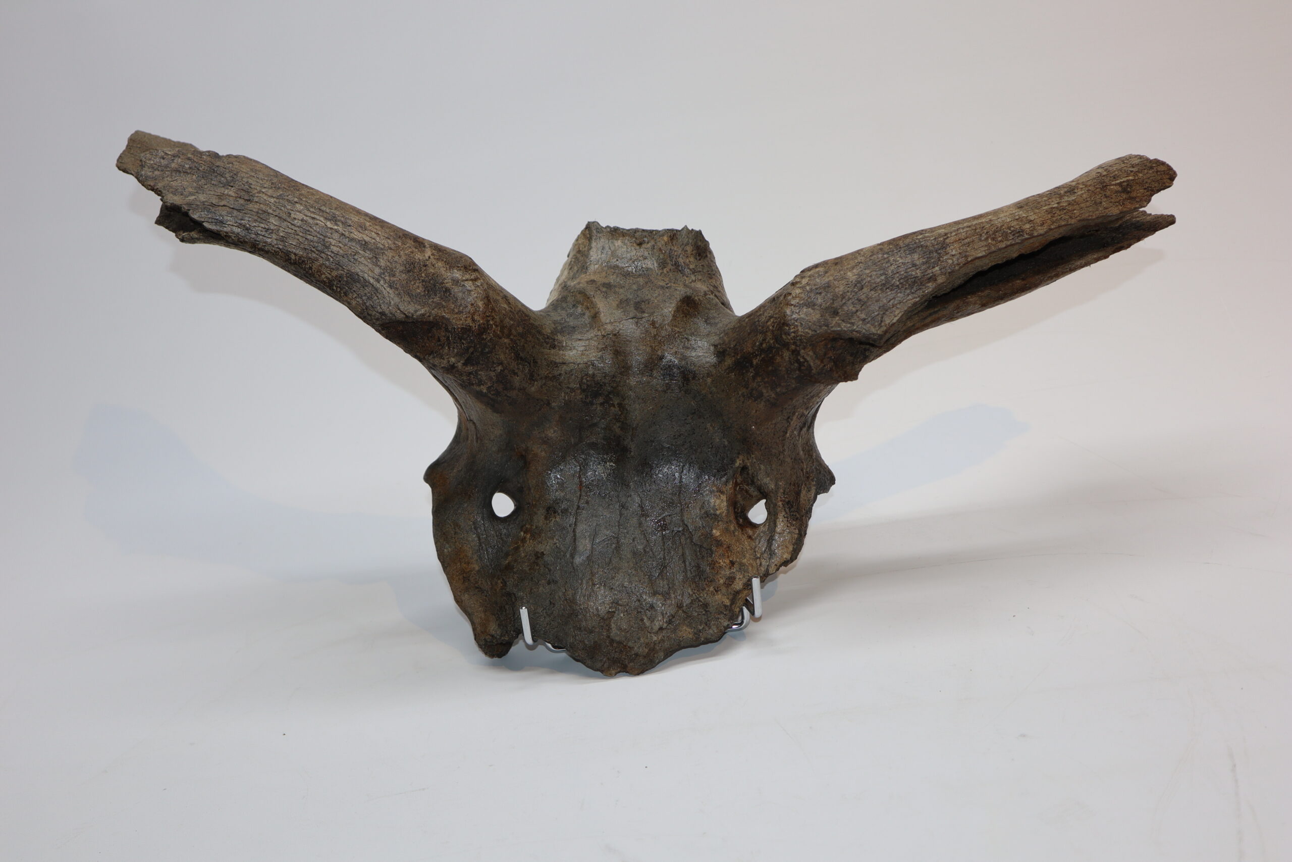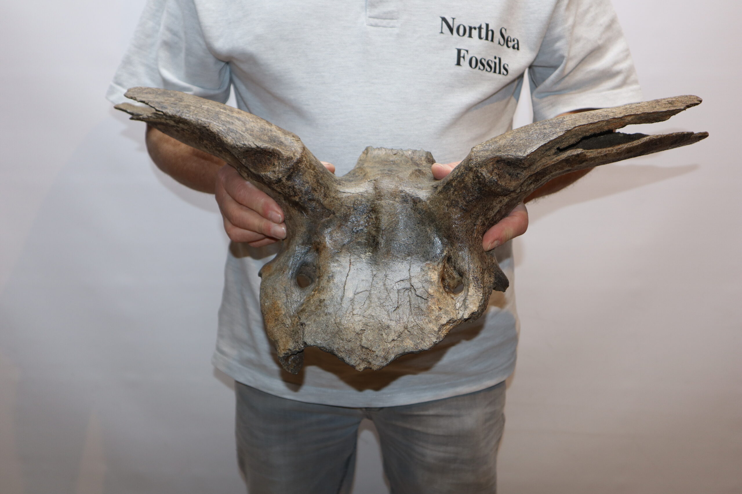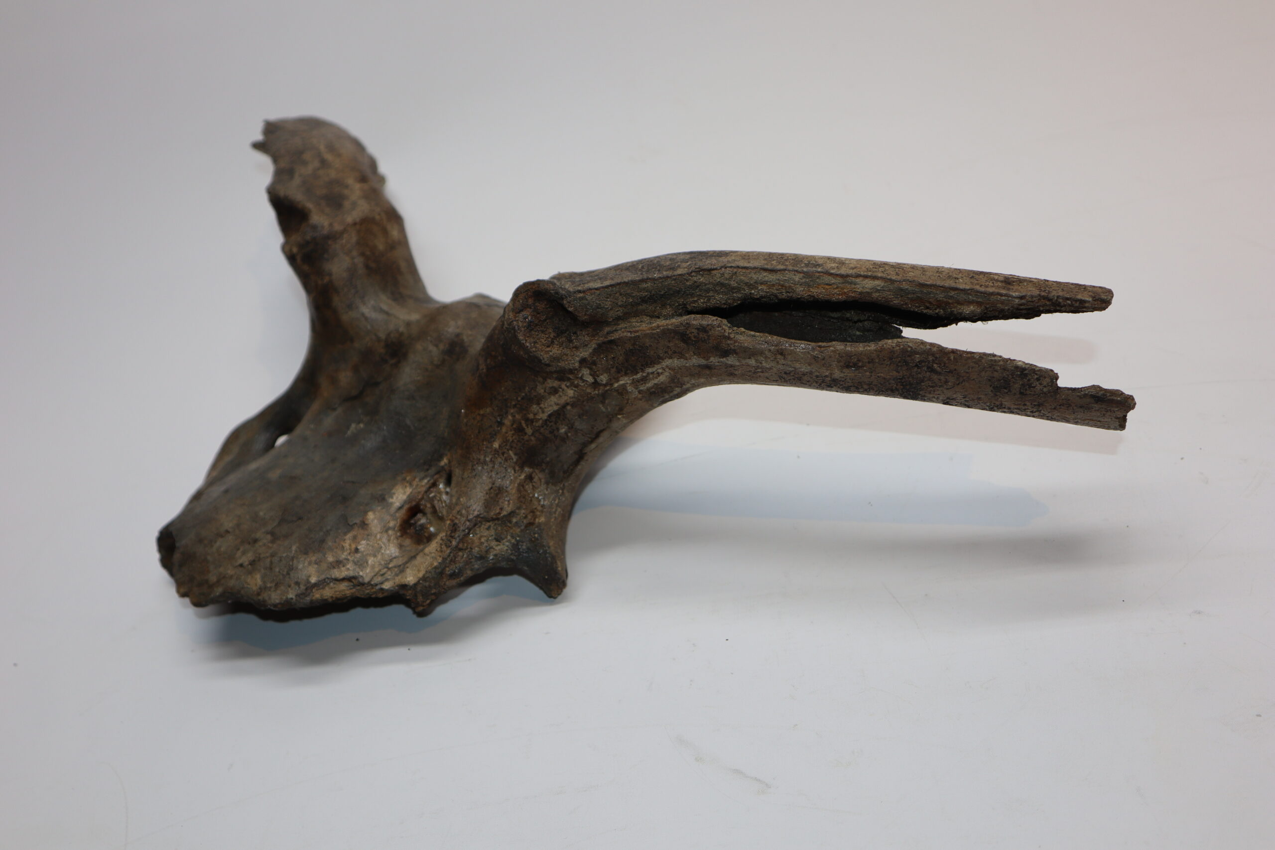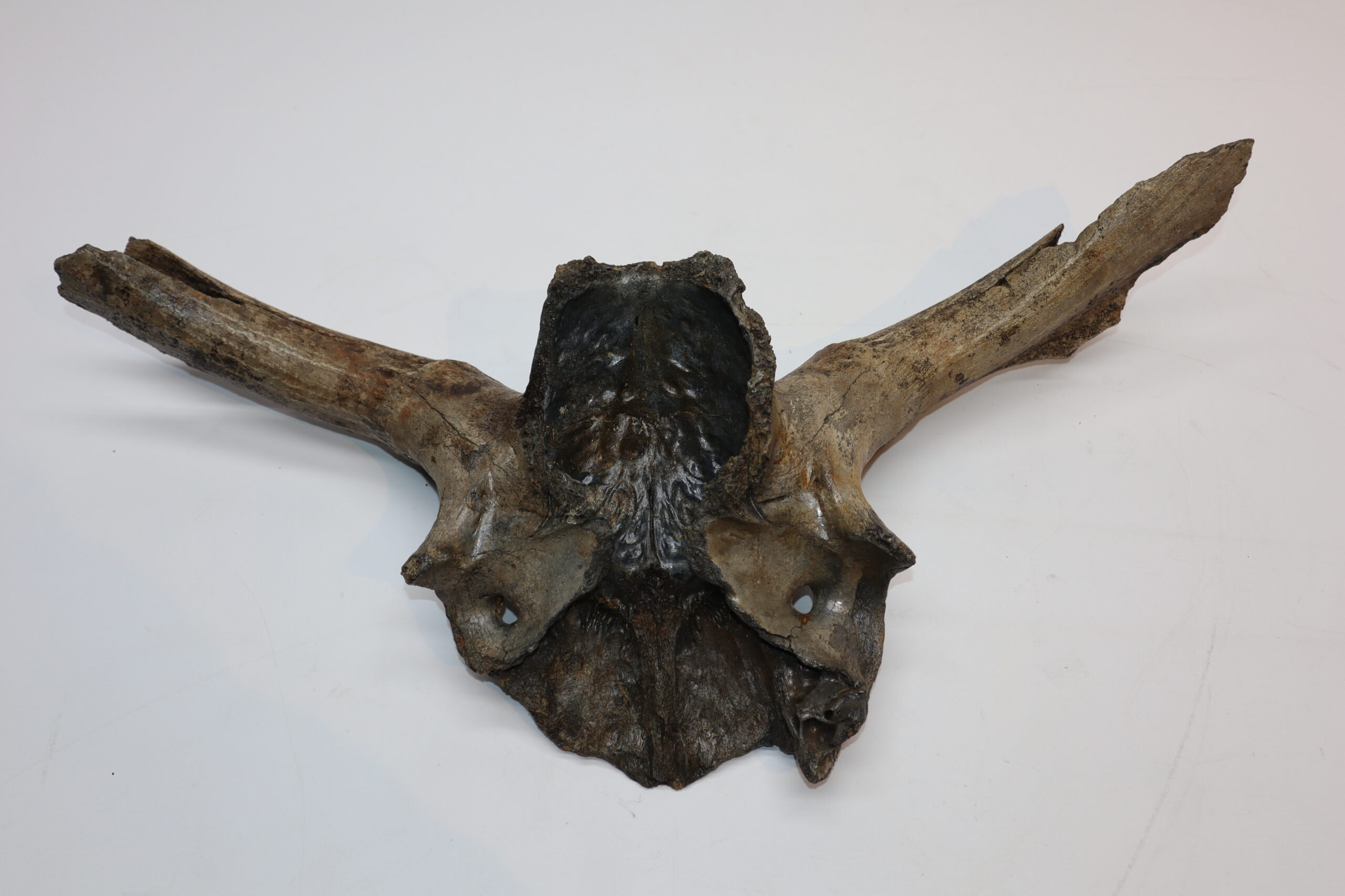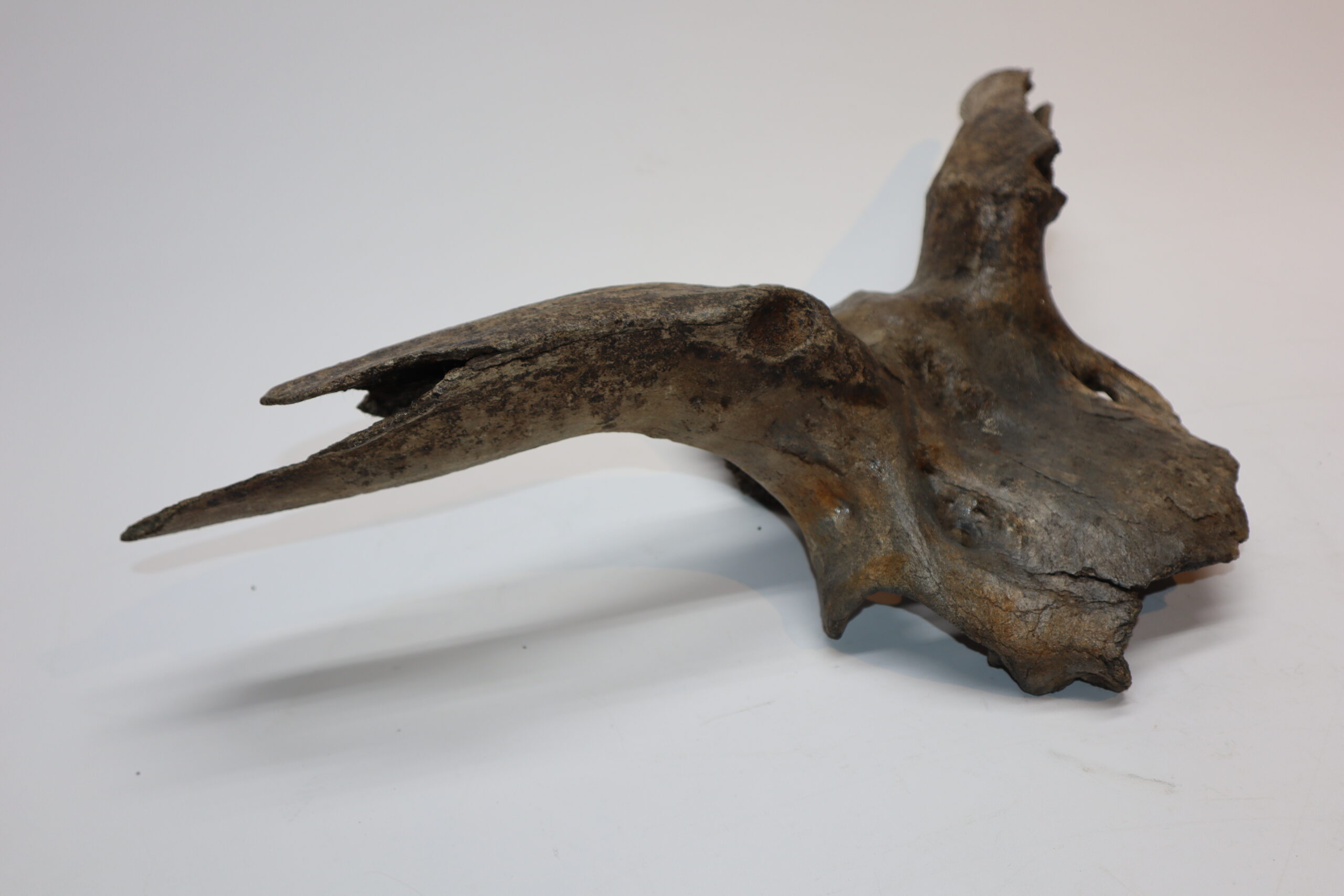 Irish elk was one of the most impressive creatures to inhabit the North Sea area. Its amazing antlers could grow to enormous sizes and are among the most sought after and expensive fossils. On offer is a large portion of the cranium of this animal, including two partially preserved antlers. The cranium is not complete (as they rarely are), but is in nice condition. No restoration whatsoever. The black-and-white section of the ruler in the image represents 10 cm / 3.9 inch.