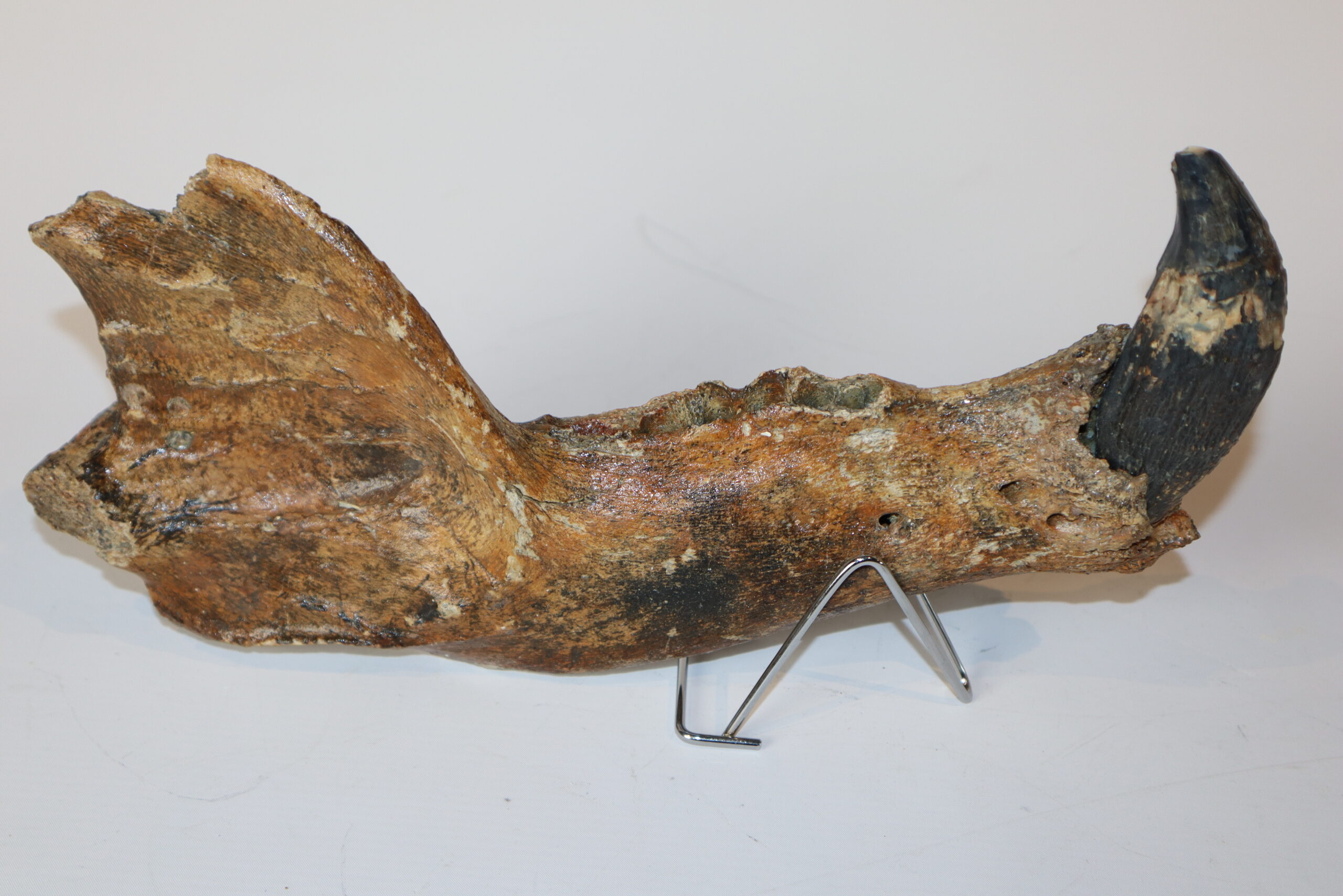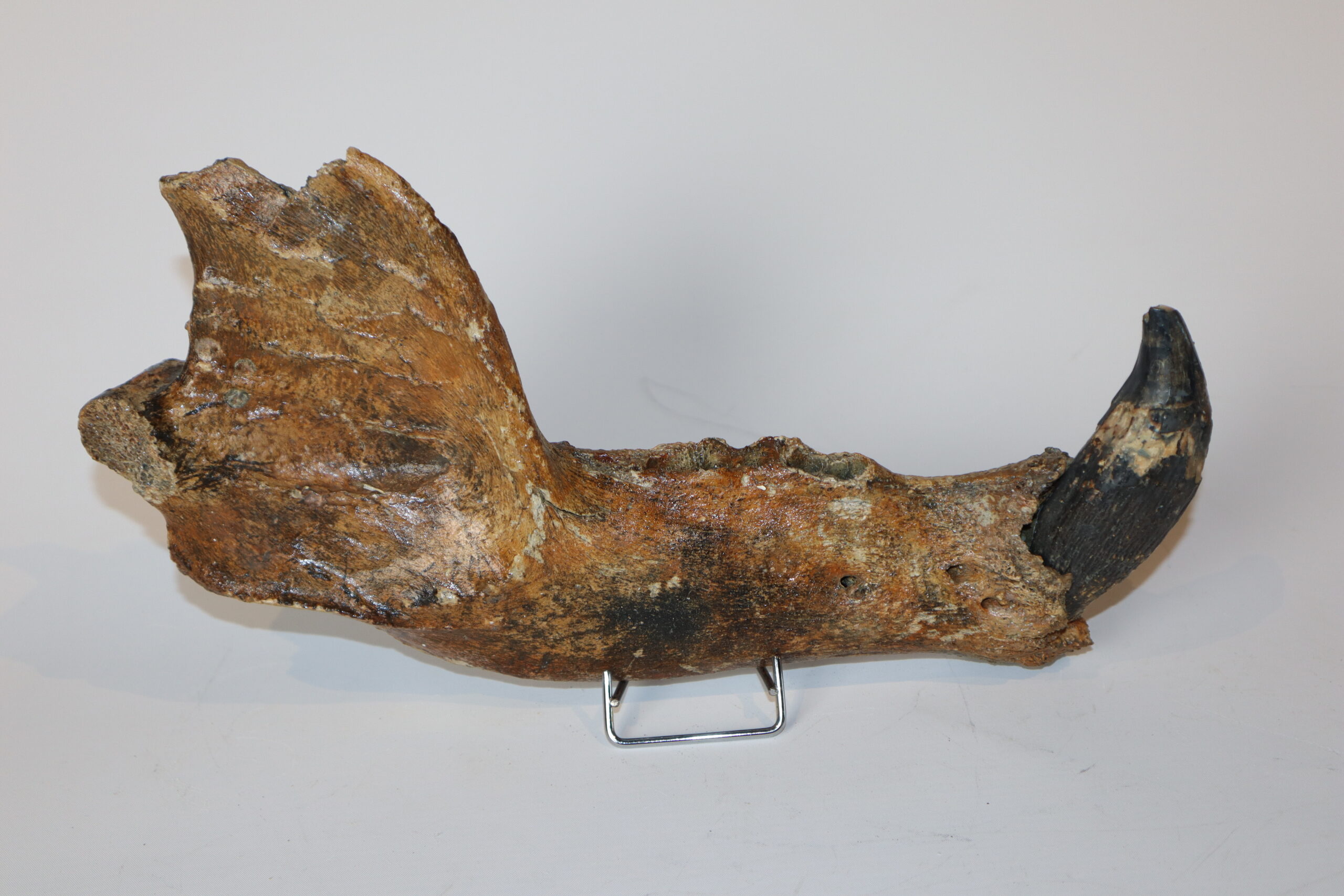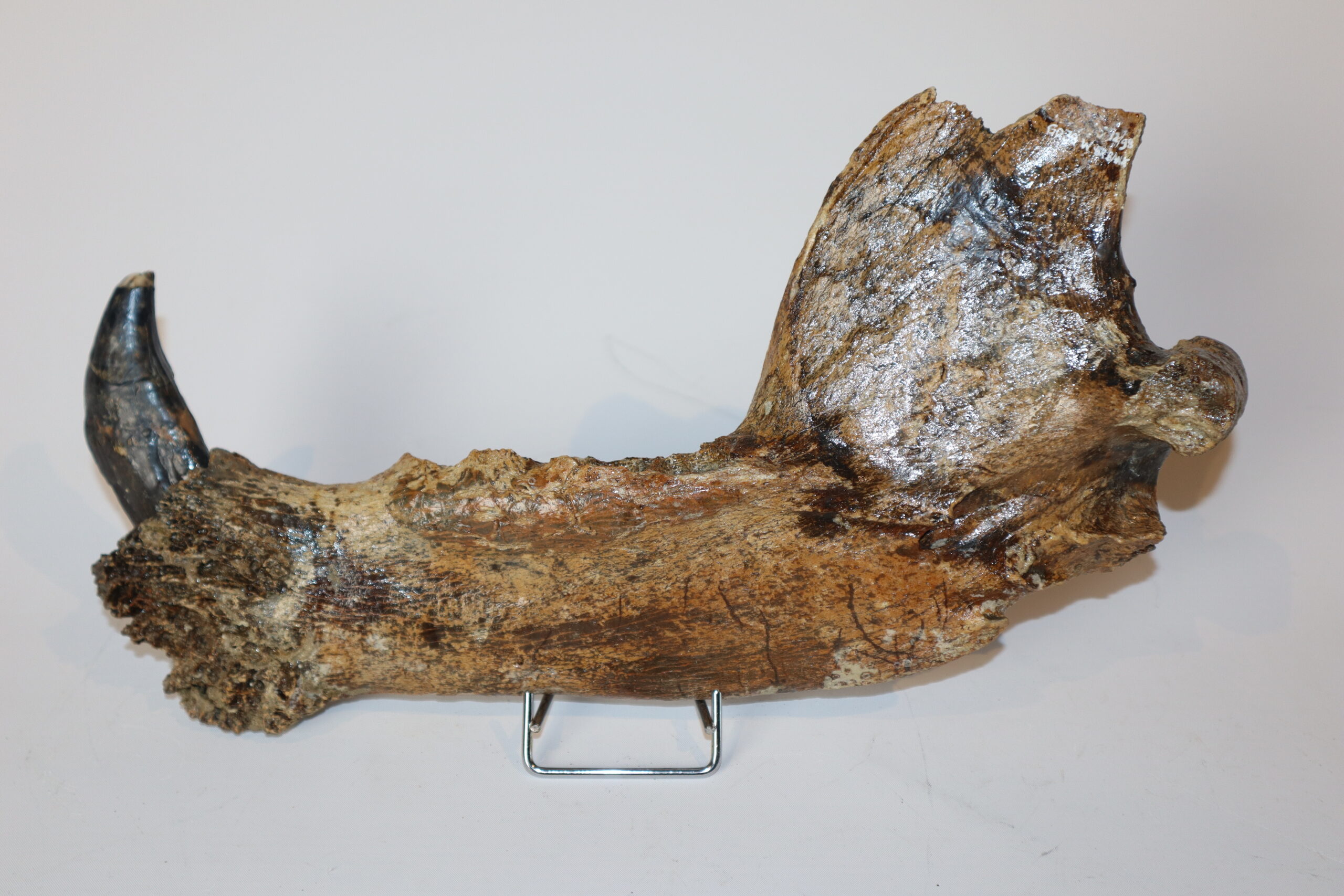 On offer is a rare and fantastic half lower jaw of a European brown bear (Ursus arctos) from the Pleistocene era. We cannot stress enough how rare fossils of this impressive species are. Most bear fossils which are offered on the market belong to cave bears, rather than the very rare brown bear. This fossil belonged to an adult animal. Although it is only a half jaw it is in a wonderful state of preservation, with one canine still attached, as seen in the images. No restoration whatsoever. Very rare piece, wonderful for the specialized collector. The black-and-white section of the ruler in the image represents 10 cm / 3.9 inch.