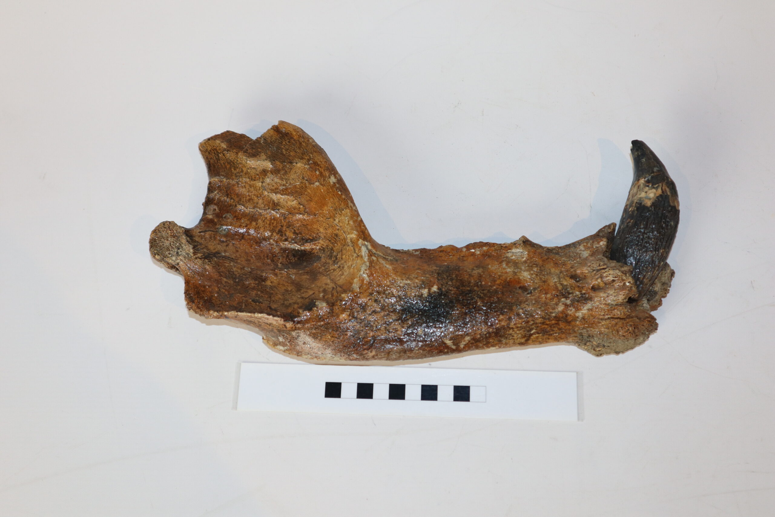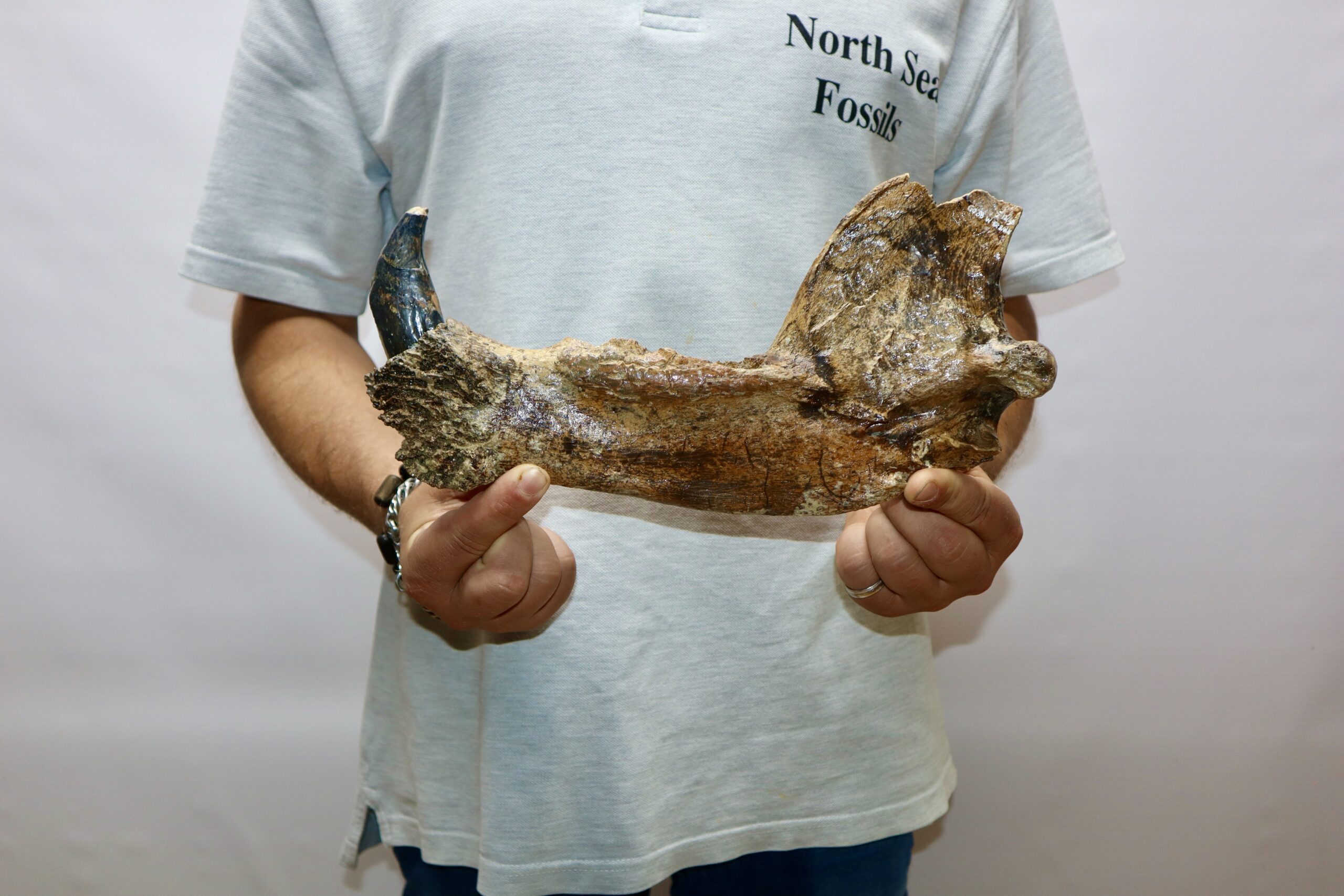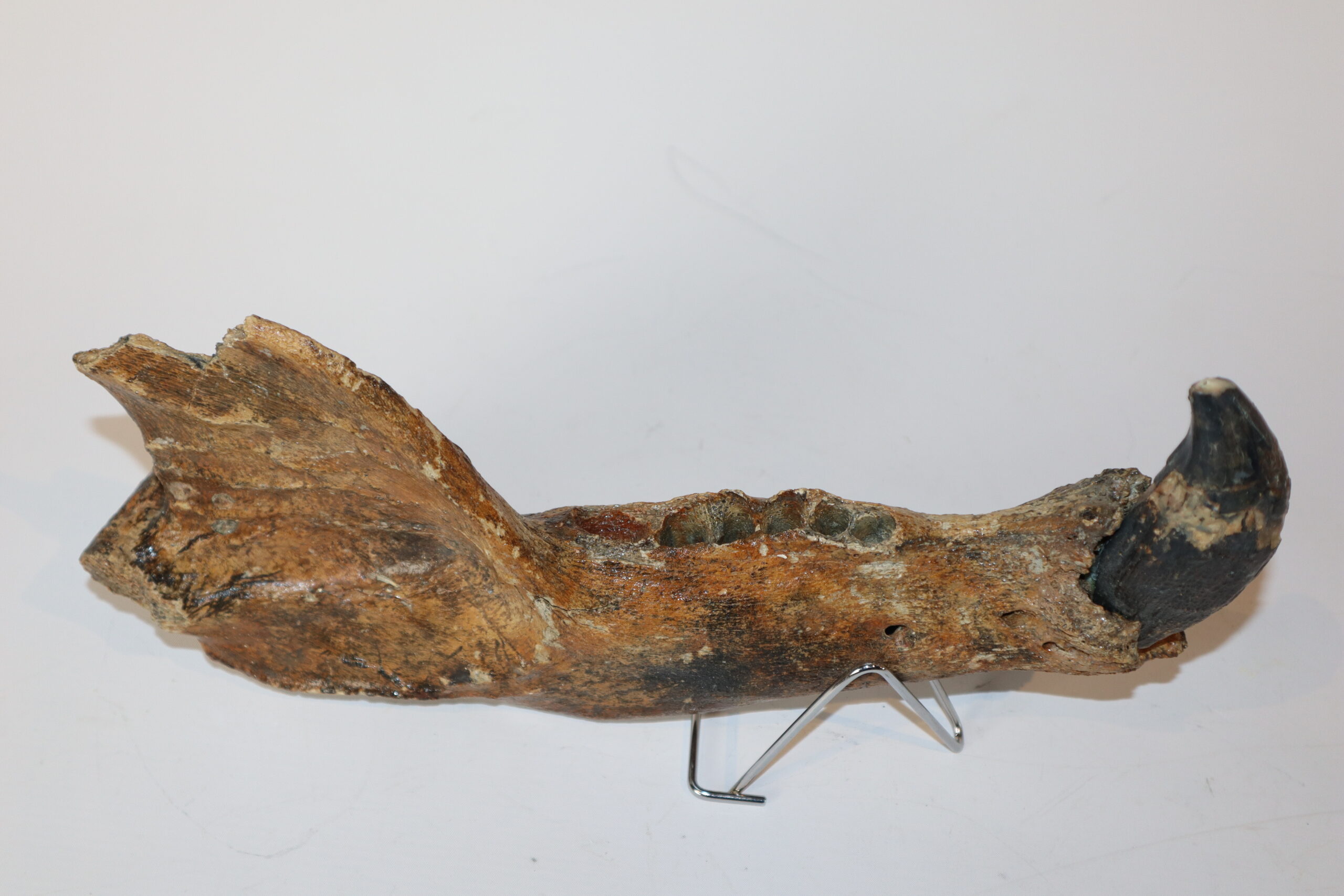 On offer is a rare and fantastic half lower jaw of a European brown bear (Ursus arctos) from the Pleistocene era. We cannot stress enough how rare fossils of this impressive species are. Most bear fossils which are offered on the market belong to cave bears, rather than the very rare brown bear. This fossil belonged to an adult animal. Although it is only a half jaw it is in a wonderful state of preservation, with one canine still attached, as seen in the images. No restoration whatsoever. Very rare piece, wonderful for the specialized collector. The black-and-white section of the ruler in the image represents 10 cm / 3.9 inch.