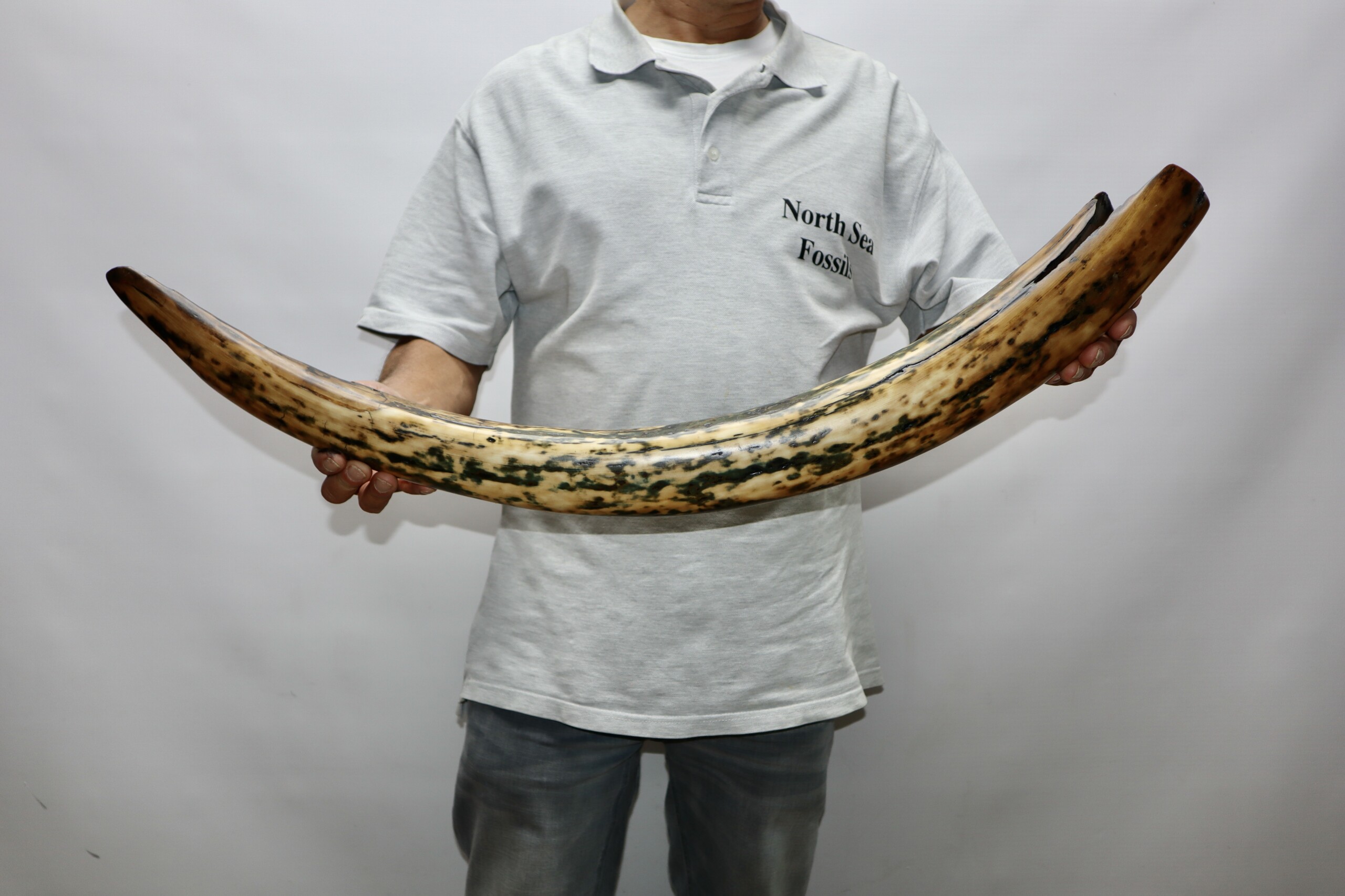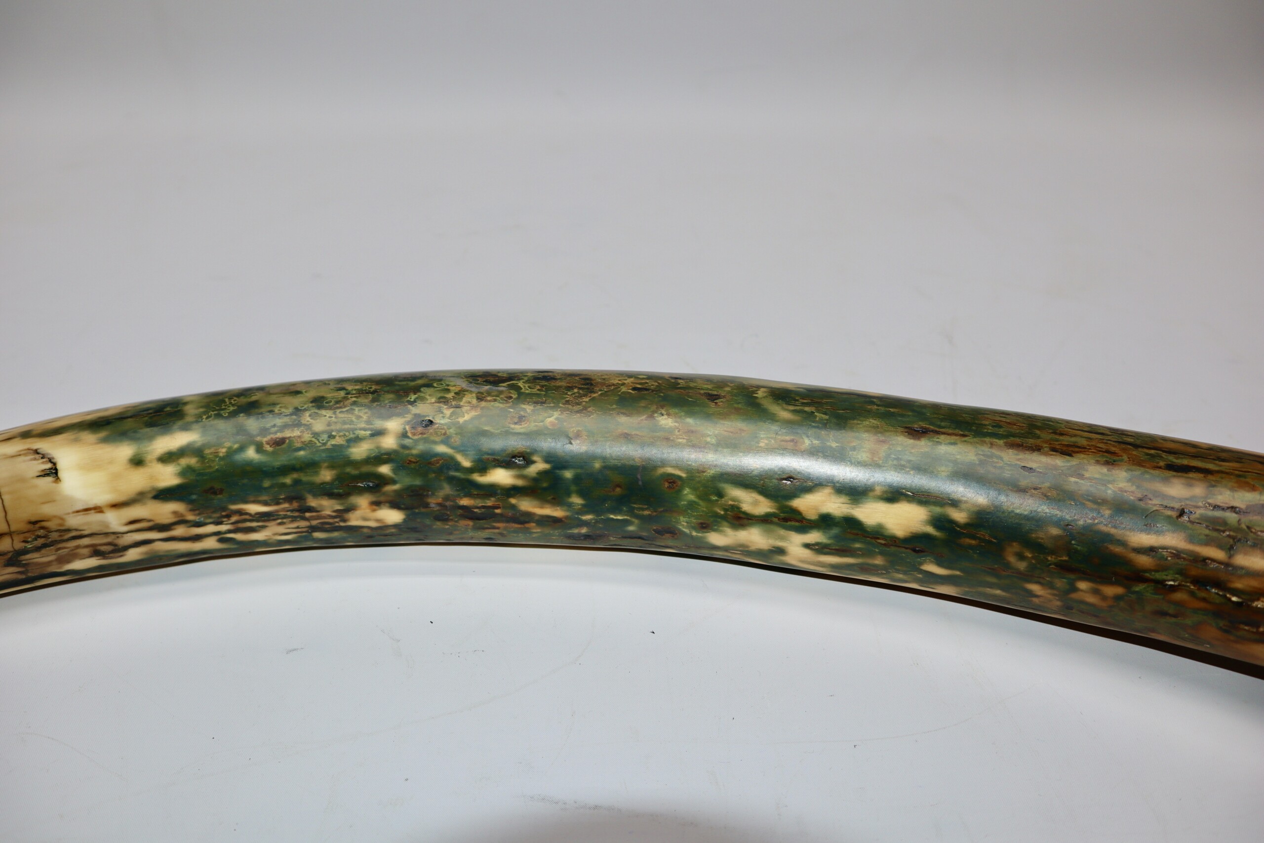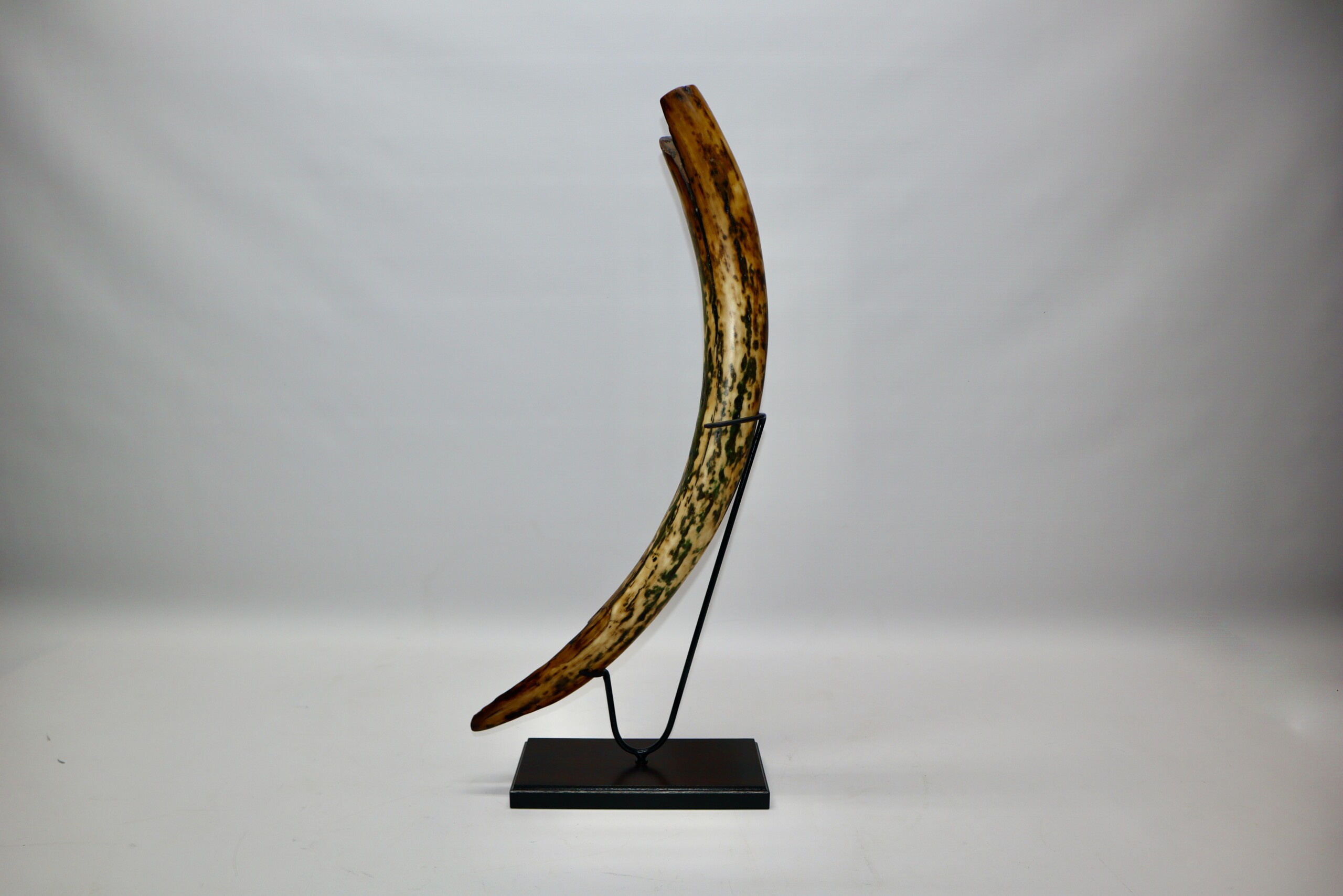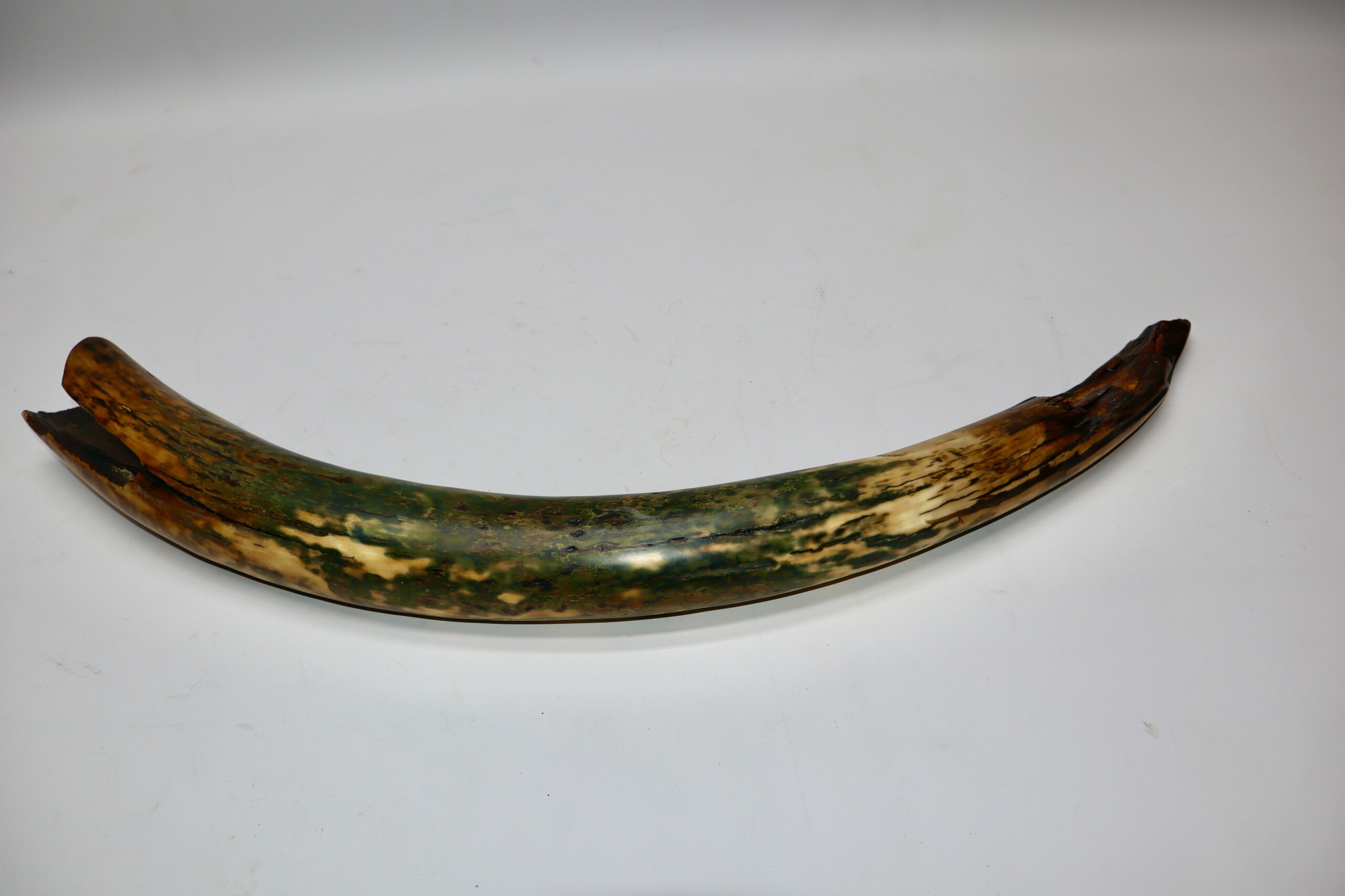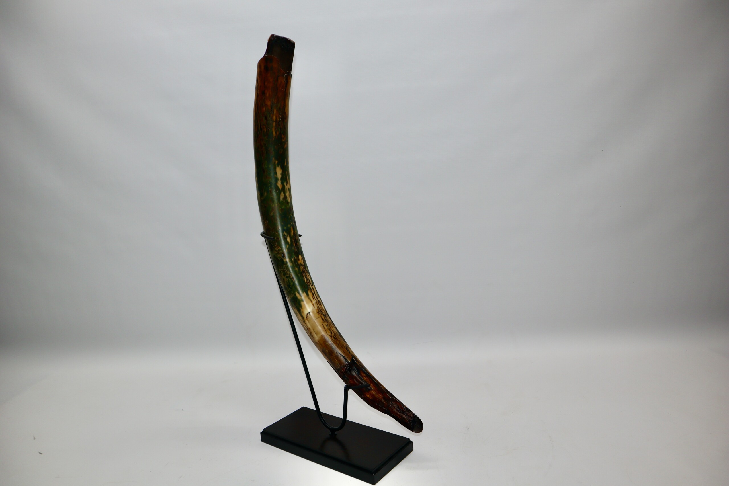 On offer is a fantastic half tusk of a female Woolly Mammoth from the Pleistocene era. This is the middle part of the tusk, the tip and base are missing. No restoration whatsoever. Very good condition. This tusk piece is of beautiful ivory of mainly white, grey, gold and brown ivory, but also some fantastic blue and green colouring. Stunning patterning. Fantastic piece and highly recommended. The black and white section of the ruler in the image represents 10 cm / 3.9 inch. This piece has been applied with a matt finish, but it is also possible to order it with a glossy finish.