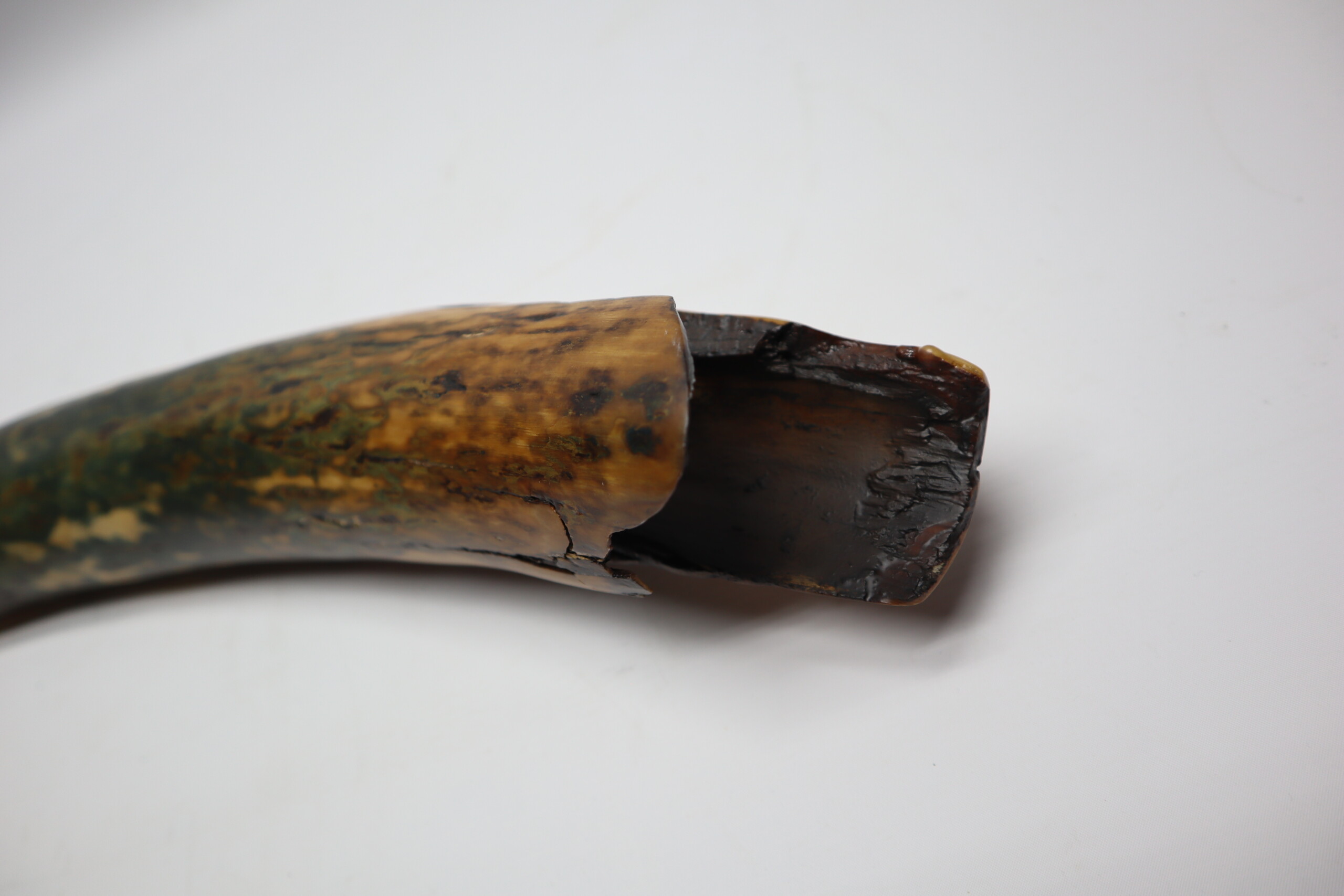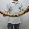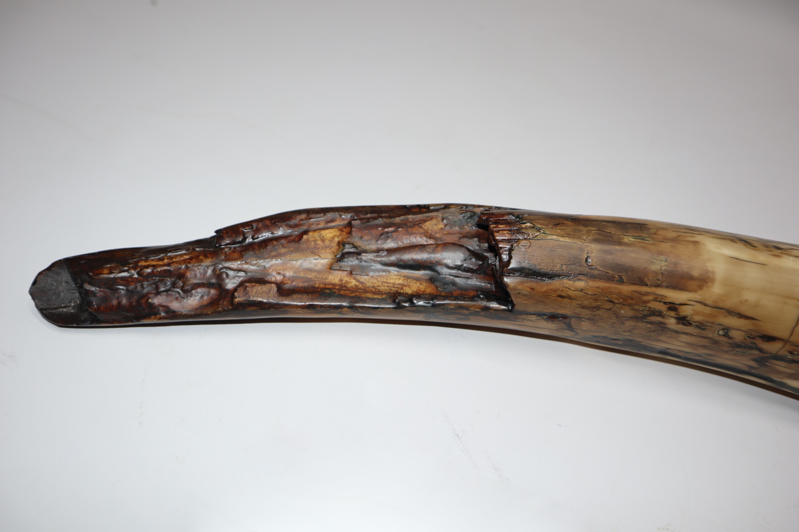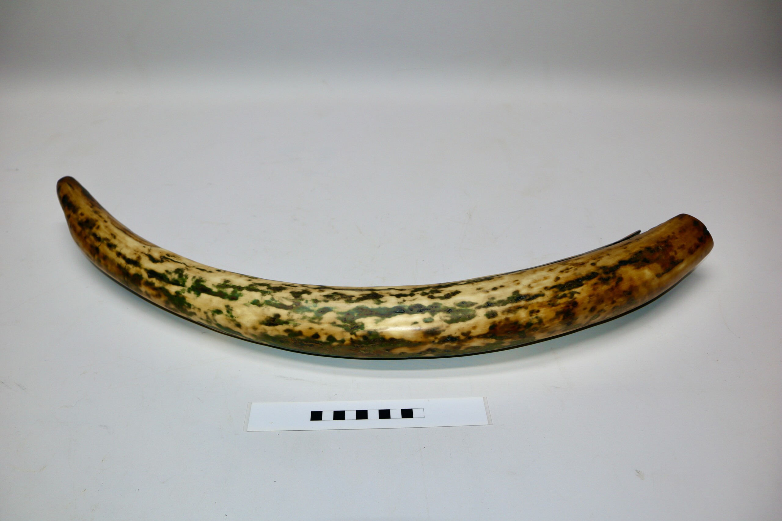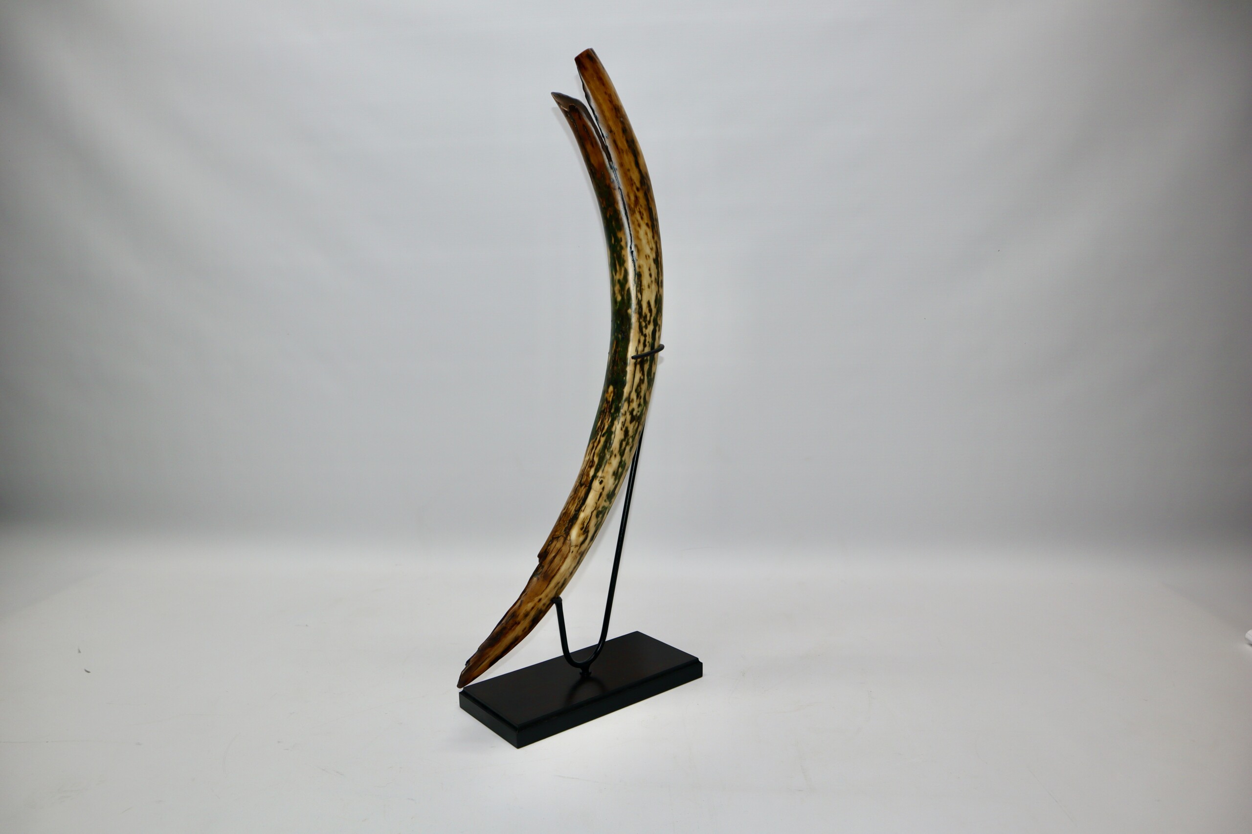 On offer is a fantastic half tusk of a female Woolly Mammoth from the Pleistocene era. This is the middle part of the tusk, the tip and base are missing. No restoration whatsoever. Very good condition. This tusk piece is of beautiful ivory of mainly white, grey, gold and brown ivory, but also some fantastic blue and green colouring. Stunning patterning. Fantastic piece and highly recommended. The black and white section of the ruler in the image represents 10 cm / 3.9 inch. This piece has been applied with a matt finish, but it is also possible to order it with a glossy finish.
