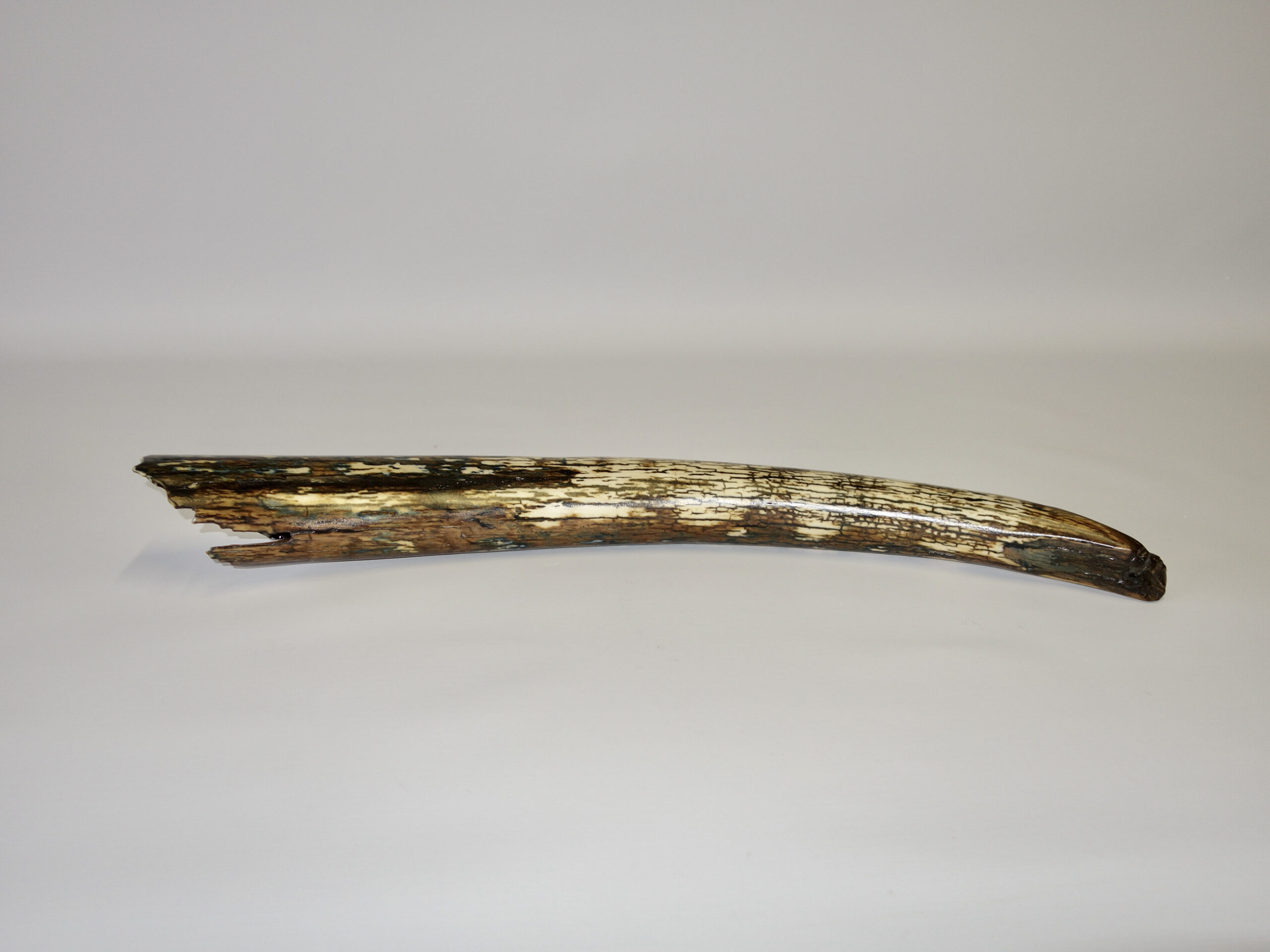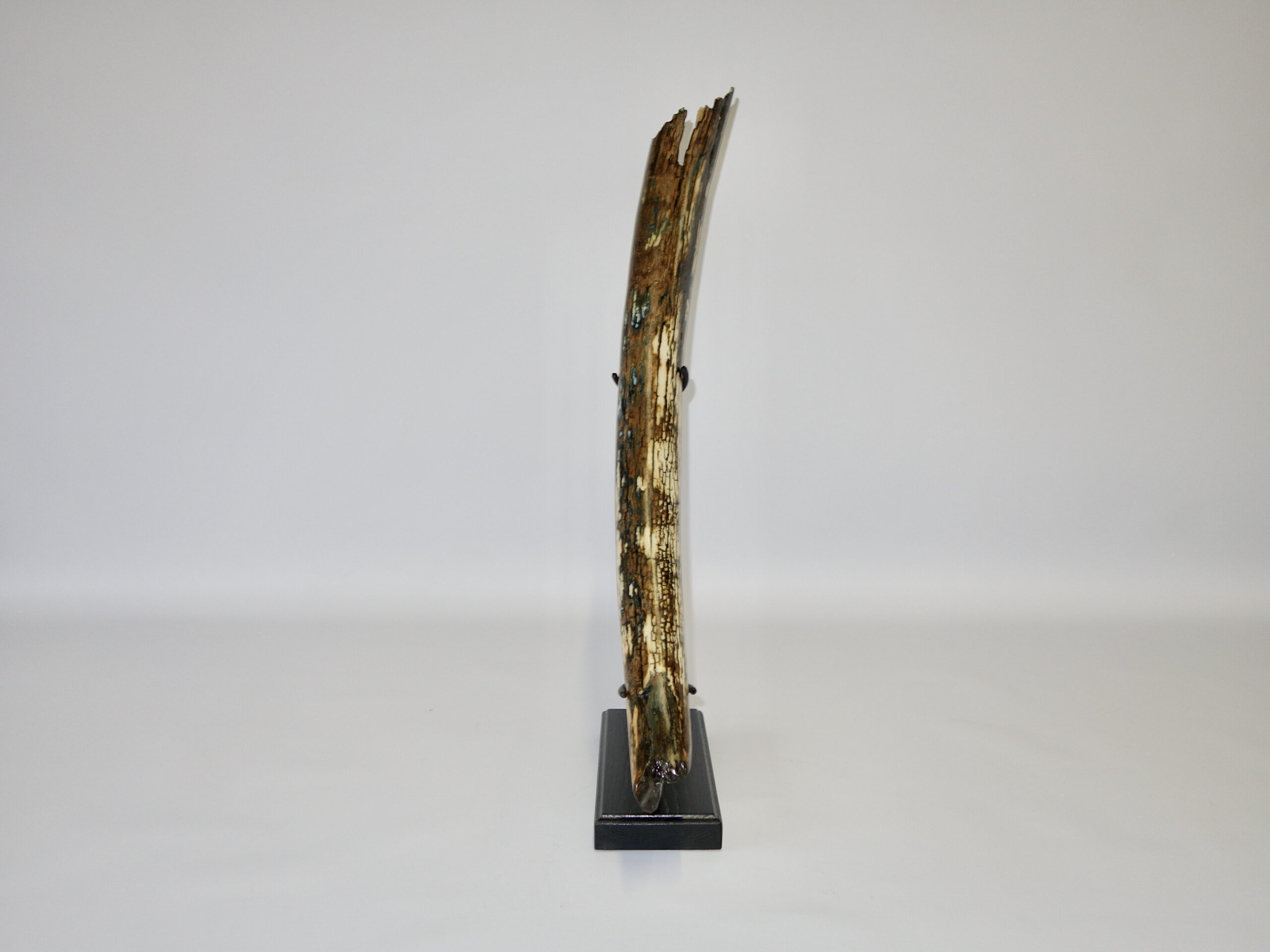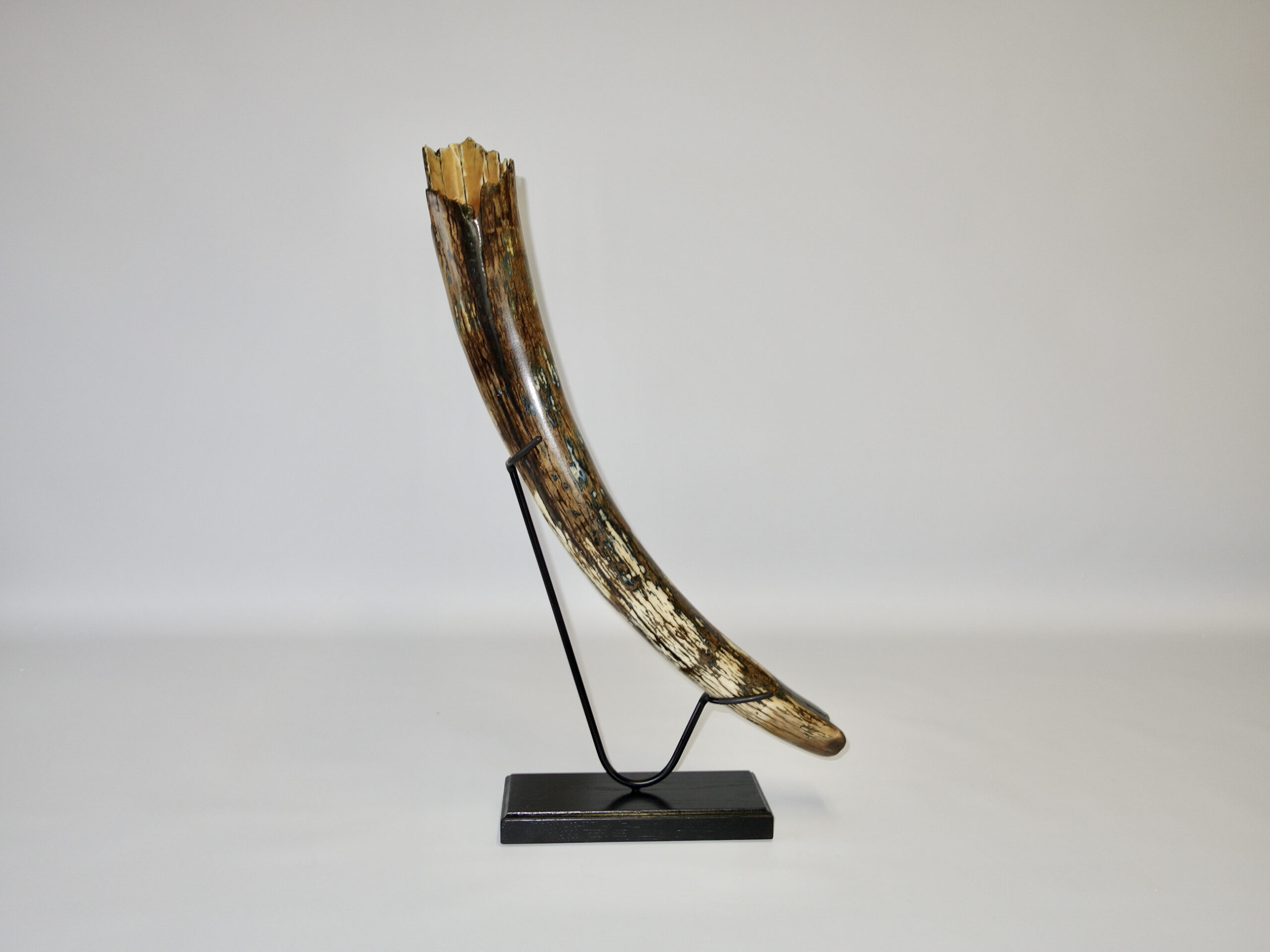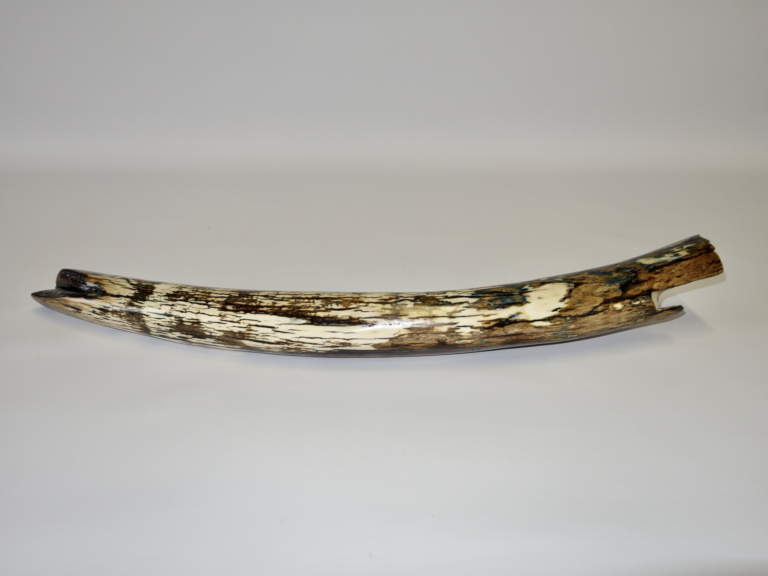 On offer is a fantastic half tusk of a female Woolly Mammoth from the Pleistocene era. Although it is only a half tusk, otherwise it is in excellent condition as seen in the images, although there is some damage to the tip. This tusk piece is of beautiful ivory of mainly white, gold, grey, black and brown ivory, and with stunning patterning. Fantastic piece and highly recommended. The black and white section of the ruler in the image represents 10 cm / 3.9 inch. This piece has been applied with a matt finish, but it is also possible to order it with a glossy finish.