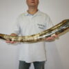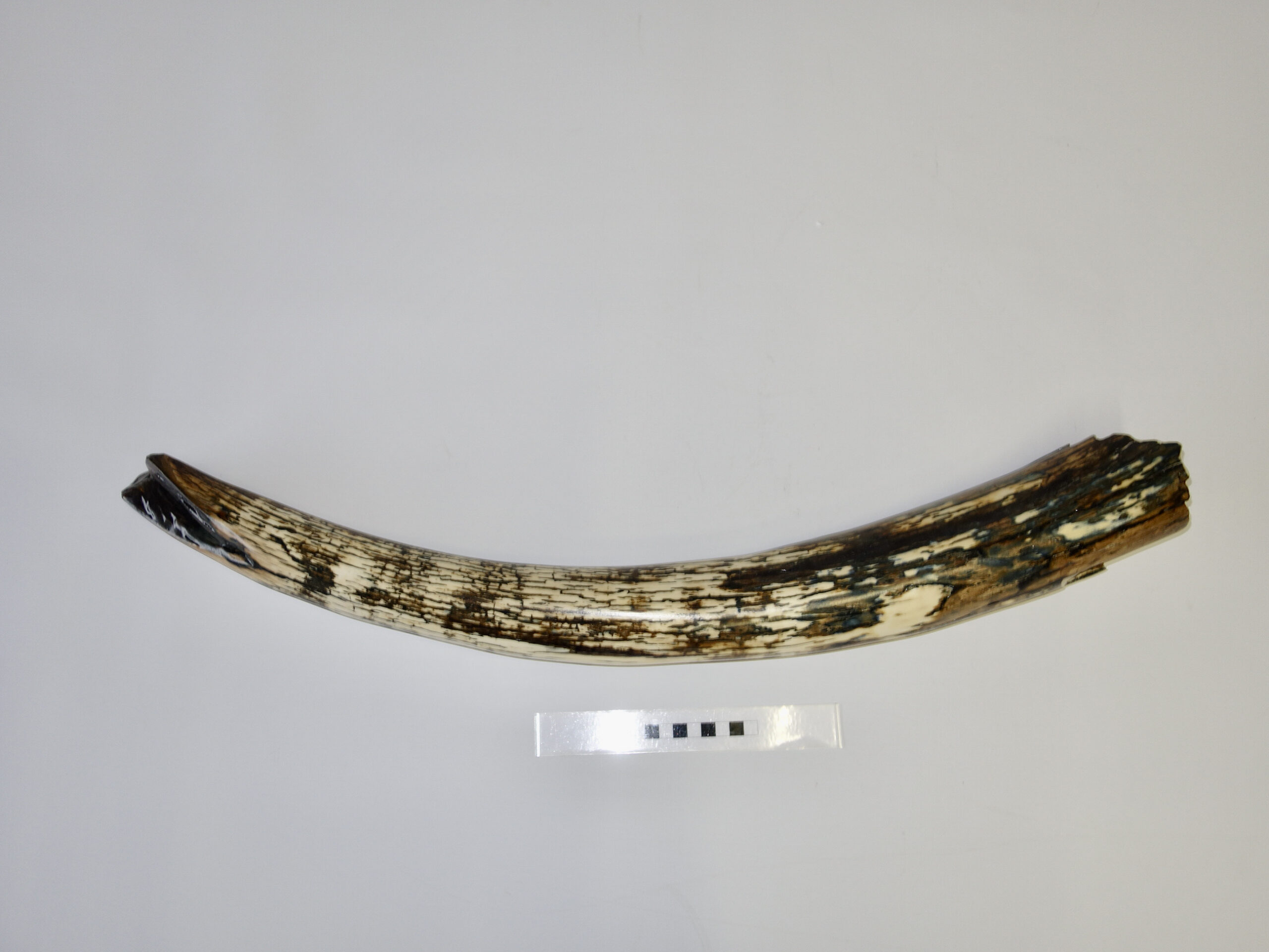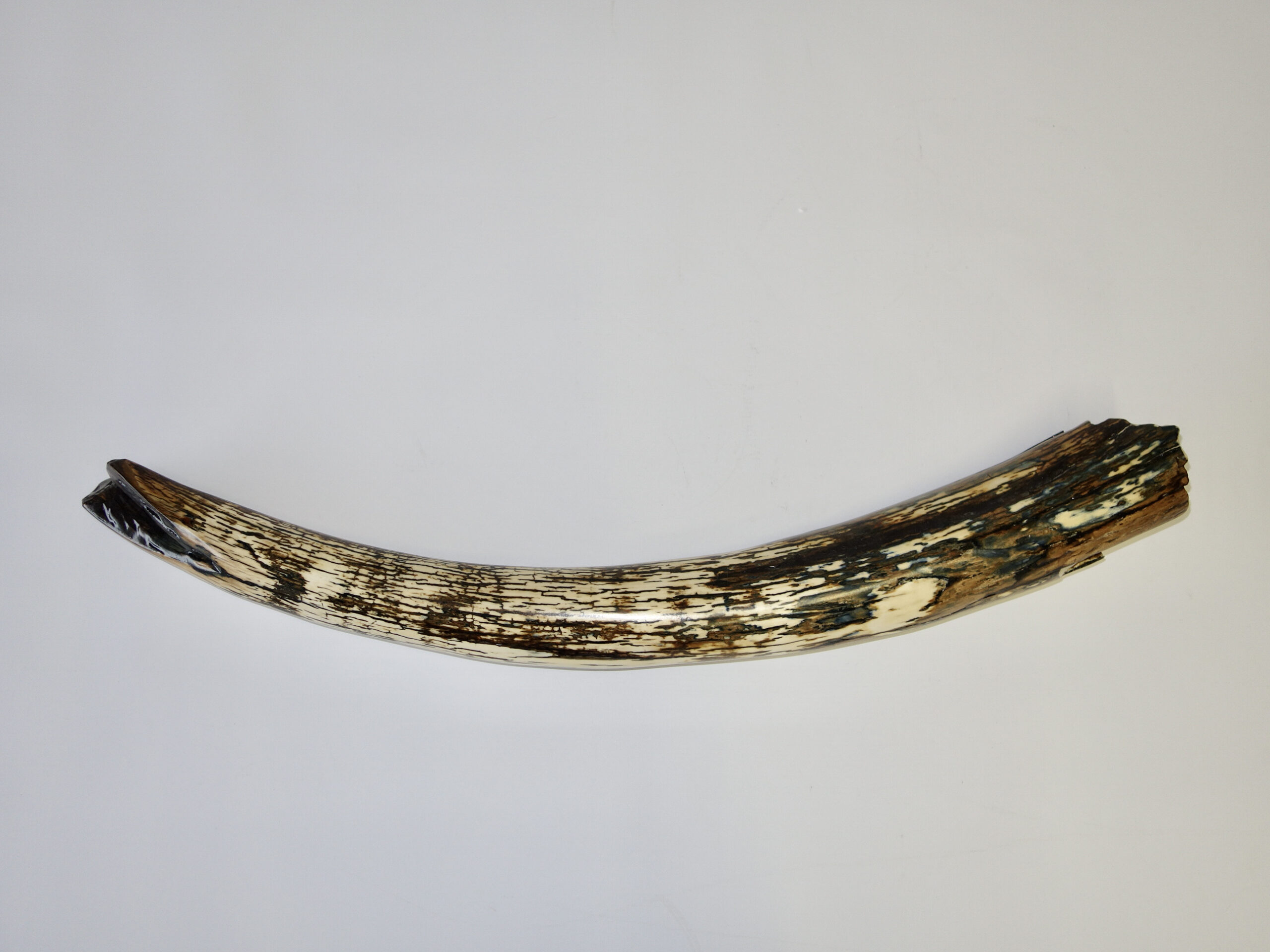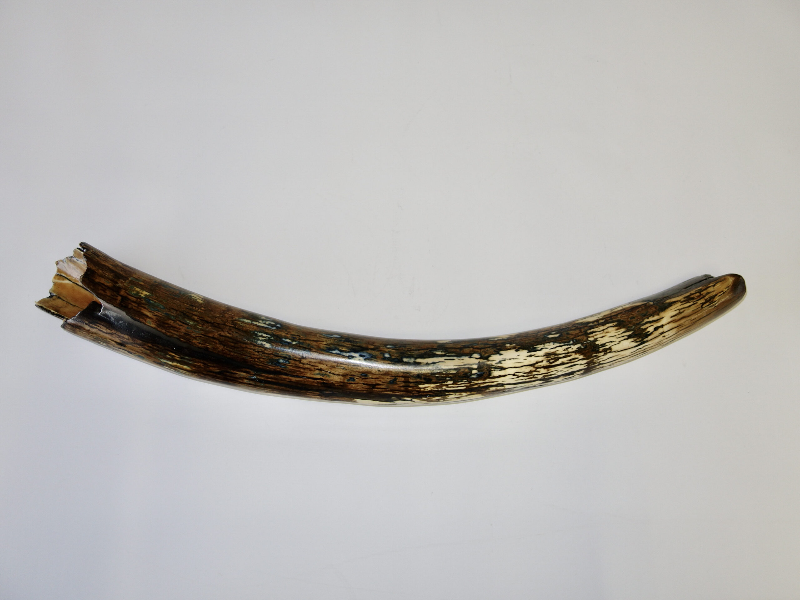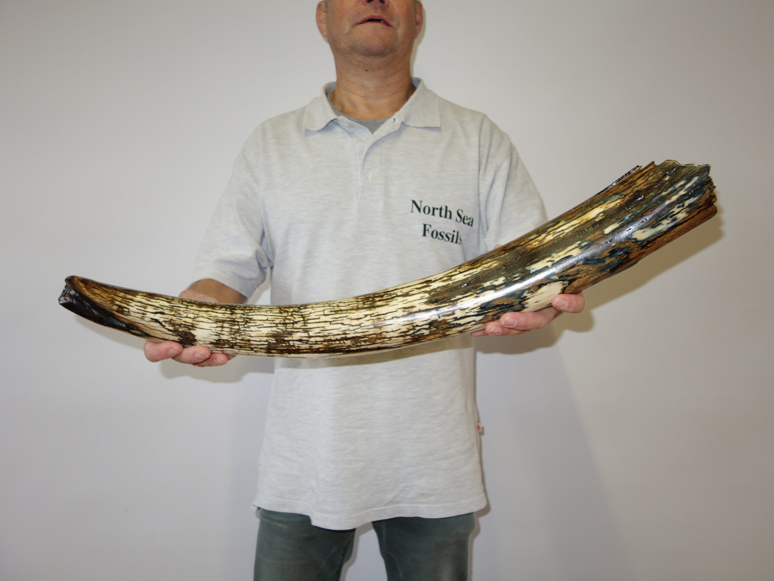 On offer is a fantastic half tusk of a female Woolly Mammoth from the Pleistocene era. Although it is only a half tusk, otherwise it is in excellent condition as seen in the images, although there is some damage to the tip. This tusk piece is of beautiful ivory of mainly white, gold, grey, black and brown ivory, and with stunning patterning. Fantastic piece and highly recommended. The black and white section of the ruler in the image represents 10 cm / 3.9 inch. This piece has been applied with a matt finish, but it is also possible to order it with a glossy finish.