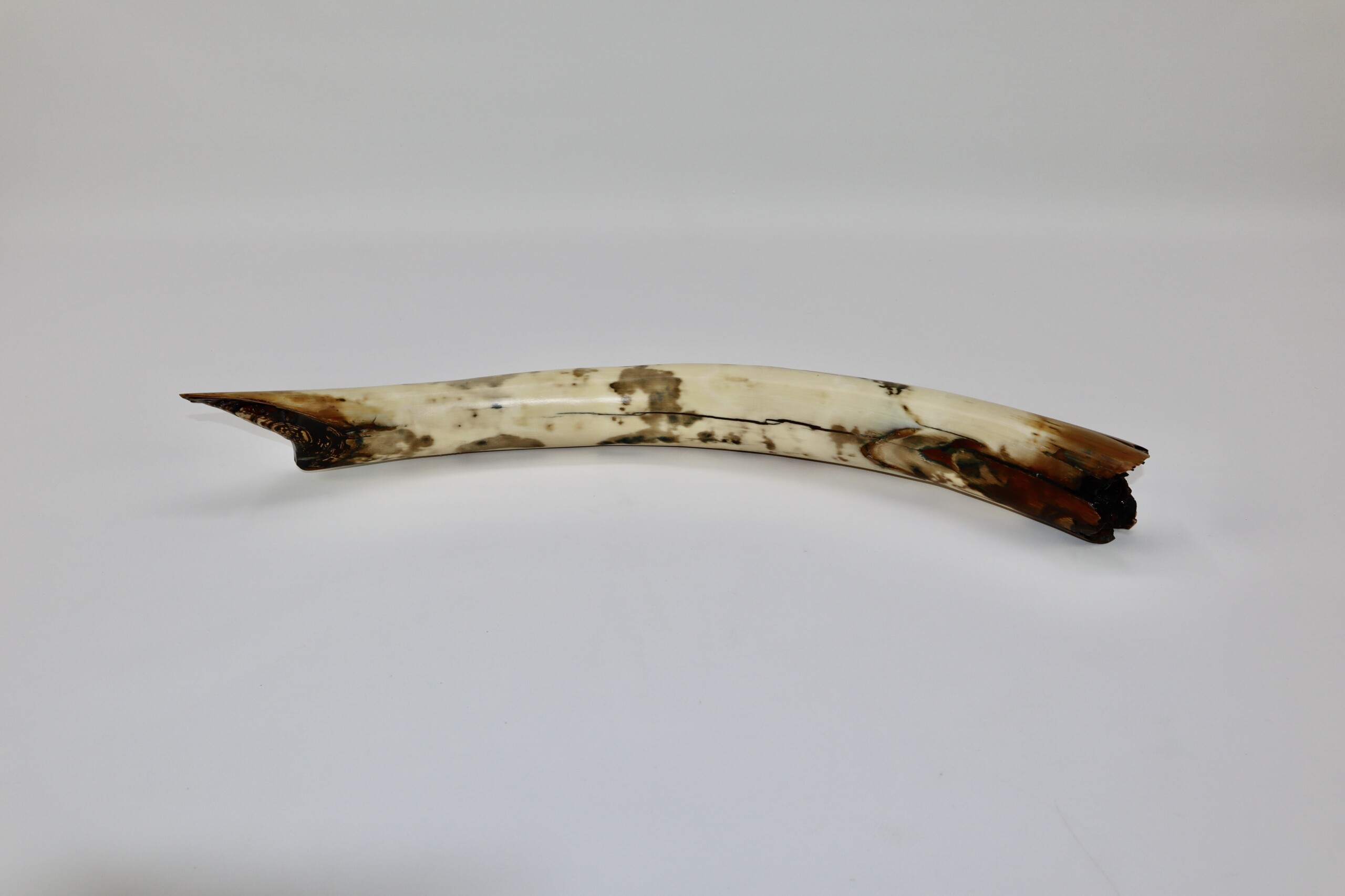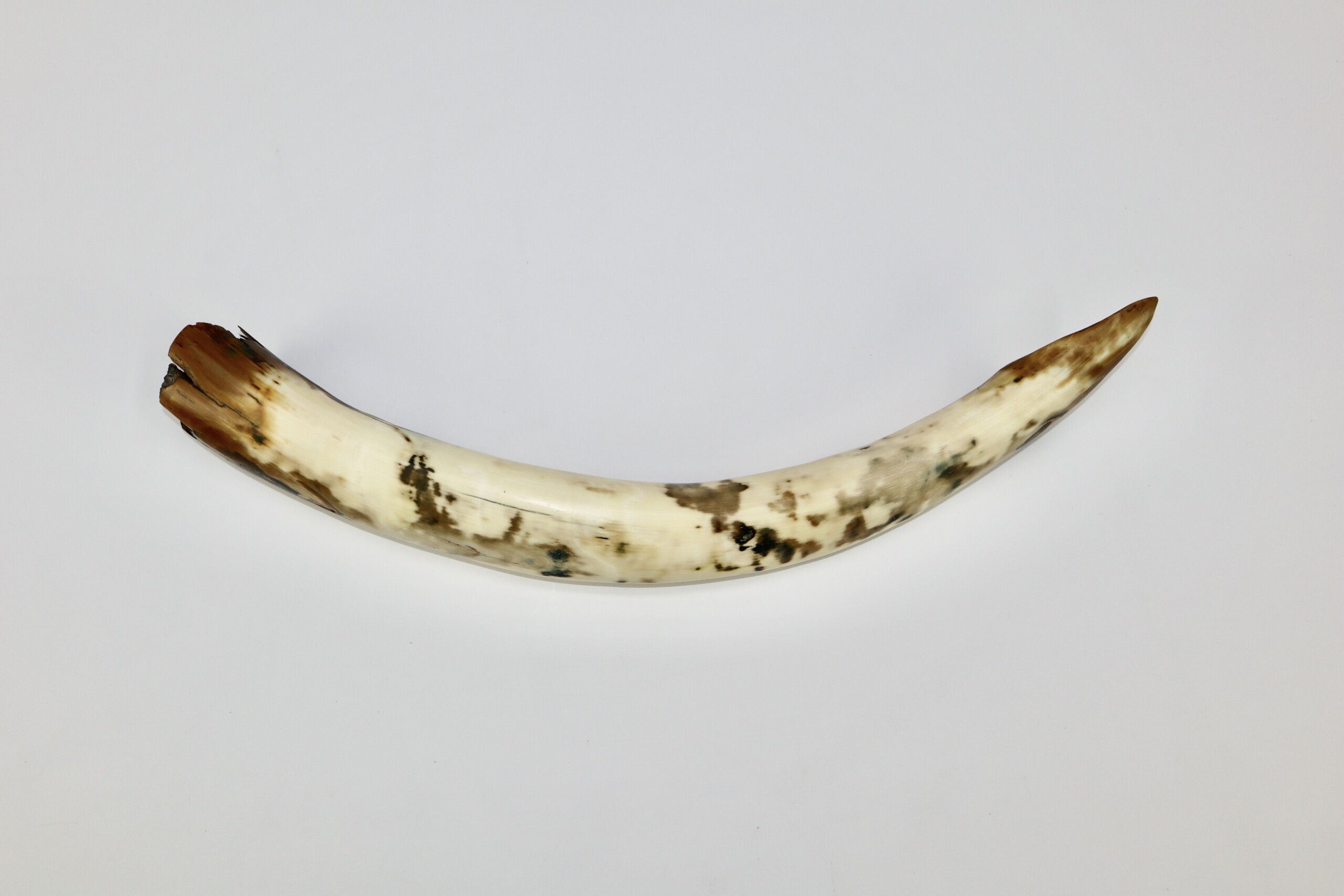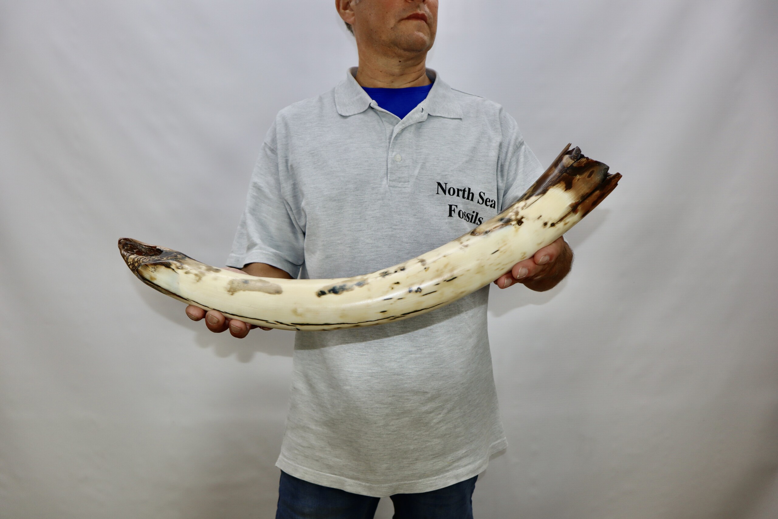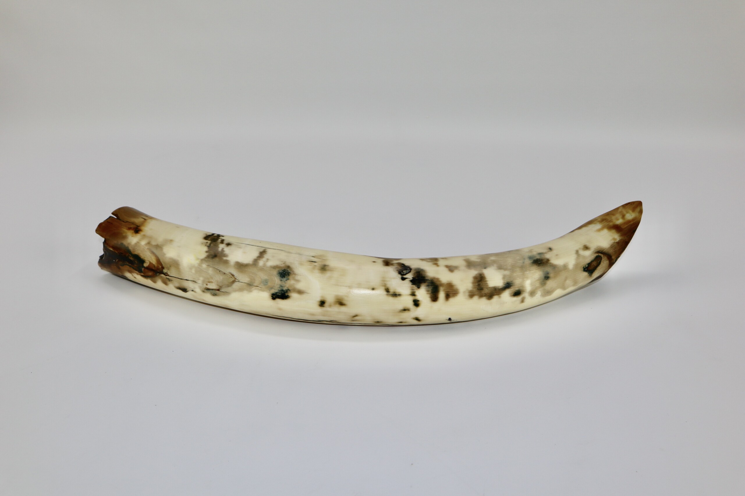 On offer is a fantastic half tusk of a female Woolly Mammoth from the Pleistocene era. Although it is only a half tusk, otherwise it is in excellent condition as seen in the images. No restoration whatsoever. This is the middle part of the tusk, the base and tip are missing. This tusk piece is of beautiful ivory of mainly white, grey and brown ivory. Stunning patterning. Fantastic piece and highly recommended. The black and white section of the ruler in the image represents 10 cm / 3.9 inch. This piece has been applied with a matt finish, but it is also possible to order it with a glossy finish.