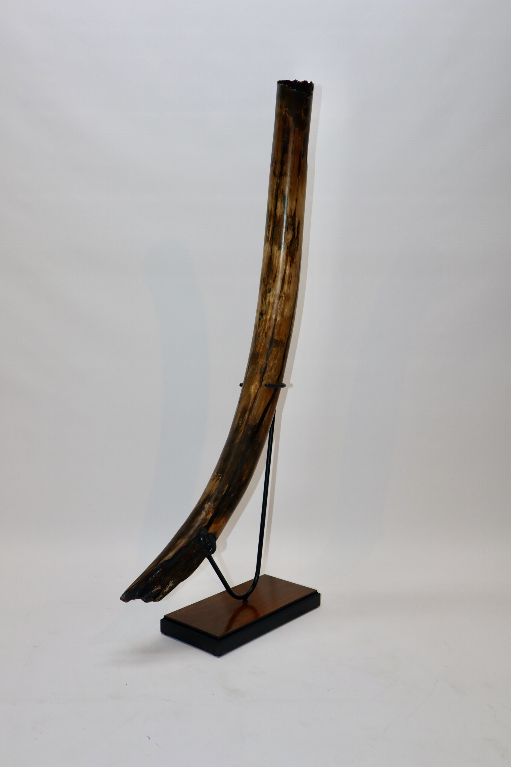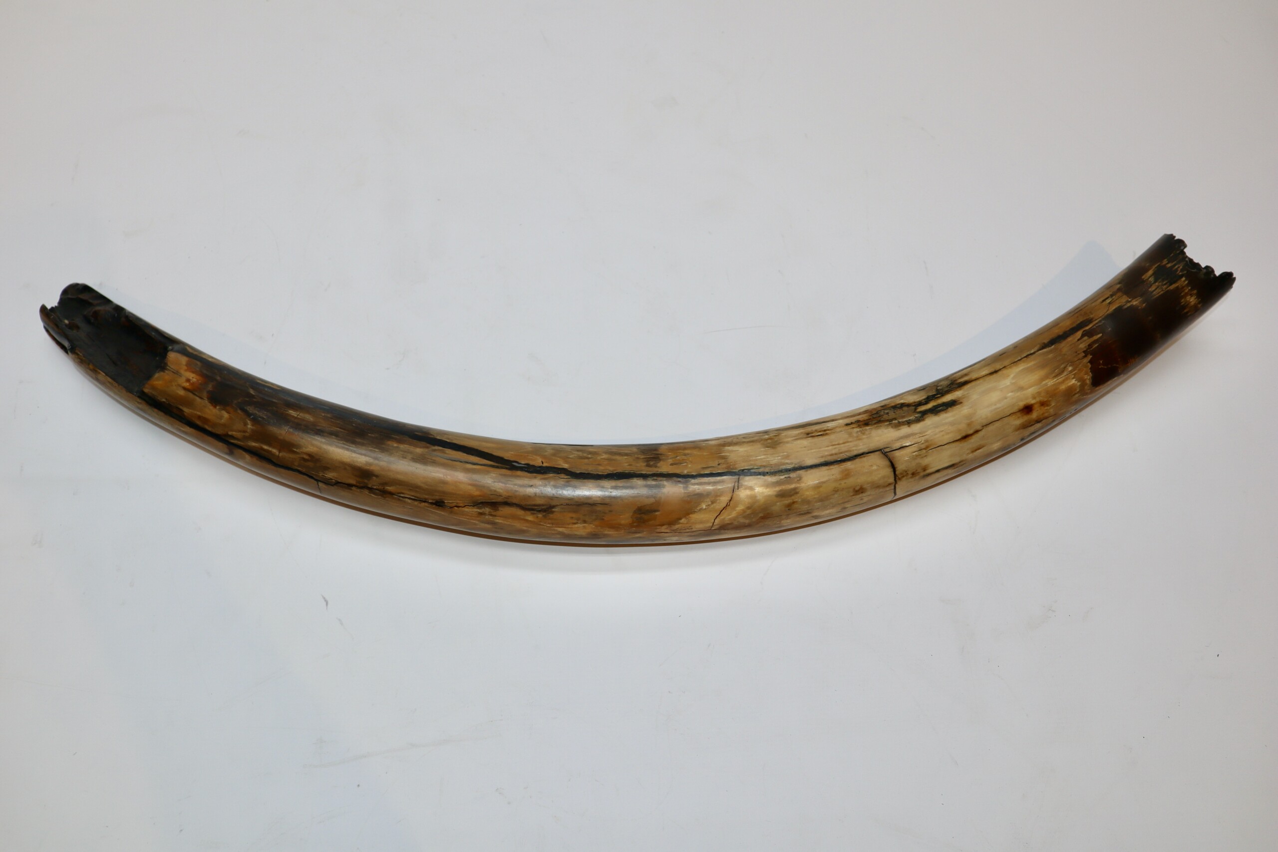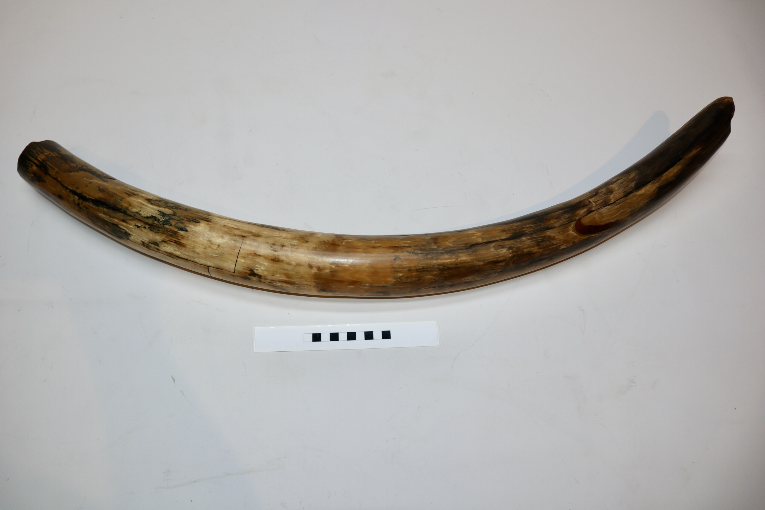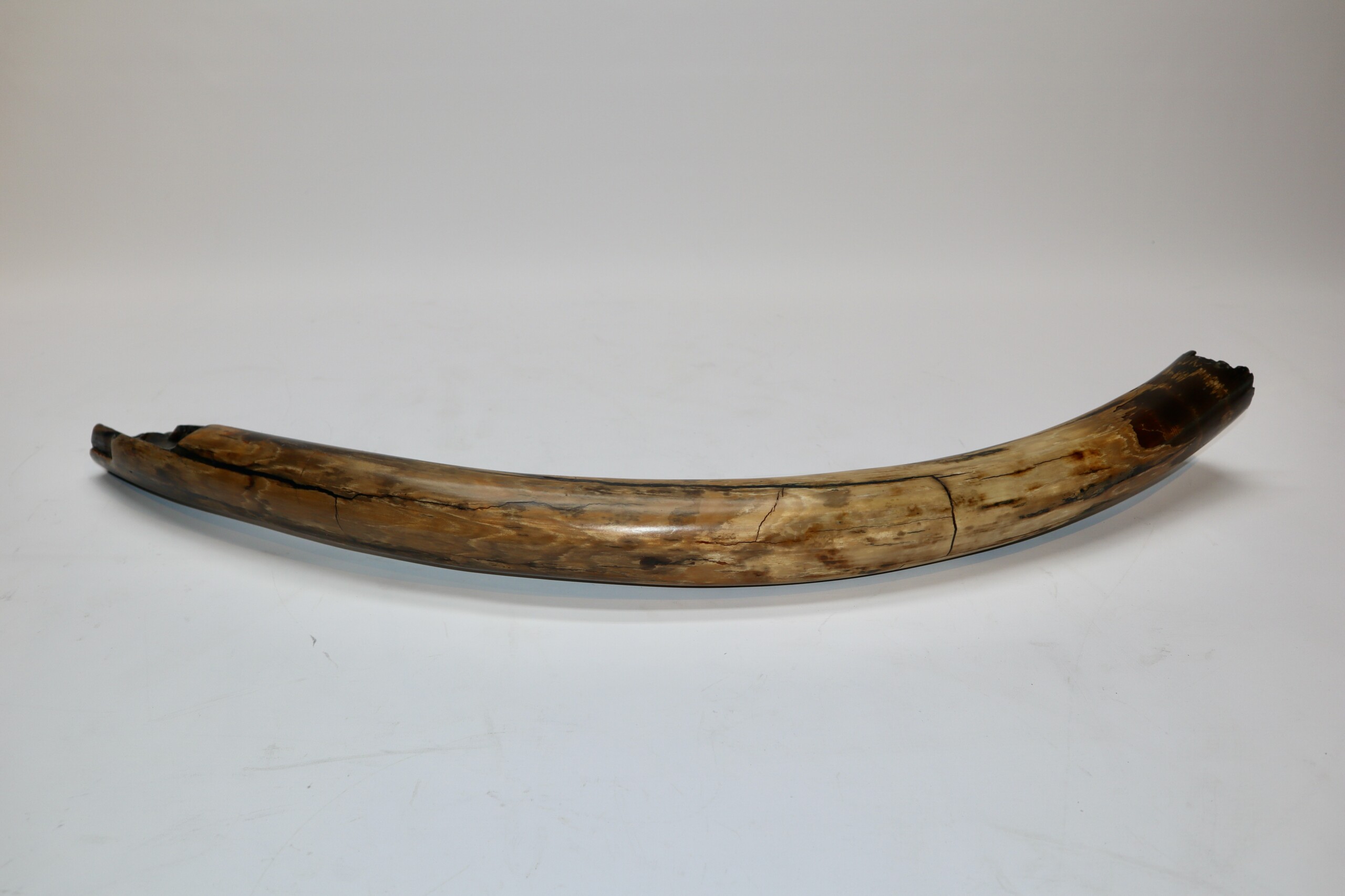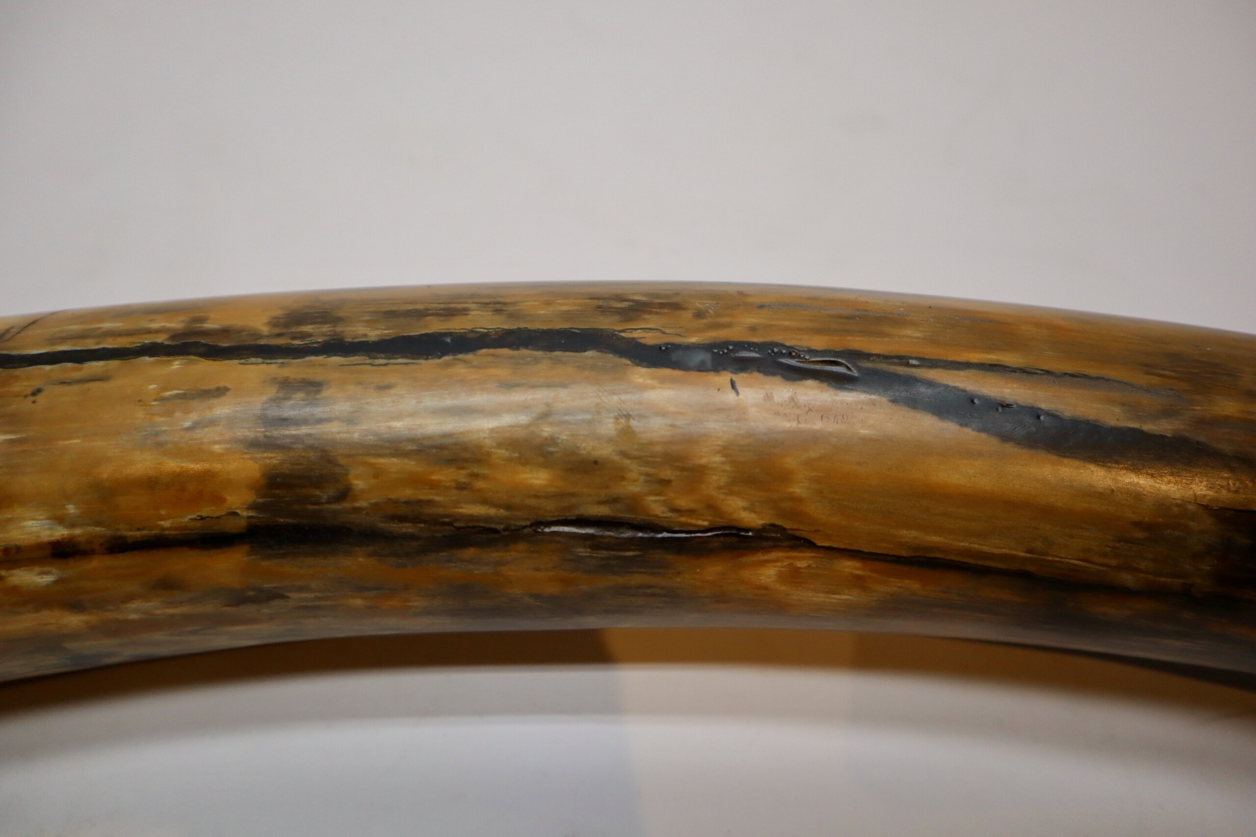 On offer is a fantastic half tusk of a Woolly Mammoth from the Pleistocene era. Although it is only a half tusk, otherwise it is in excellent condition as seen in the images. This is the middle part of the tusk, the base and tip are missing. A crack has been professionally repaired, otherwise no restoration whatsoever. This tusk piece is of beautiful ivory of mainly gold, grey and brown ivory, and with stunning patterning. Fantastic piece and highly recommended. The black and white section of the ruler in the image represents 10 cm / 3.9 inch. This piece has been applied with a matt finish, but it is also possible to order it with a glossy finish.