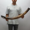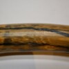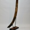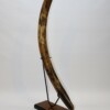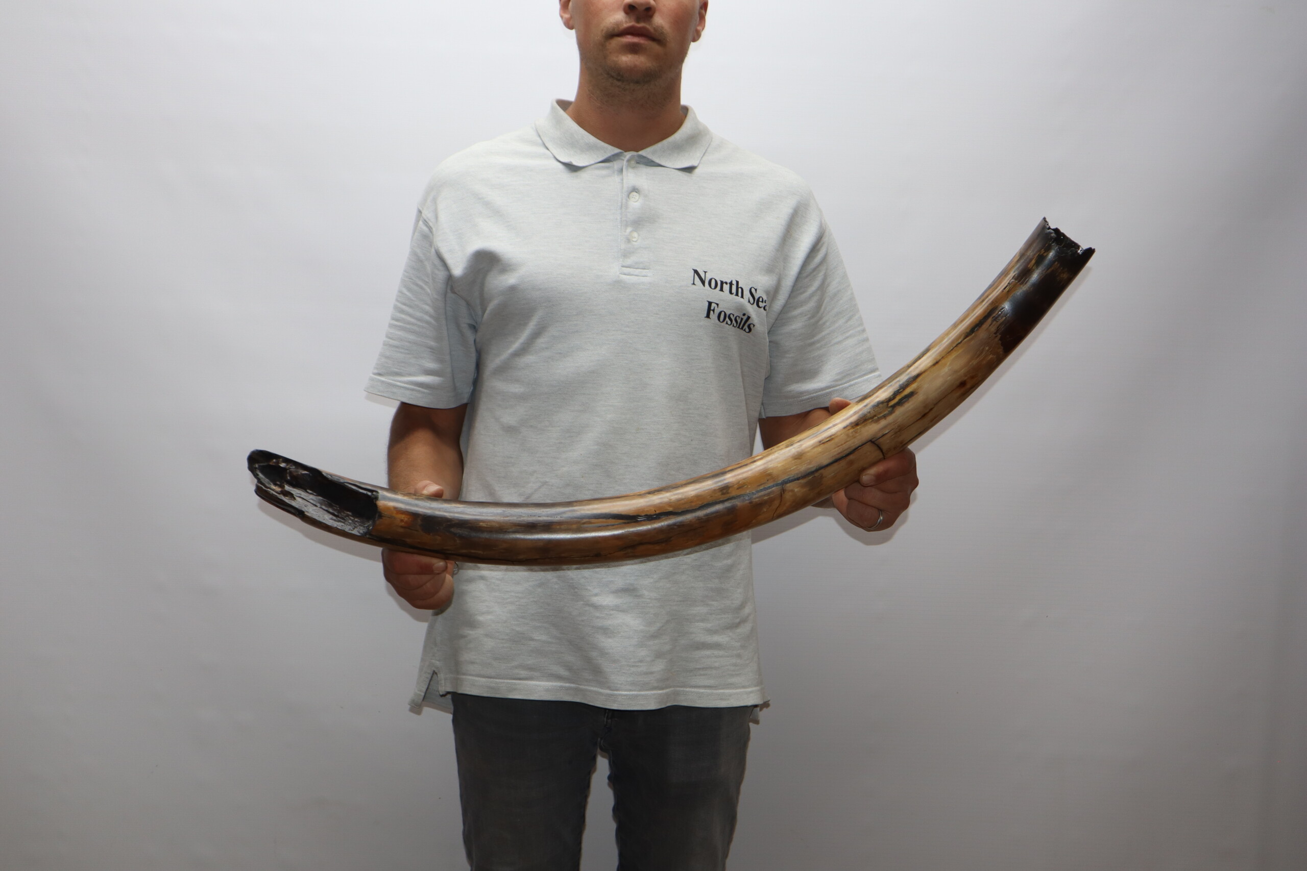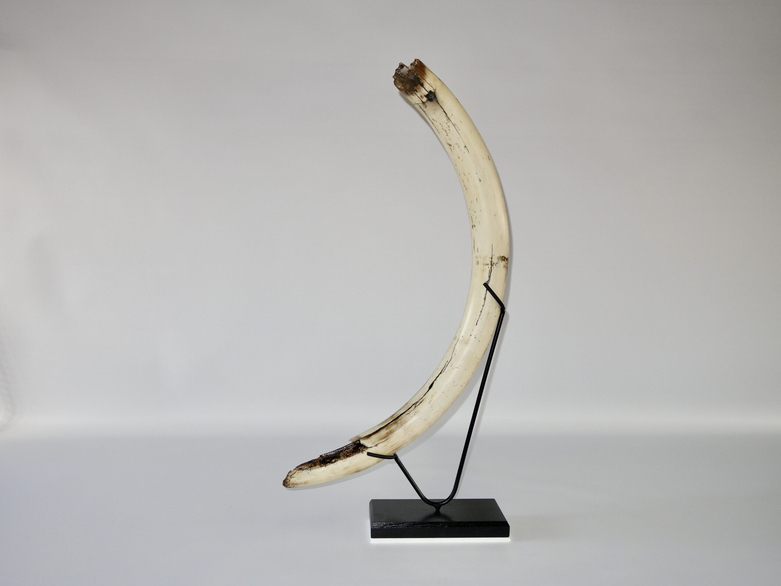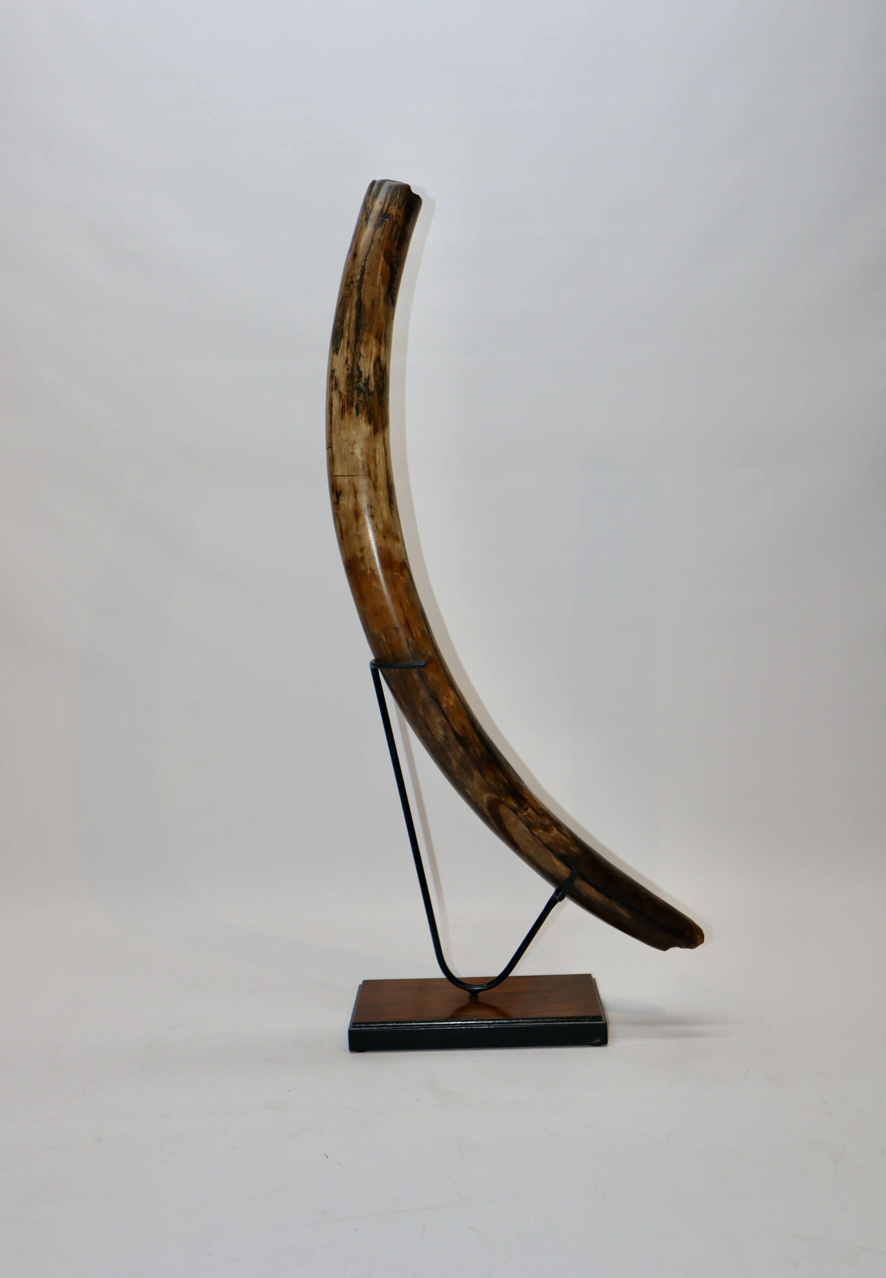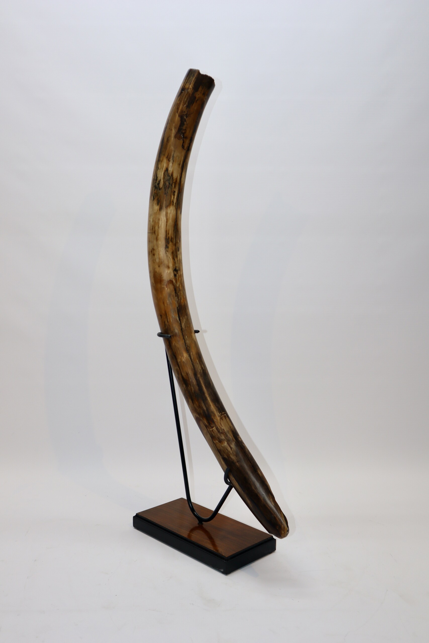 On offer is a fantastic half tusk of a Woolly Mammoth from the Pleistocene era. Although it is only a half tusk, otherwise it is in excellent condition as seen in the images. This is the middle part of the tusk, the base and tip are missing. A crack has been professionally repaired, otherwise no restoration whatsoever. This tusk piece is of beautiful ivory of mainly gold, grey and brown ivory, and with stunning patterning. Fantastic piece and highly recommended. The black and white section of the ruler in the image represents 10 cm / 3.9 inch. This piece has been applied with a matt finish, but it is also possible to order it with a glossy finish.
