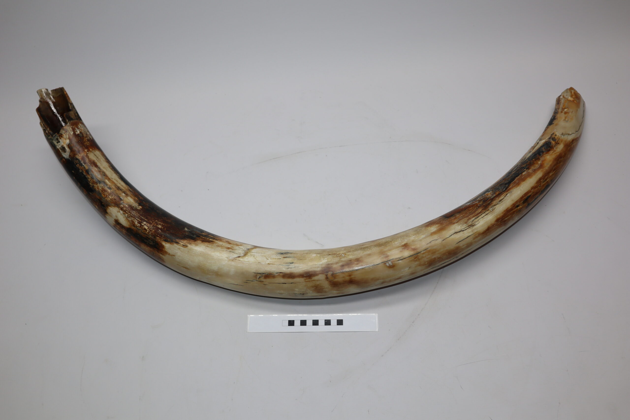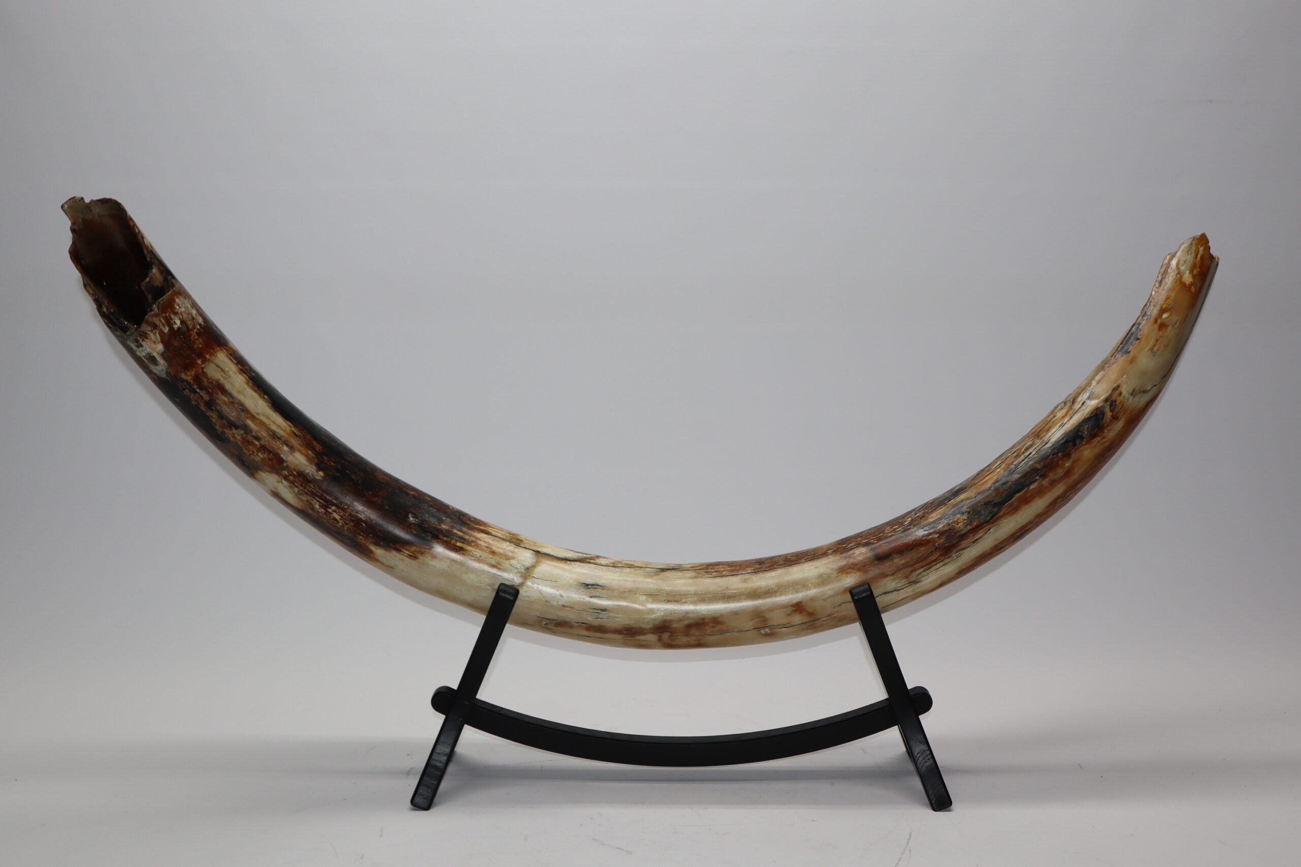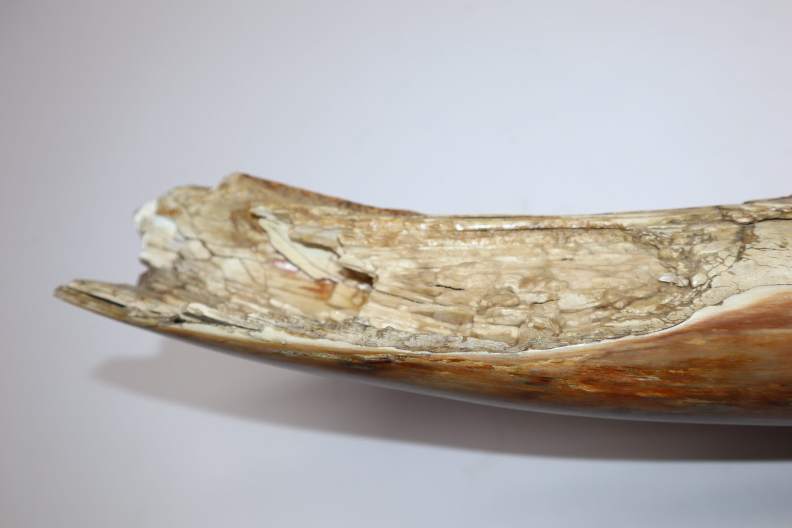 On offer is a fantastic half tusk of a Woolly Mammoth from the Pleistocene era. Although it is only a half tusk, otherwise it is in excellent condition as seen in the images. This is the base part of the tusk, the tip part is missing. No restoration whatsoever. This tusk piece is of beautiful ivory of mainly white, gold, grey and brown ivory, and with stunning patterning. Fantastic piece and highly recommended. The black and white section of the ruler in the image represents 10 cm / 3.9 inch. This piece has been applied with a matt finish, but it is also possible to order it with a glossy finish.