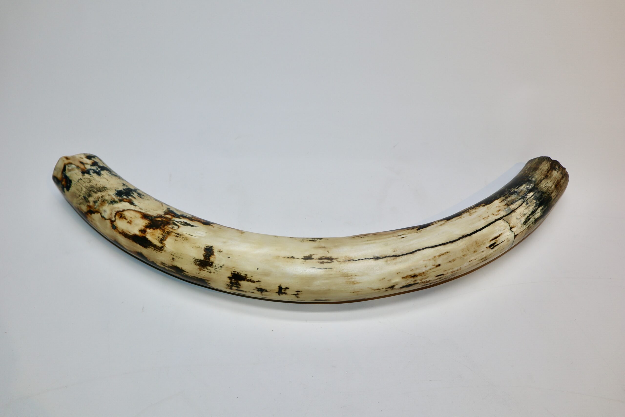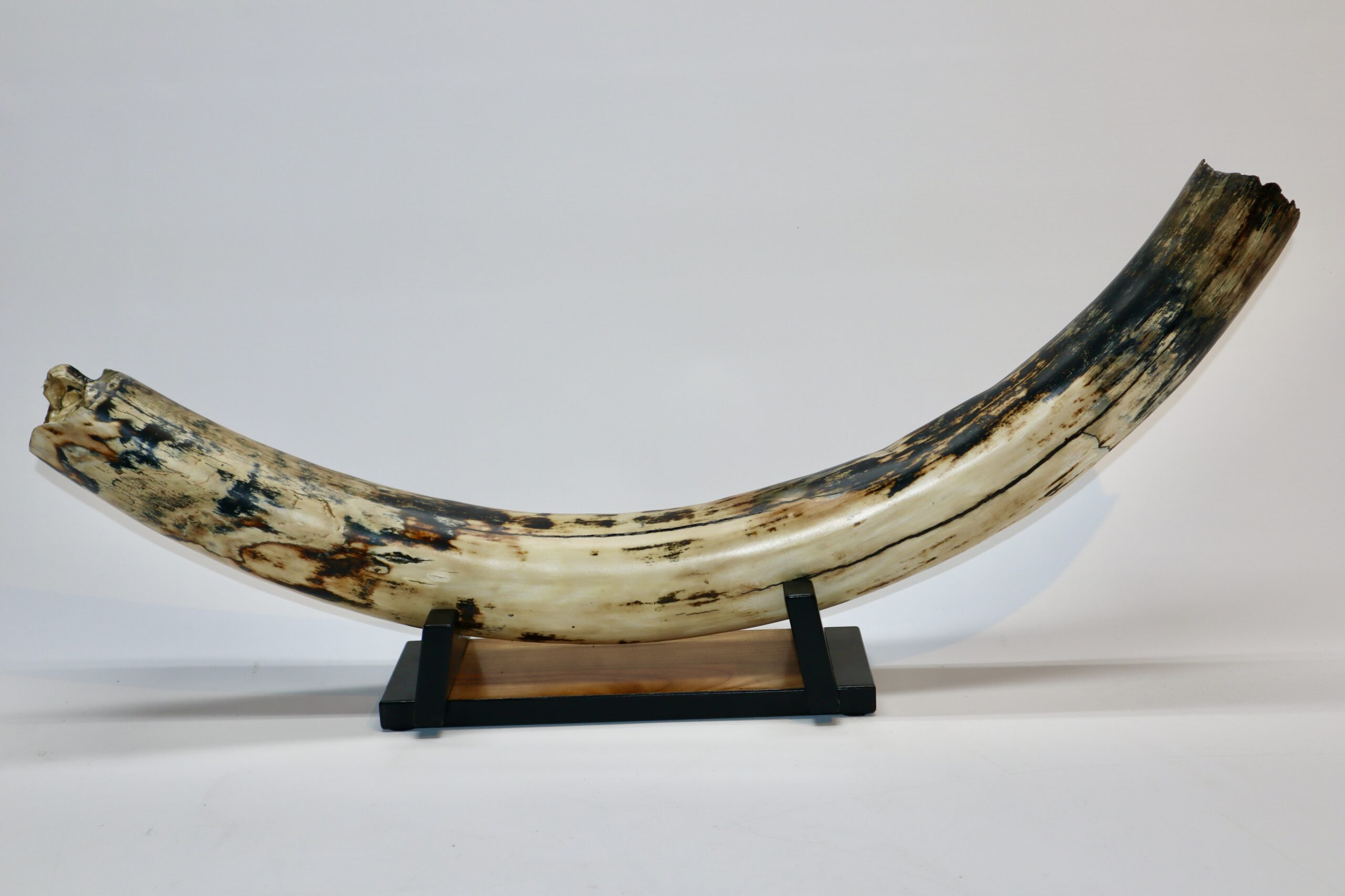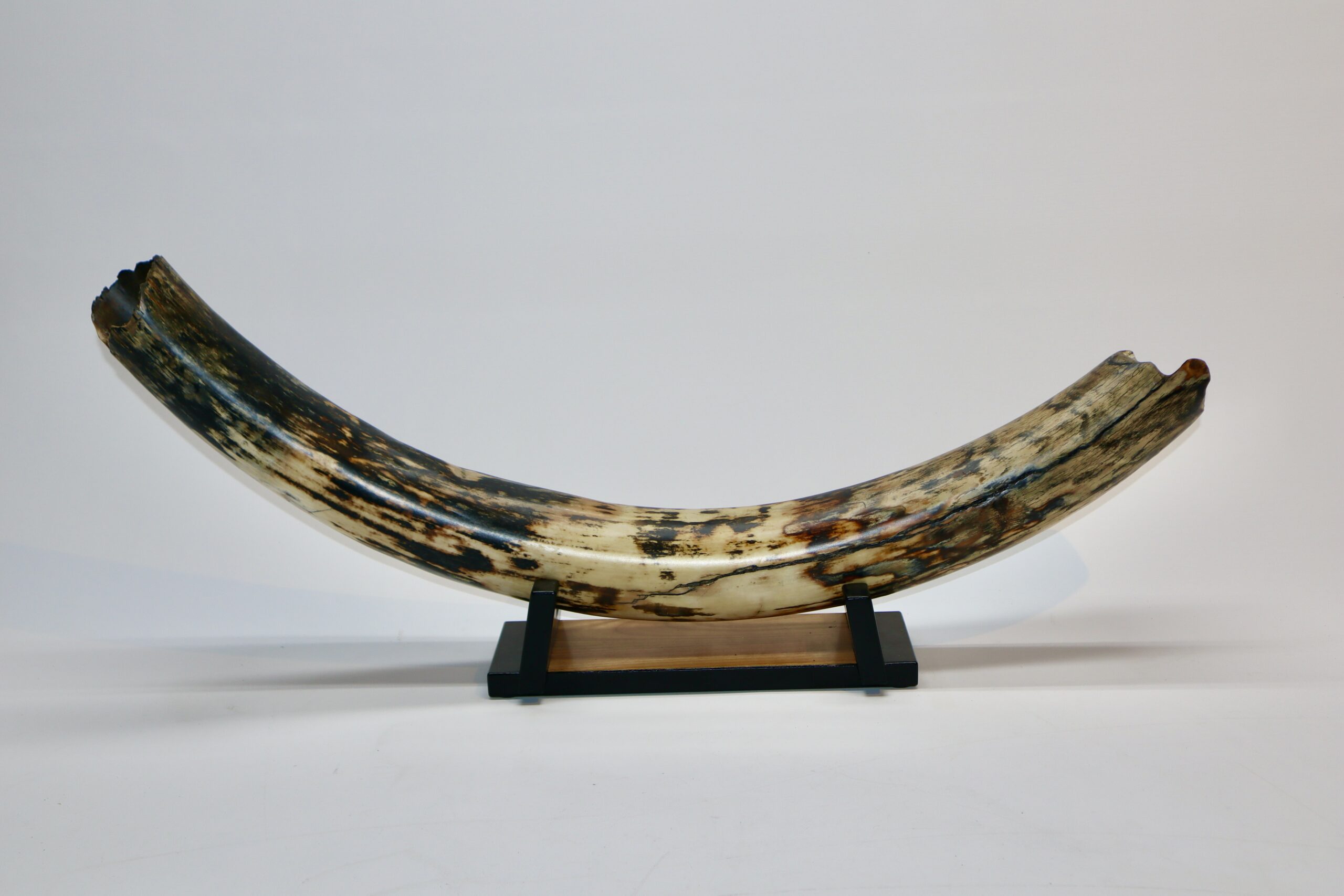 On offer is a fantastic half tusk of a Woolly Mammoth from the Pleistocene era. Although it is only a half tusk, otherwise it is in excellent condition as seen in the images. This is the middle part of the tusk, the base and tip are missing. Wonderful condition, no restoration whatsoever. This tusk piece is of beautiful ivory of mainly white, gold, grey and brown ivory, and with stunning patterning. Fantastic piece and highly recommended. The black and white section of the ruler in the image represents 10 cm / 3.9 inch. This piece has been applied with a matt finish, but it is also possible to order it with a glossy finish.
