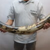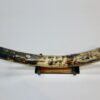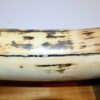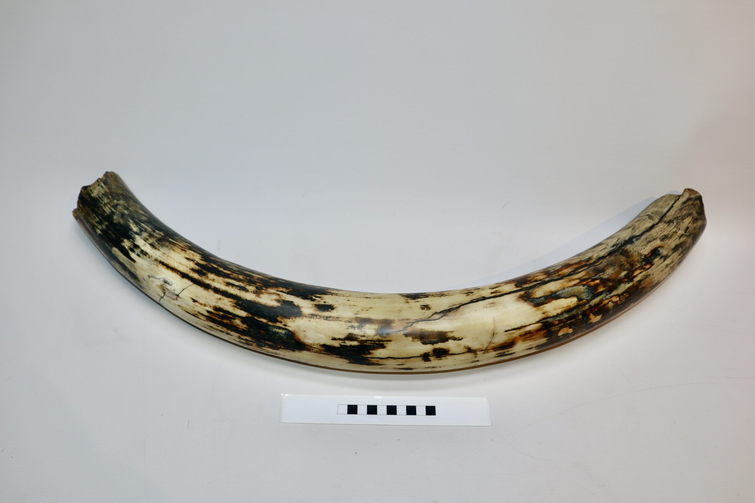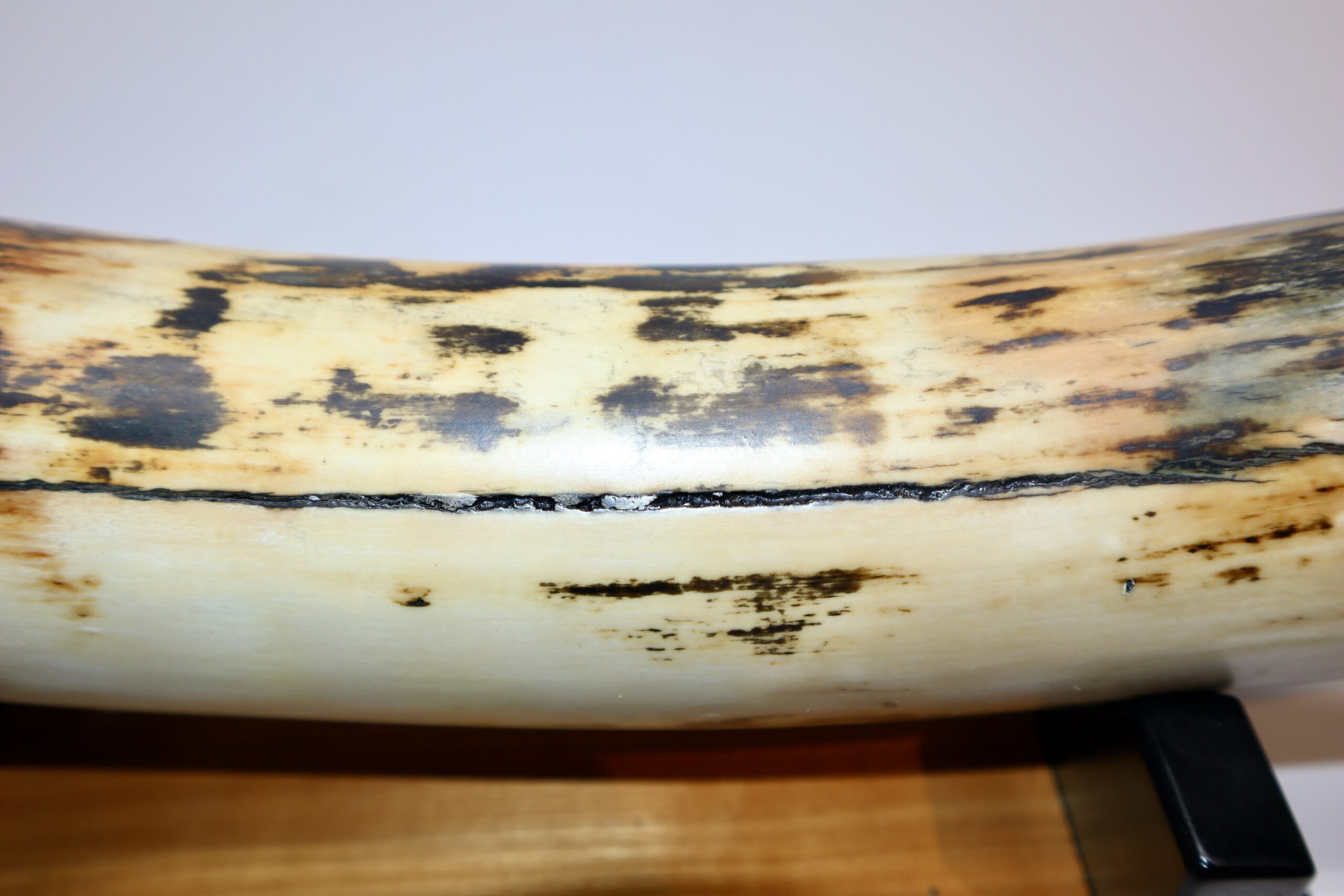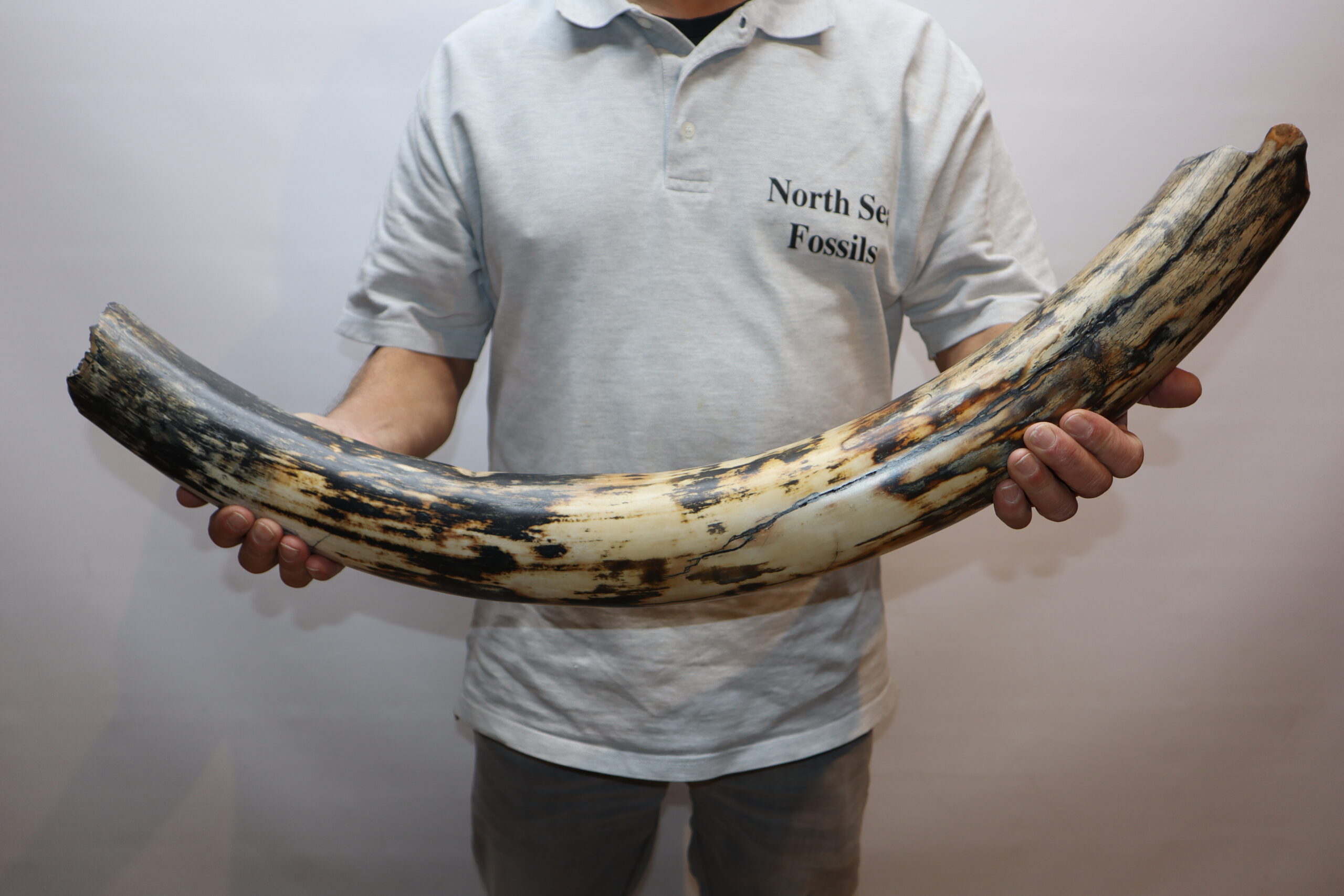 On offer is a fantastic half tusk of a Woolly Mammoth from the Pleistocene era. Although it is only a half tusk, otherwise it is in excellent condition as seen in the images. This is the middle part of the tusk, the base and tip are missing. Wonderful condition, no restoration whatsoever. This tusk piece is of beautiful ivory of mainly white, gold, grey and brown ivory, and with stunning patterning. Fantastic piece and highly recommended. The black and white section of the ruler in the image represents 10 cm / 3.9 inch. This piece has been applied with a matt finish, but it is also possible to order it with a glossy finish.