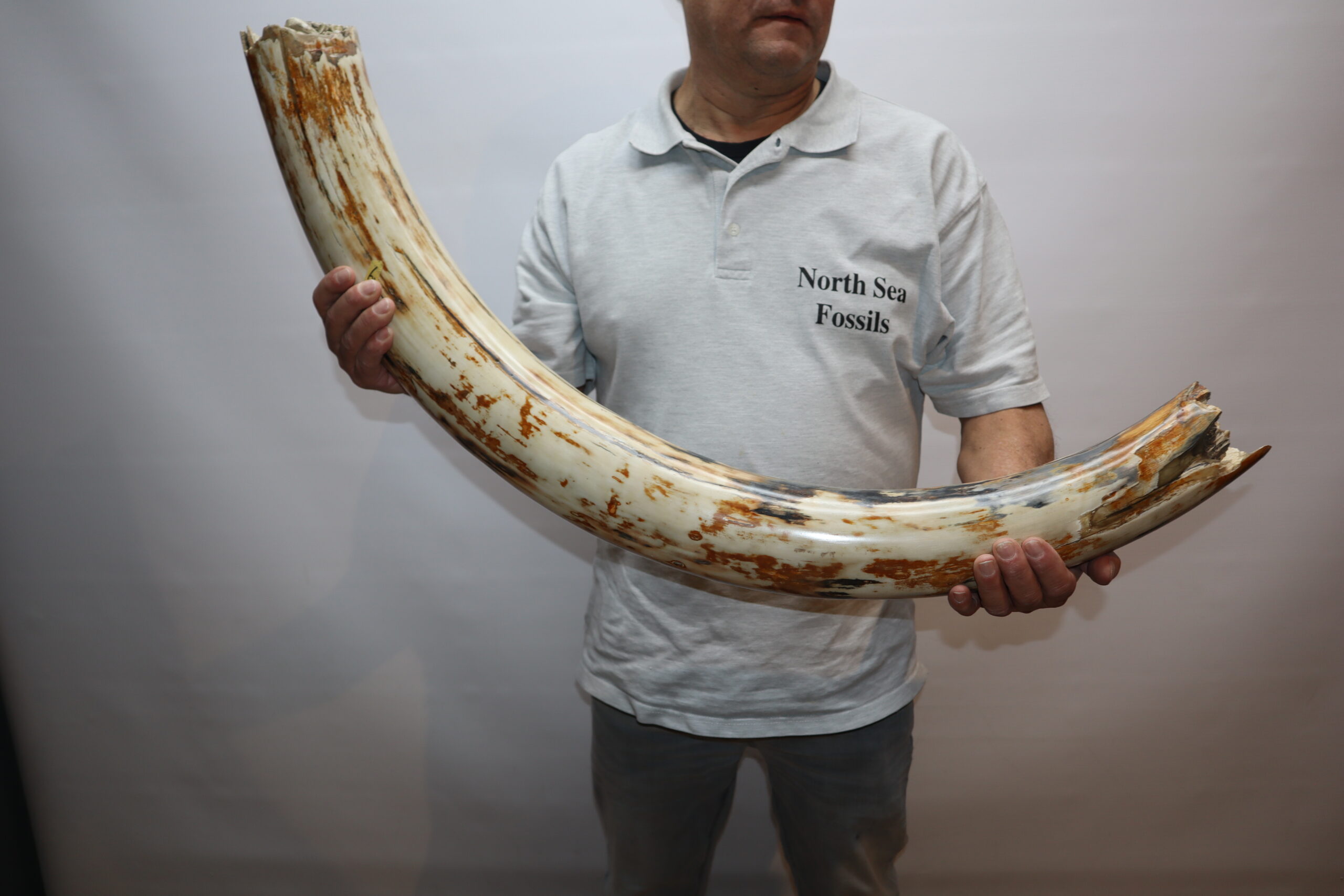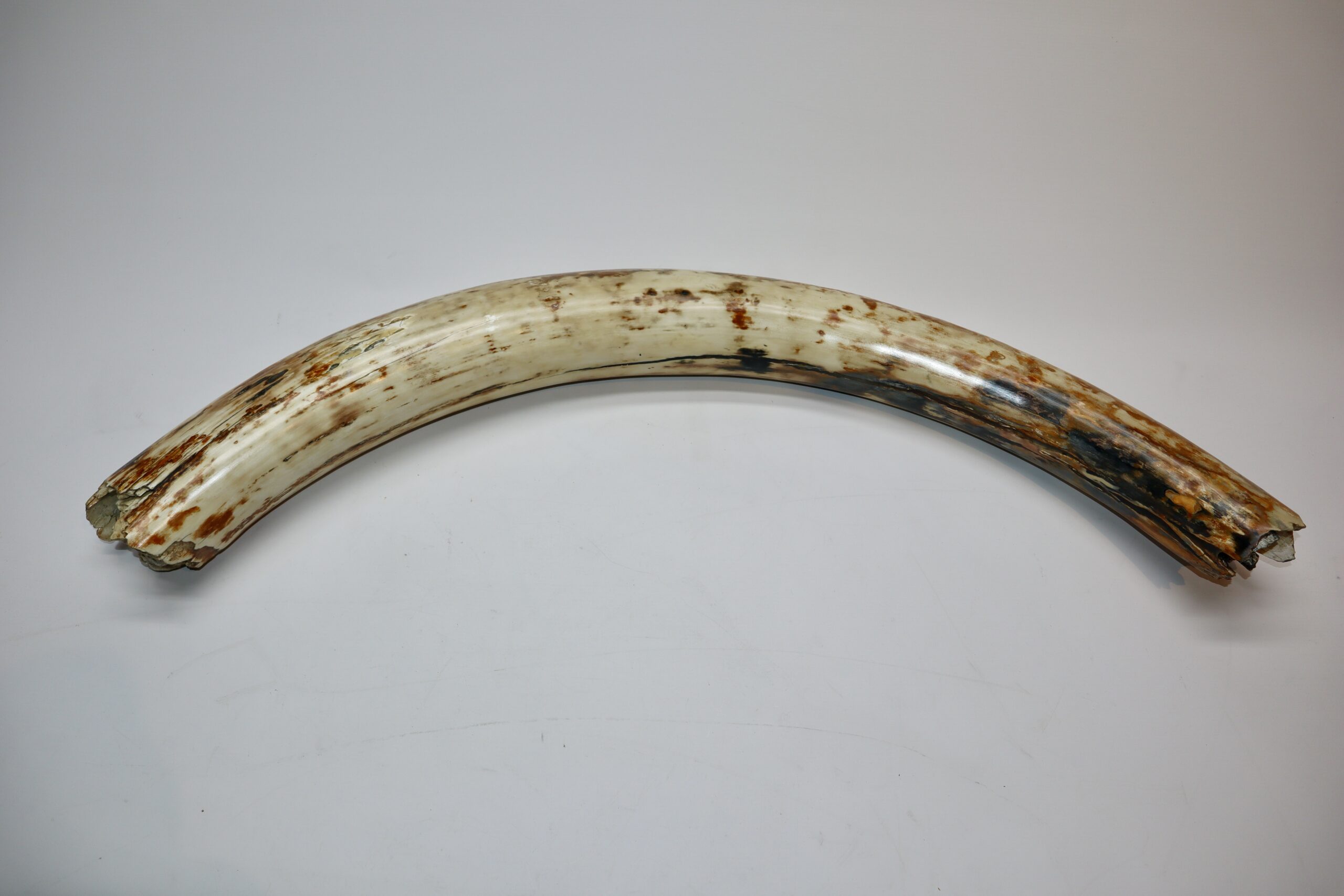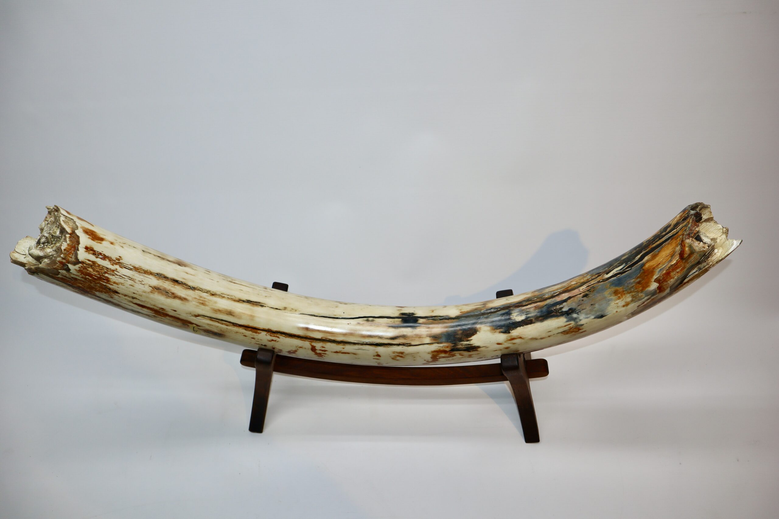 On offer is a fantastic half tusk of a Woolly Mammoth from the Pleistocene era. Although it is only a half tusk, otherwise it is in excellent condition as seen in the images. This is the middle part of the tusk, the base and tip are missing. A crack has been professionally repaired, otherwise no restoration whatsoever. This tusk piece is of beautiful ivory of mainly white, gold, grey and brown ivory, and with stunning patterning. Fantastic piece and highly recommended. The black and white section of the ruler in the image represents 10 cm / 3.9 inch. This piece has been applied with a matt finish, but it is also possible to order it with a glossy finish.