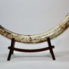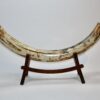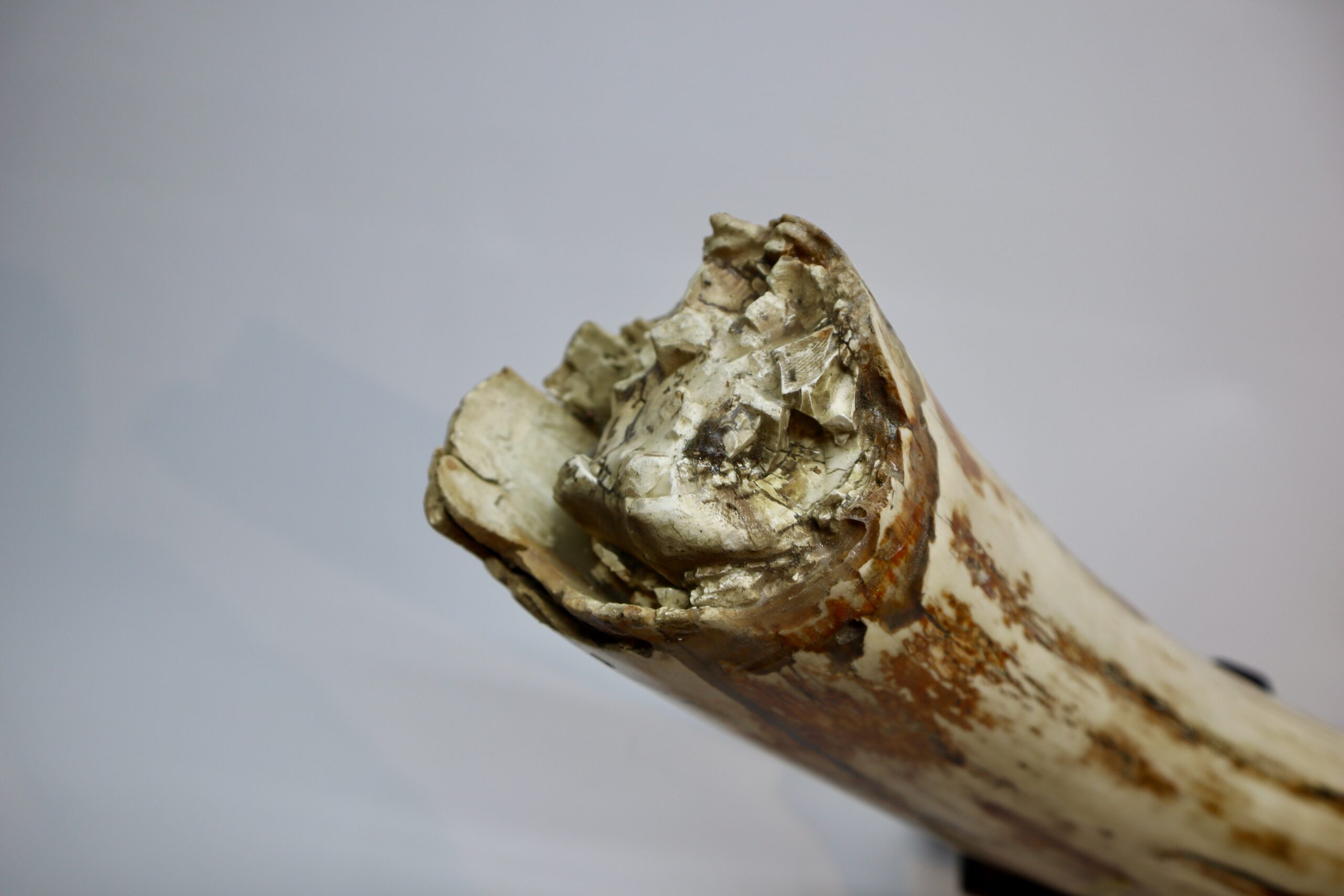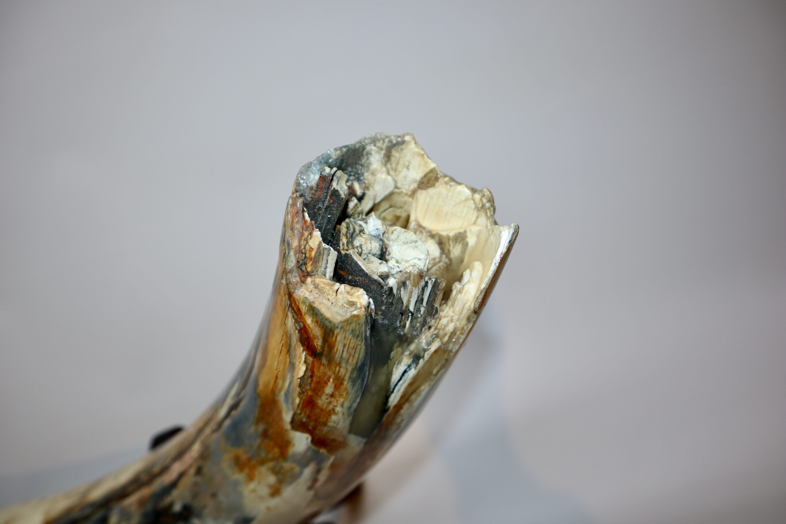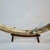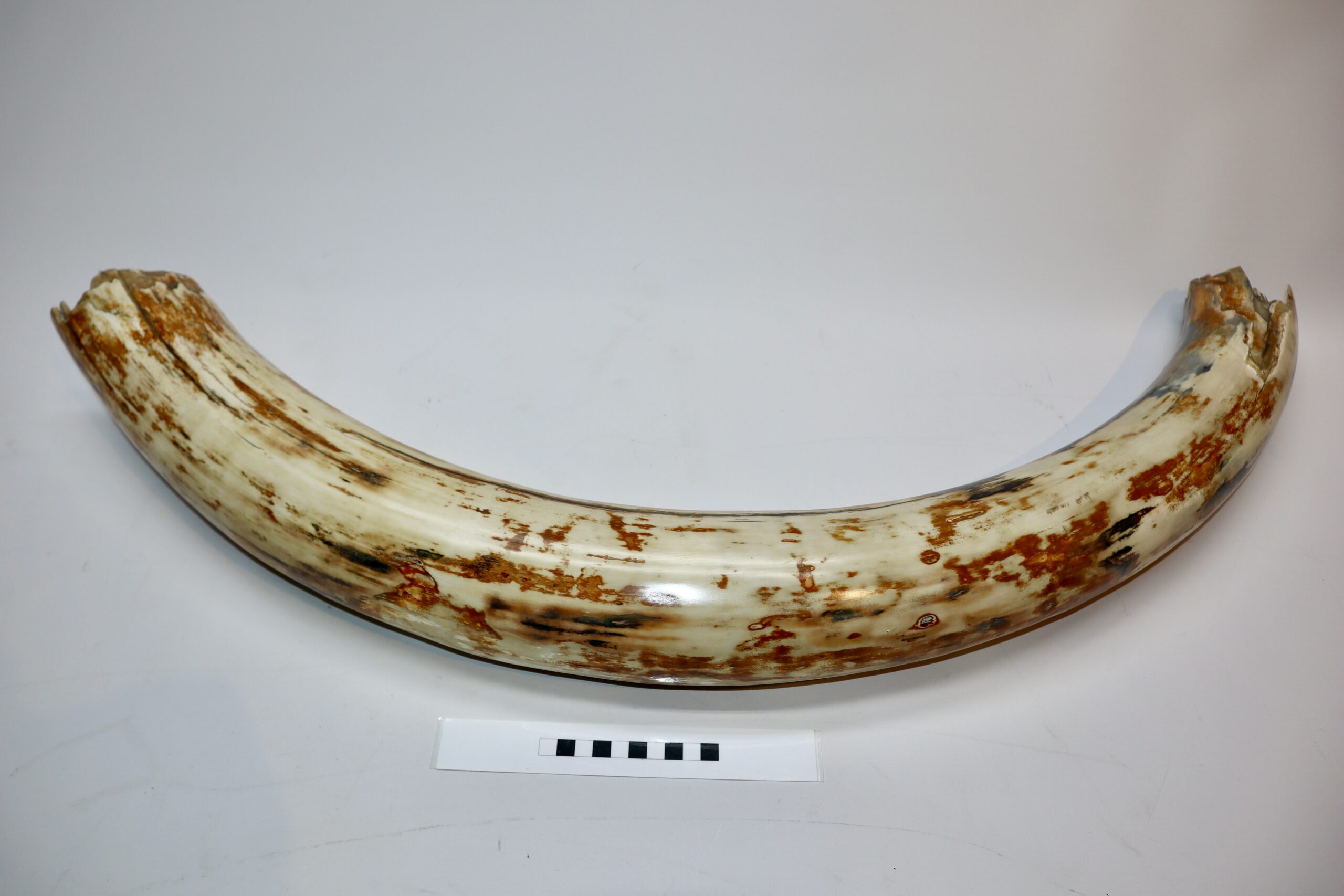 On offer is a fantastic half tusk of a Woolly Mammoth from the Pleistocene era. Although it is only a half tusk, otherwise it is in excellent condition as seen in the images. This is the middle part of the tusk, the base and tip are missing. A crack has been professionally repaired, otherwise no restoration whatsoever. This tusk piece is of beautiful ivory of mainly white, gold, grey and brown ivory, and with stunning patterning. Fantastic piece and highly recommended. The black and white section of the ruler in the image represents 10 cm / 3.9 inch. This piece has been applied with a matt finish, but it is also possible to order it with a glossy finish.
