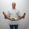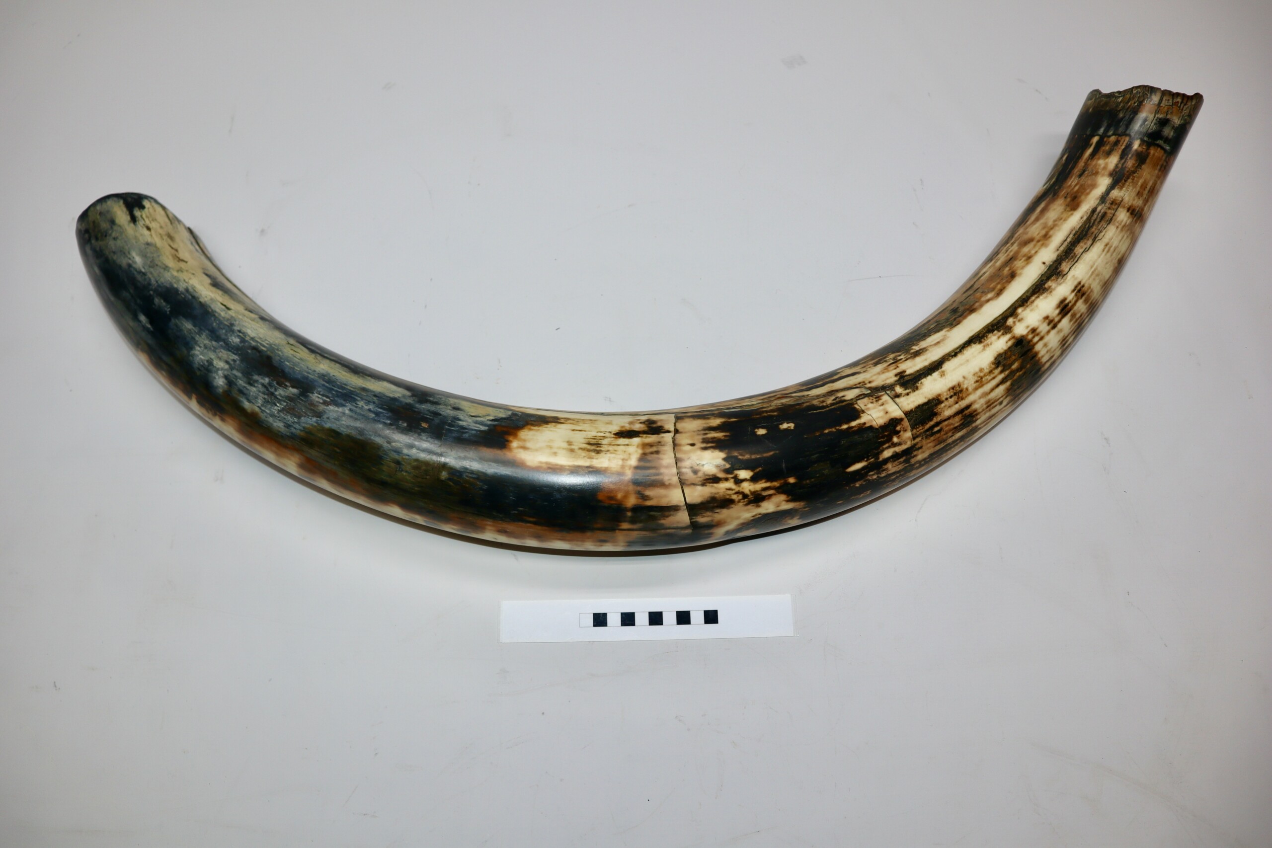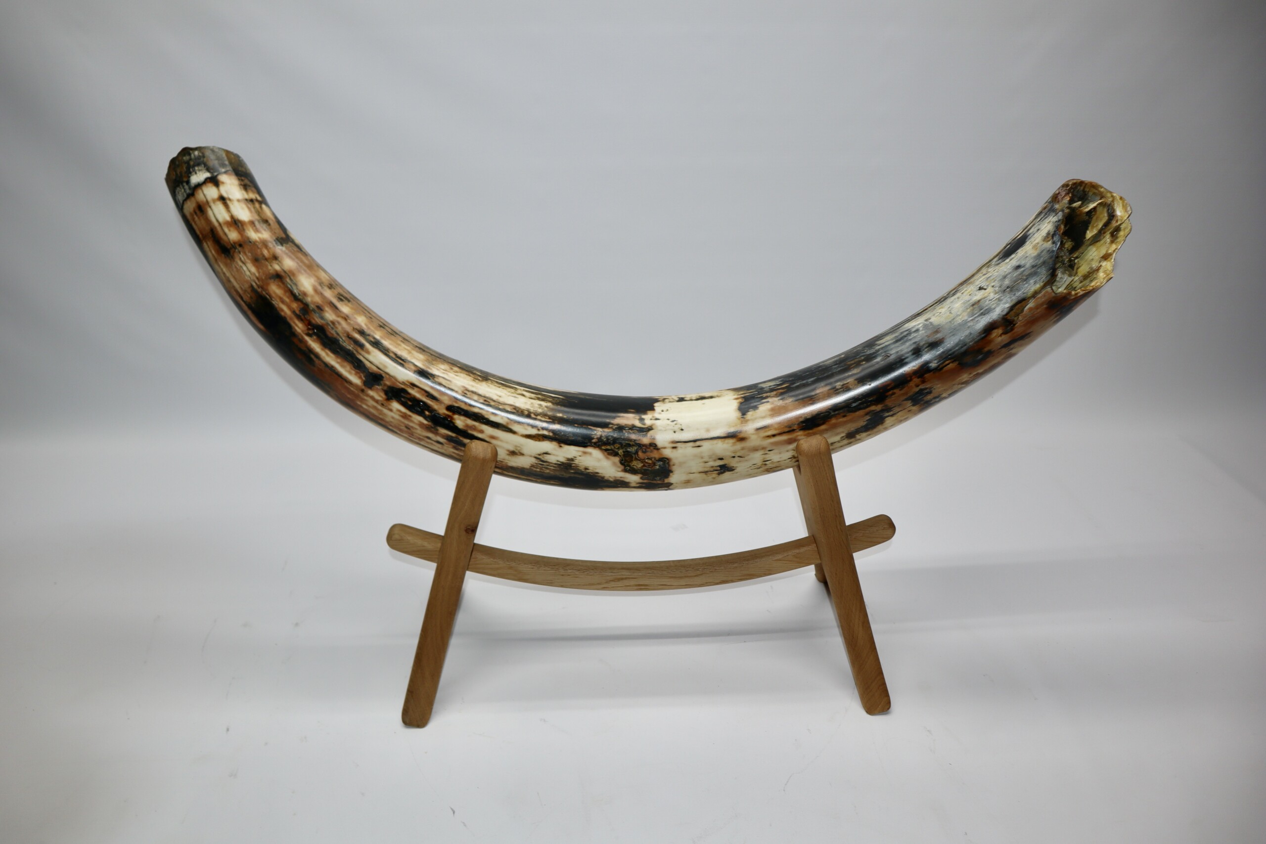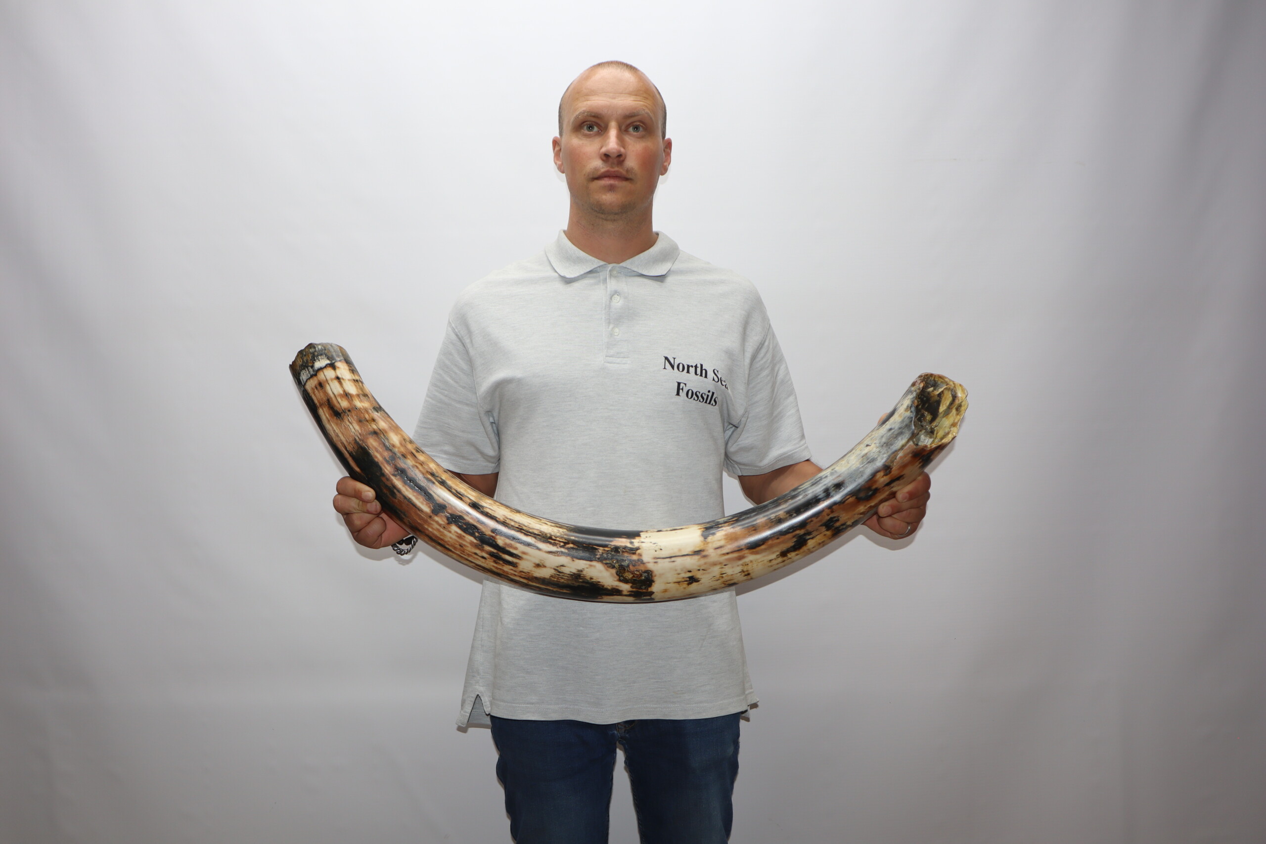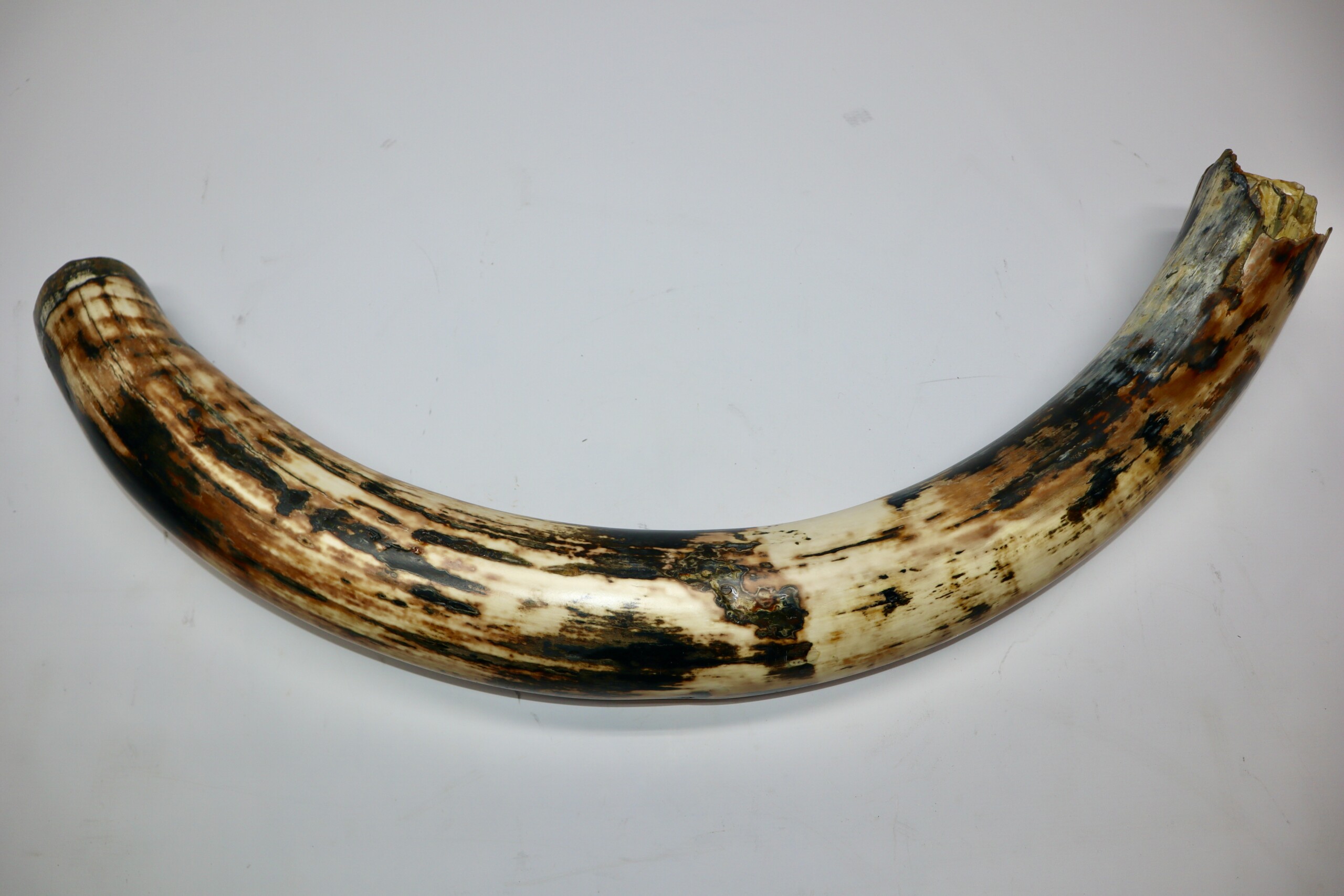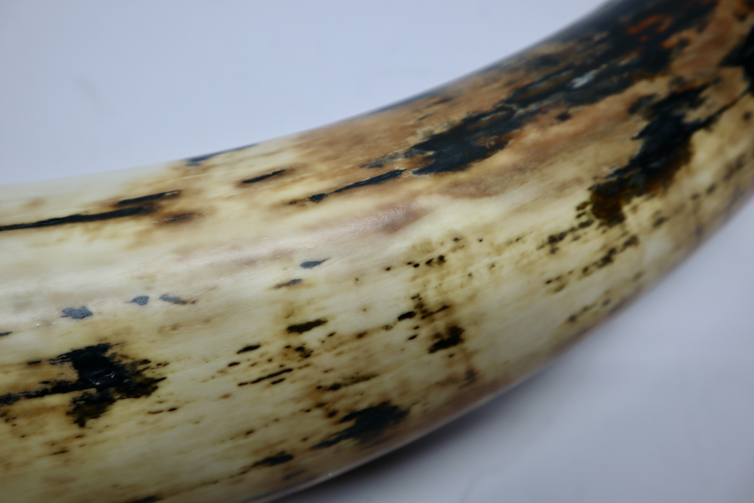 On offer is a fantastic half tusk of a Woolly Mammoth from the Pleistocene era. Although it is only a half tusk, otherwise it is in excellent condition as seen in the images. This is the middle part of the tusk, the base and tip are missing. This tusk piece is of beautiful ivory of mainly white, gold, grey andย brown ivory, and with stunning patterning. Fantastic piece and highly recommended. The black and white section of the ruler in the image represents 10 cm / 3.9 inch. This piece has been applied with a matt finish, but it is also possible to order it with a glossy finish.