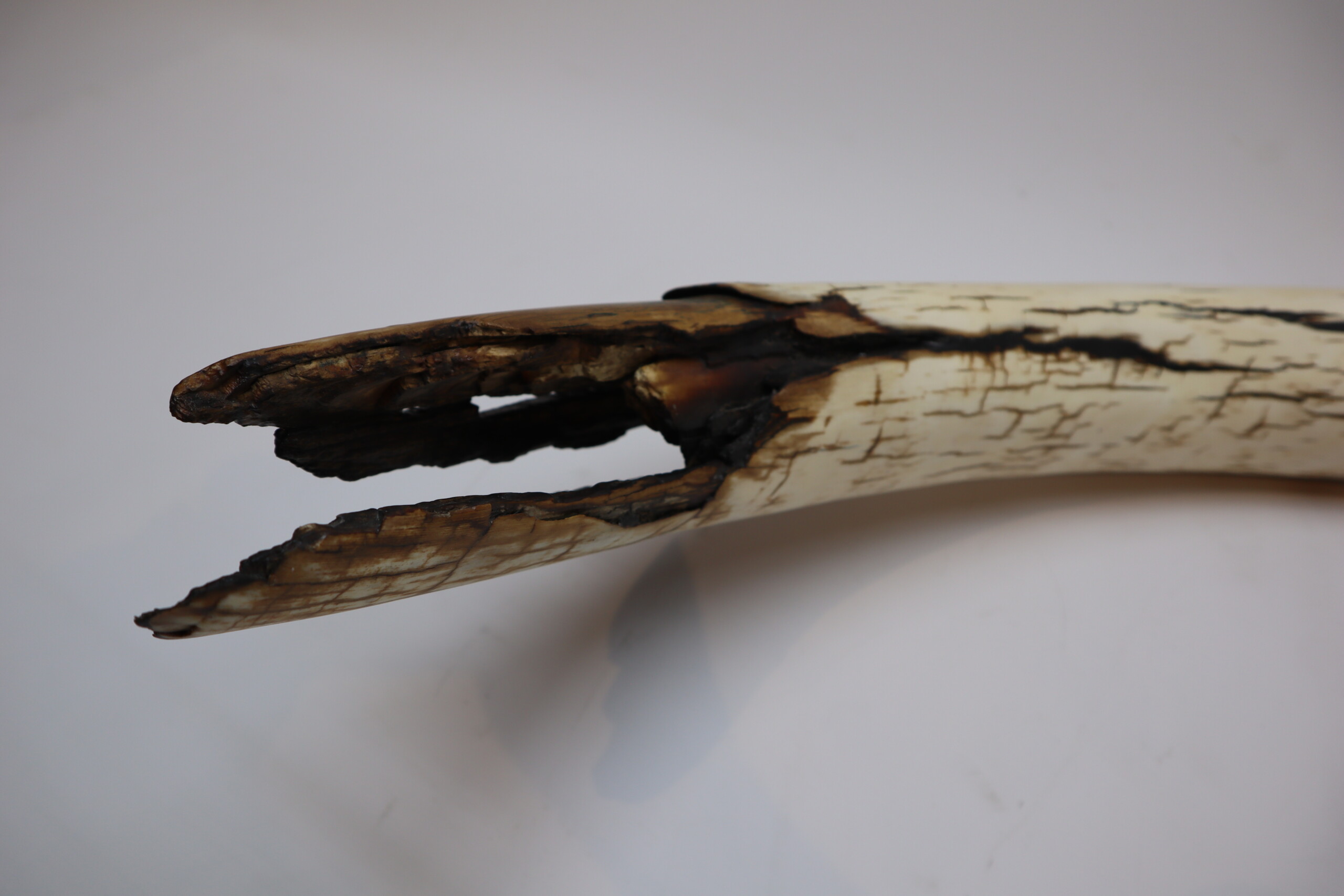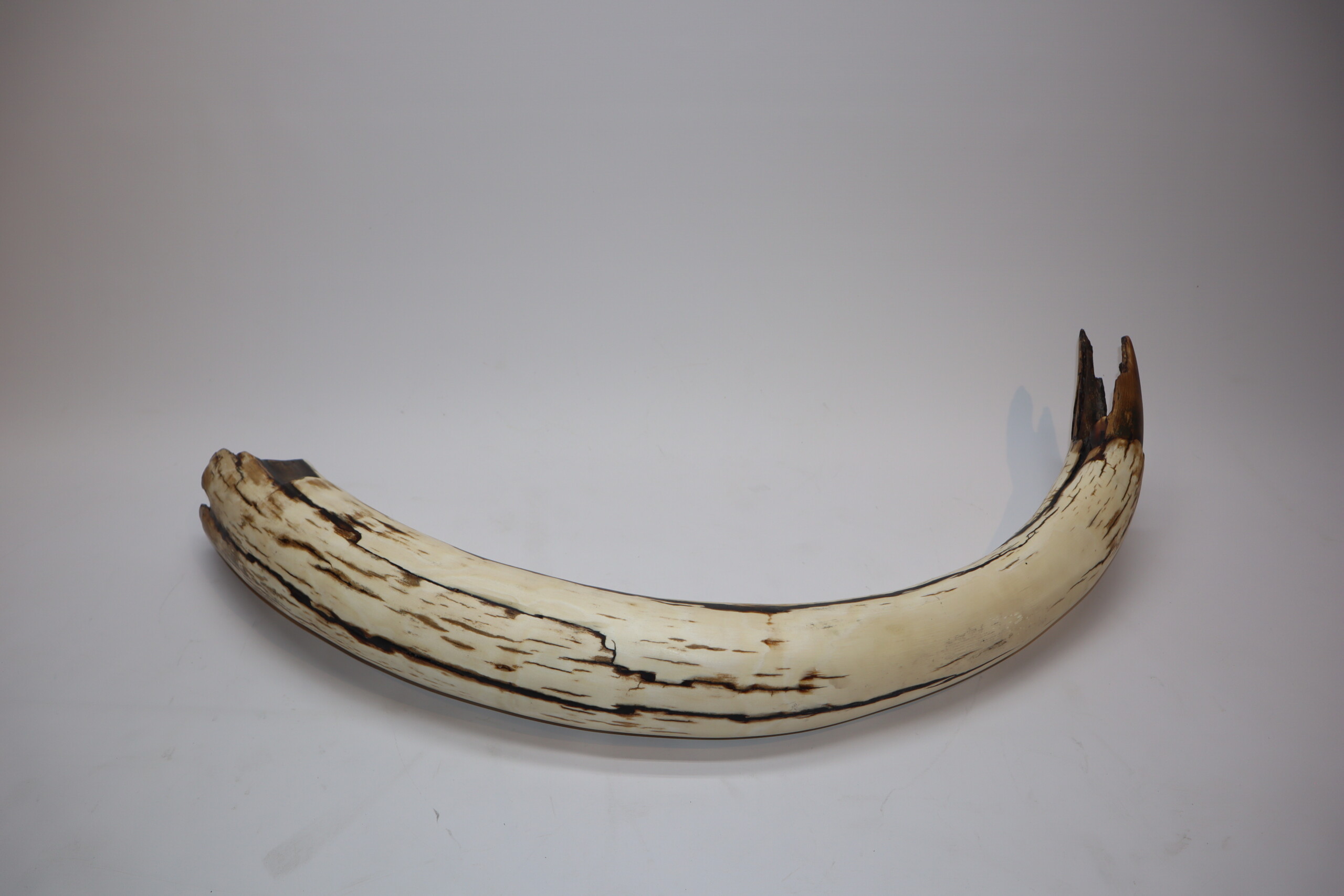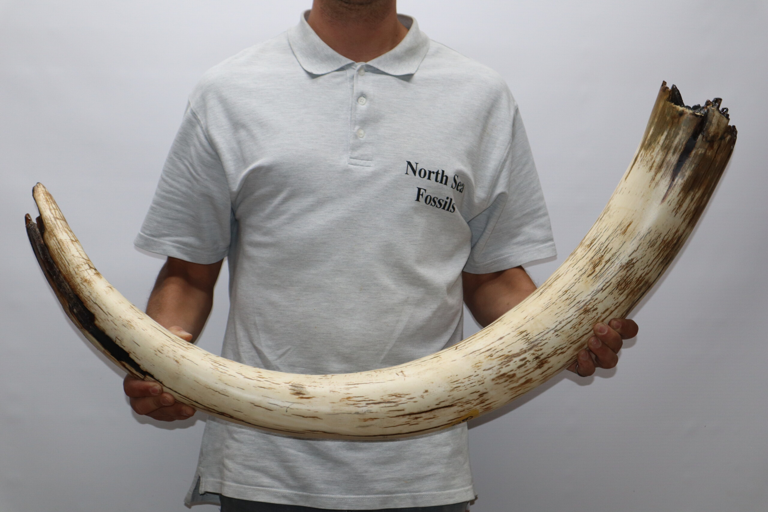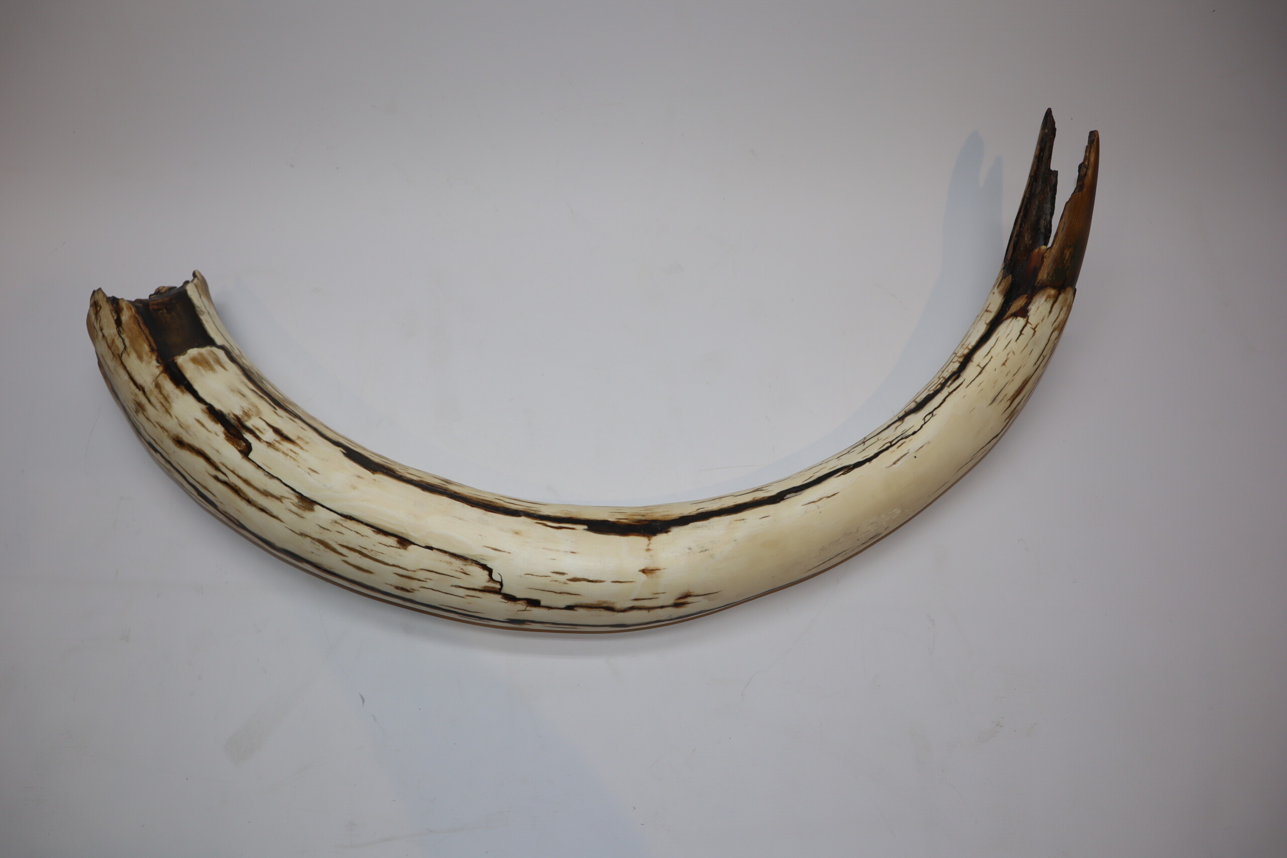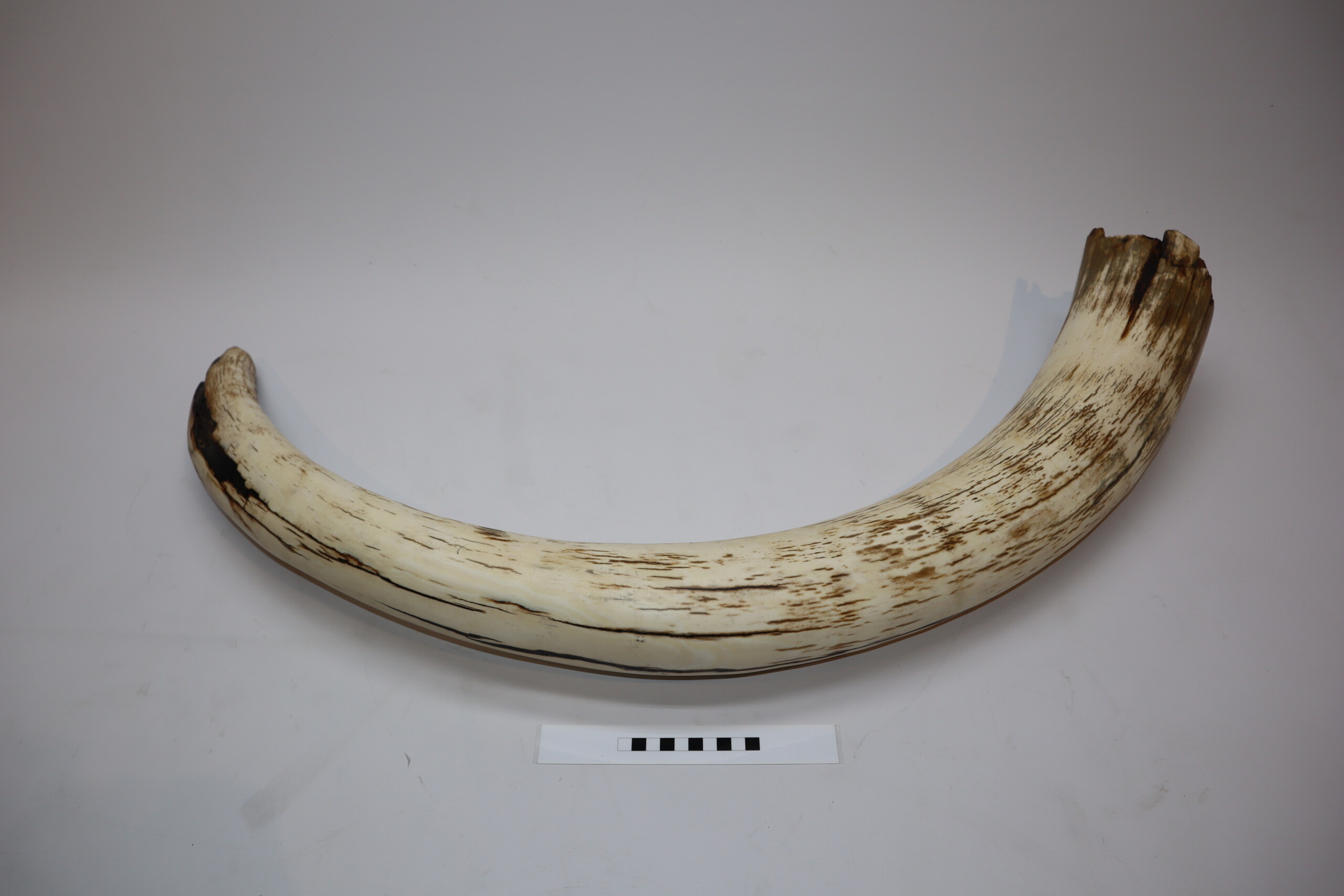 On offer is a fantastic half tusk of a Woolly Mammoth from the Pleistocene era. Although it is only a half tusk, otherwise it is in excellent condition as seen in the images. A crack has been professionally repaired, otherwise no restoration whatsoever. This tusk piece is of beautiful ivory of mainly white, gold, grey and brown ivory, and with stunning patterning. Fantastic piece and highly recommended. The black and white section of the ruler in the image represents 10 cm / 3.9 inch. This piece has been applied with a matt finish, but it is also possible to order it with a glossy finish.