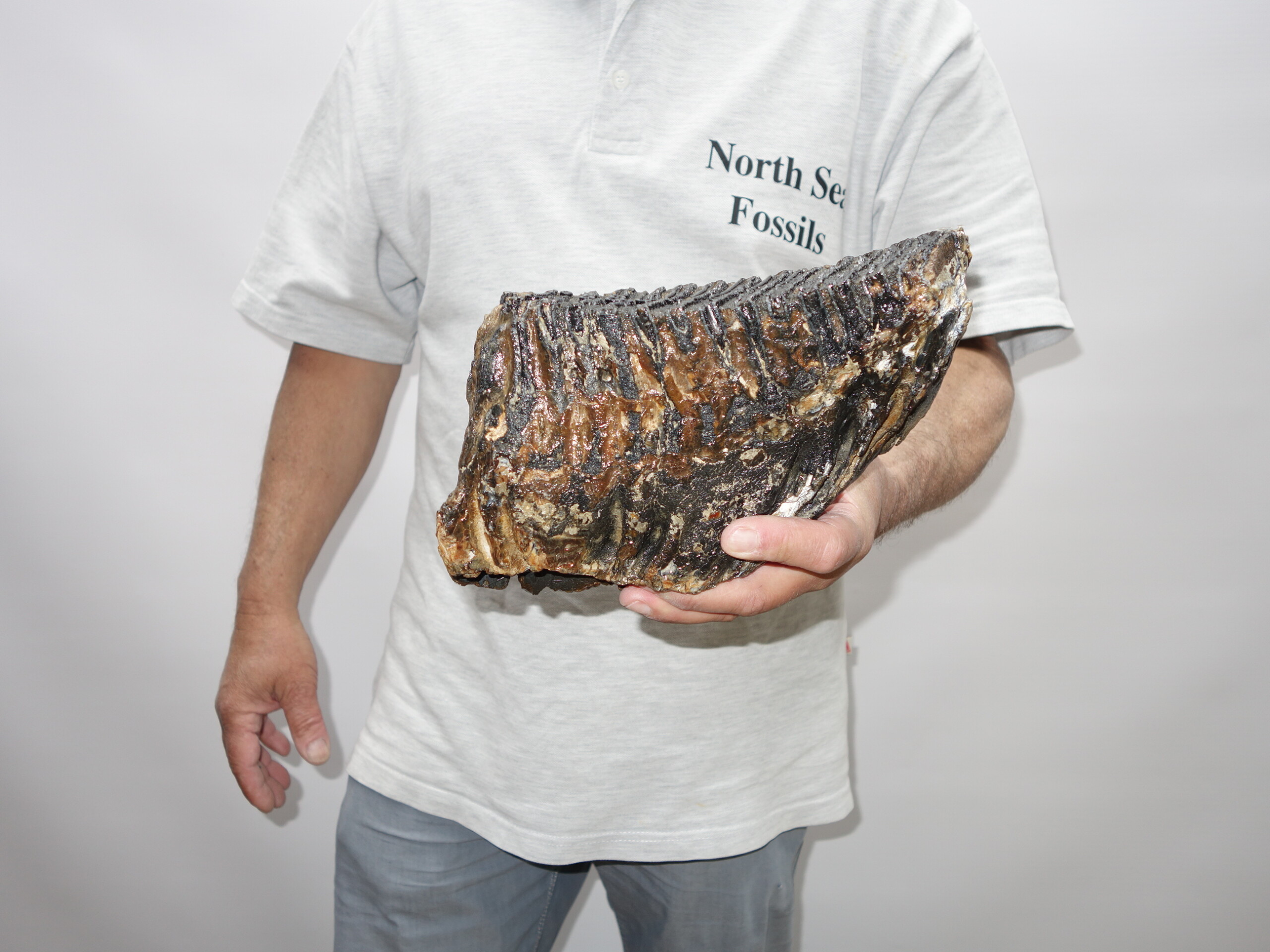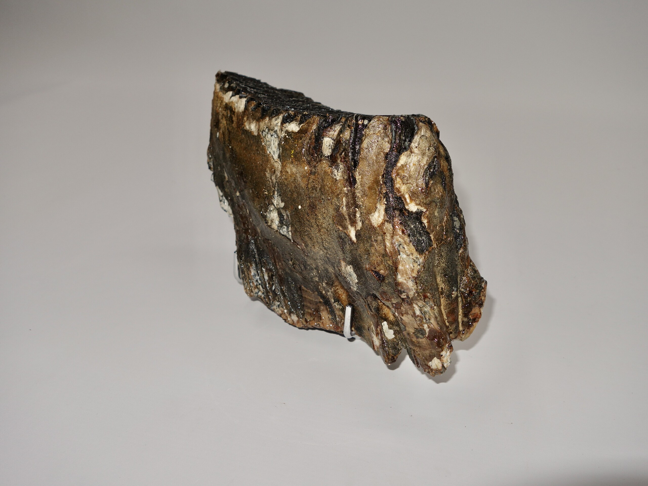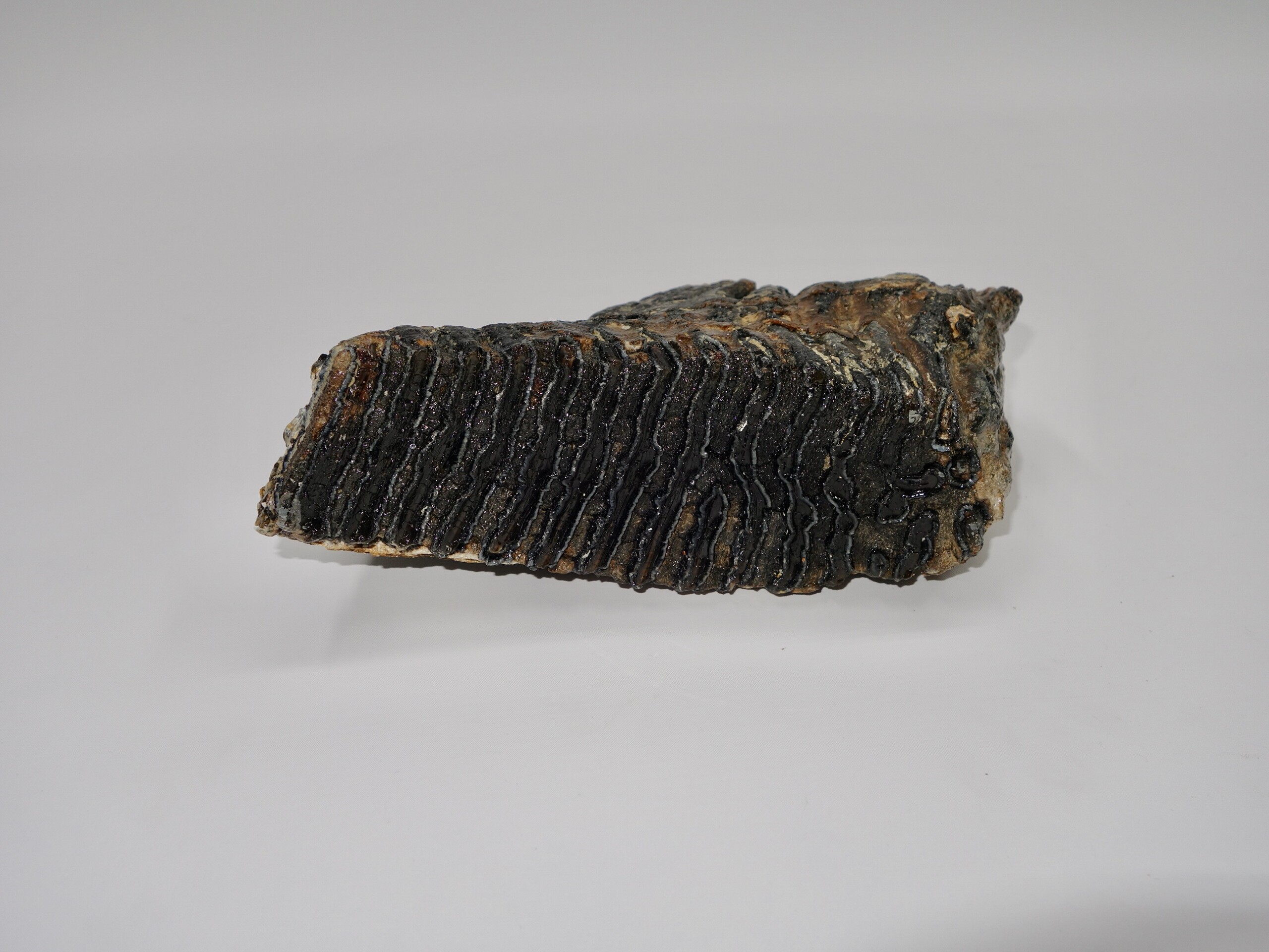 On offer is a fantastic M3 molar of an adult Woolly Mammoth from the Pleistocene era. This molar comes from the right lower jaw. Fantastic quality tooth with beautiful chewing surface. Wonderful state of preservation, as seen in the images, and no restoration whatsoever. Judging from the size, this molar belonged to an adult Mammoth. The black and white section of the ruler in the image represents 10 cm / 3.9 inch.