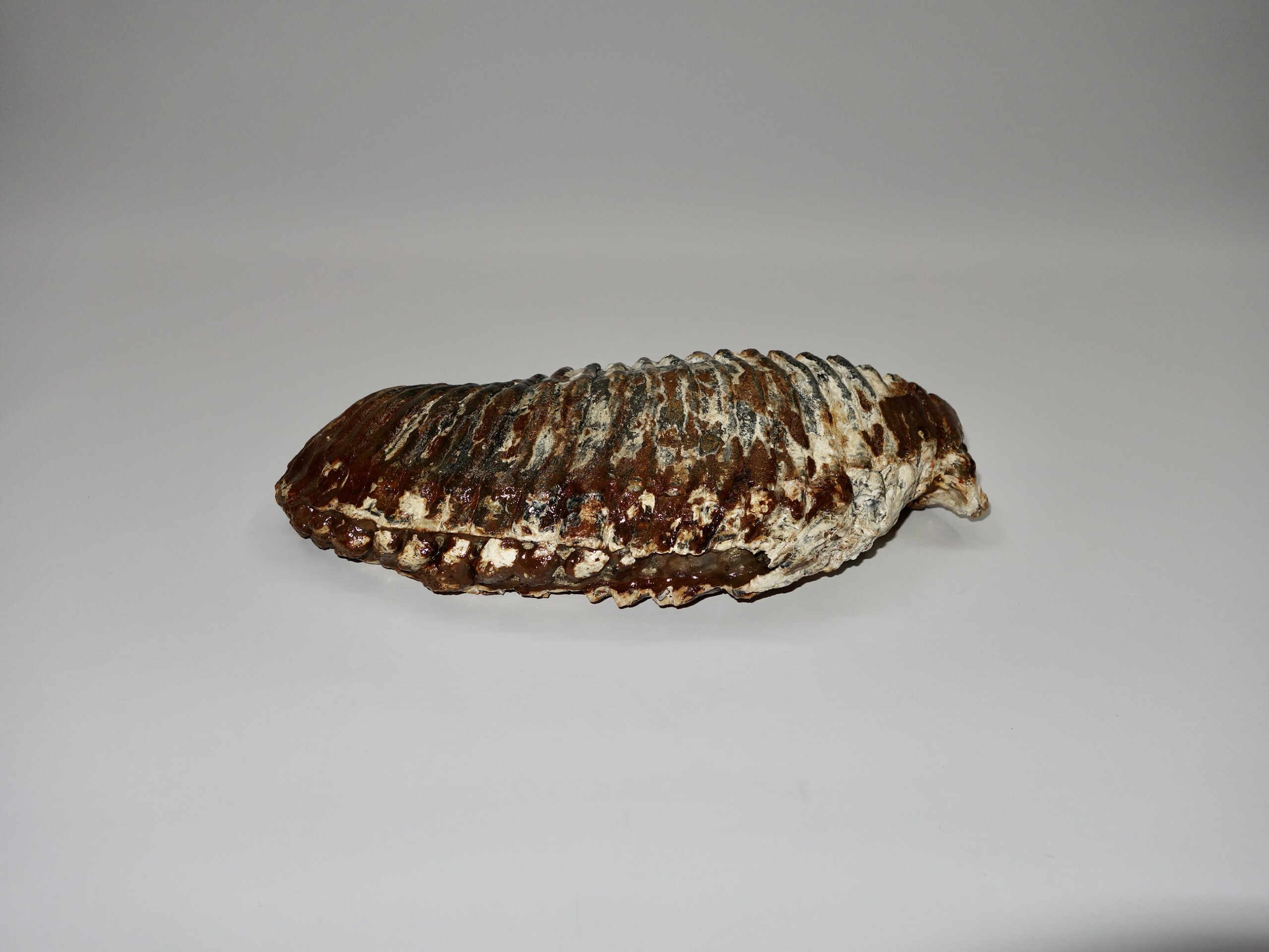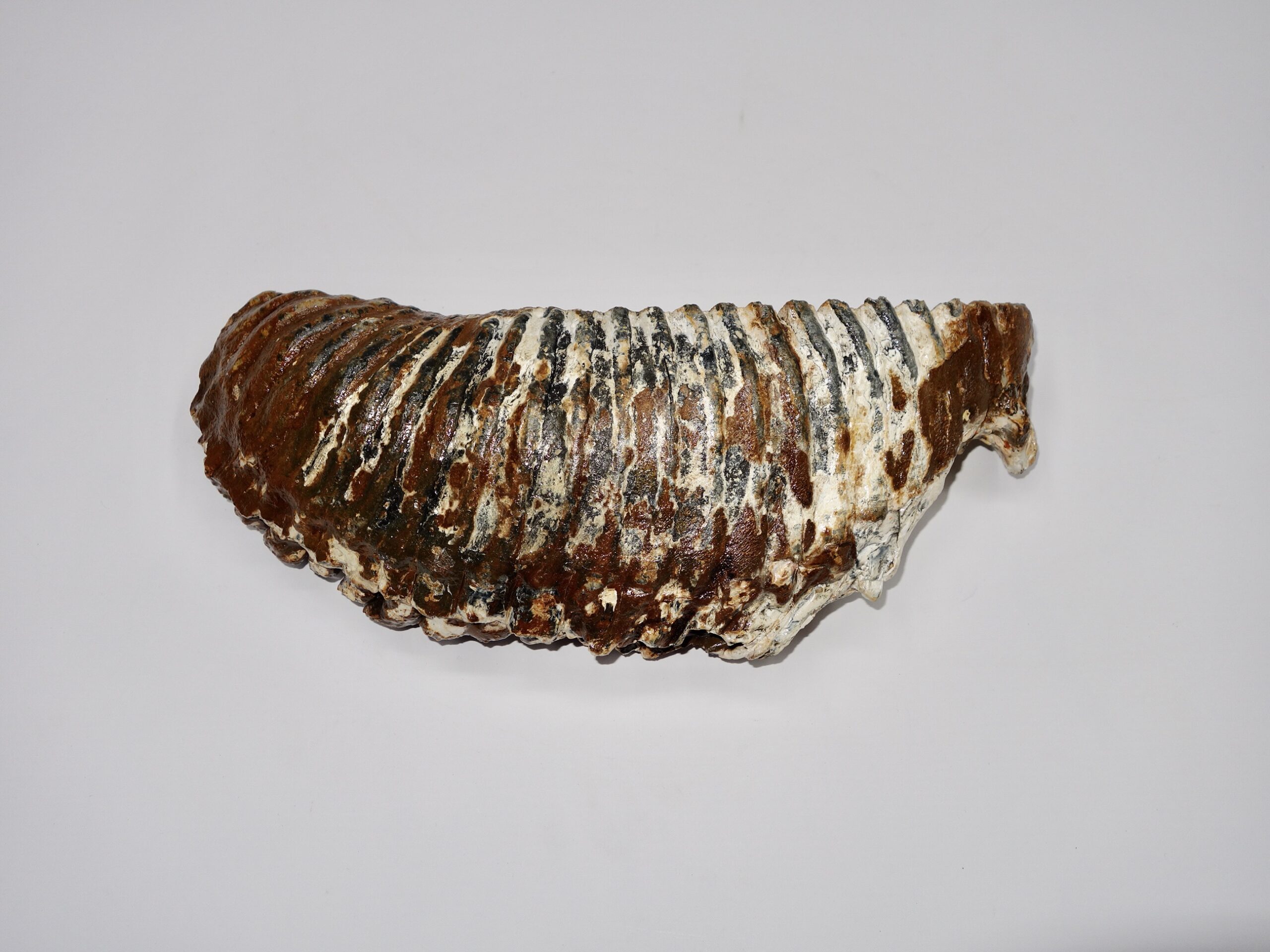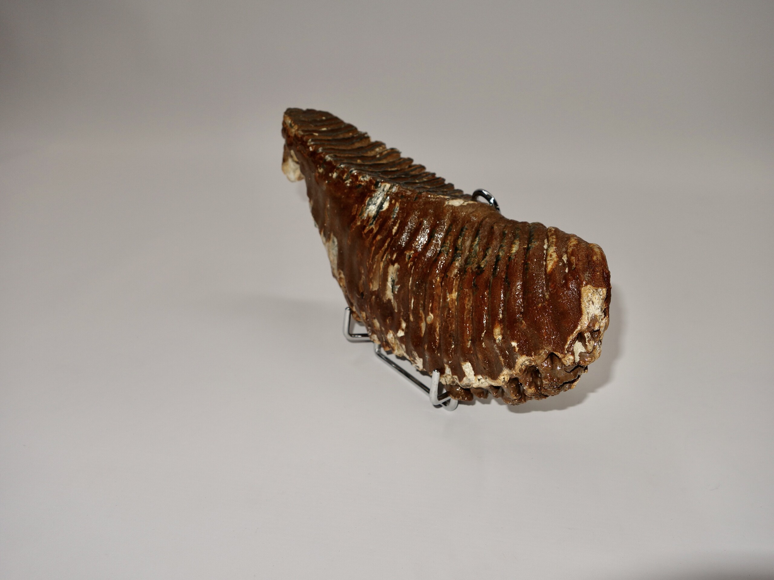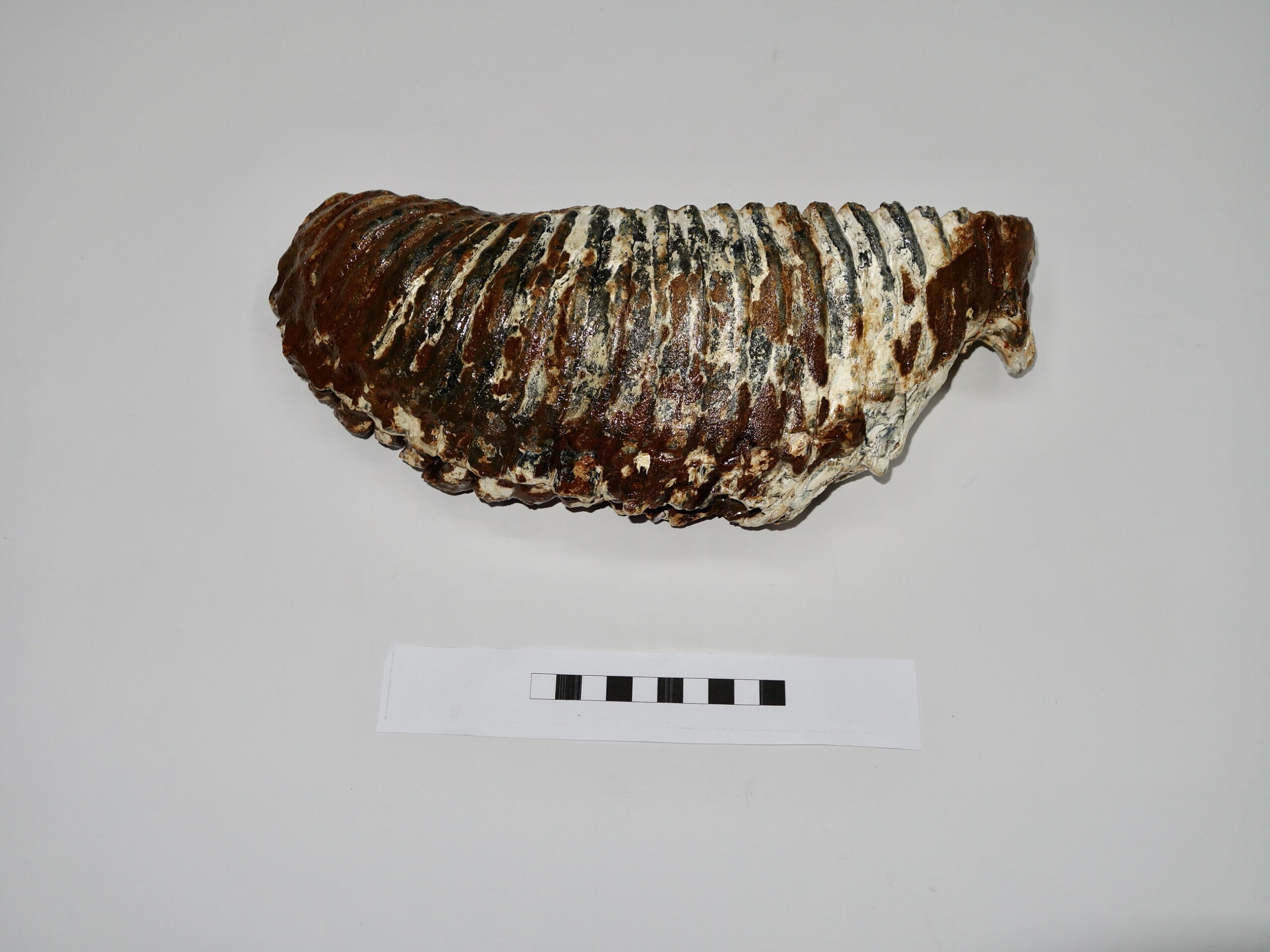 On offer is a fantastic M3 molar of an adult Woolly Mammoth from the Pleistocene era. This molar comes from the left lower jaw. Fantastic quality tooth with beautiful chewing surface. Wonderful state of preservation, as seen in the images, and no restoration whatsoever. Judging from the size, this molar belonged to an adult Mammoth. The black and white section of the ruler in the image represents 10 cm / 3.9 inch.