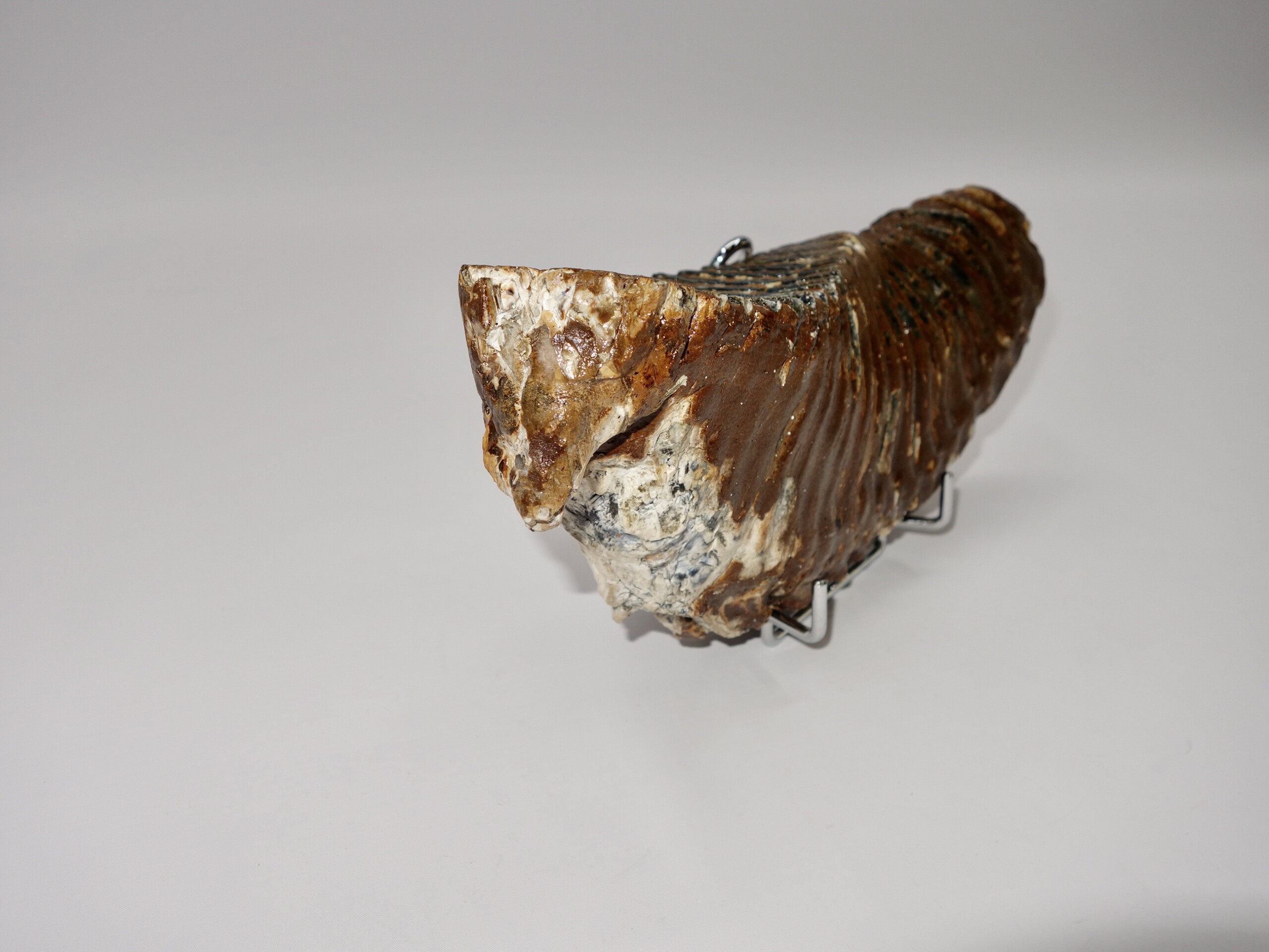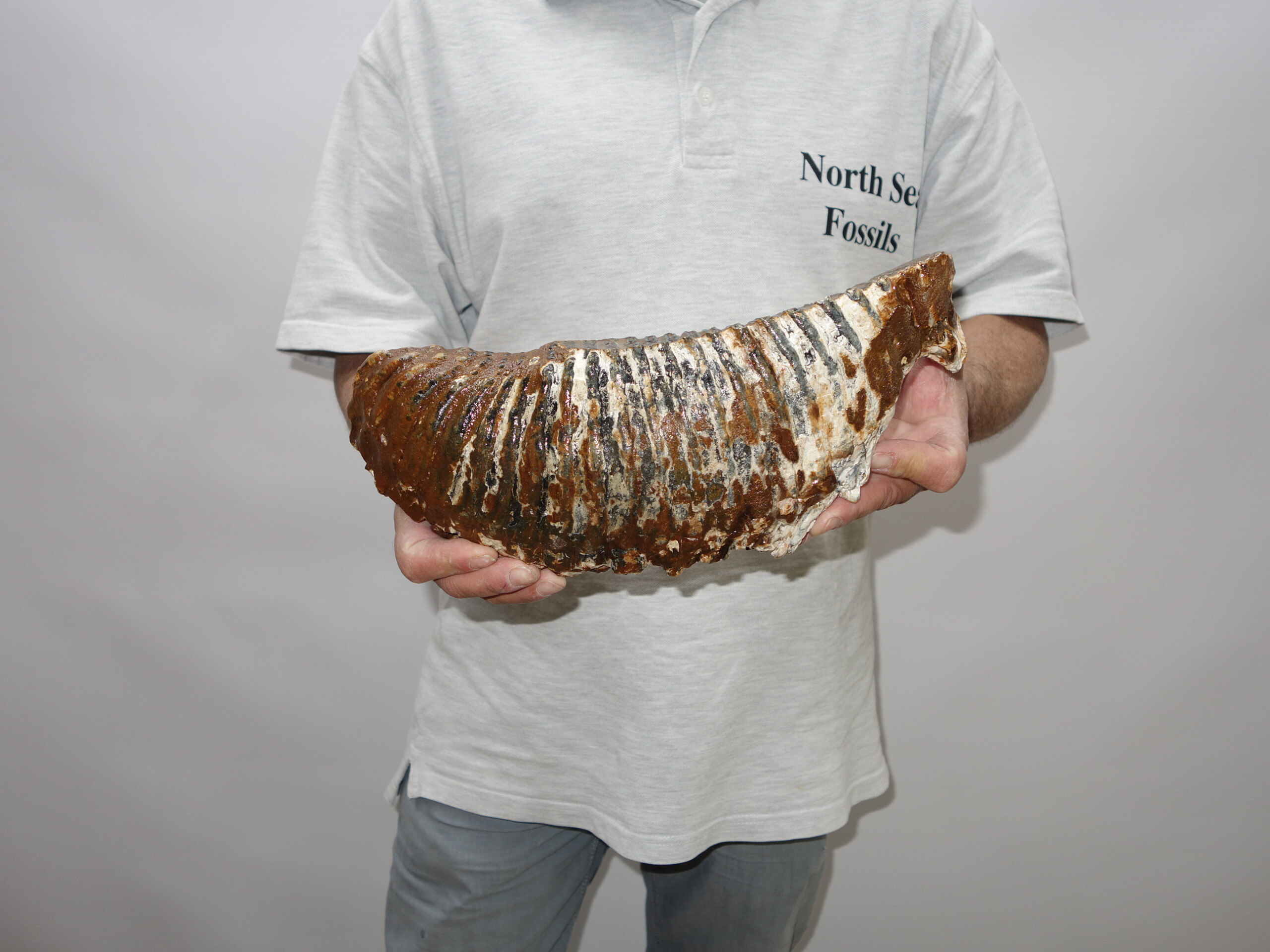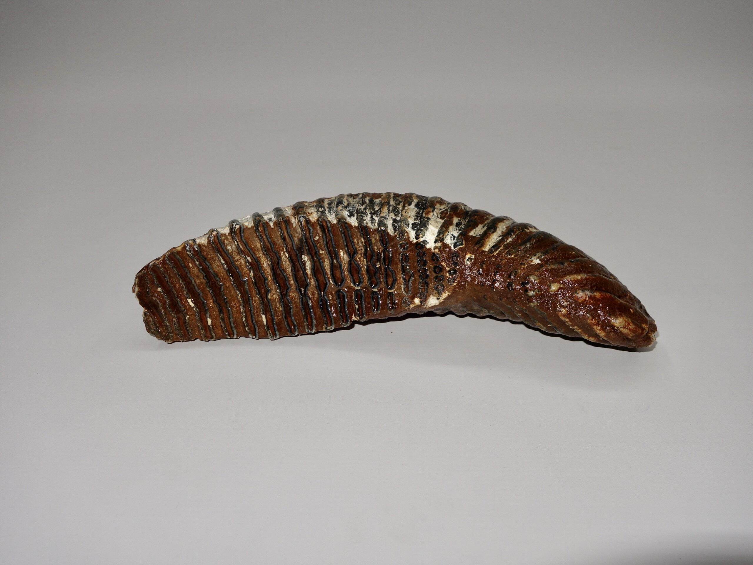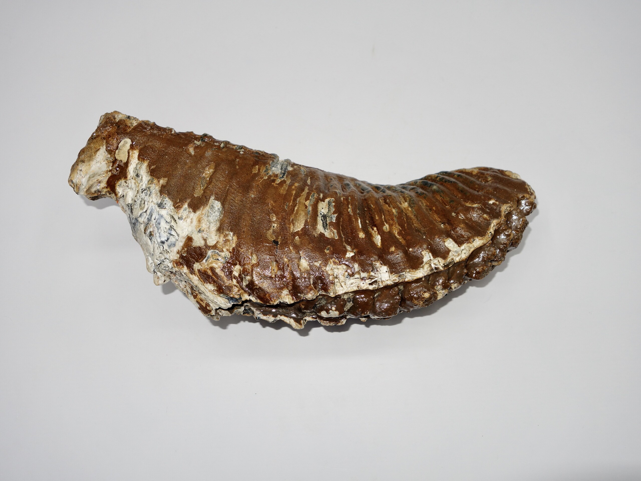 On offer is a fantastic M3 molar of an adult Woolly Mammoth from the Pleistocene era. This molar comes from the left lower jaw. Fantastic quality tooth with beautiful chewing surface. Wonderful state of preservation, as seen in the images, and no restoration whatsoever. Judging from the size, this molar belonged to an adult Mammoth. The black and white section of the ruler in the image represents 10 cm / 3.9 inch.