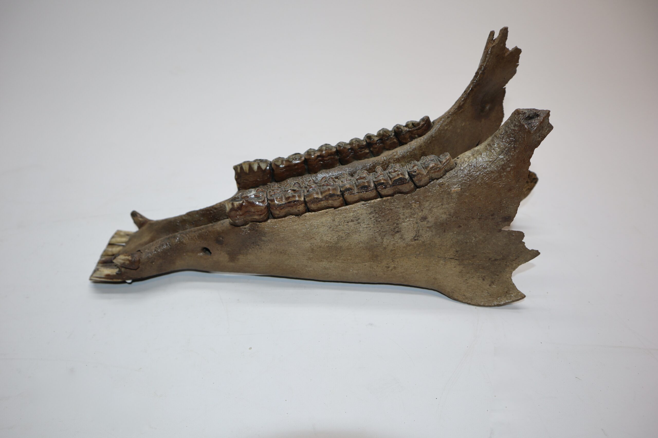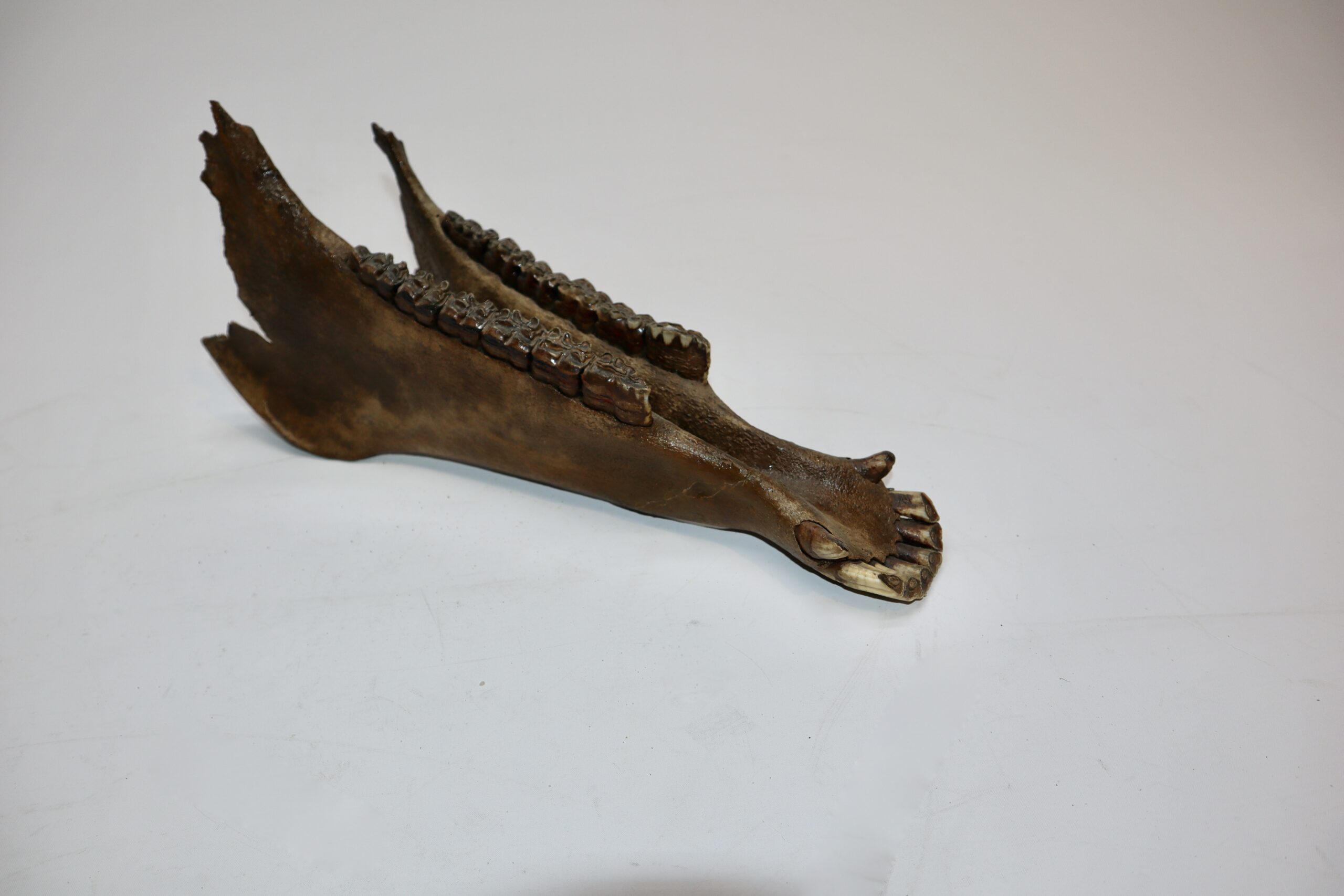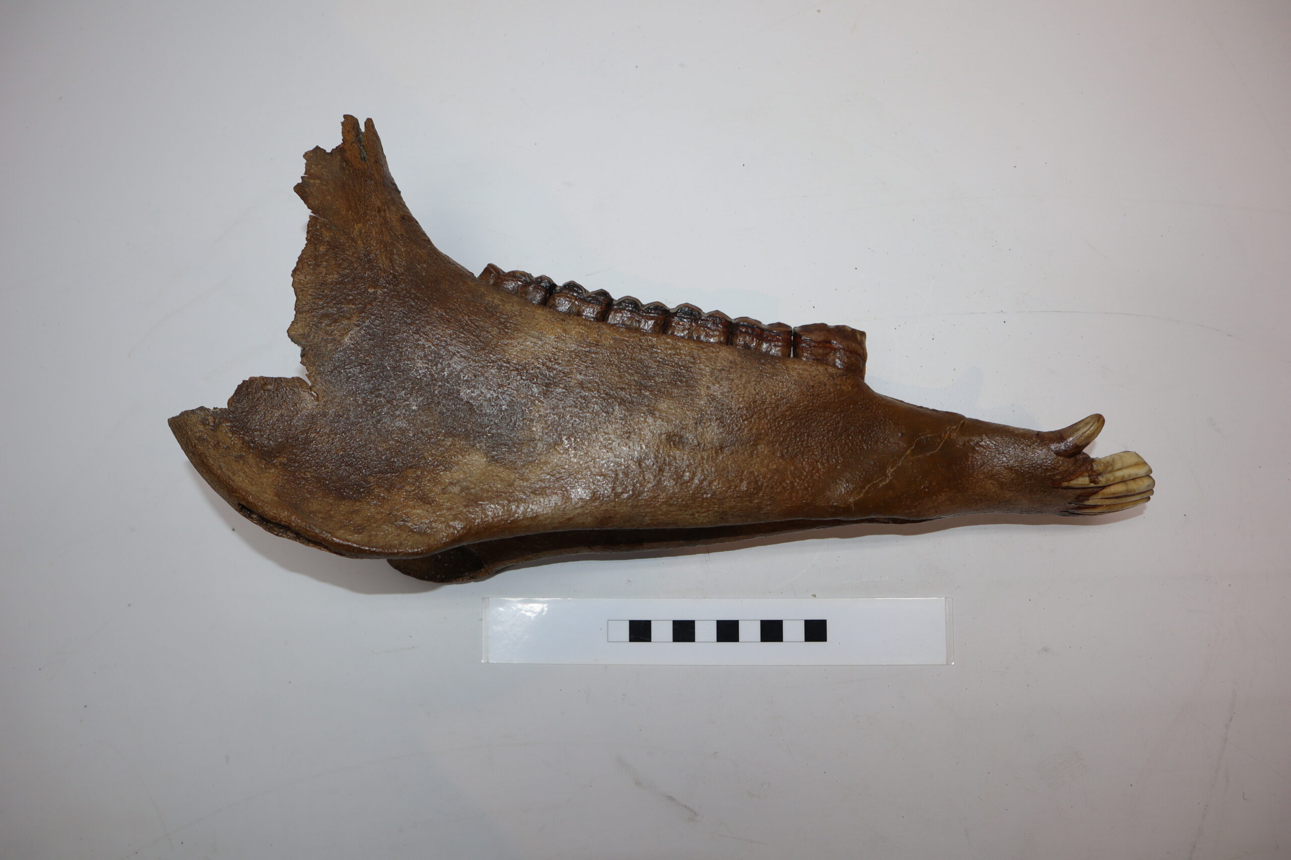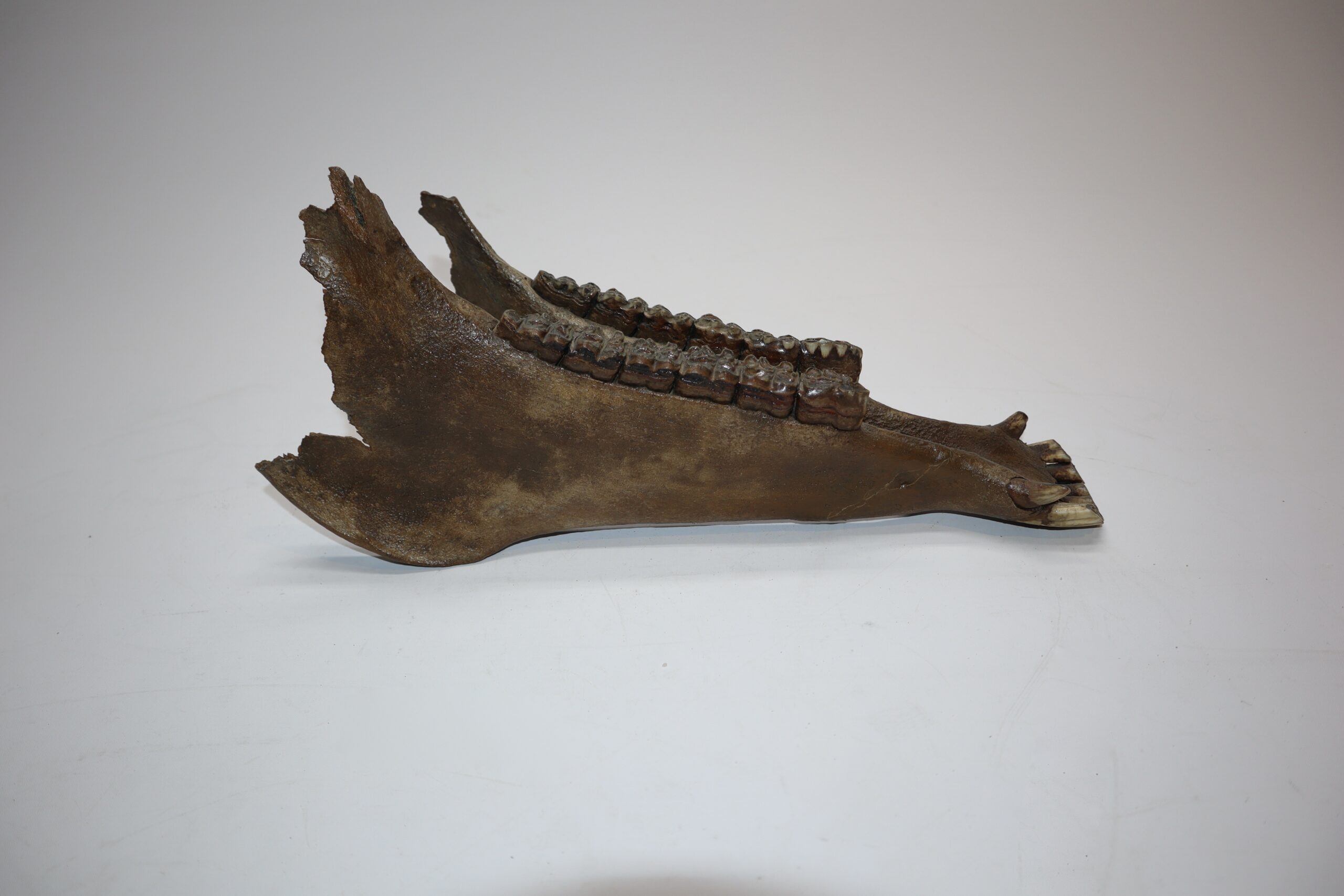 On offer is an interesting partial lower jaw of an adult horse from the Pleistocene era. This piece is in good state of preservation and still includes all the original molars and incisors, as seen in the images. No restoration whatsoever. The black and white section of the ruler in the image represents 10 cm / 3.9 inch.
