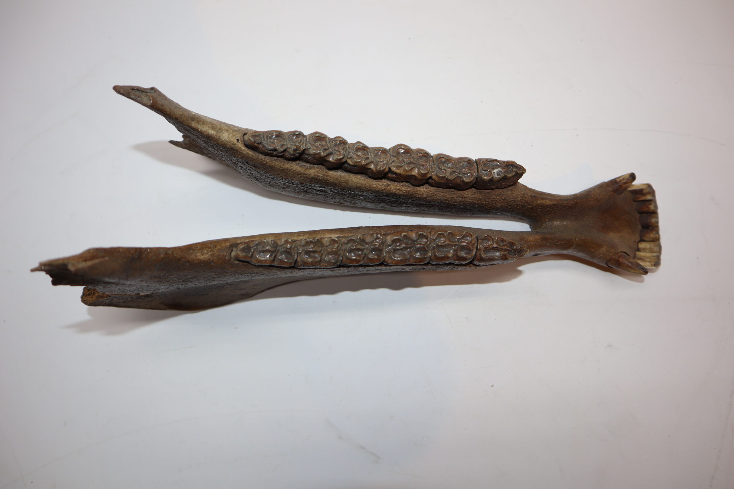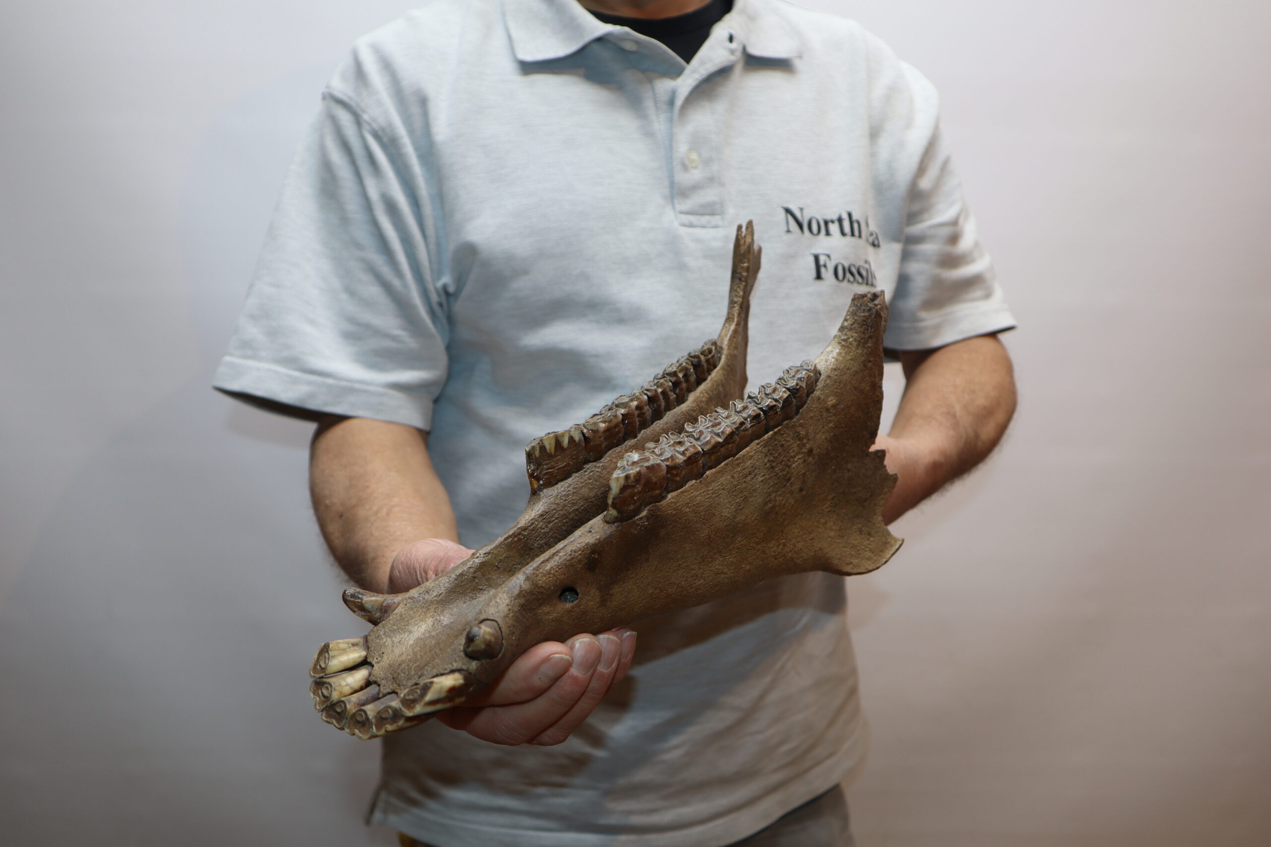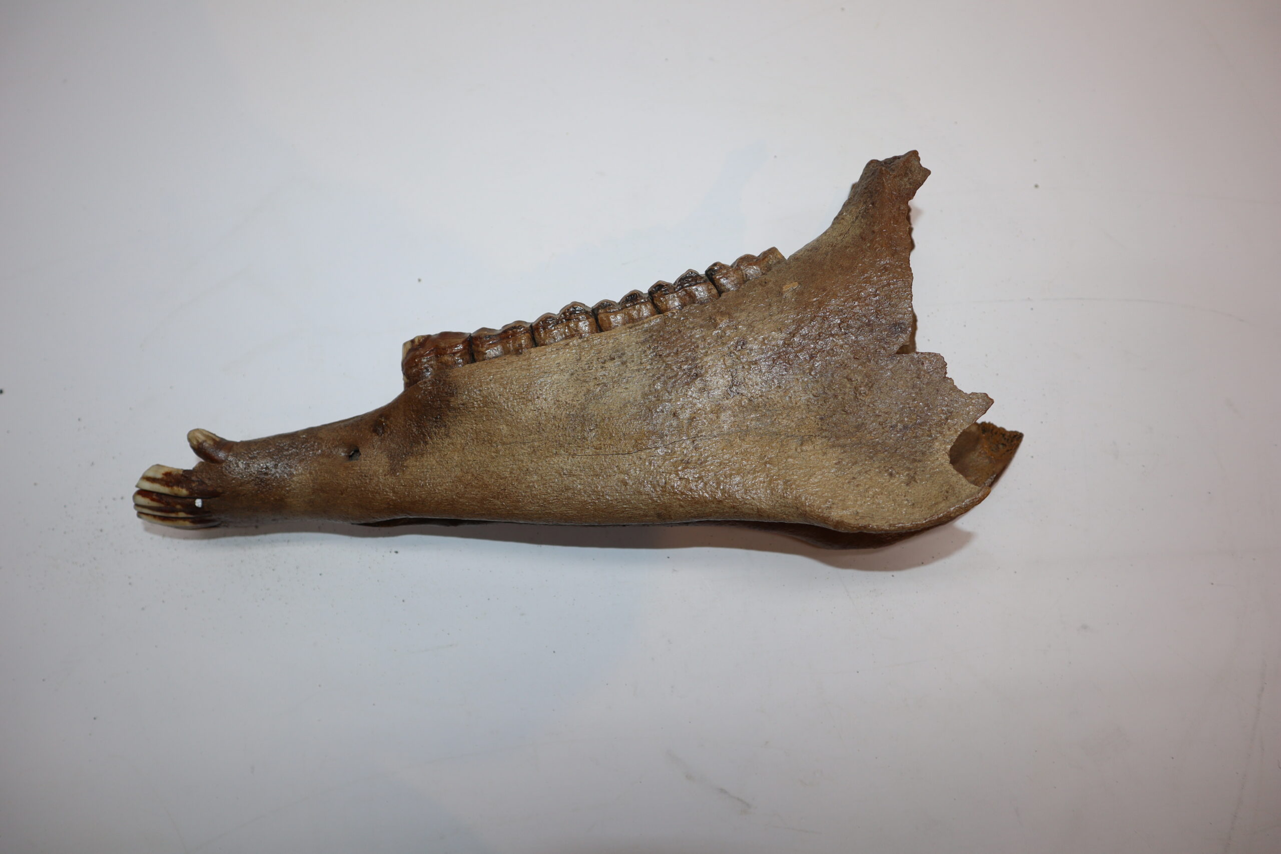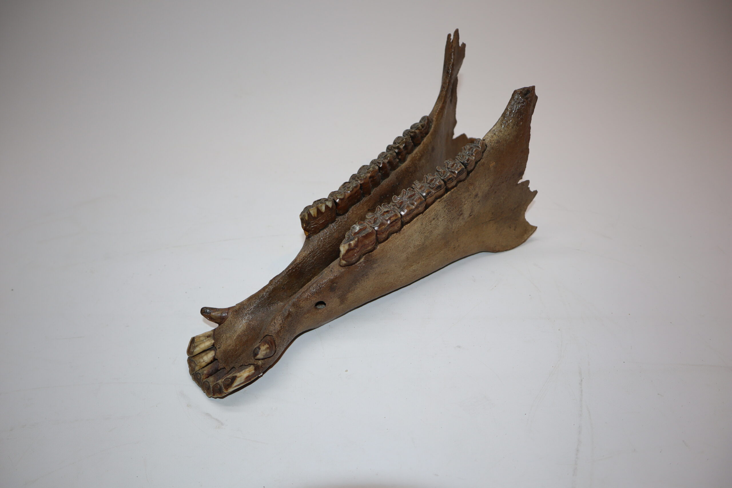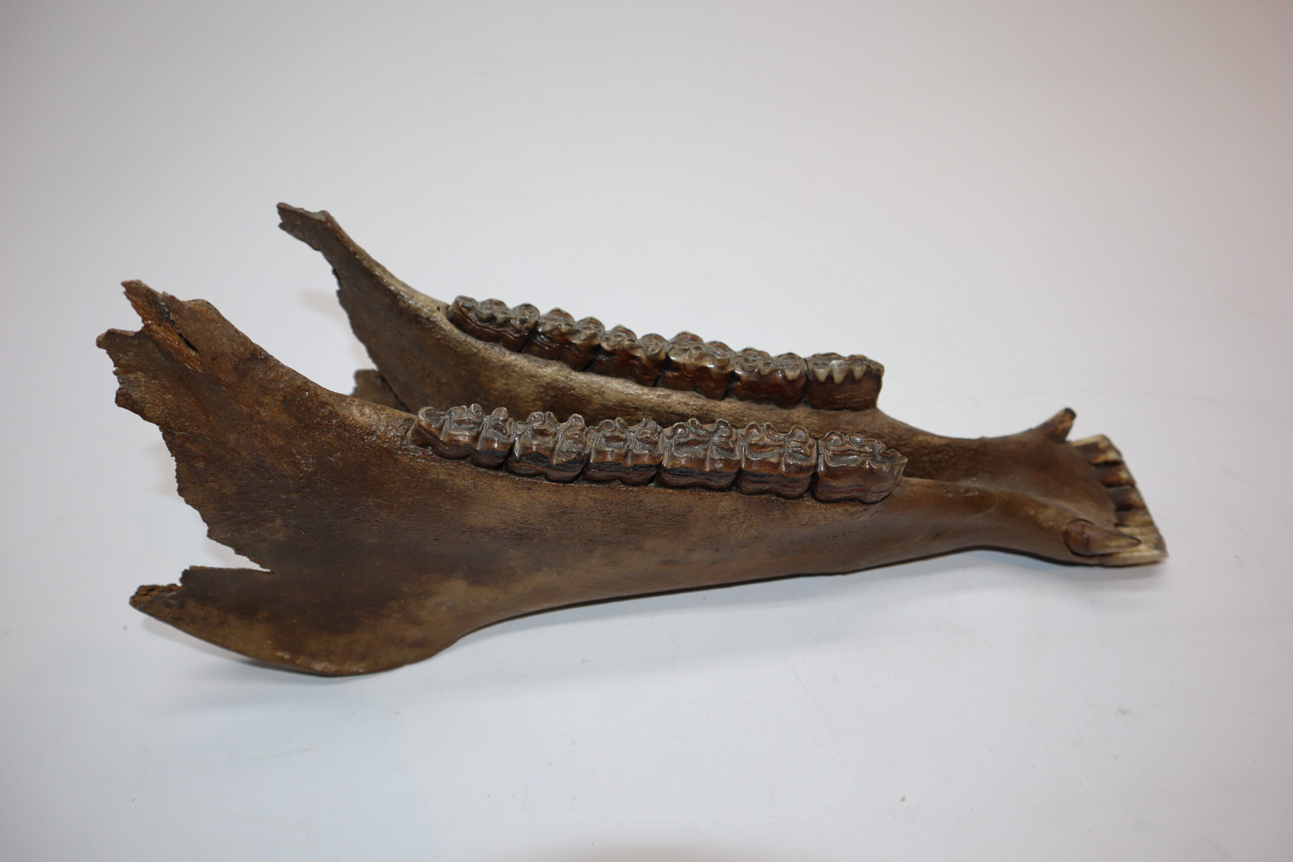 On offer is an interesting partial lower jaw of an adult horse from the Pleistocene era. This piece is in good state of preservation and still includes all the original molars and incisors, as seen in the images. No restoration whatsoever. The black and white section of the ruler in the image represents 10 cm / 3.9 inch.