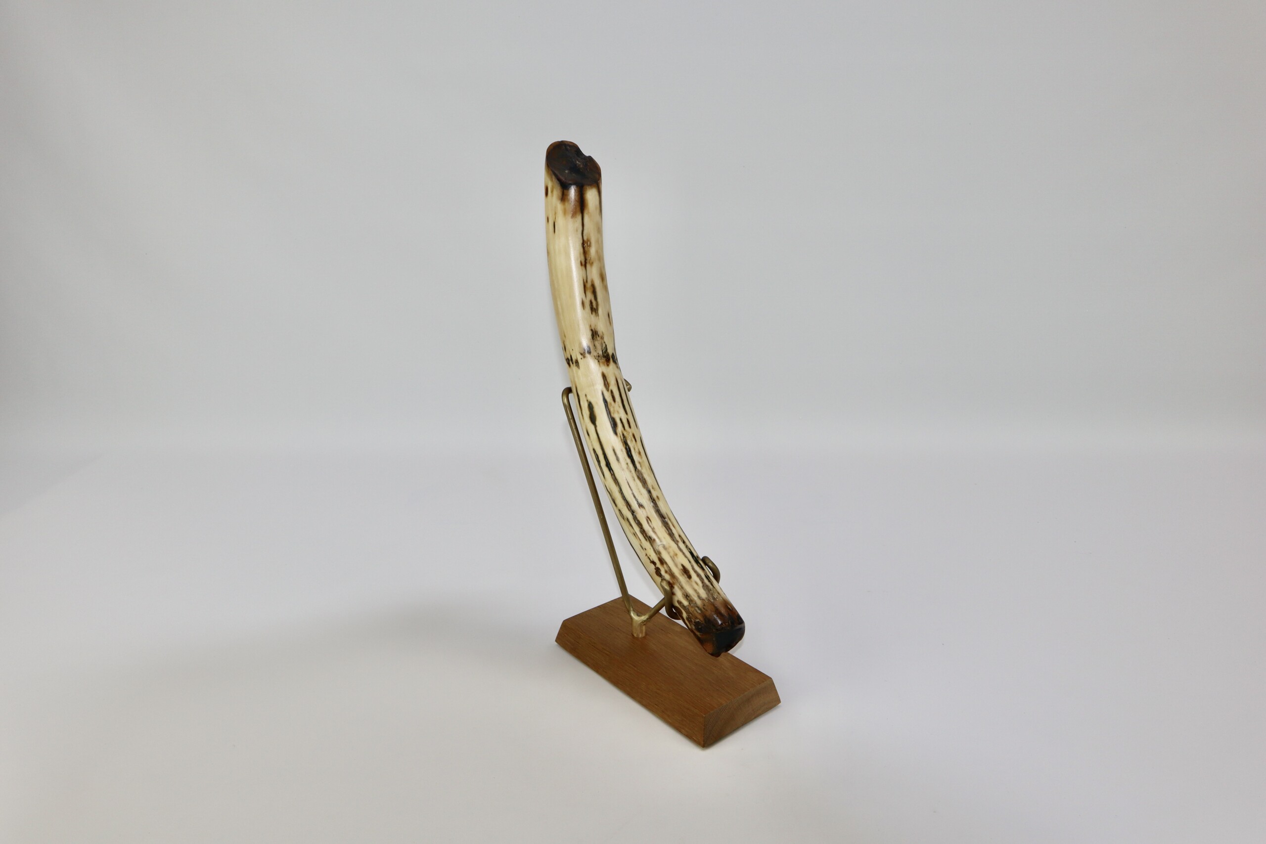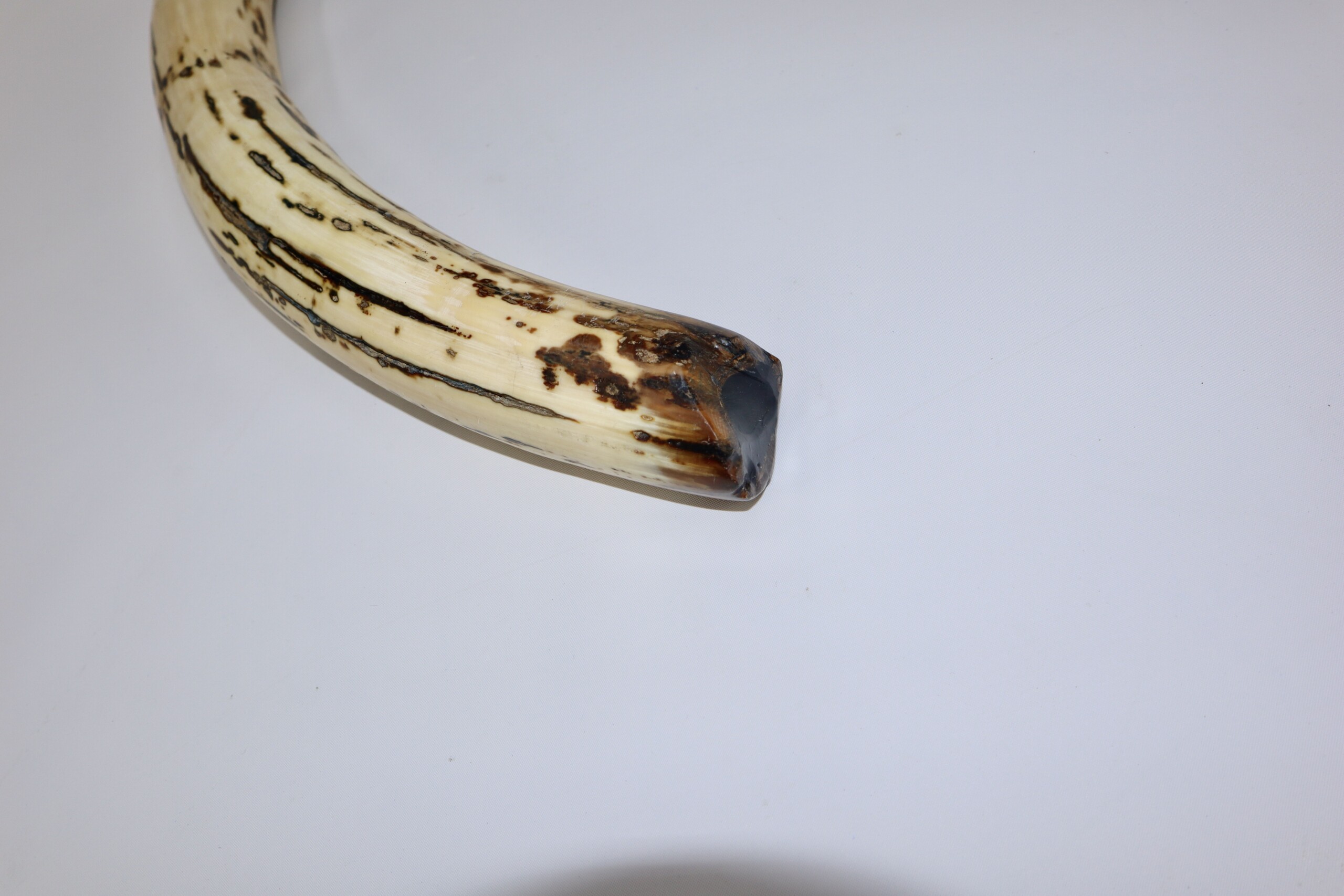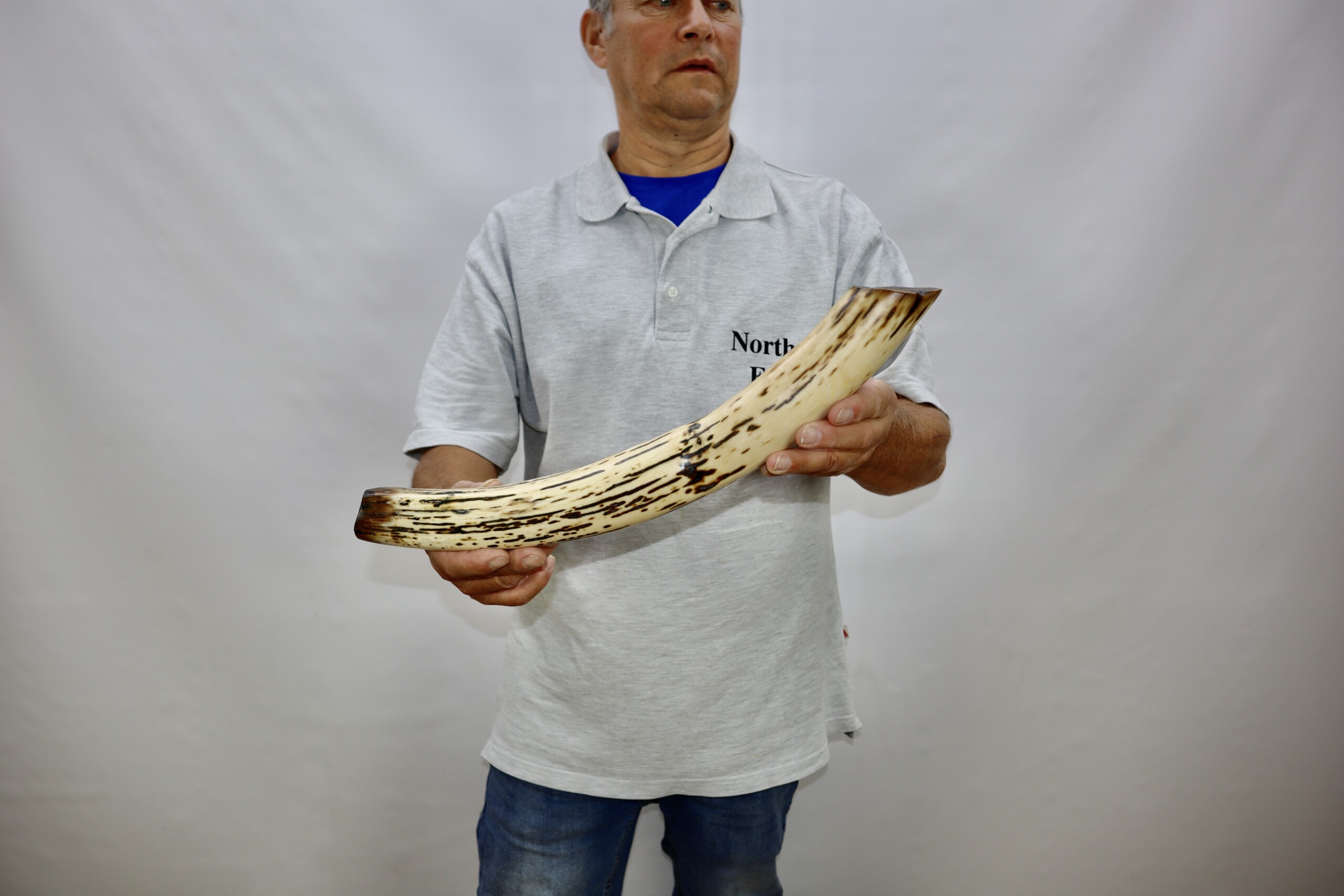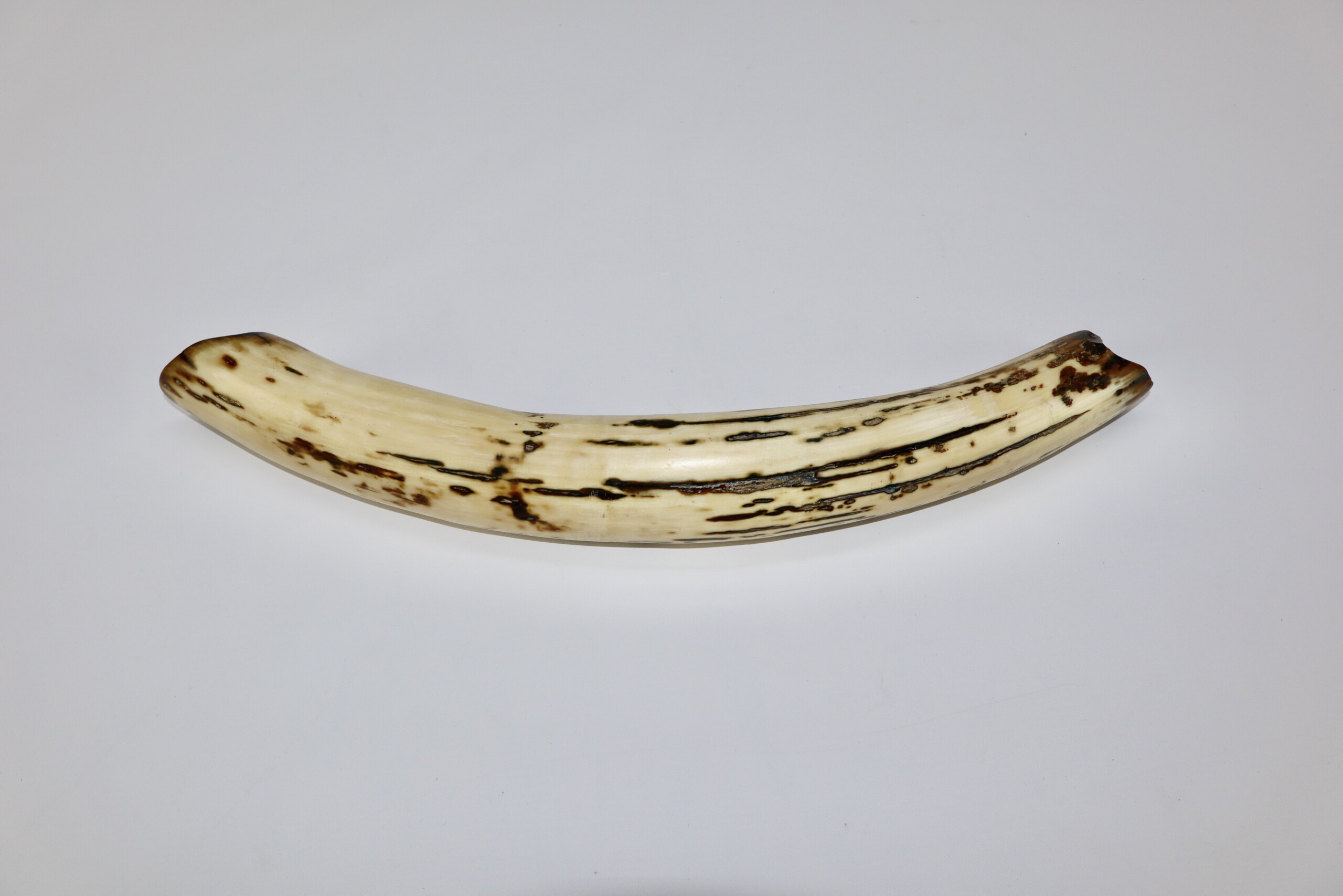 On offer is a fantastic piece of tusk of a juvenile Woolly Mammoth from the Pleistocene era. This is the middle part of the tusk, the base and tip are missing, but otherwise it is in excellent state of preservation, as seen in the images. No restoration whatsoever. This tusk piece is of beautiful colouring of white, grey and brown ivory, and with superb patterning. The black and white section of the ruler in the image represents 10 cm / 3.9 inch. Judging from the circumference, this would have belonged to an adult Mammoth. This piece has been applied with a matt finish, but it is also possible to order it with a glossy finish.