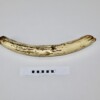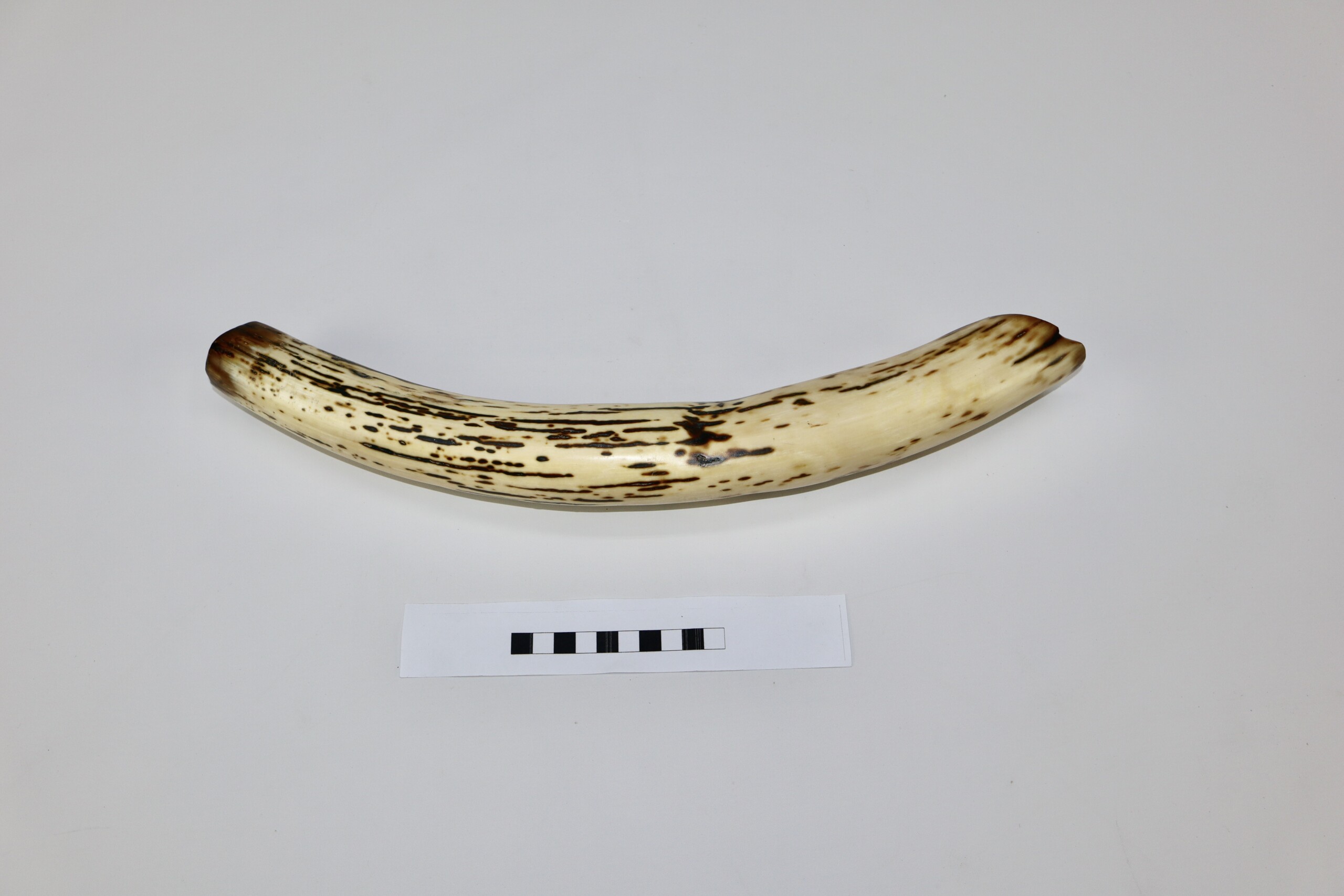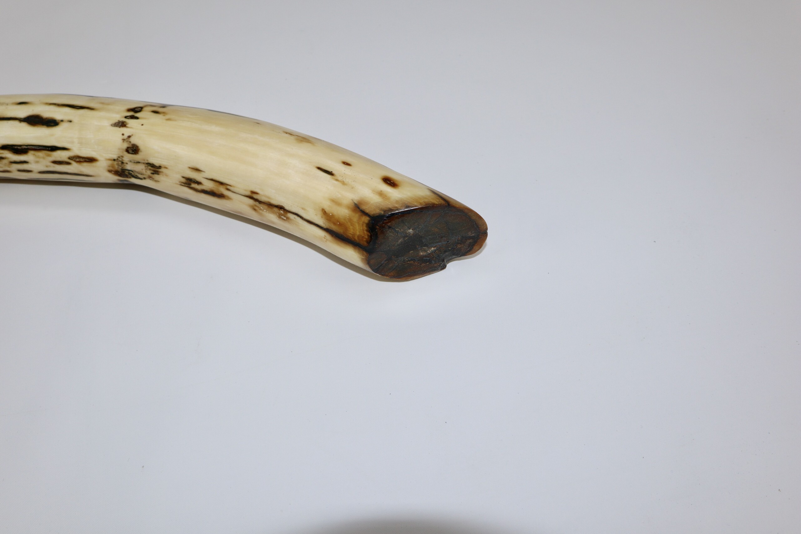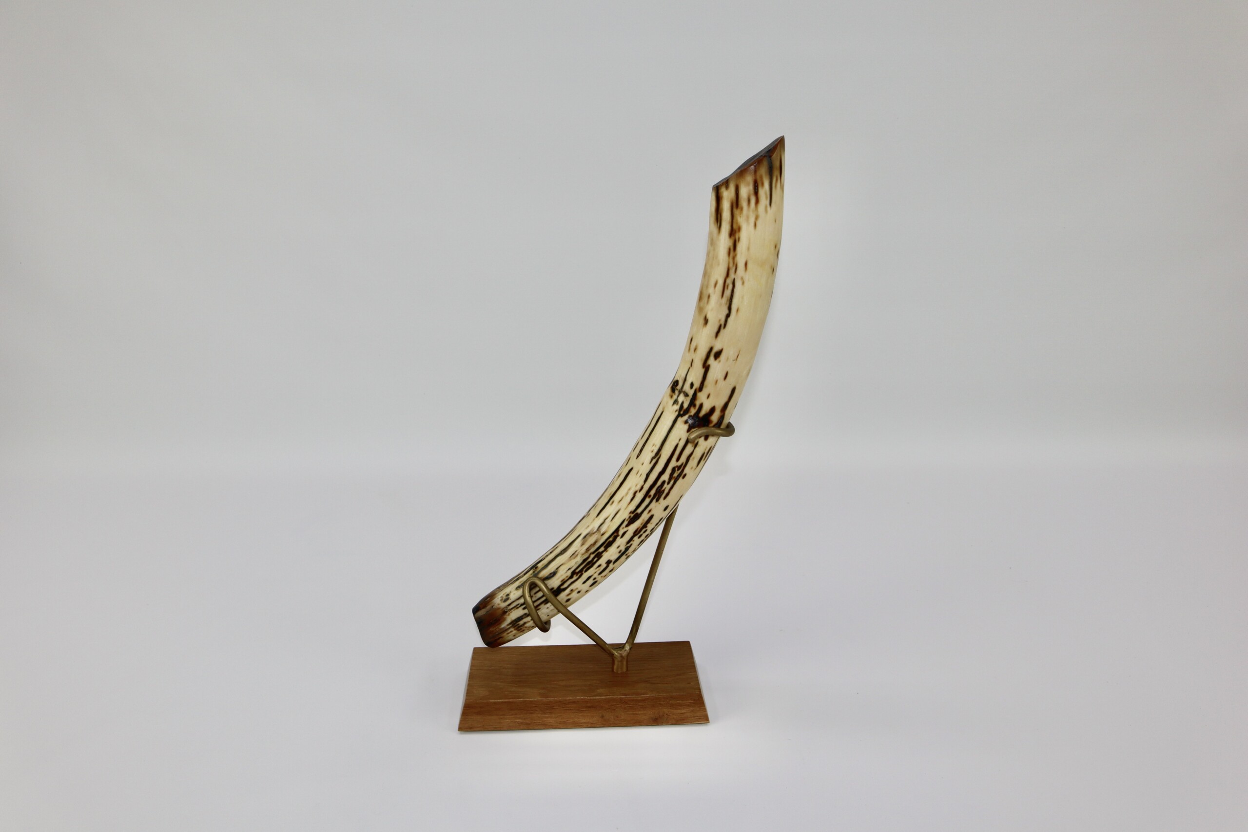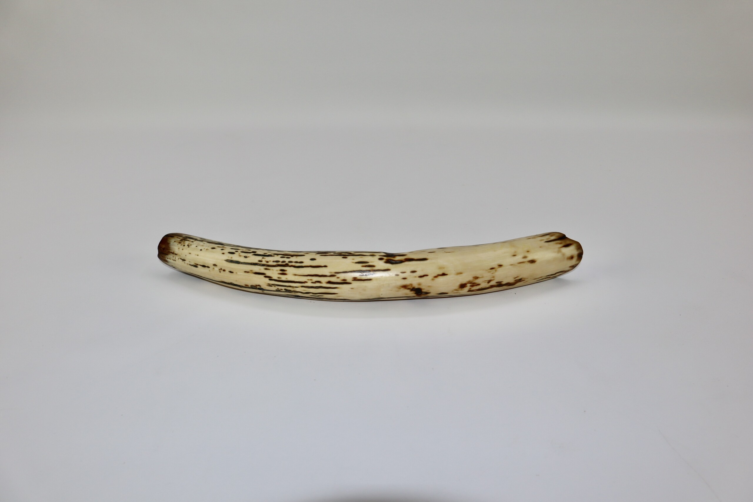 On offer is a fantastic piece of tusk of a juvenile Woolly Mammoth from the Pleistocene era. This is the middle part of the tusk, the base and tip are missing, but otherwise it is in excellent state of preservation, as seen in the images. No restoration whatsoever. This tusk piece is of beautiful colouring of white, grey and brown ivory, and with superb patterning. The black and white section of the ruler in the image represents 10 cm / 3.9 inch. Judging from the circumference, this would have belonged to an adult Mammoth. This piece has been applied with a matt finish, but it is also possible to order it with a glossy finish.