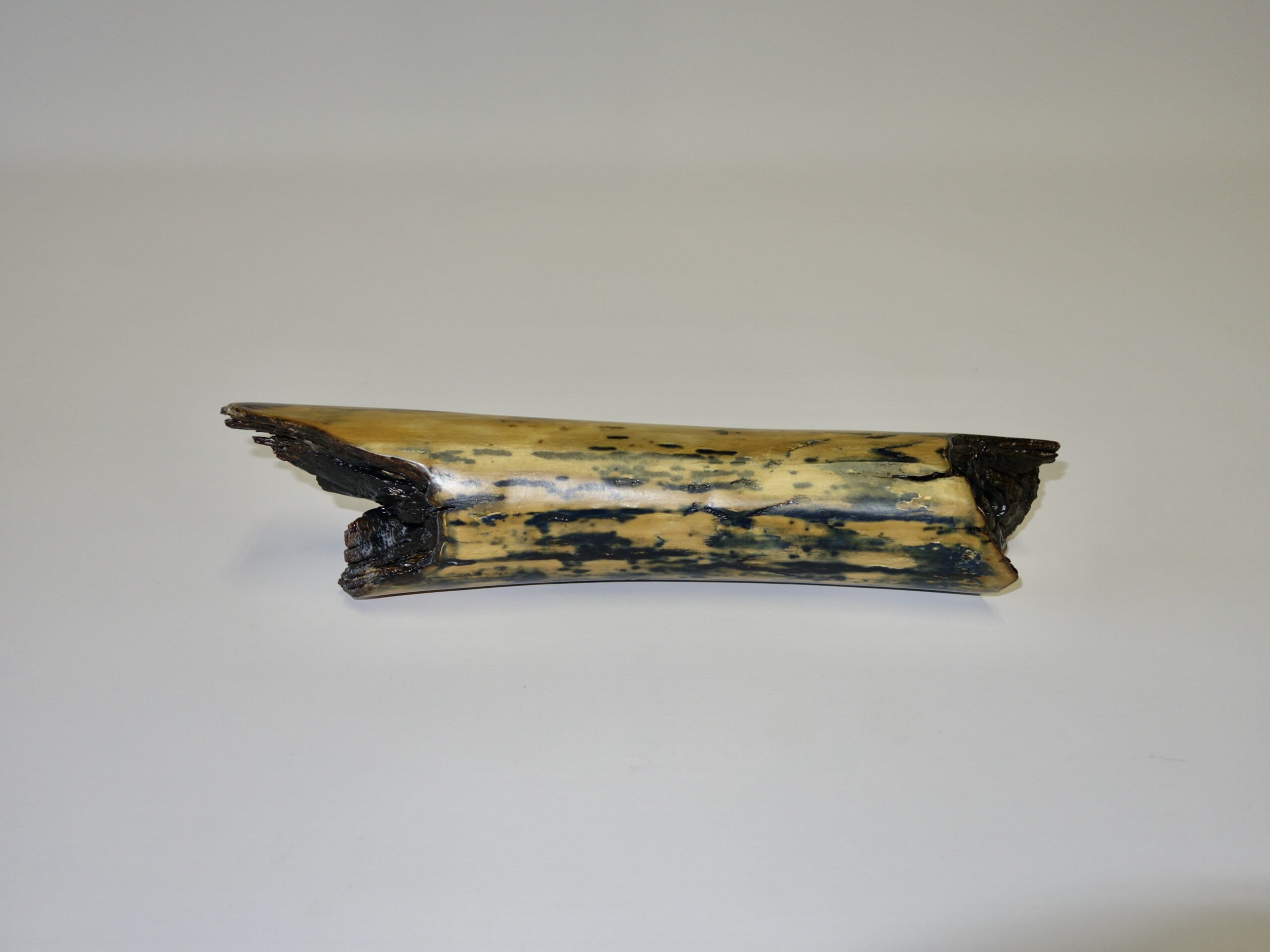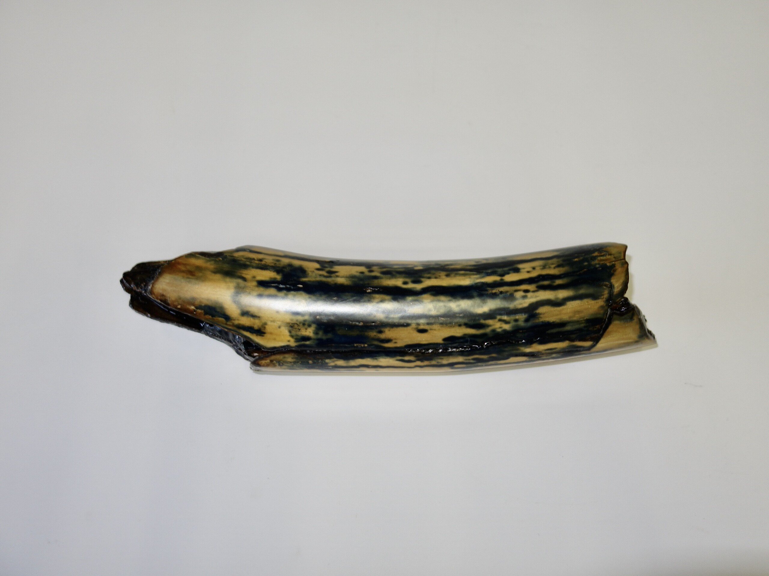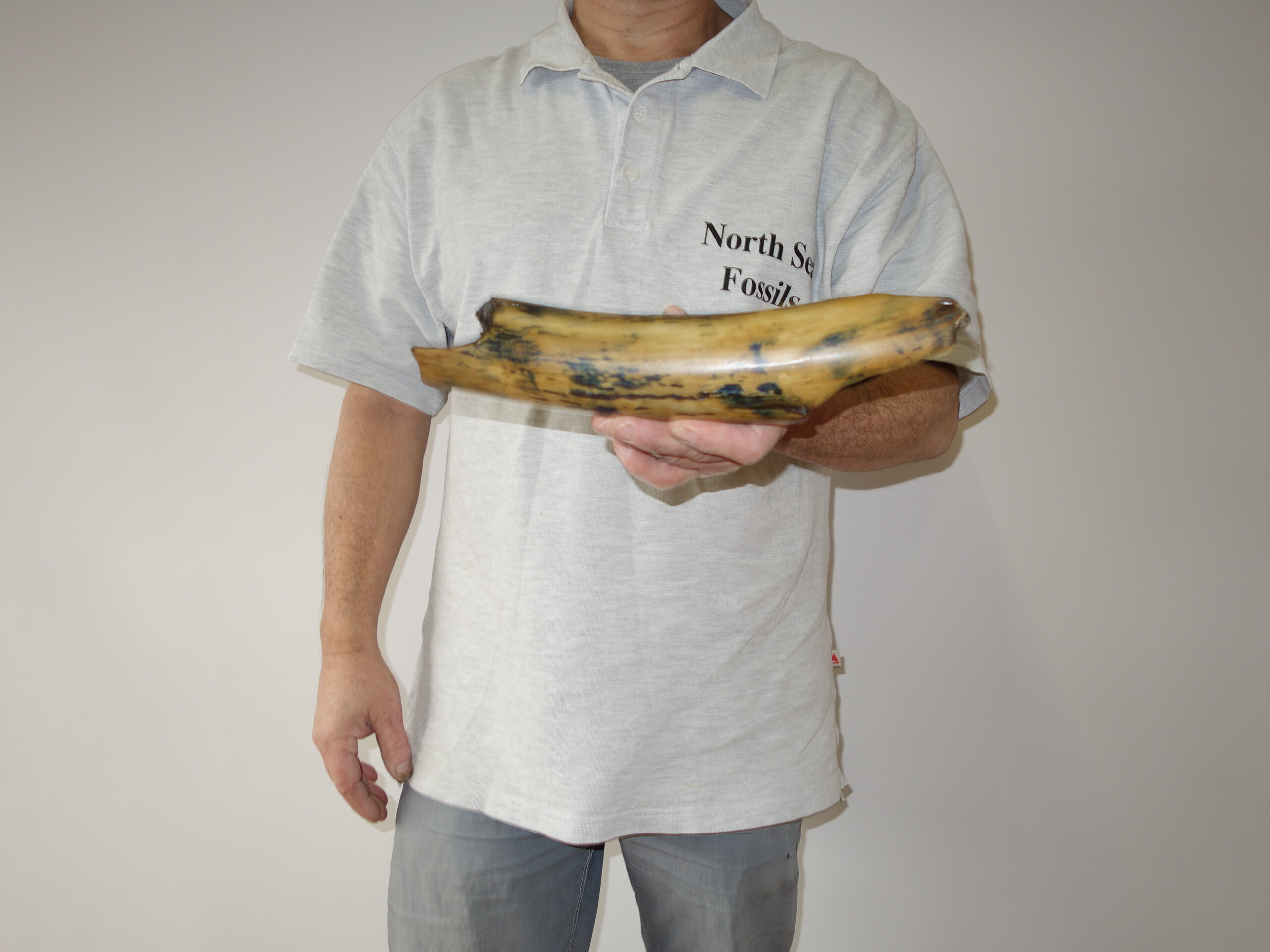 On offer is a fantastic piece of tusk of a Woolly Mammoth from the Pleistocene era. This is the middle part of the tusk, the tip and the base are missing, but otherwise it is in wonderful state of preservation, as seen in the images. No restoration whatsoever. This tusk piece is of beautiful colouring of mainly gold, brown and black ivory and with beautiful patterning. The black and white section of the ruler in the image represents 10 cm / 3.9 inch. Judging from the circumference, this would have belonged to a female Mammoth. This piece has been applied with a matt finish, but it is also possible to order it with a glossy finish.