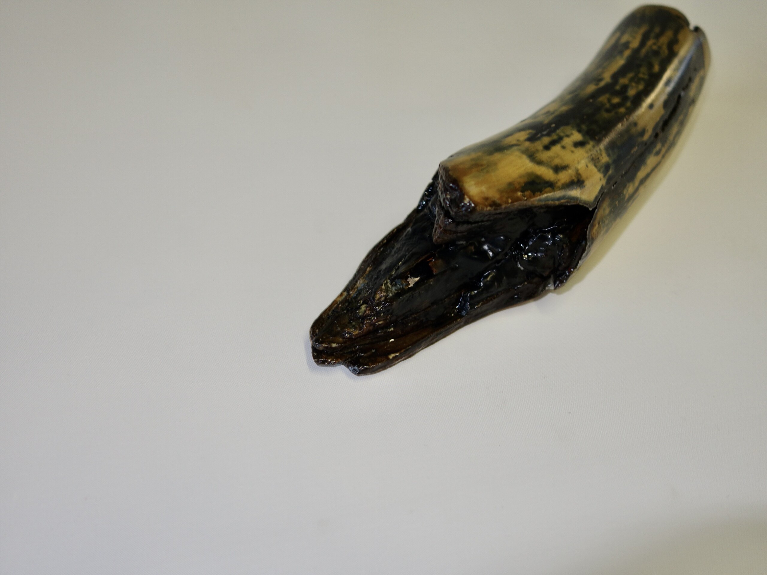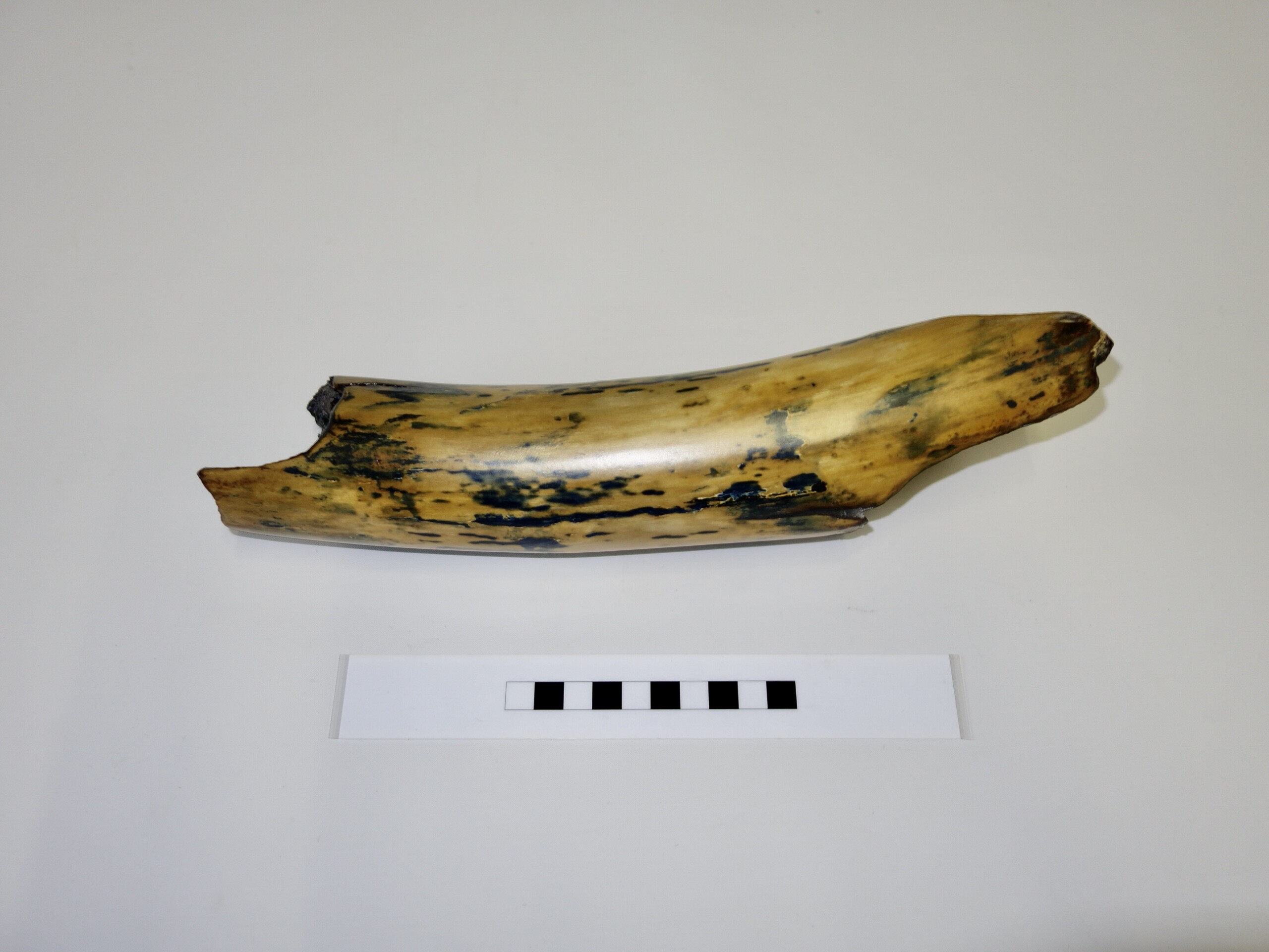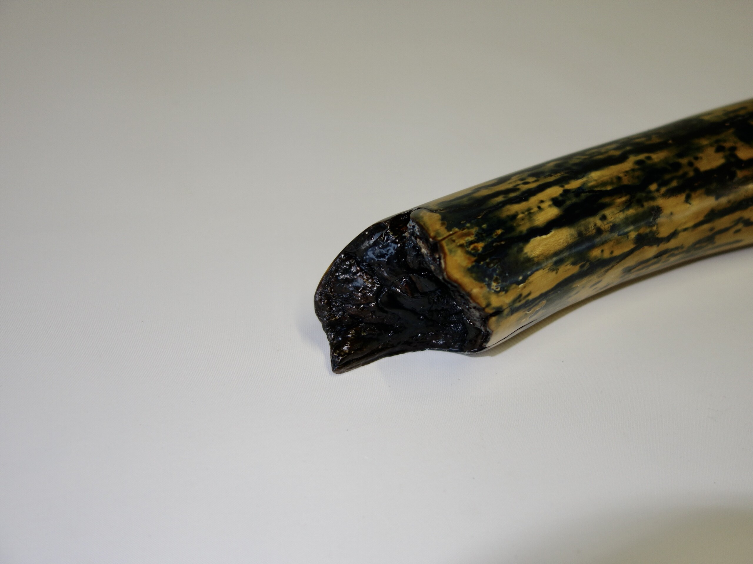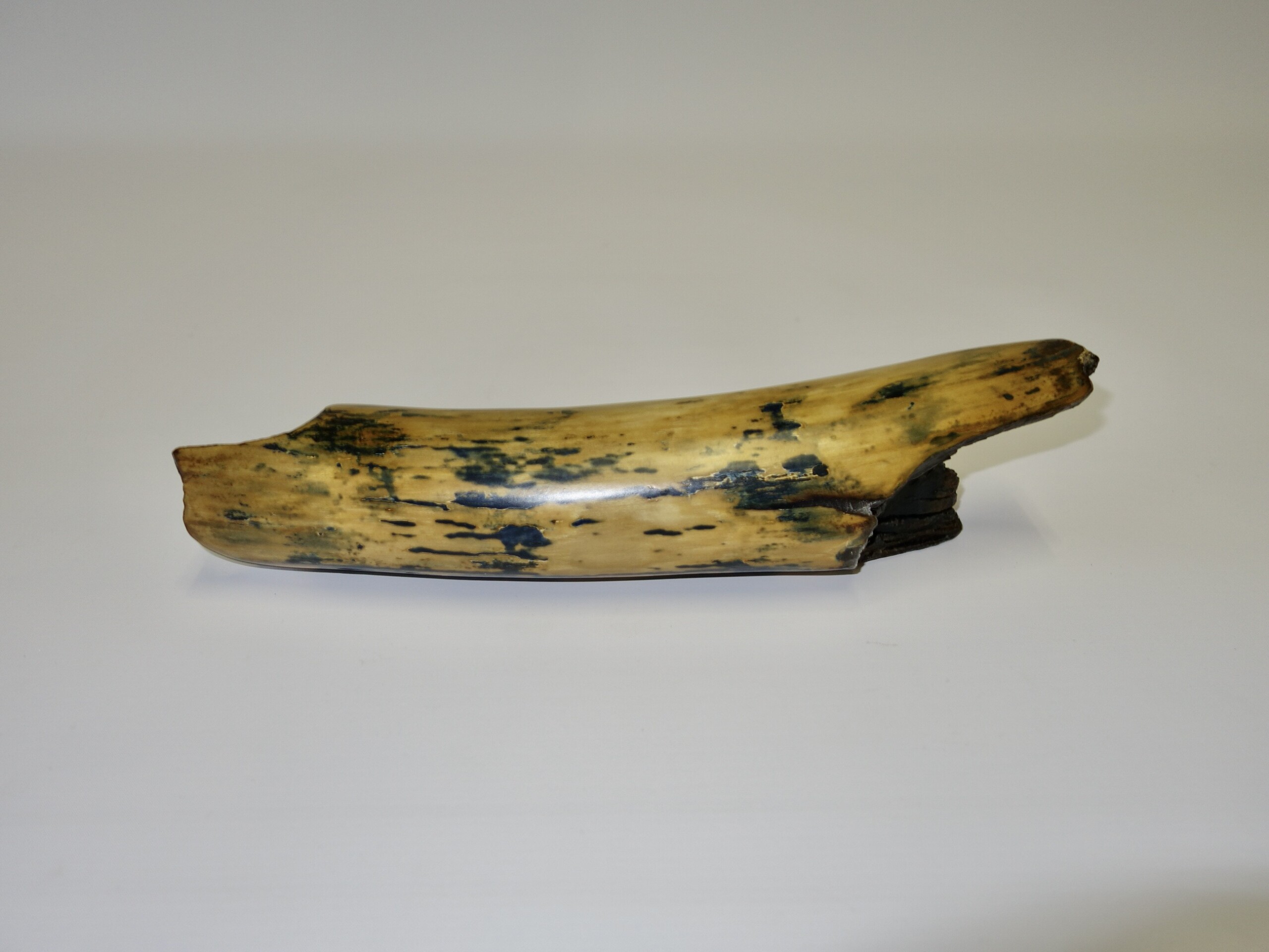 On offer is a fantastic piece of tusk of a Woolly Mammoth from the Pleistocene era. This is the middle part of the tusk, the tip and the base are missing, but otherwise it is in wonderful state of preservation, as seen in the images. No restoration whatsoever. This tusk piece is of beautiful colouring of mainly gold, brown and black ivory and with beautiful patterning. The black and white section of the ruler in the image represents 10 cm / 3.9 inch. Judging from the circumference, this would have belonged to a female Mammoth. This piece has been applied with a matt finish, but it is also possible to order it with a glossy finish.