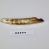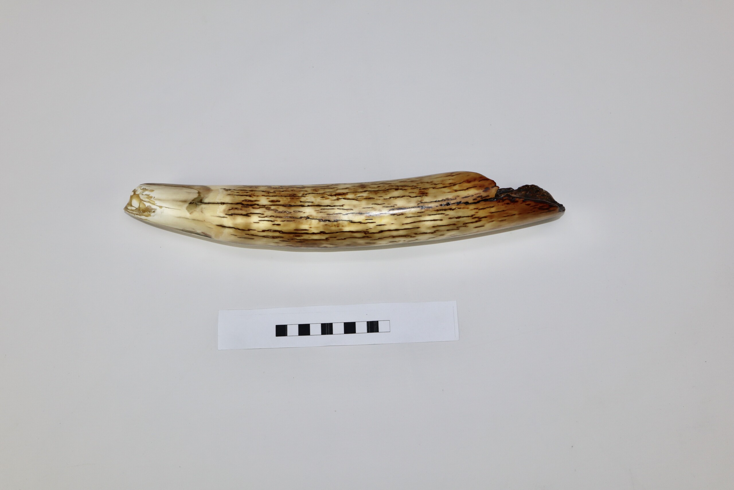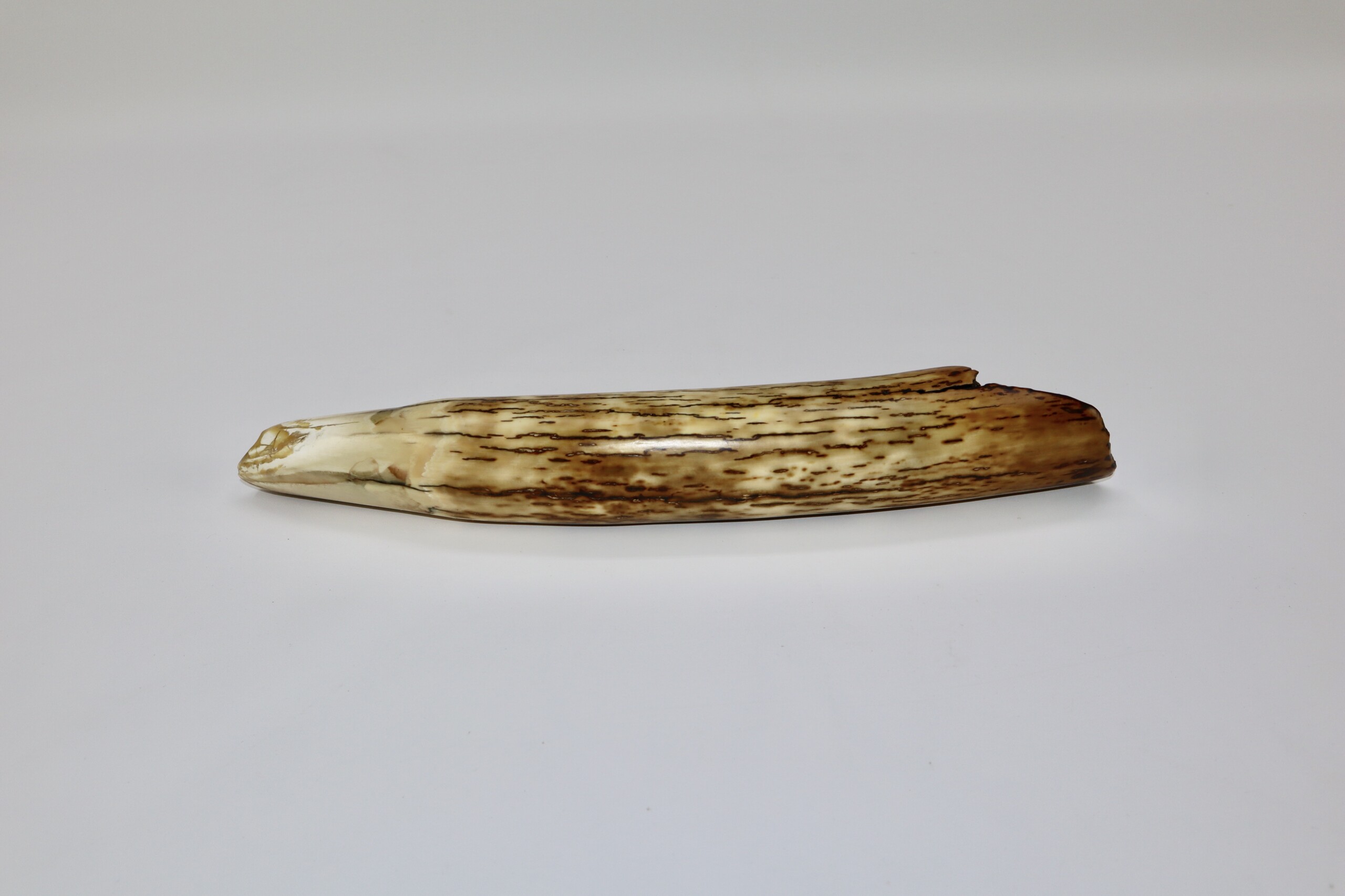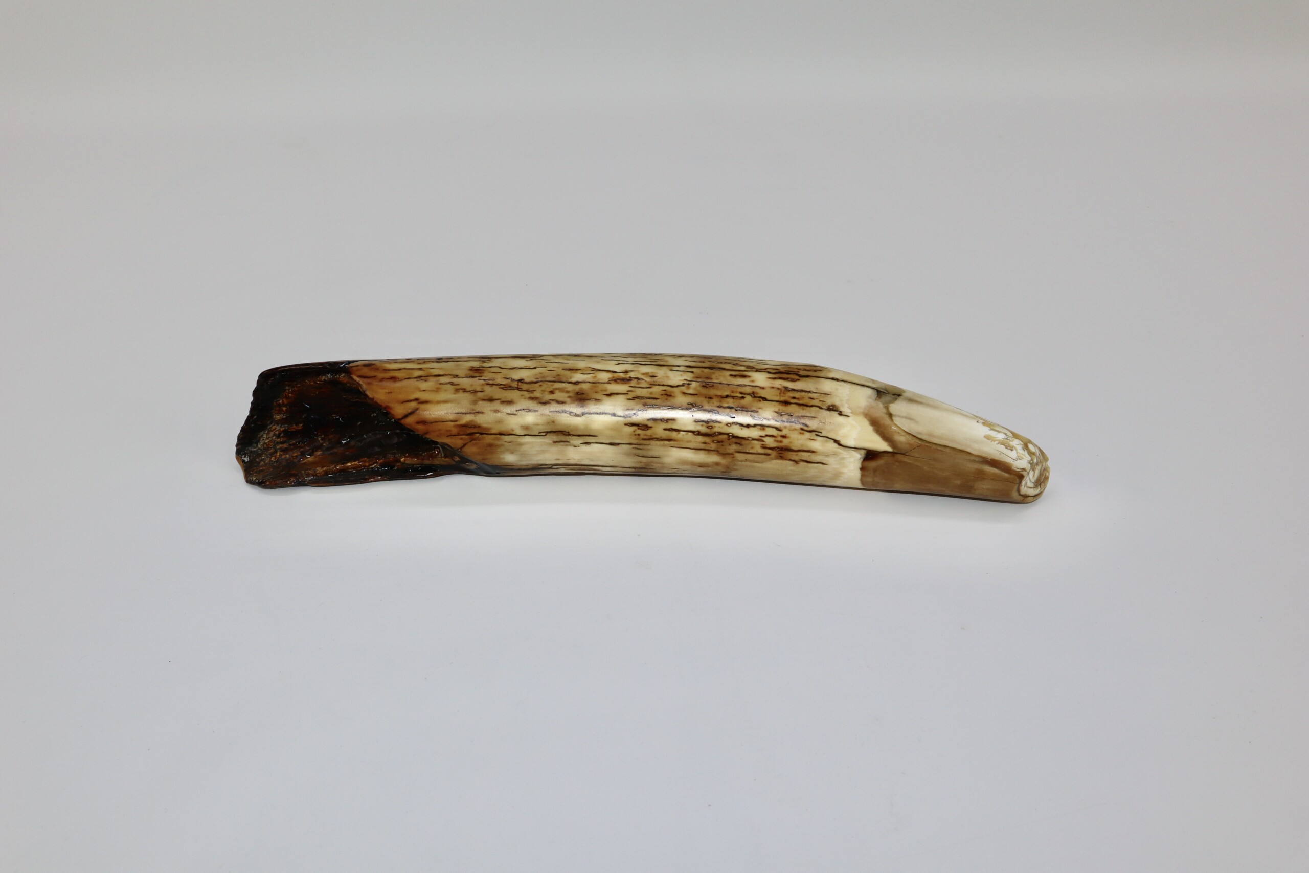 On offer is a fantastic piece of tusk of a Woolly Mammoth from the Pleistocene era. This is the middle part of the tusk, the base and tip are missing, but otherwise it is in excellent state of preservation, as seen in the images. No restoration whatsoever. This tusk piece is of beautiful colouring of white, grey and brown ivory, and with superb patterning. The black and white section of the ruler in the image represents 10 cm / 3.9 inch. Judging from the circumference, this would have belonged to an adult Mammoth. This piece has been applied with a matt finish, but it is also possible to order it with a glossy finish.