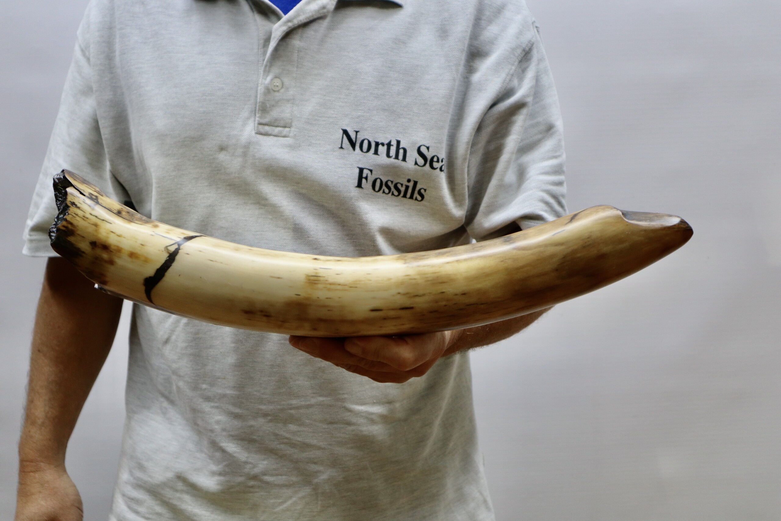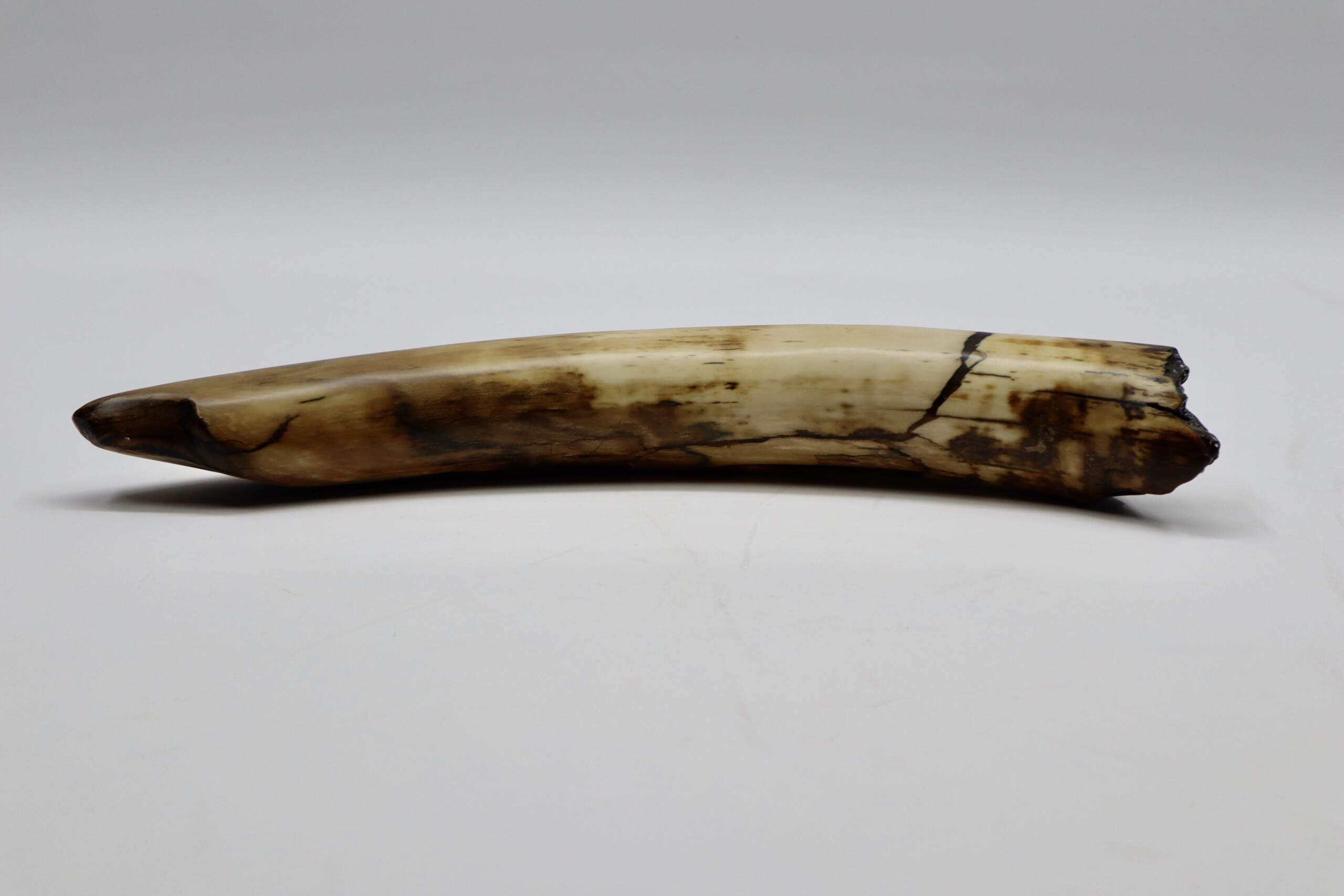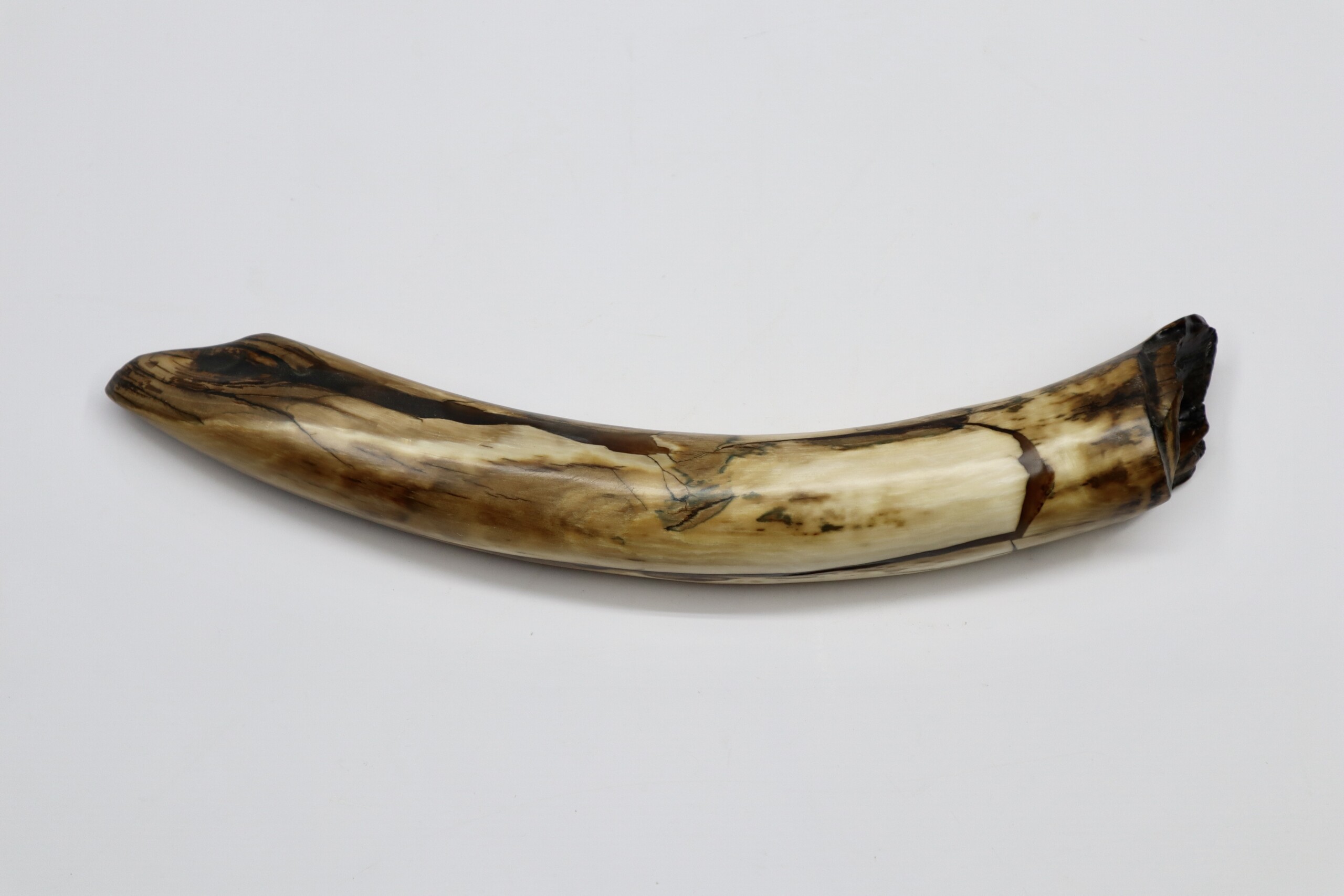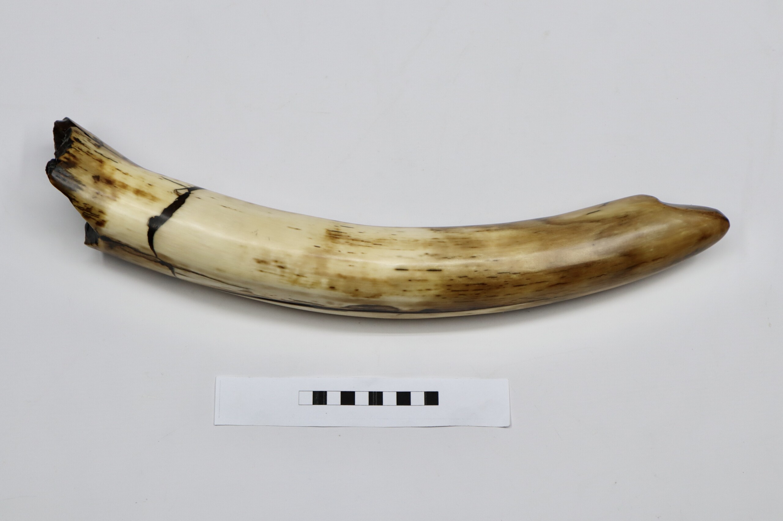 On offer is a fantastic piece of tusk of a Woolly Mammoth from the Pleistocene era. This is the middle part of the tusk, the base and tip are missing, but otherwise it is in excellent state of preservation, as seen in the images. No restoration whatsoever. This tusk piece is of beautiful colouring of white, grey and brown ivory. The black and white section of the ruler in the image represents 10 cm / 3.9 inch. Judging from the circumference, this would have belonged to an adult female Mammoth. This piece has been applied with a matt finish, but it is also possible to order it with a glossy finish.