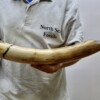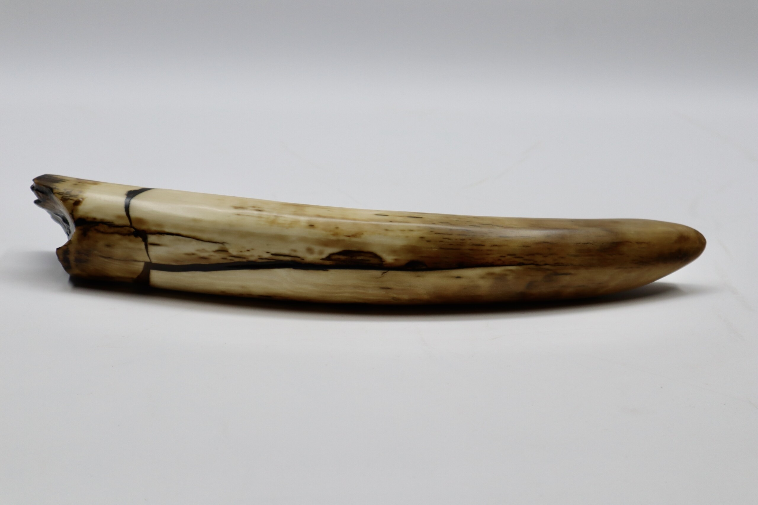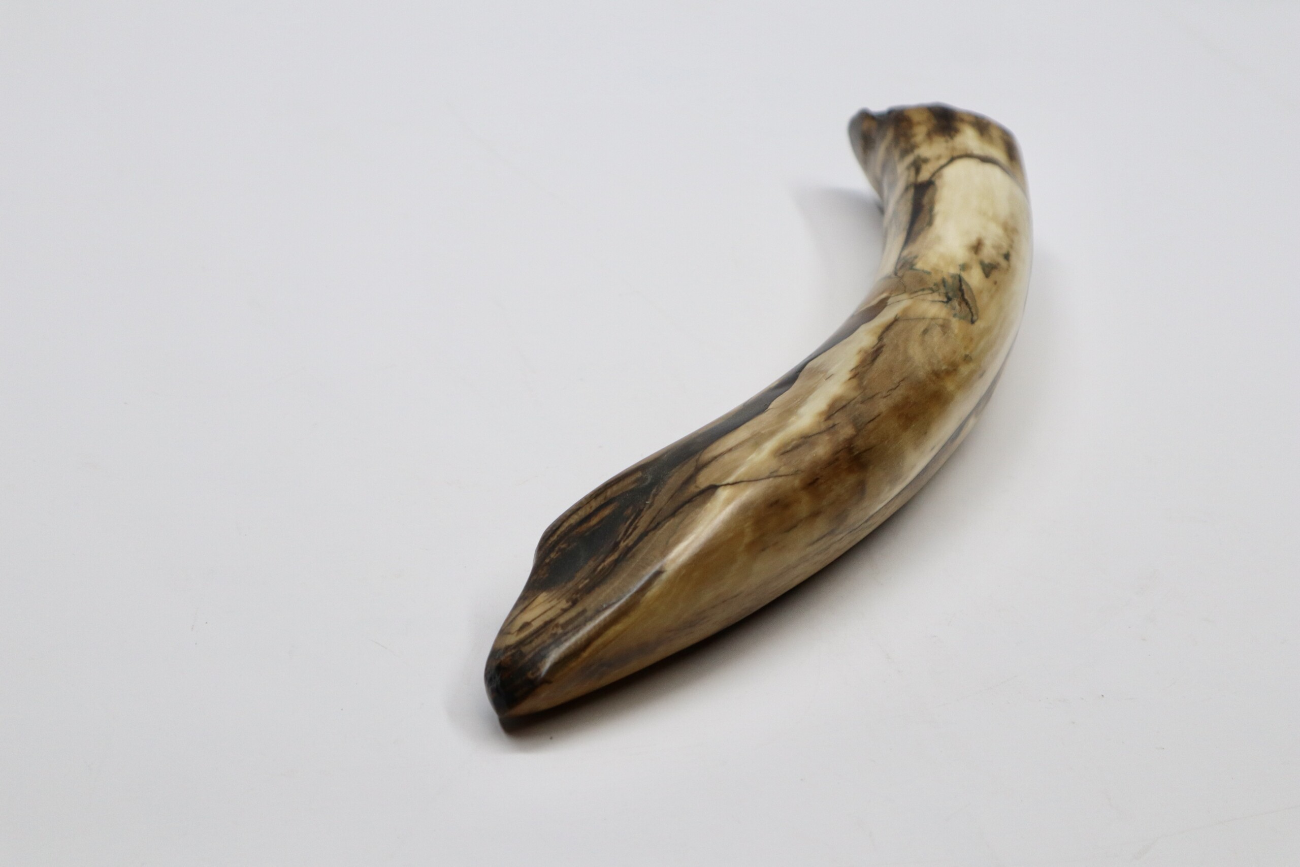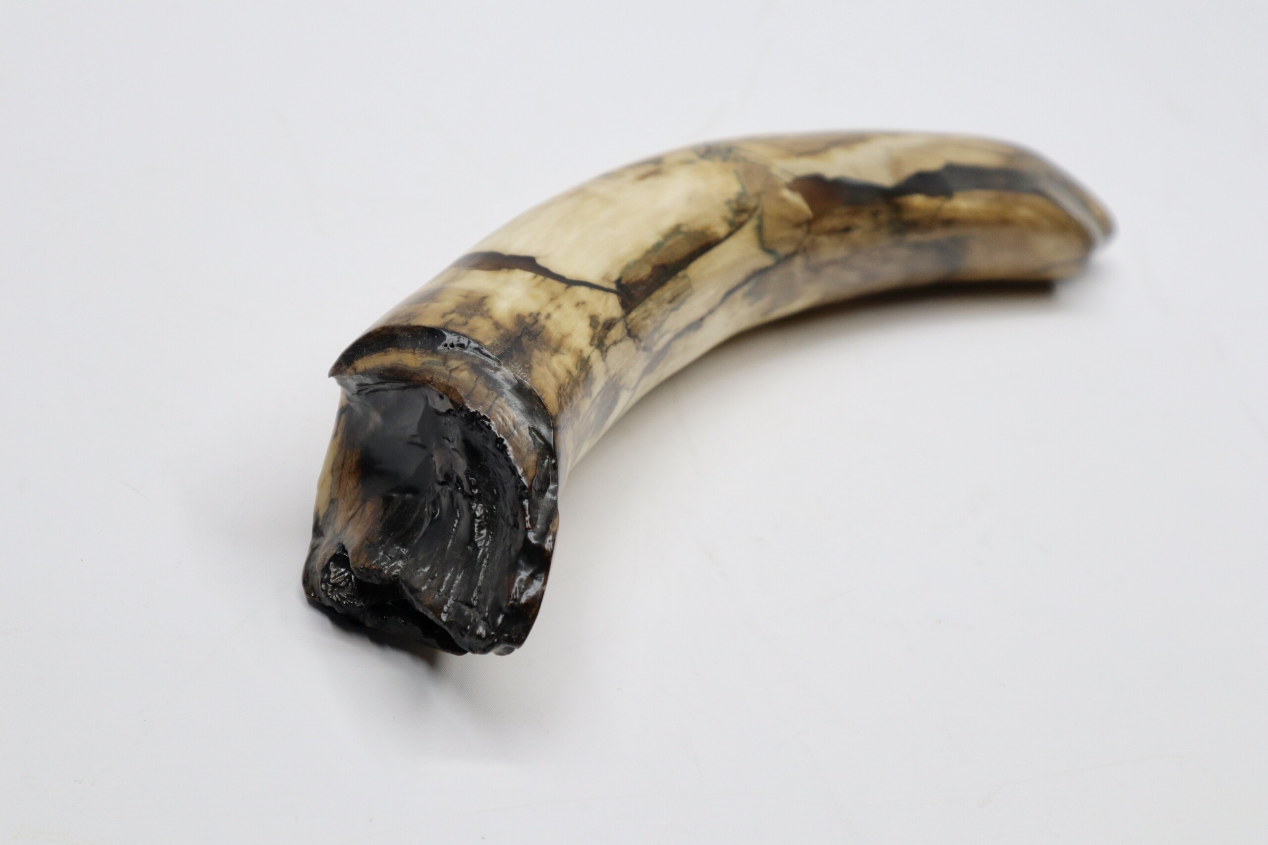 On offer is a fantastic piece of tusk of a Woolly Mammoth from the Pleistocene era. This is the middle part of the tusk, the base and tip are missing, but otherwise it is in excellent state of preservation, as seen in the images. No restoration whatsoever. This tusk piece is of beautiful colouring of white, grey and brown ivory. The black and white section of the ruler in the image represents 10 cm / 3.9 inch. Judging from the circumference, this would have belonged to an adult female Mammoth. This piece has been applied with a matt finish, but it is also possible to order it with a glossy finish.