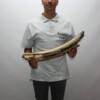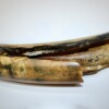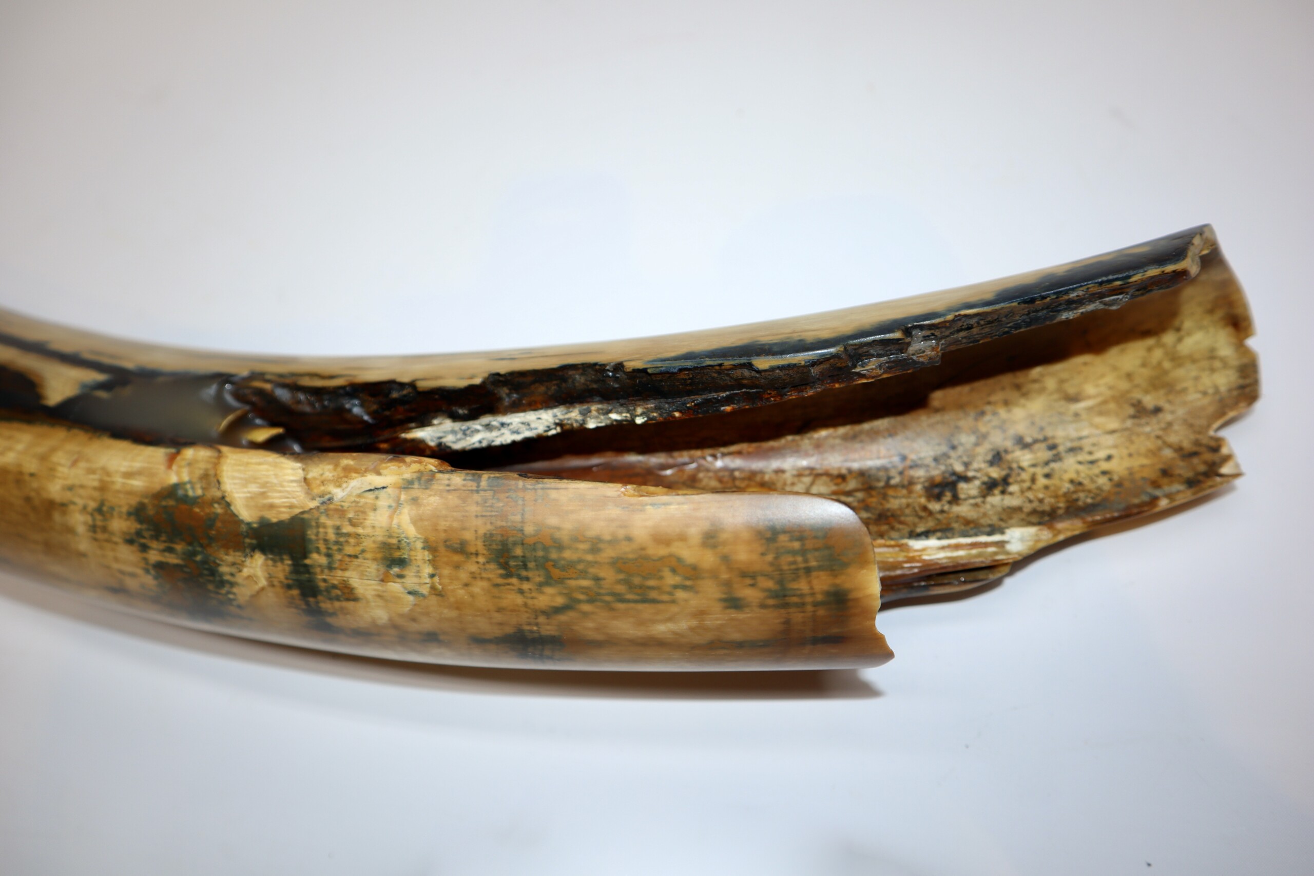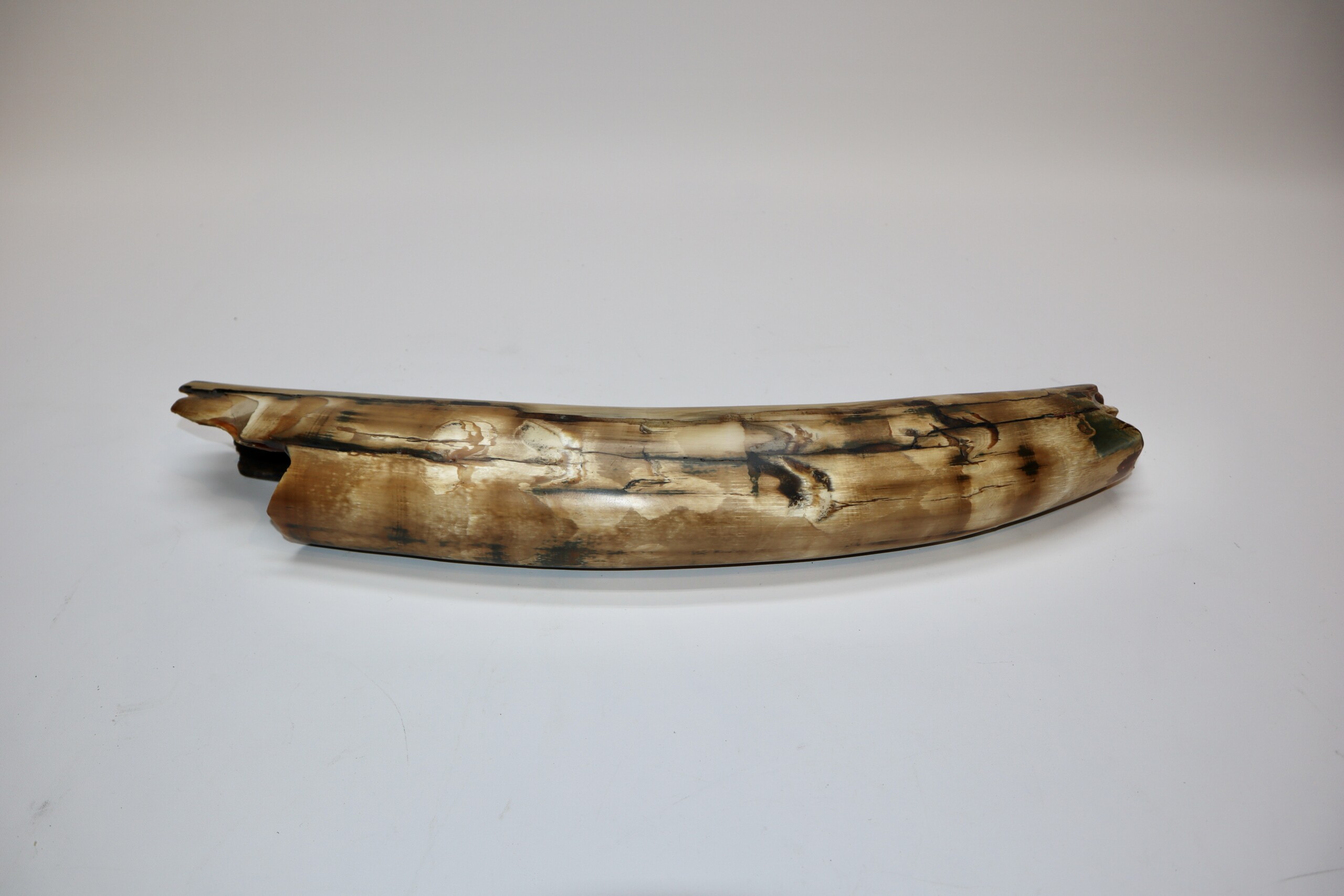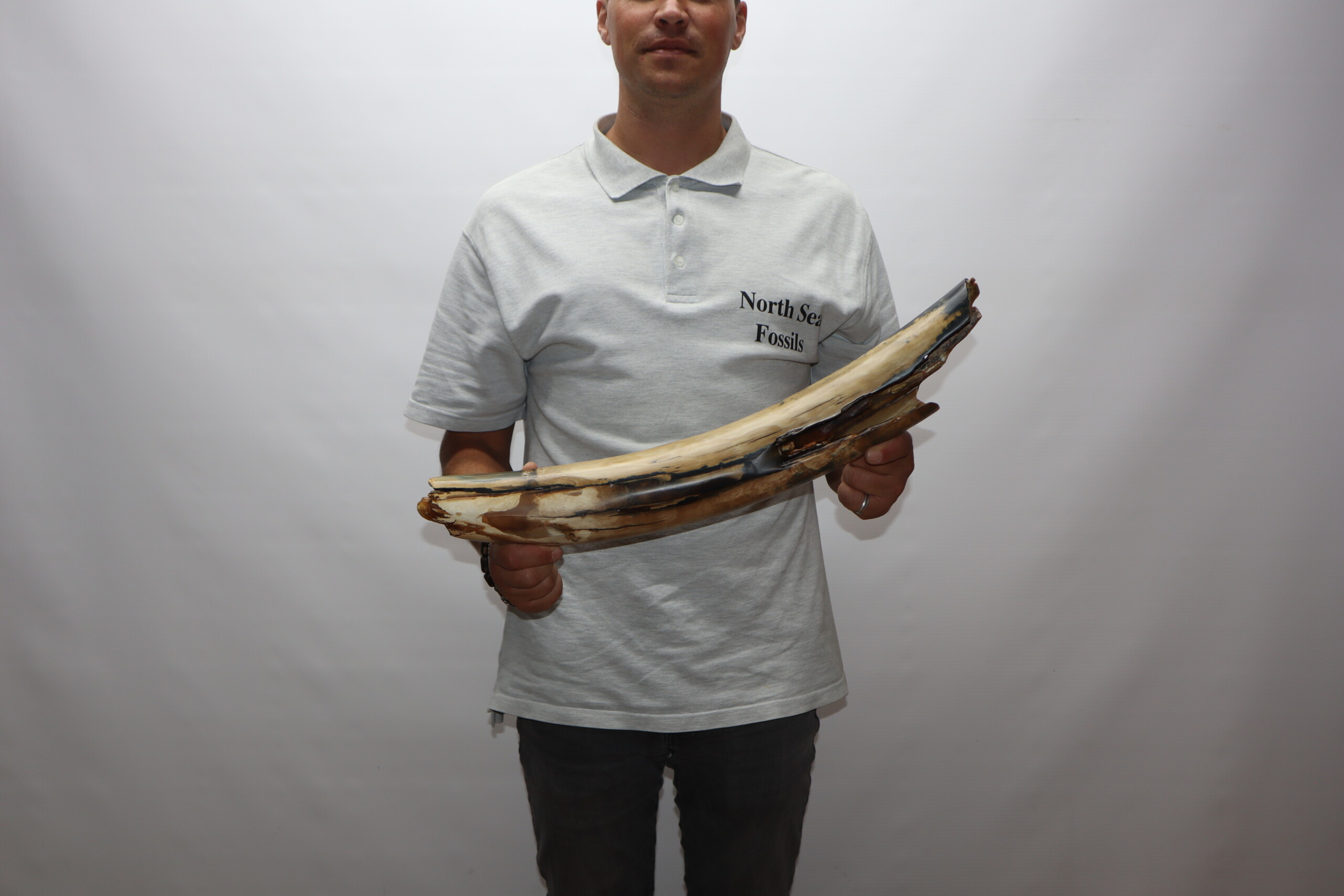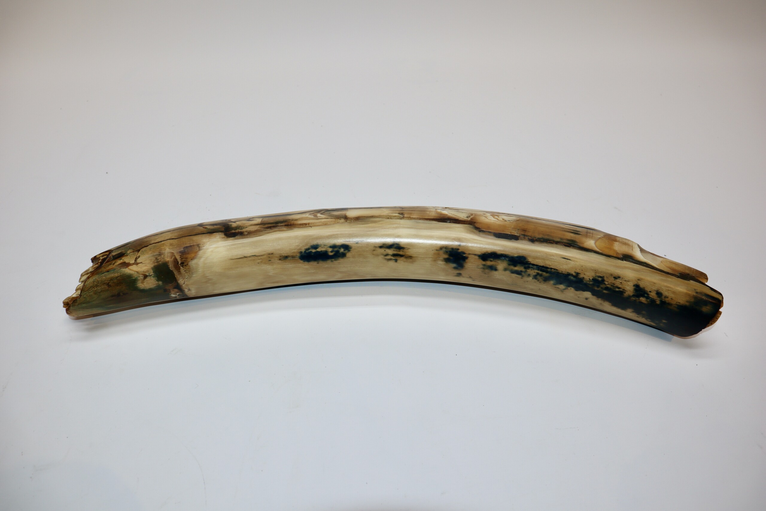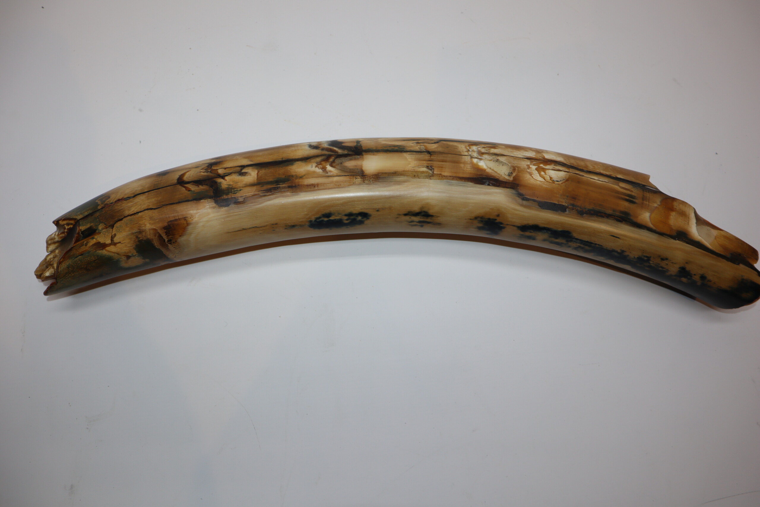 On offer is a fantastic piece of tusk of a Woolly Mammoth from the Pleistocene era. This is the middle part of the tusk, the base and tip are missing, but otherwise it is in excellent state of preservation, as seen in the images. A crack has been professionally repaired, otherwise no restoration whatsoever. This tusk piece is of beautiful colouring of white, gold, brown and grey ivory and beautiful patterning and contrasts of colour. The black and white section of the ruler in the image represents 10 cm / 3.9 inch. This piece has been applied with a matt finish, but it is also possible to order it with a glossy finish.