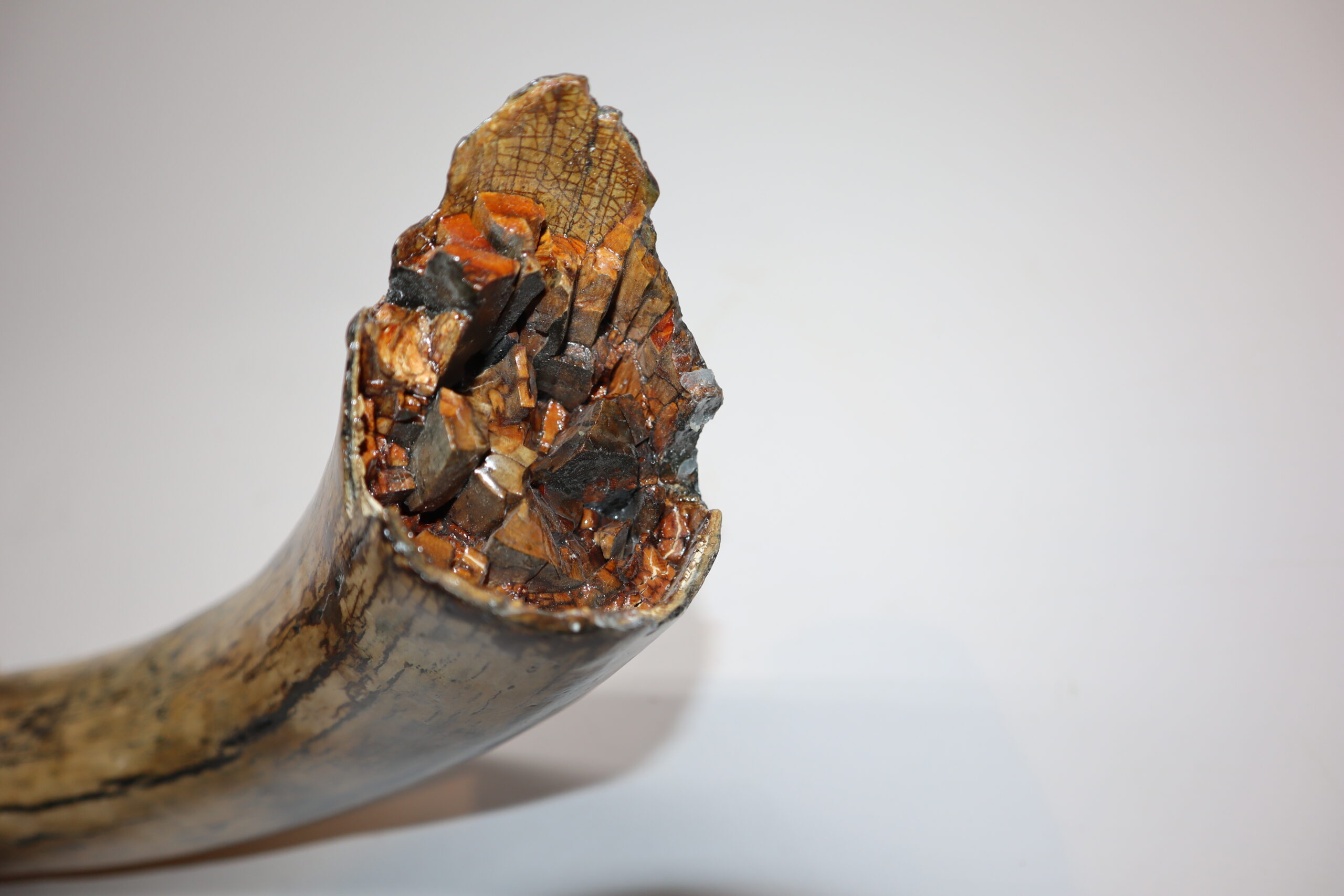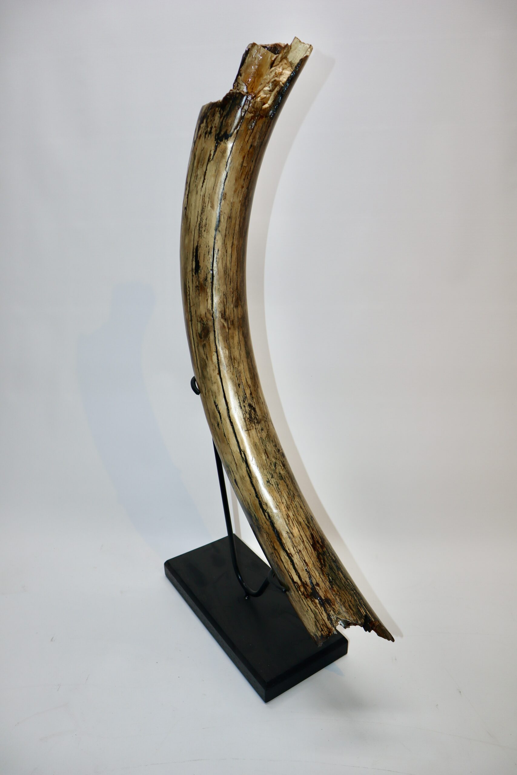 On offer is a fantastic piece of tusk of a Woolly Mammoth from the Pleistocene era. This is the middle part of the tusk, the base and tip are missing, but otherwise it is in excellent state of preservation, as seen in the images. No restoration whatsoever. This tusk piece is of beautiful colouring of white, gold, brown and black ivory and beautiful patterning and contrasts of colour. The black and white section of the ruler in the image represents 10 cm / 3.9 inch. This piece has been applied with a matt finish, but it is also possible to order it with a glossy finish.