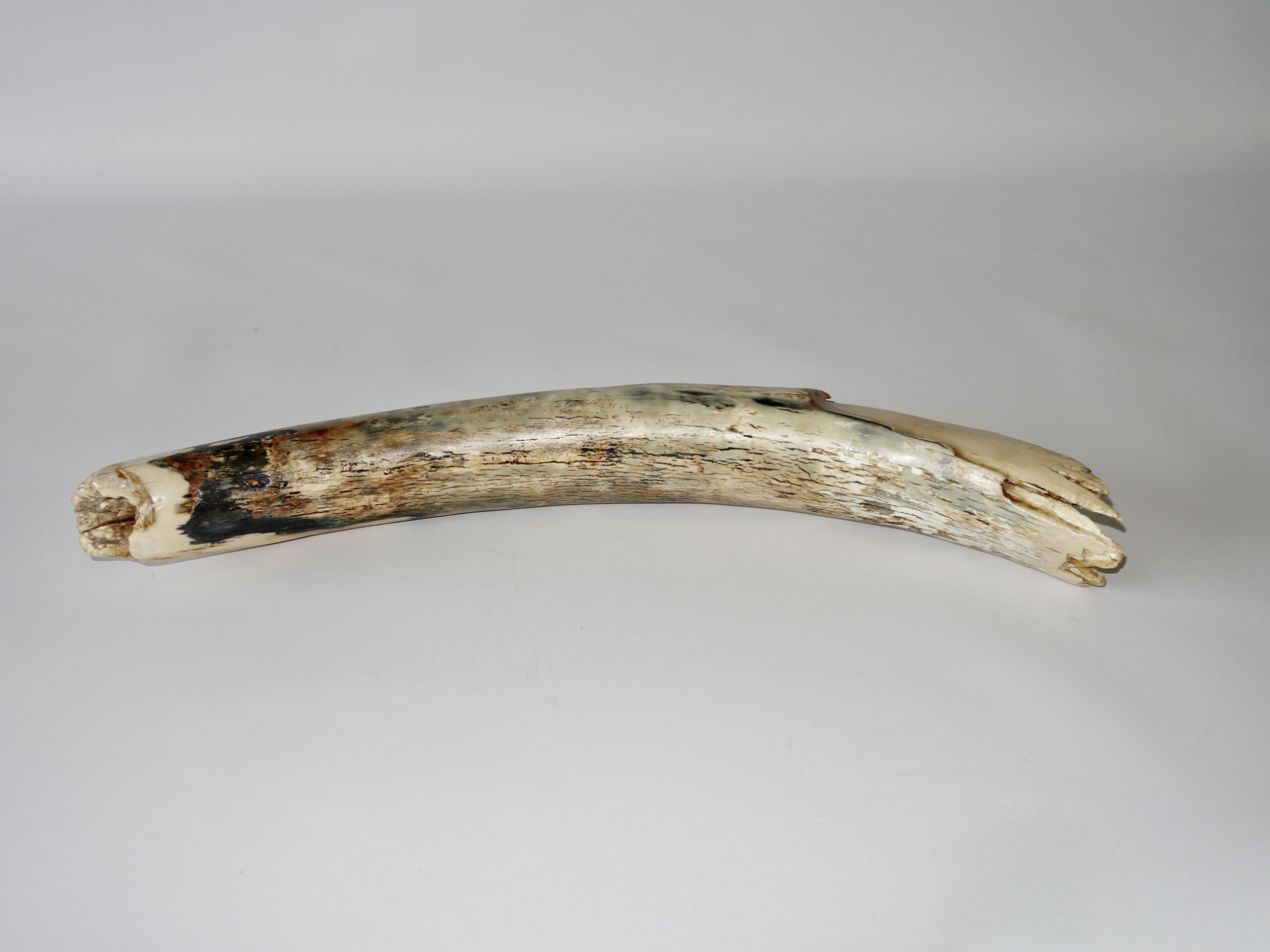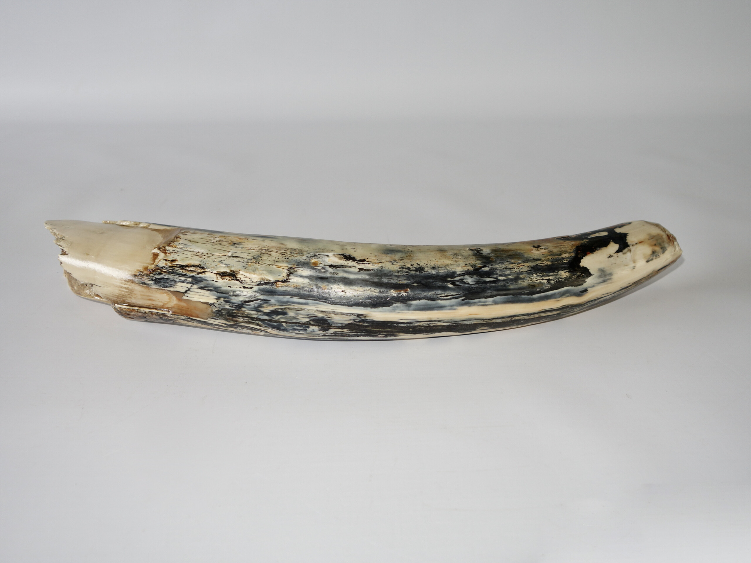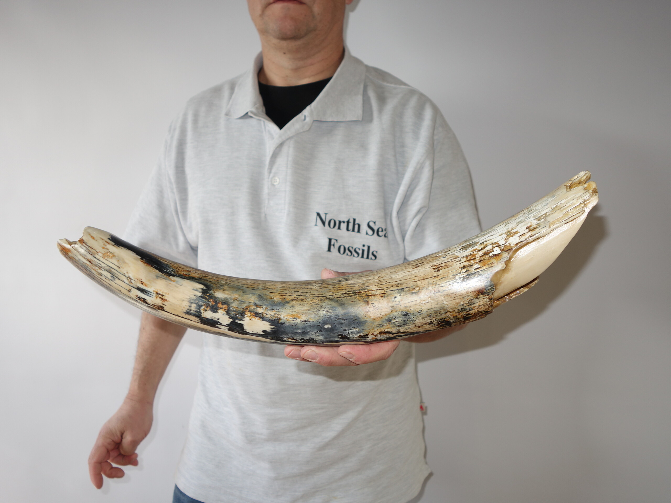 On offer is a gorgeous and large piece of tusk of a Woolly Mammoth from the Pleistocene era. This is the middle part of the tusk, the base and tip are missing, but otherwise it is in excellent state of preservation, as seen in the images. No restoration whatsoever. This tusk piece is of beautiful colouring of mainly white, gold, brown, grey and black ivory, and with absolutely stunning patterning. The black and white section of the ruler in the image represents 10 cm / 3.9 inch. Judging from the circumference, this would have belonged to a female Mammoth. This piece has been applied with a matt finish, but it is also possible to order it with a glossy finish.