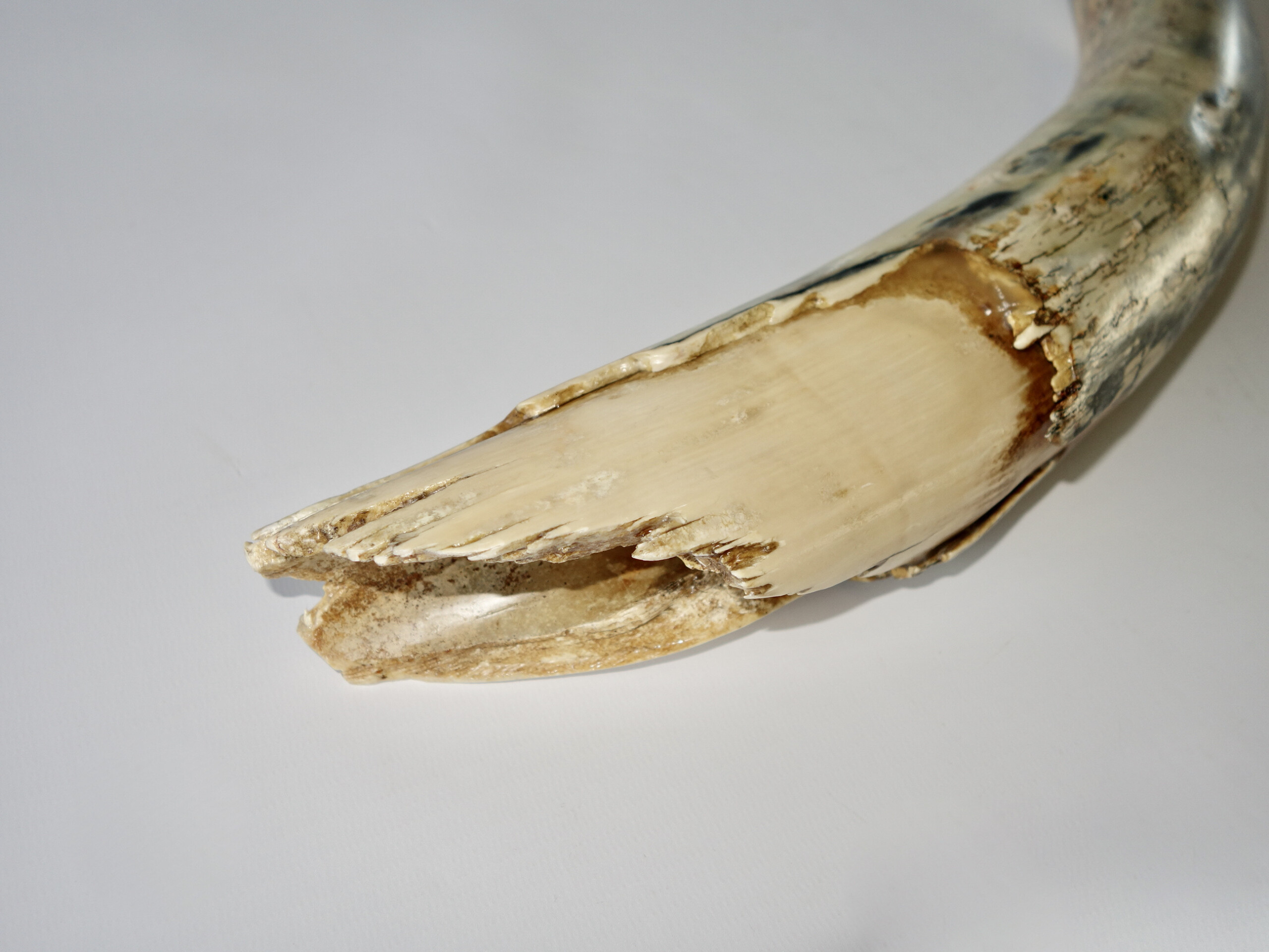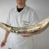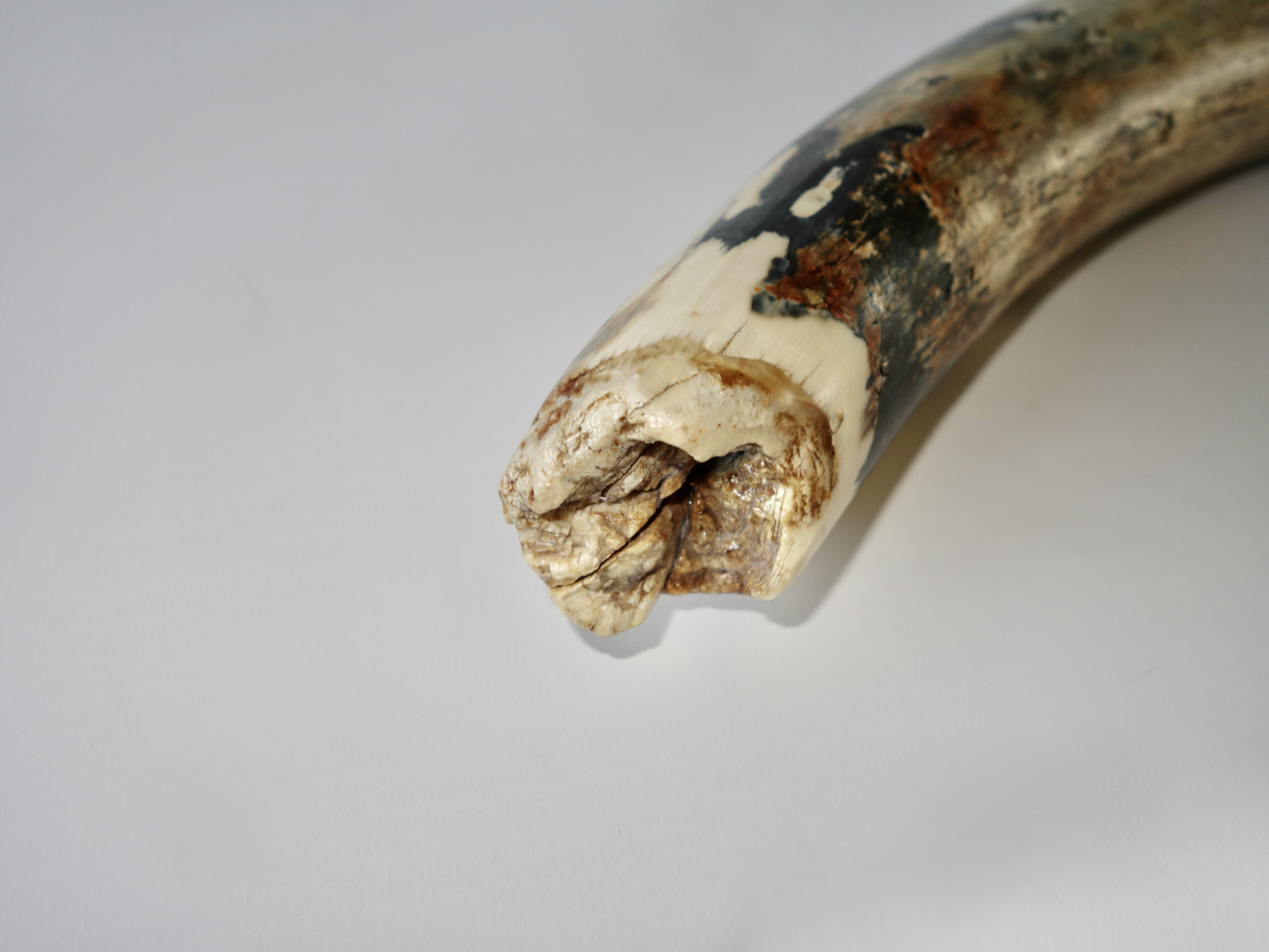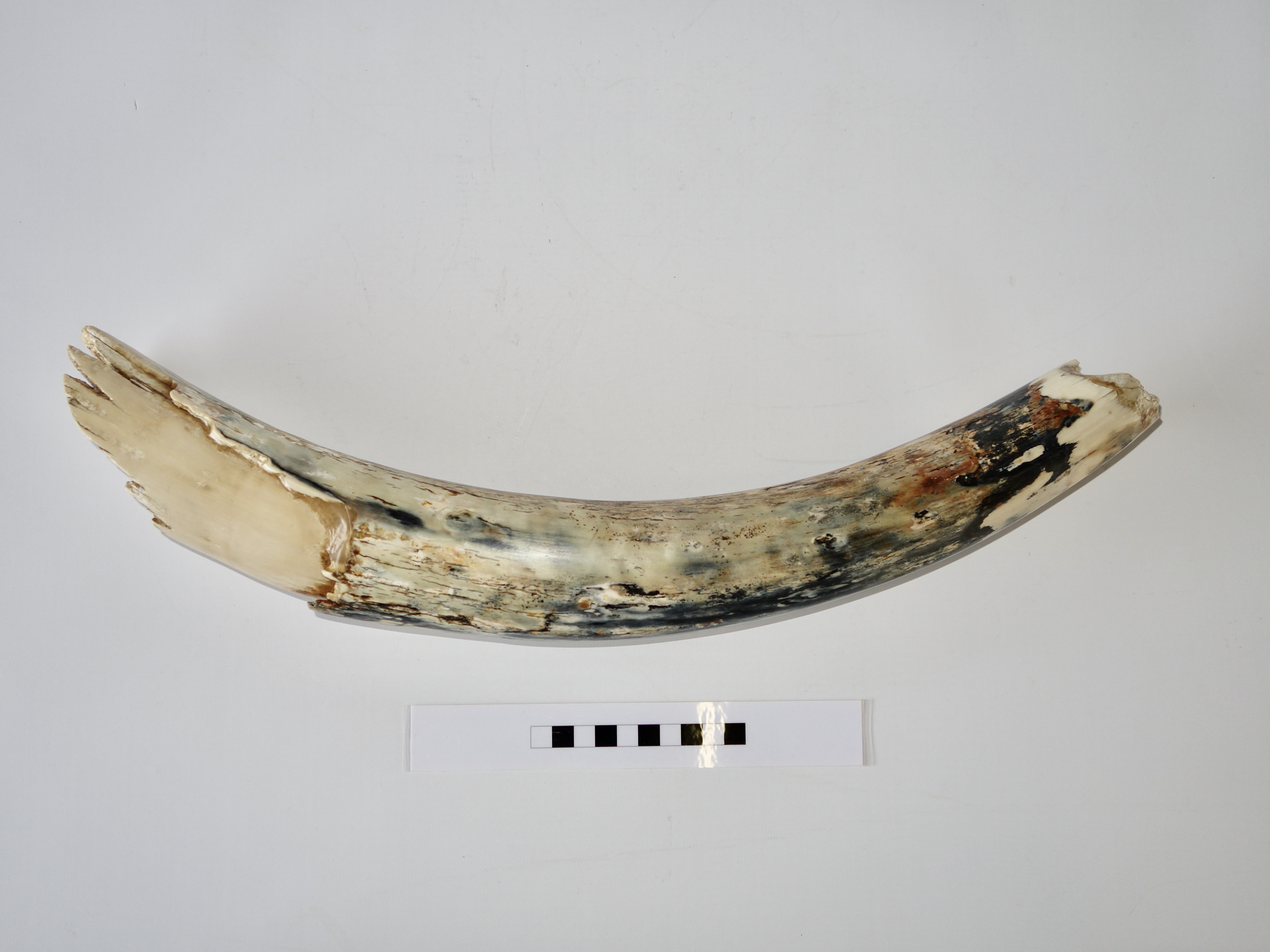 On offer is a gorgeous and large piece of tusk of a Woolly Mammoth from the Pleistocene era. This is the middle part of the tusk, the base and tip are missing, but otherwise it is in excellent state of preservation, as seen in the images. No restoration whatsoever. This tusk piece is of beautiful colouring of mainly white, gold, brown, grey and black ivory, and with absolutely stunning patterning. The black and white section of the ruler in the image represents 10 cm / 3.9 inch. Judging from the circumference, this would have belonged to a female Mammoth. This piece has been applied with a matt finish, but it is also possible to order it with a glossy finish.