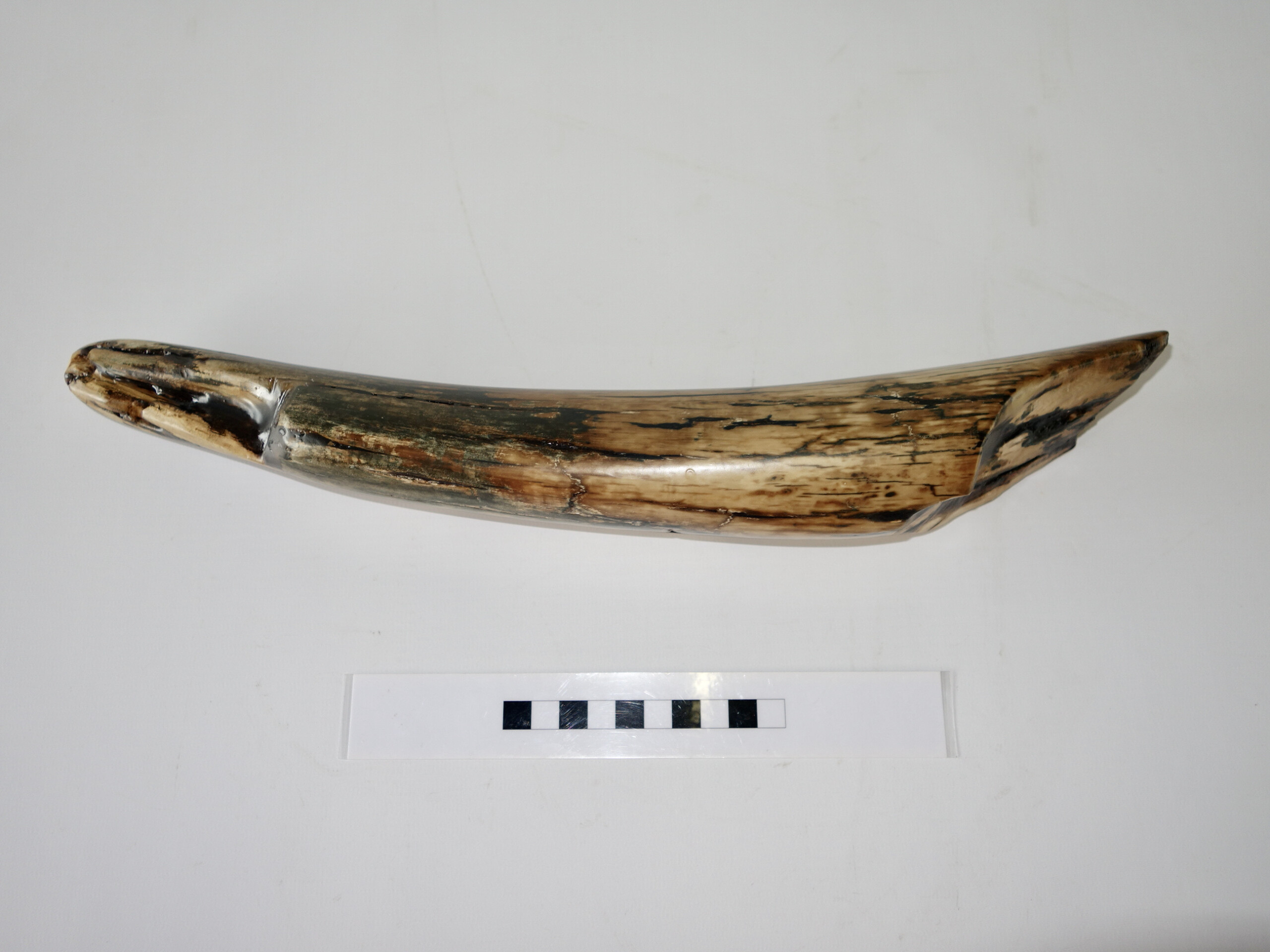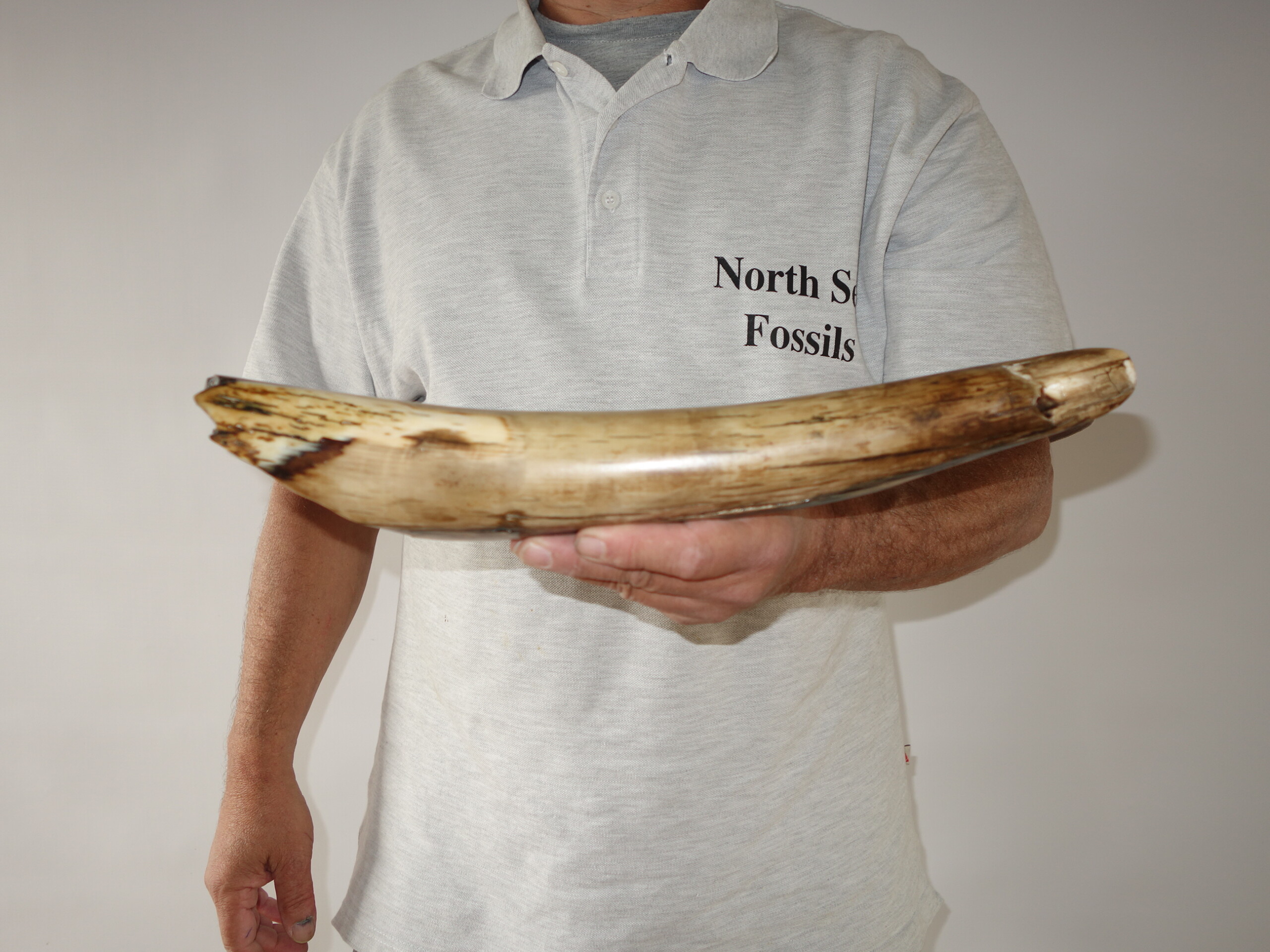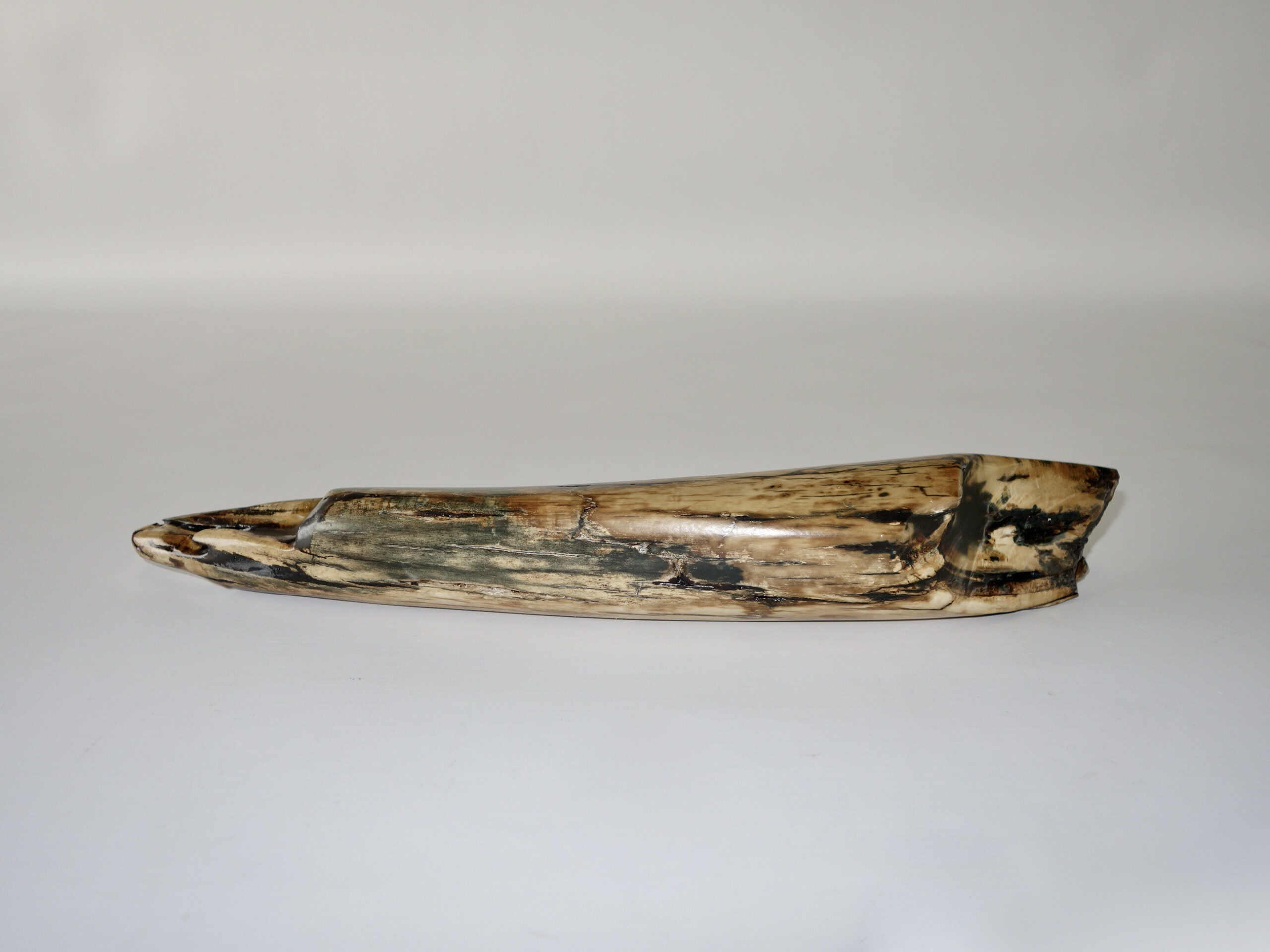 On offer is a gorgeous and large piece of tusk of a Woolly Mammoth from the Pleistocene era. This is the middle part of the tusk, the base and tip are missing, but otherwise it is in excellent state of preservation, as seen in the images. No restoration whatsoever. This tusk piece is of beautiful colouring of mainly white, gold, brown, grey and black ivory, and with absolutely stunning patterning. The black and white section of the ruler in the image represents 10 cm / 3.9 inch. Judging from the circumference, this would have belonged to a female Mammoth. This piece has been applied with a matt finish, but it is also possible to order it with a glossy finish.