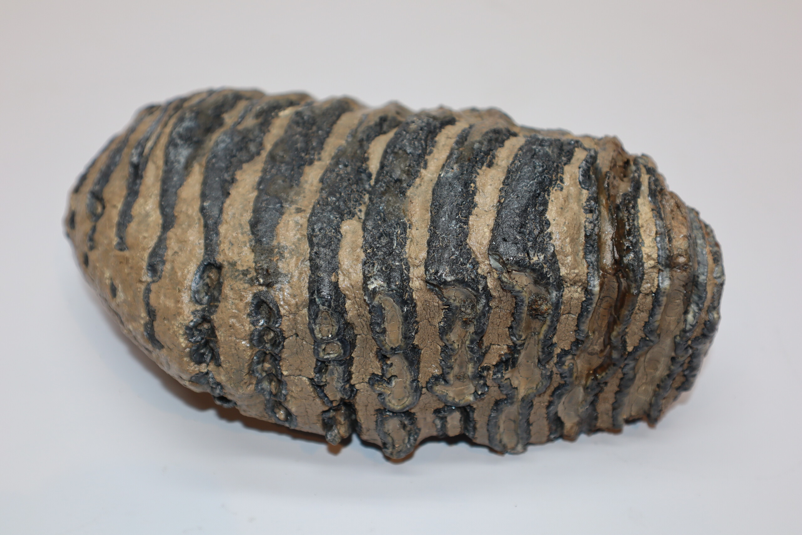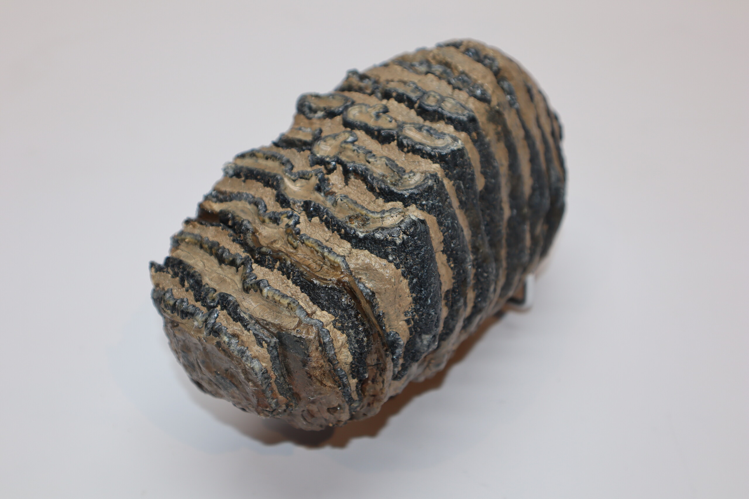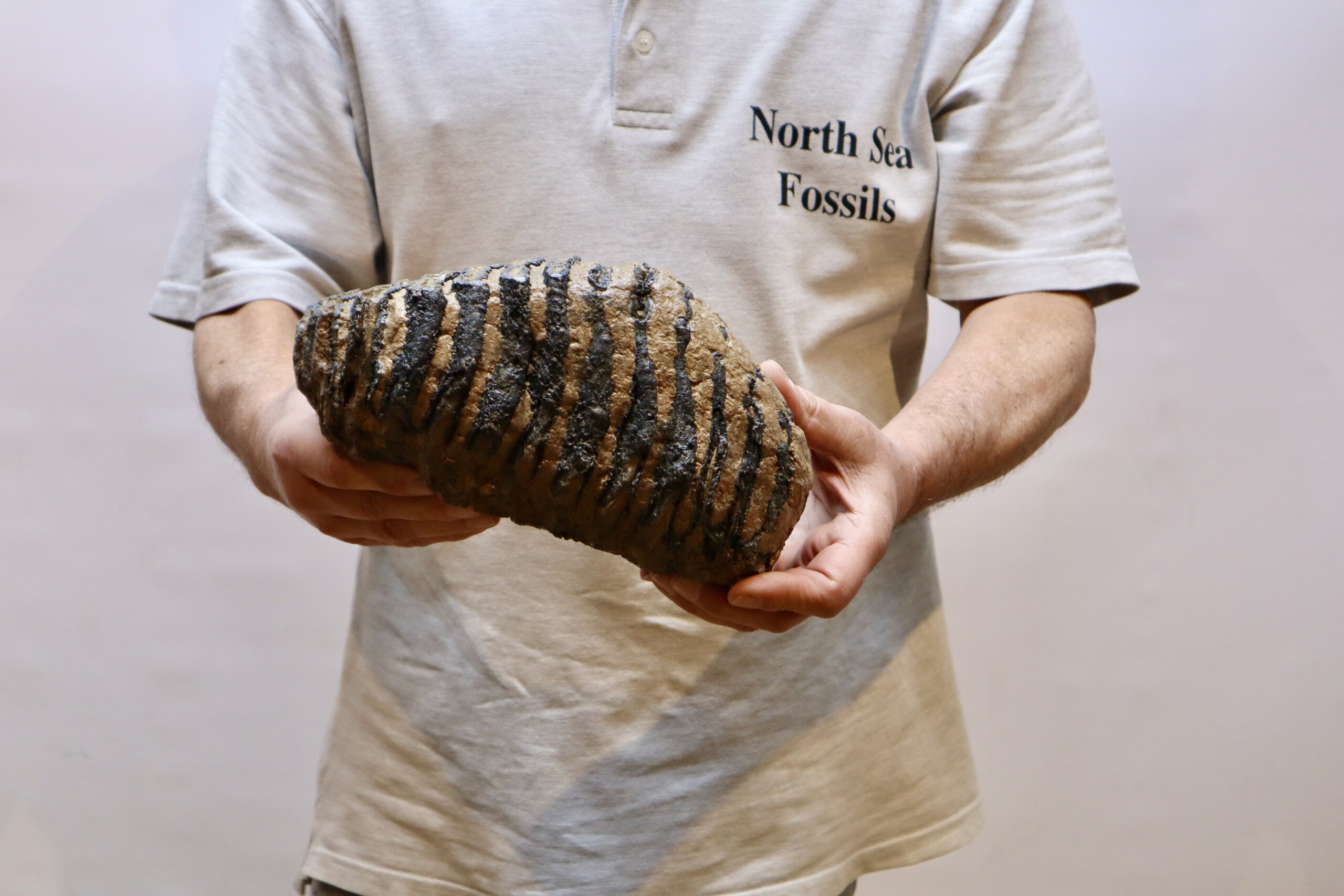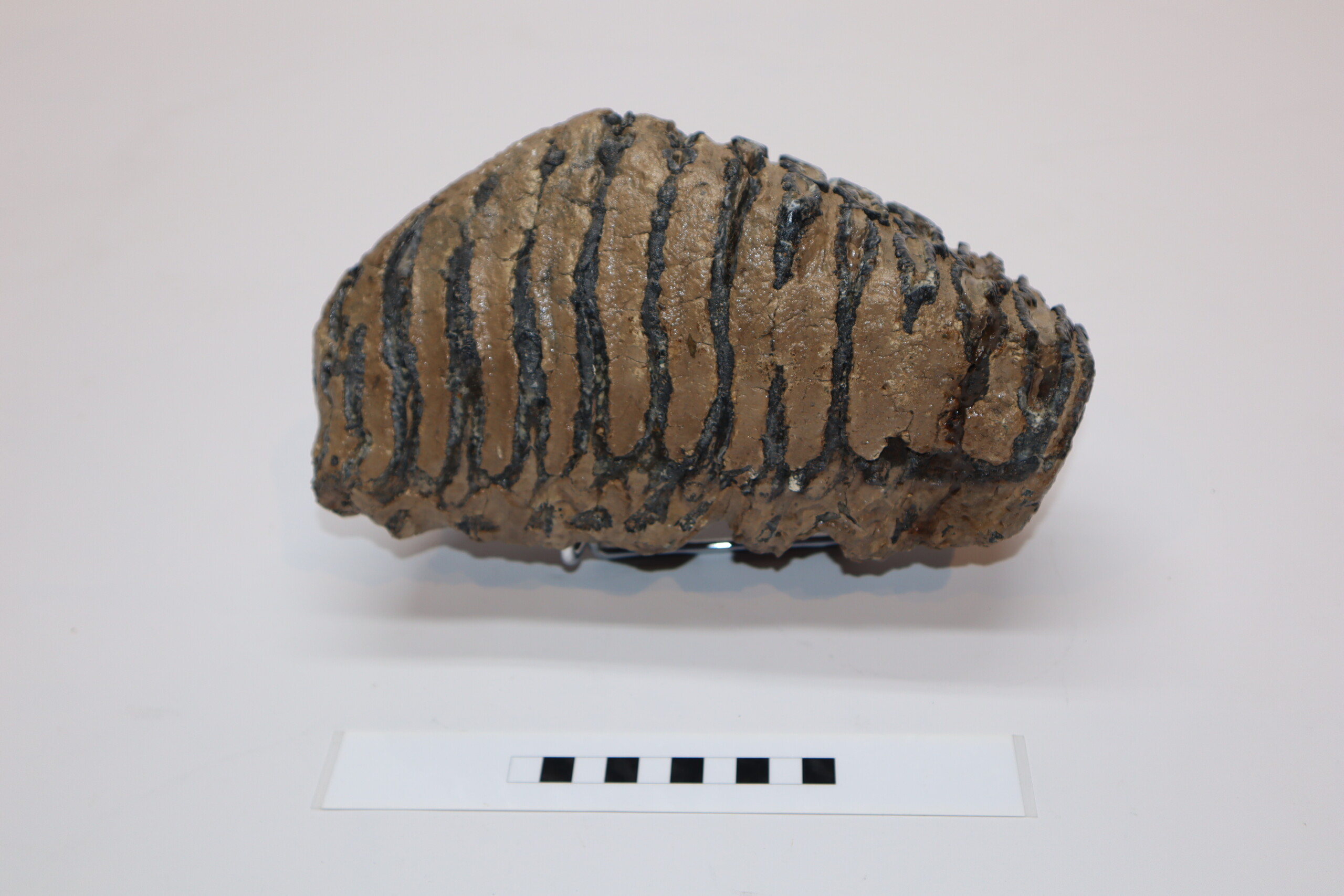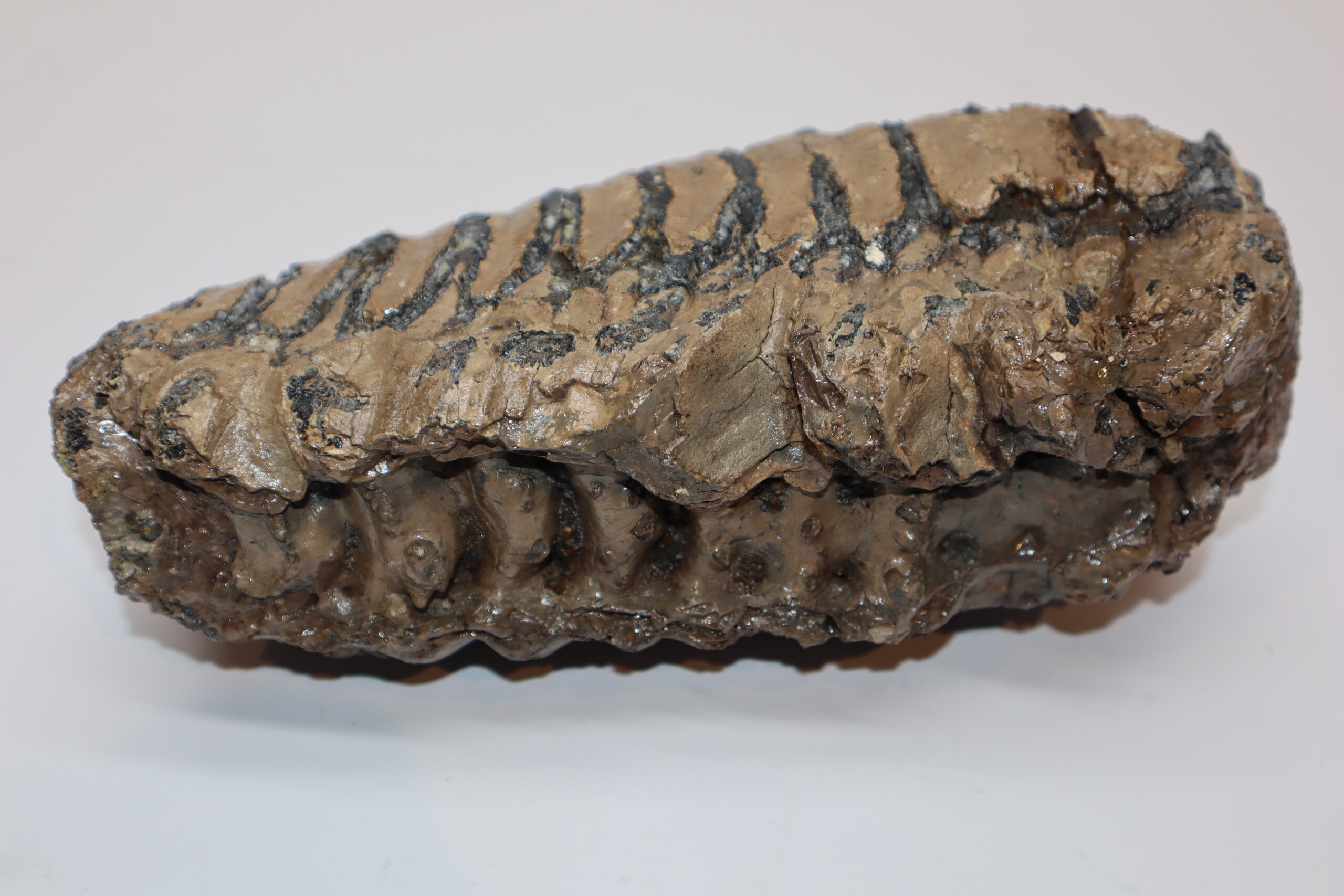 On offer is a fantastic M3 molar that comes from the right upper jaw of a Southern Mammoth, or Mammuthus meridionalis. With a shoulder height of approx 4 metres (13 feet), this is one of the largest species of Mammoth to have ever lived. It is also much older and very much rarer than the more commonly encountered Woolly Mammoth. This is a fantastic and heavy example of an adult animal, in wonderful state of preservation as seen in the images. No restoration whatsoever. The black and white section of the ruler in the image represents 10 cm / 3.9 inch. No restoration whatsoever. Highly recommended.