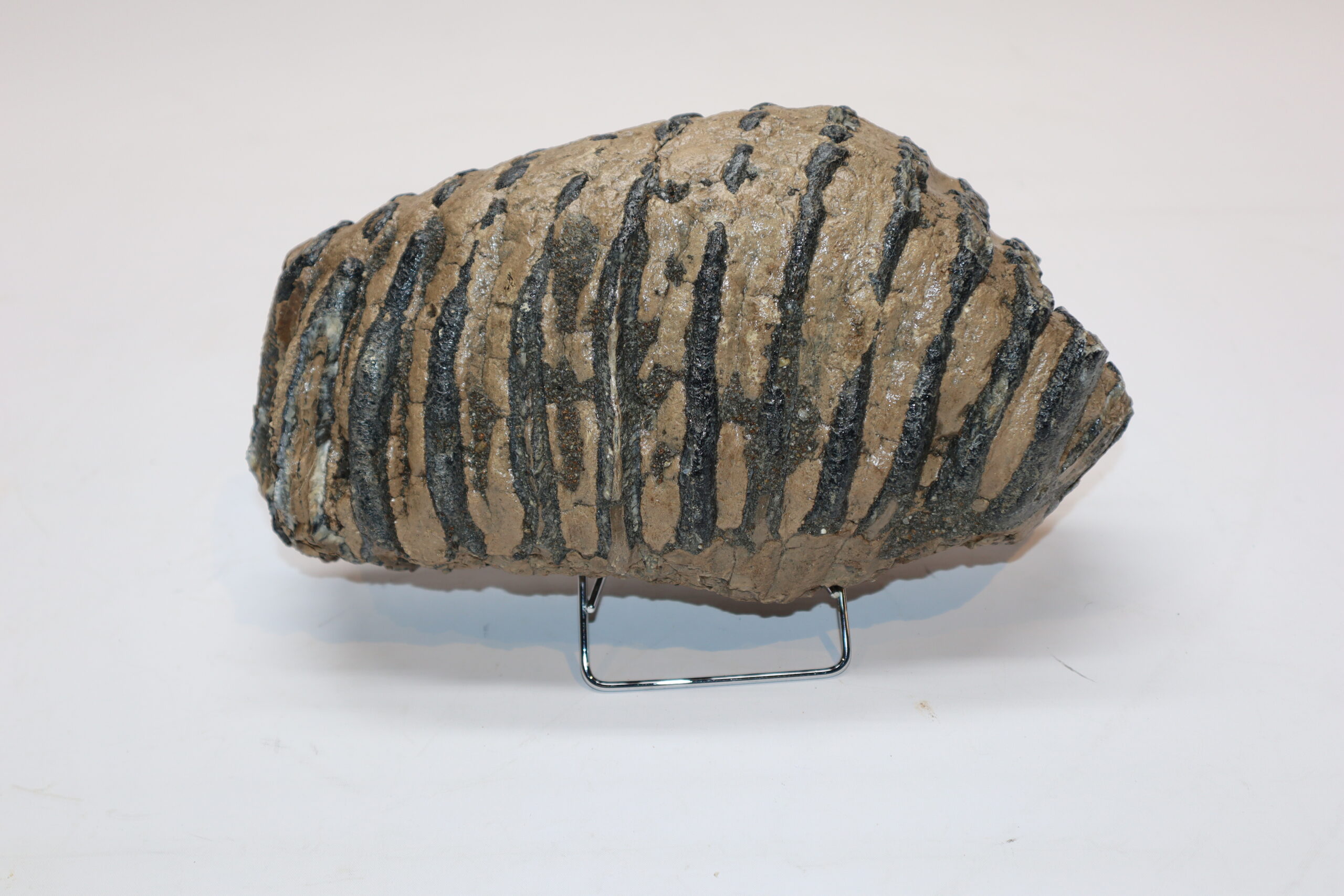 On offer is a fantastic M3 molar that comes from the left upper jaw of a Southern Mammoth, or Mammuthus meridionalis. With a shoulder height of approx 4 metres (13 feet), this is one of the largest species of Mammoth to have ever lived. It is also much older and very much rarer than the more commonly encountered Woolly Mammoth. This is a fantastic and heavy example of an adult animal, in wonderful state of preservation as seen in the images. No restoration whatsoever. The black and white section of the ruler in the image represents 10 cm / 3.9 inch. No restoration whatsoever. Highly recommended.