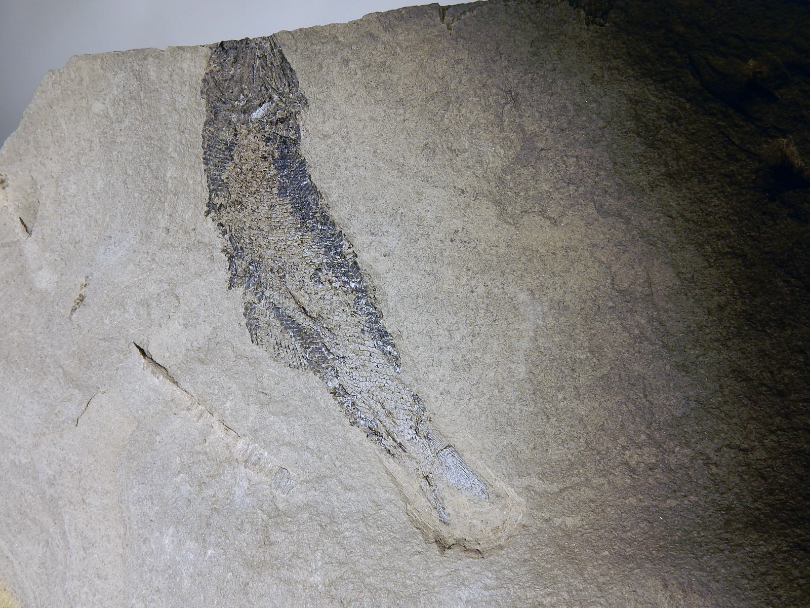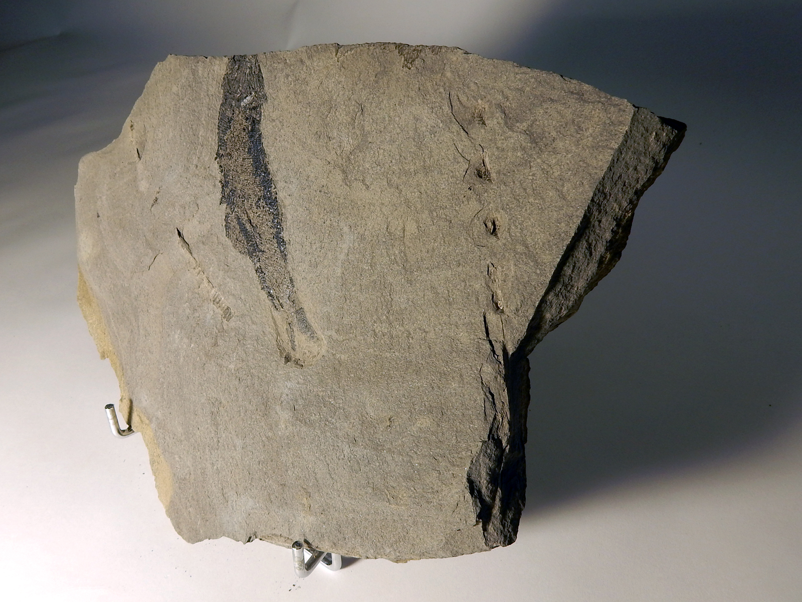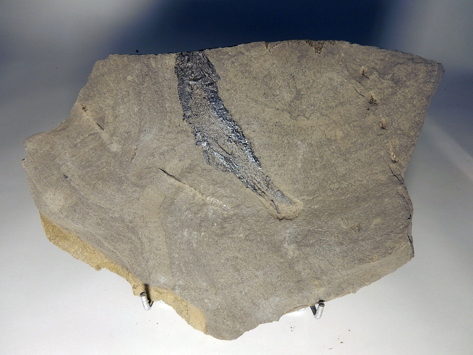 On offer is a well-preserved almost complete example of a Palaeoniscum freieslebeni, a fossilized extint species of ray-finned fish. Nicely preserved and many details can be seen, including the fins and skull. Nicely centred on a limestone slab. This comes with a stainless steel display stand.