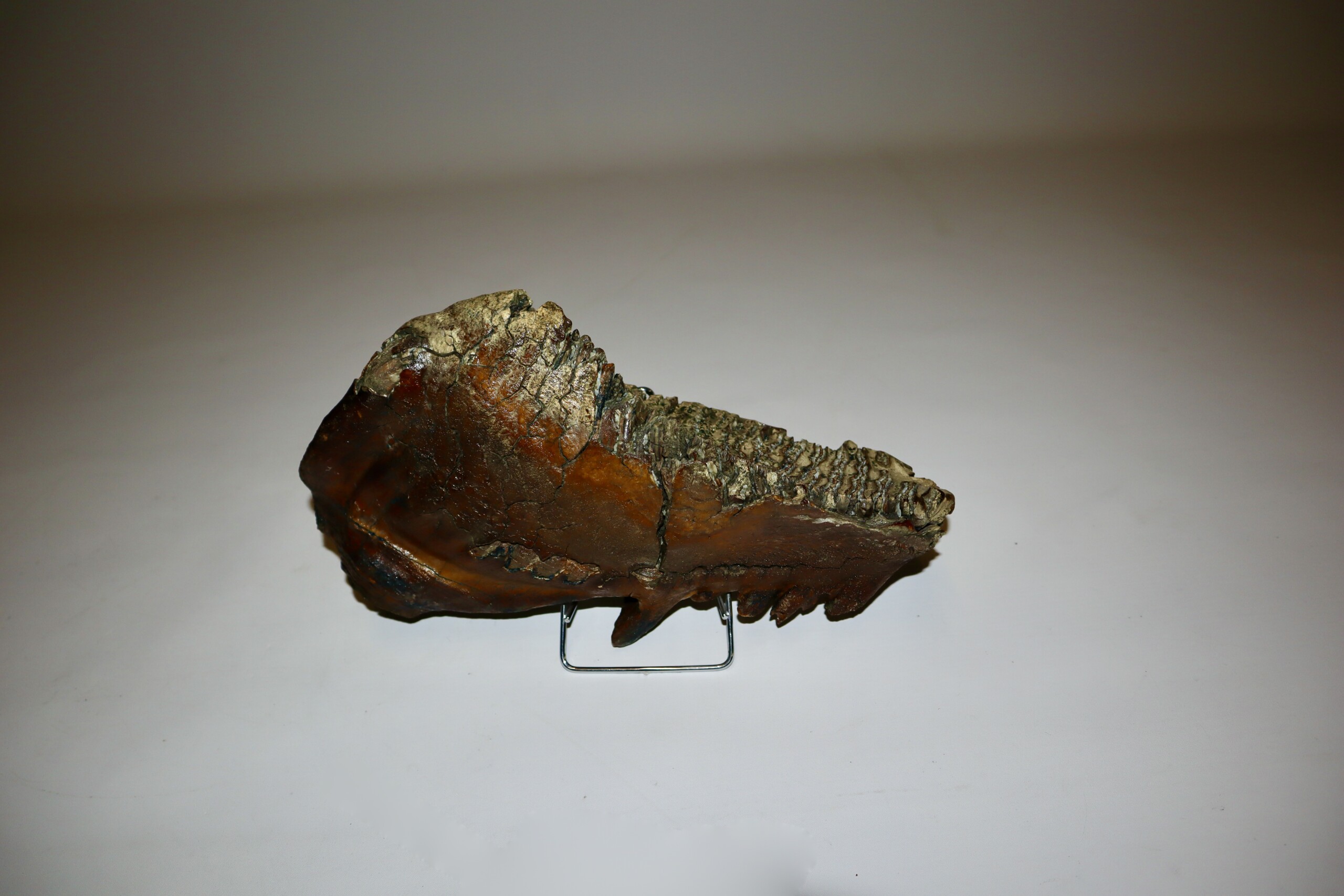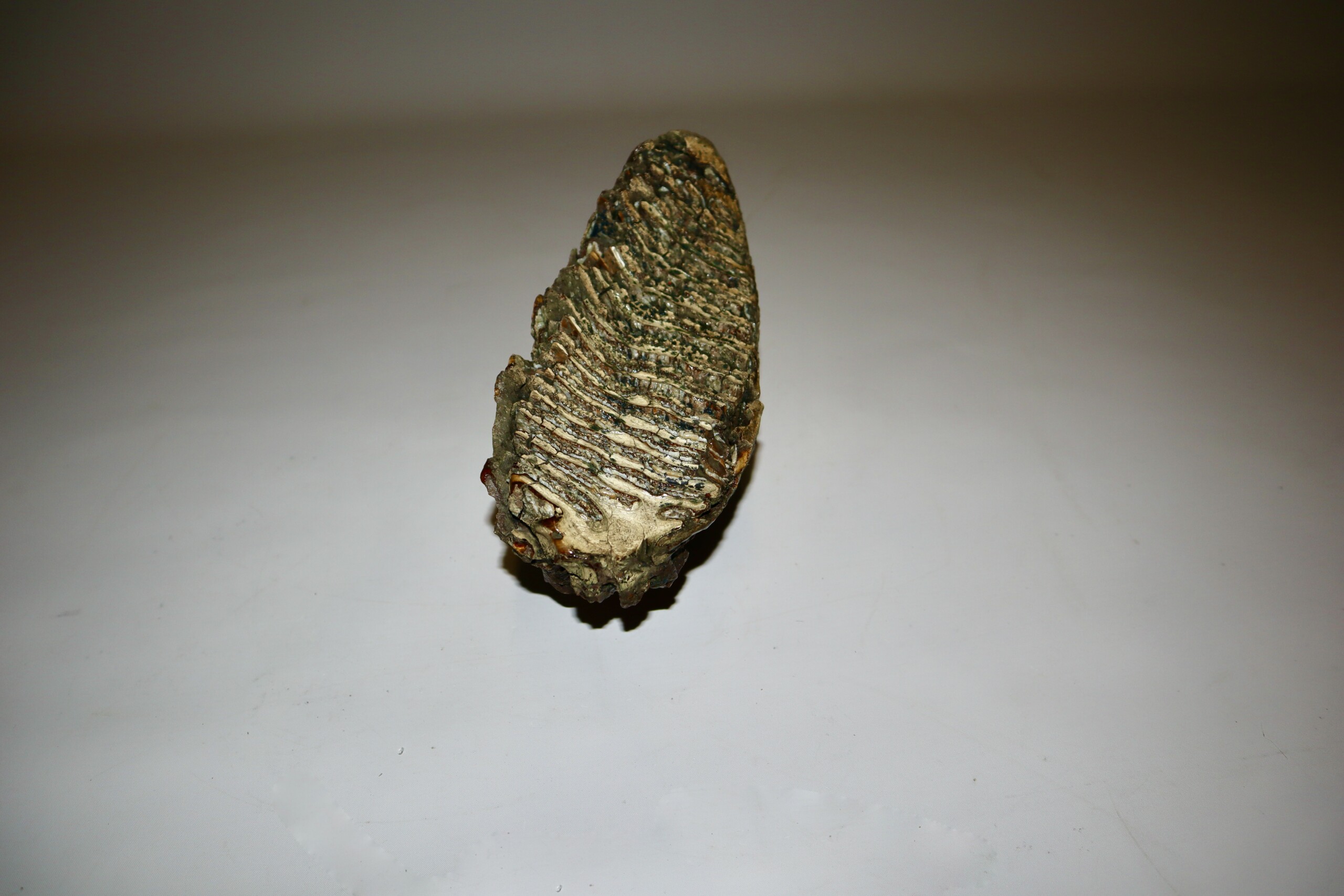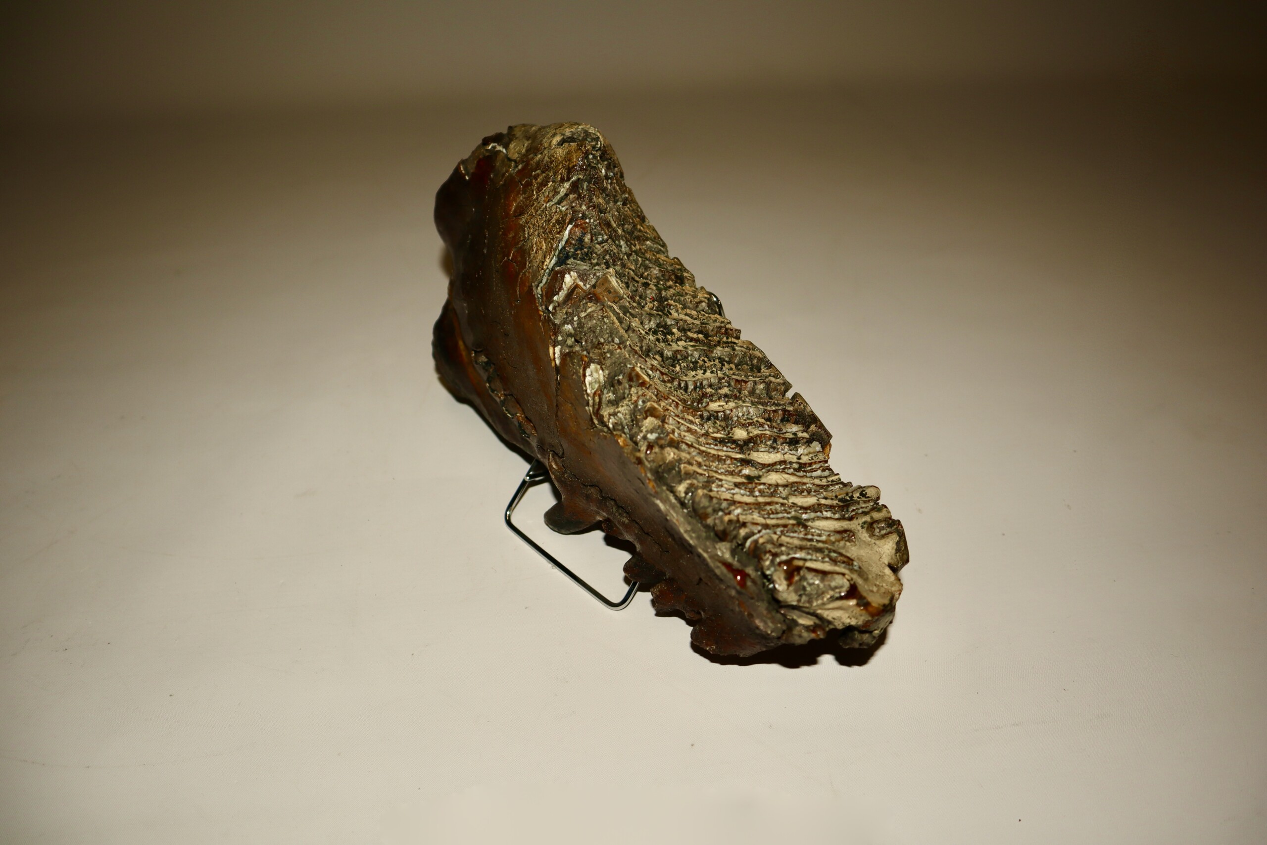 On offer is a good M3 molar of a very old Woolly Mammoth from the Pleistocene era. This molar comes from the right lower jaw. Fantastic quality tooth with beautiful chewing surface. Wonderful state of preservation, as seen in the images, and no restoration whatsoever. Judging from the size and the state of wear, this molar belonged to a very old Mammoth, which had reached the end of its natural life. The black and white section of the ruler in the image represents 10 cm / 3.9 inch.