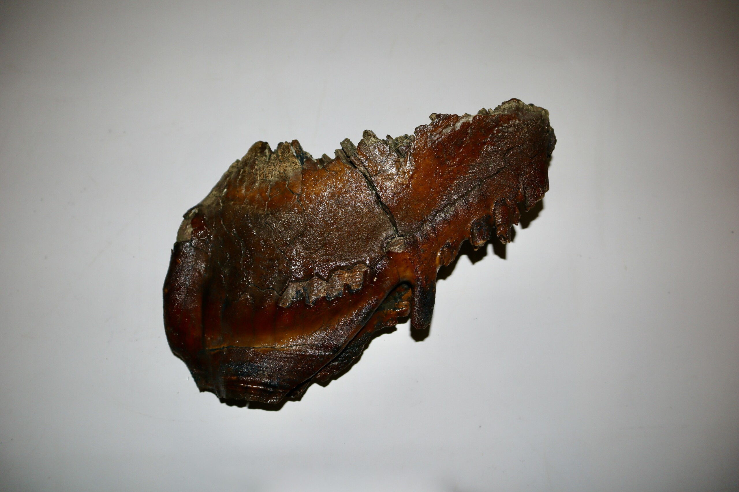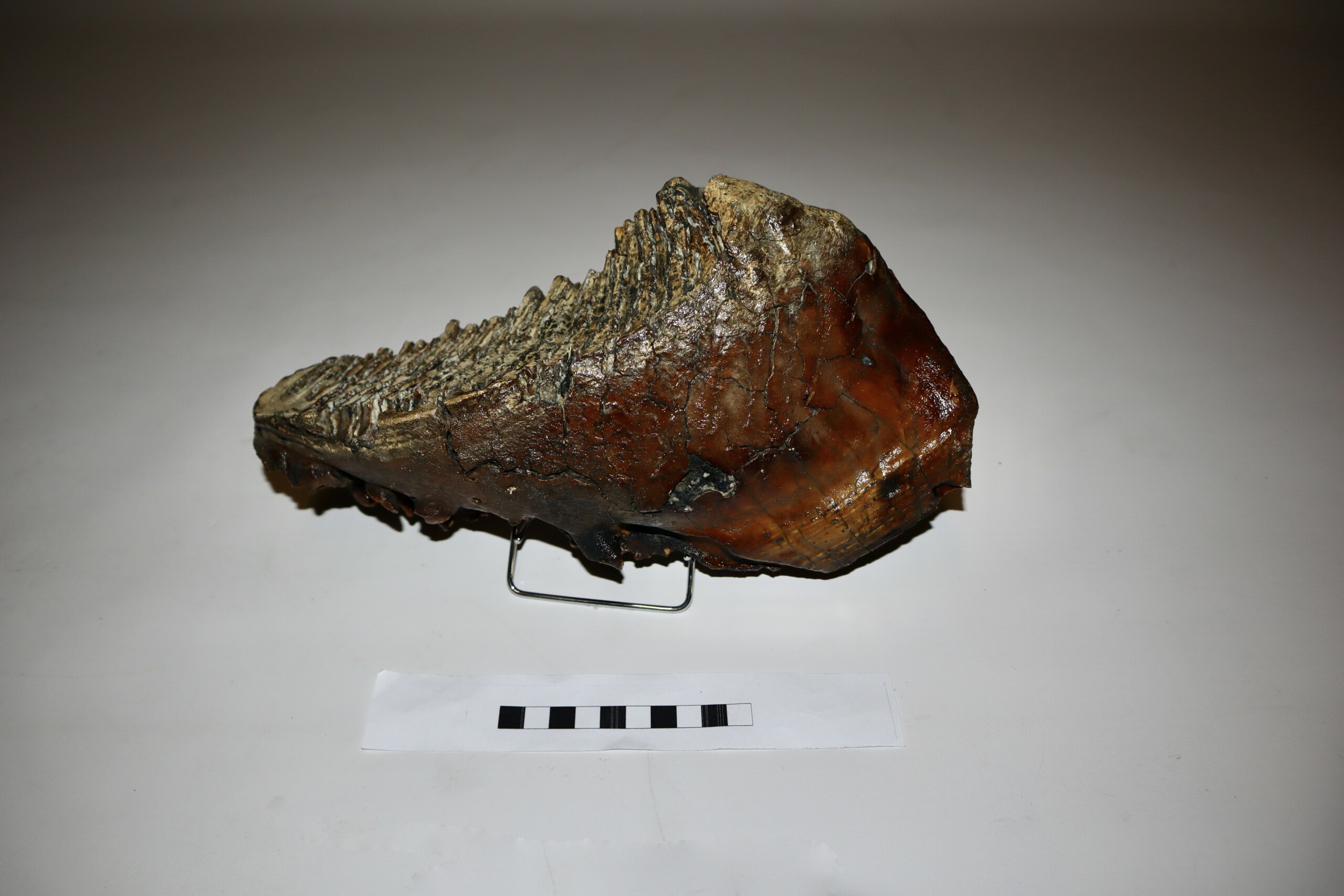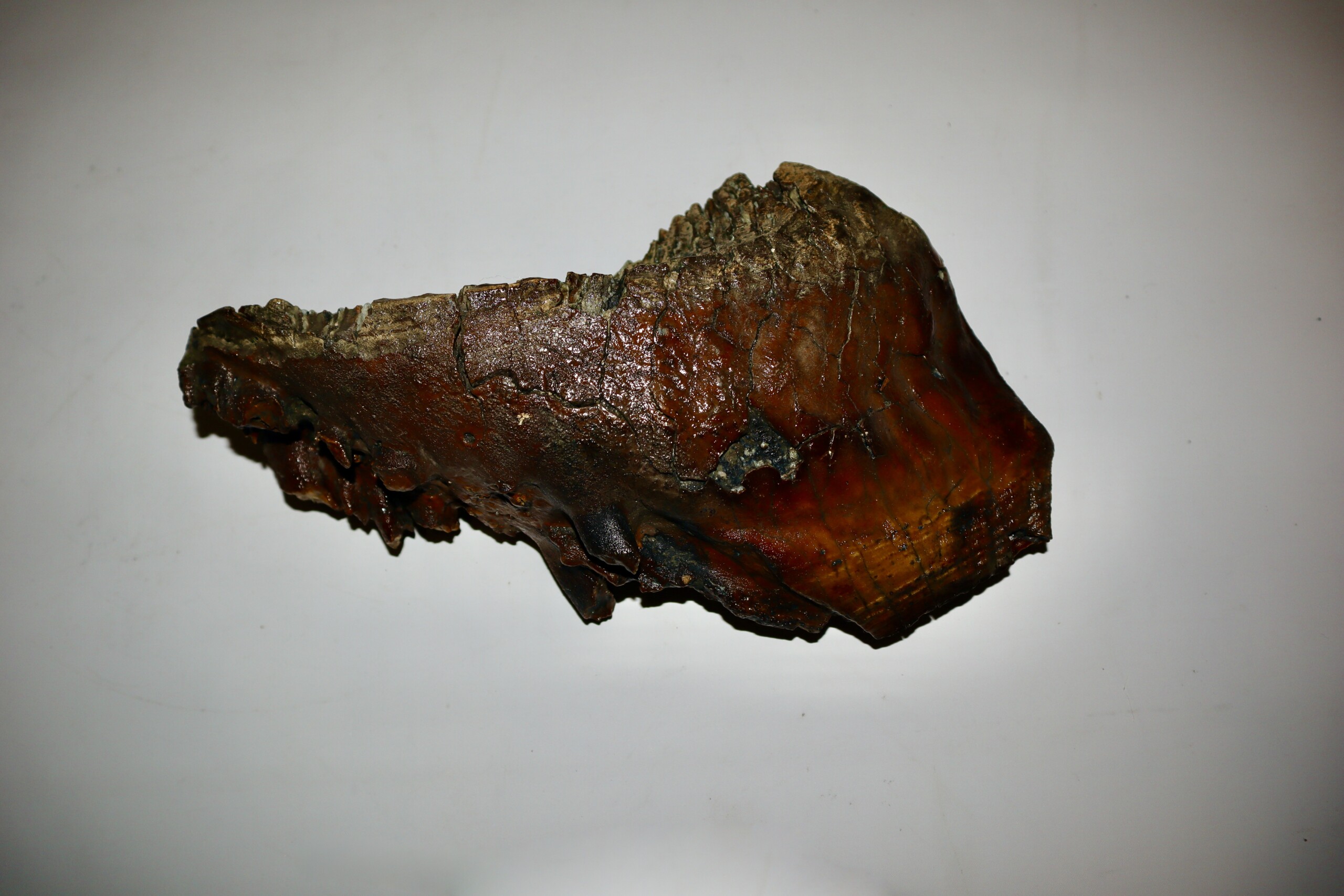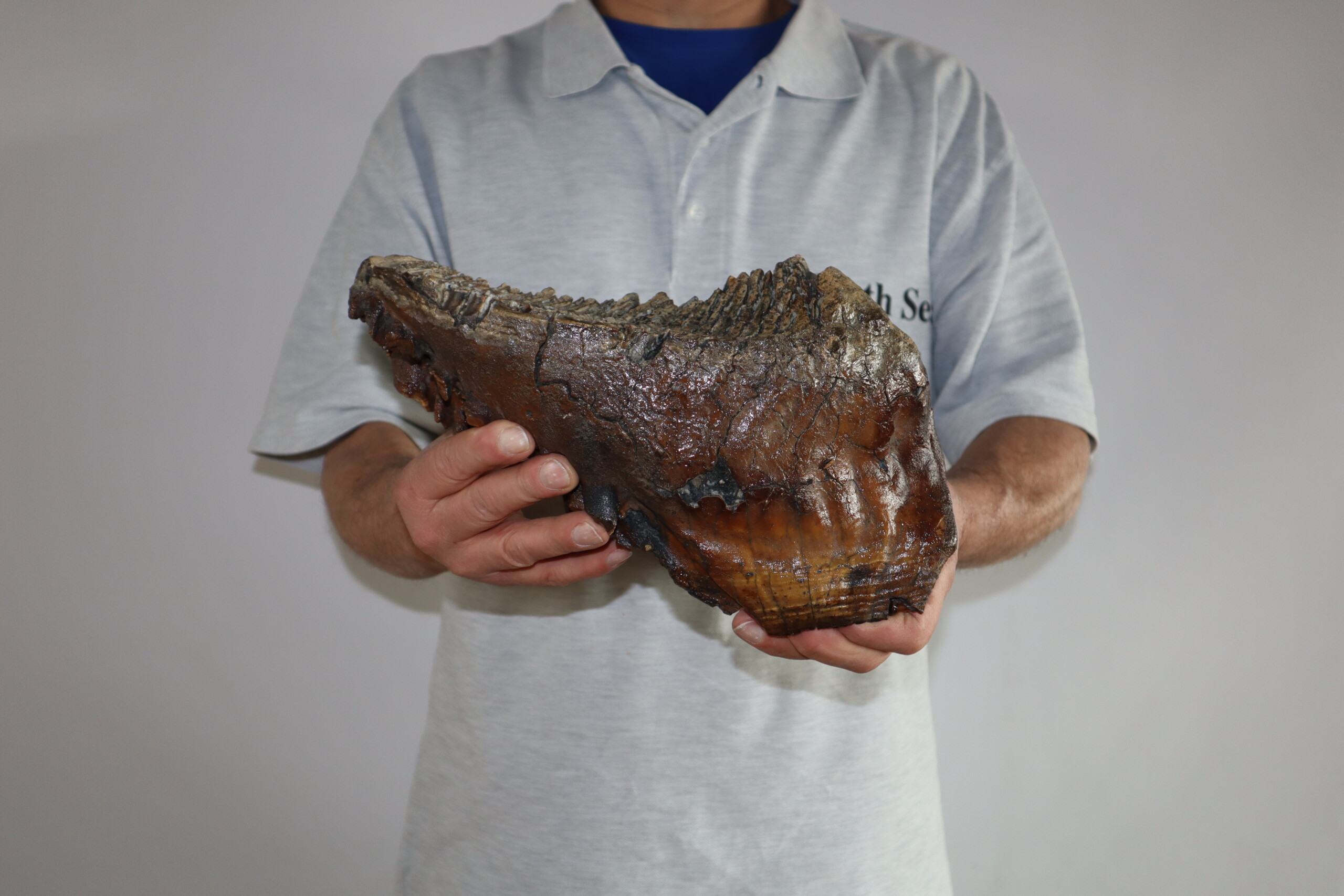 On offer is a good M3 molar of a very old Woolly Mammoth from the Pleistocene era. This molar comes from the right lower jaw. Fantastic quality tooth with beautiful chewing surface. Wonderful state of preservation, as seen in the images, and no restoration whatsoever. Judging from the size and the state of wear, this molar belonged to a very old Mammoth, which had reached the end of its natural life. The black and white section of the ruler in the image represents 10 cm / 3.9 inch.