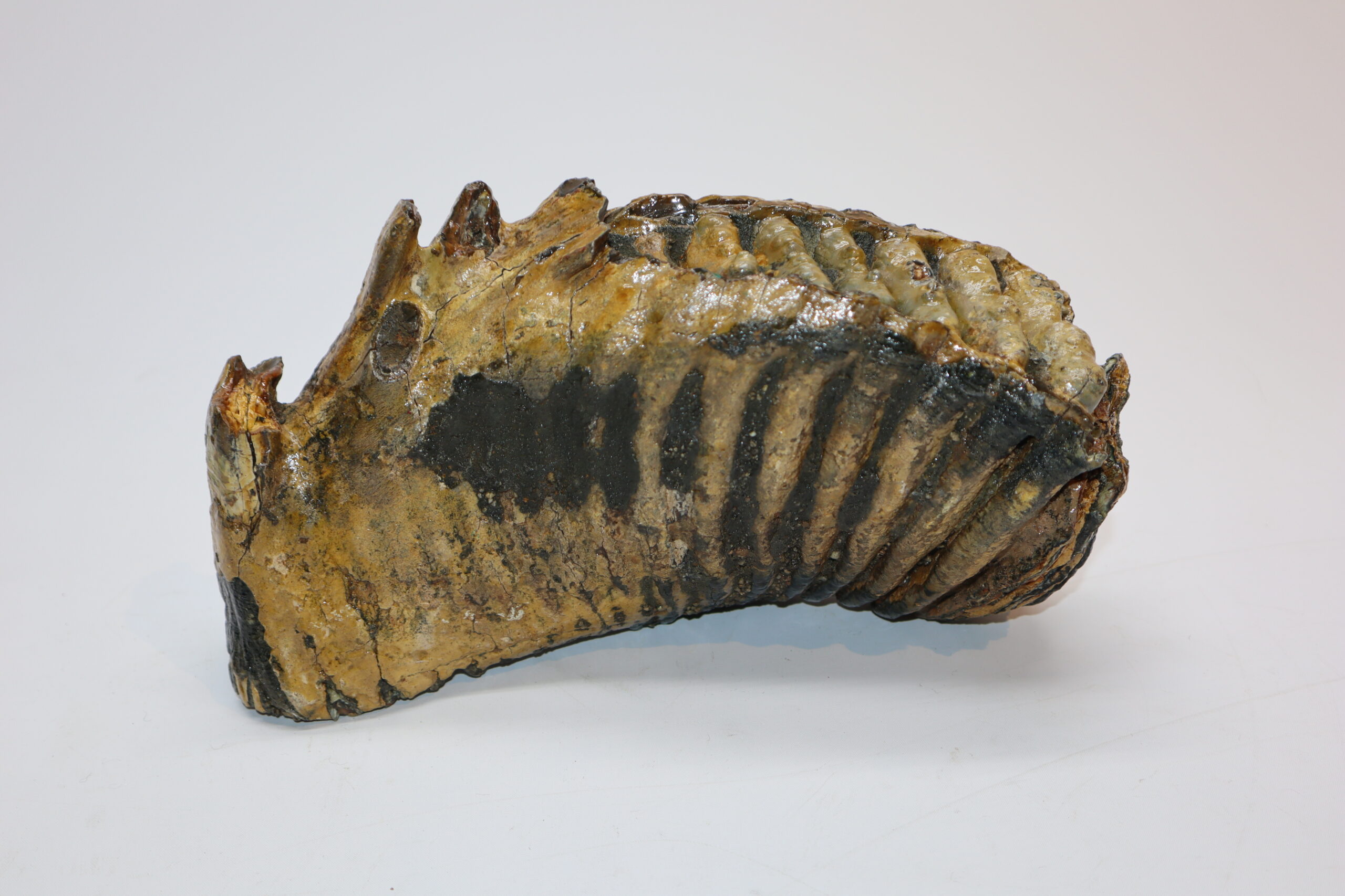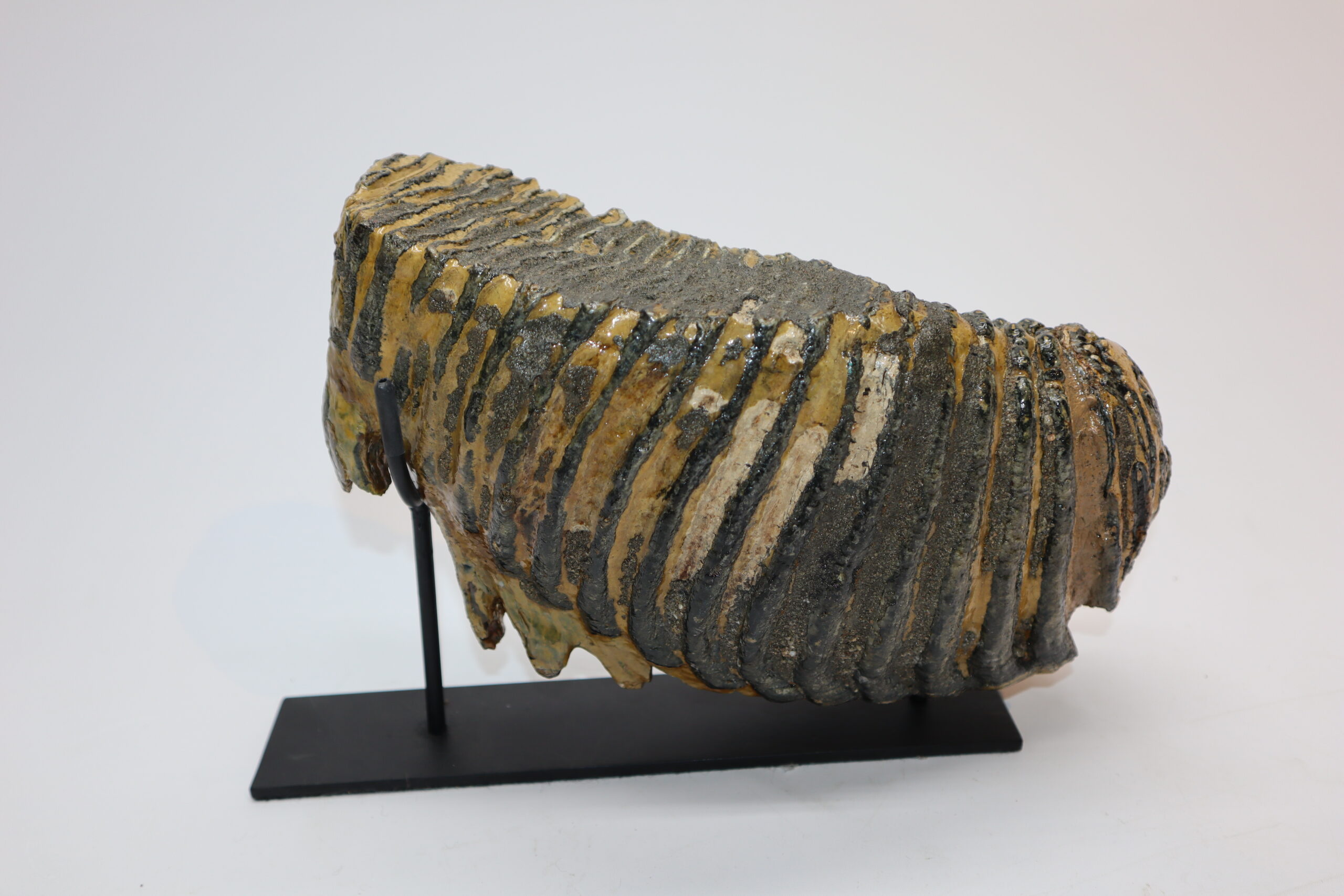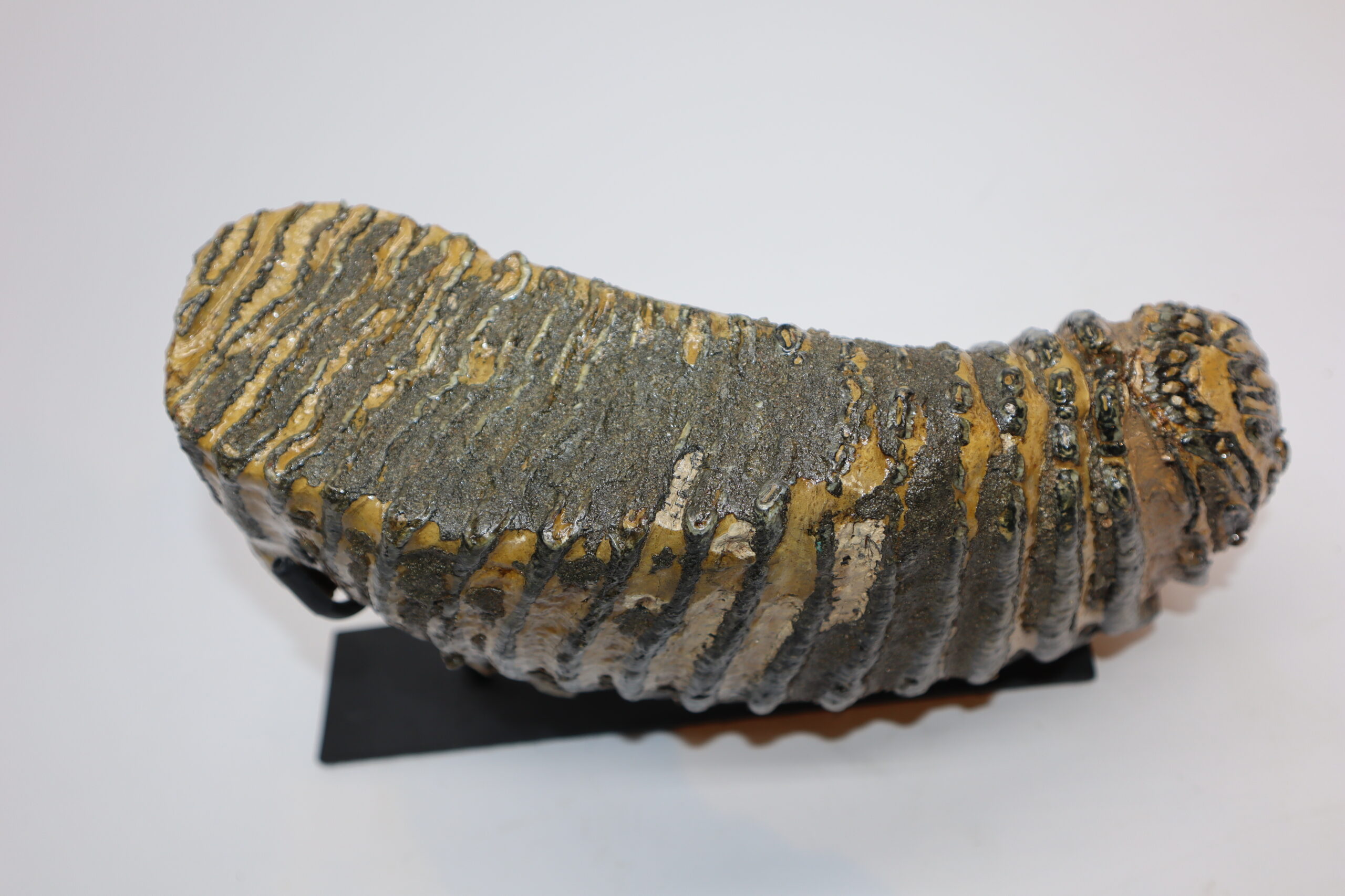 On offer is a fantastic and large M3 molar of a Woolly Mammoth from the Pleistocene era. This molar comes from the right lower jaw and is a beautiful example of a fully grown animal, in fantastic state of preservation and with a beautiful chewing surface as seen in the images. No restoration whatsoever. Judging from the size, this belonged to an adult Mammoth in the prime of its life. The black and white section of the ruler in the image represents 10 cm / 3.9 inch.