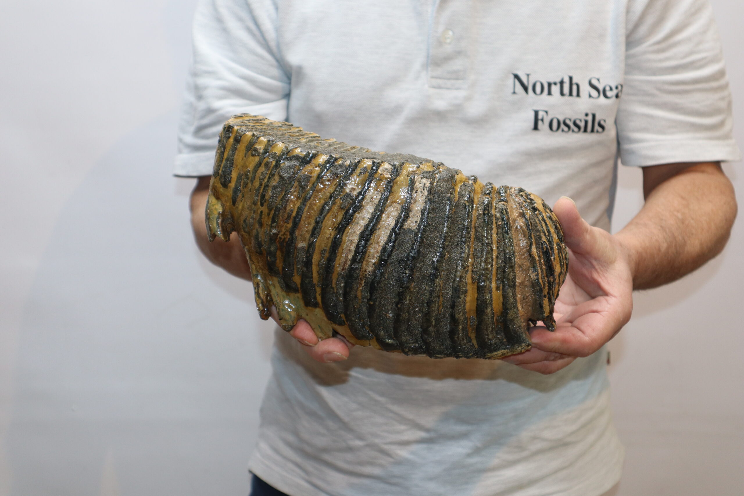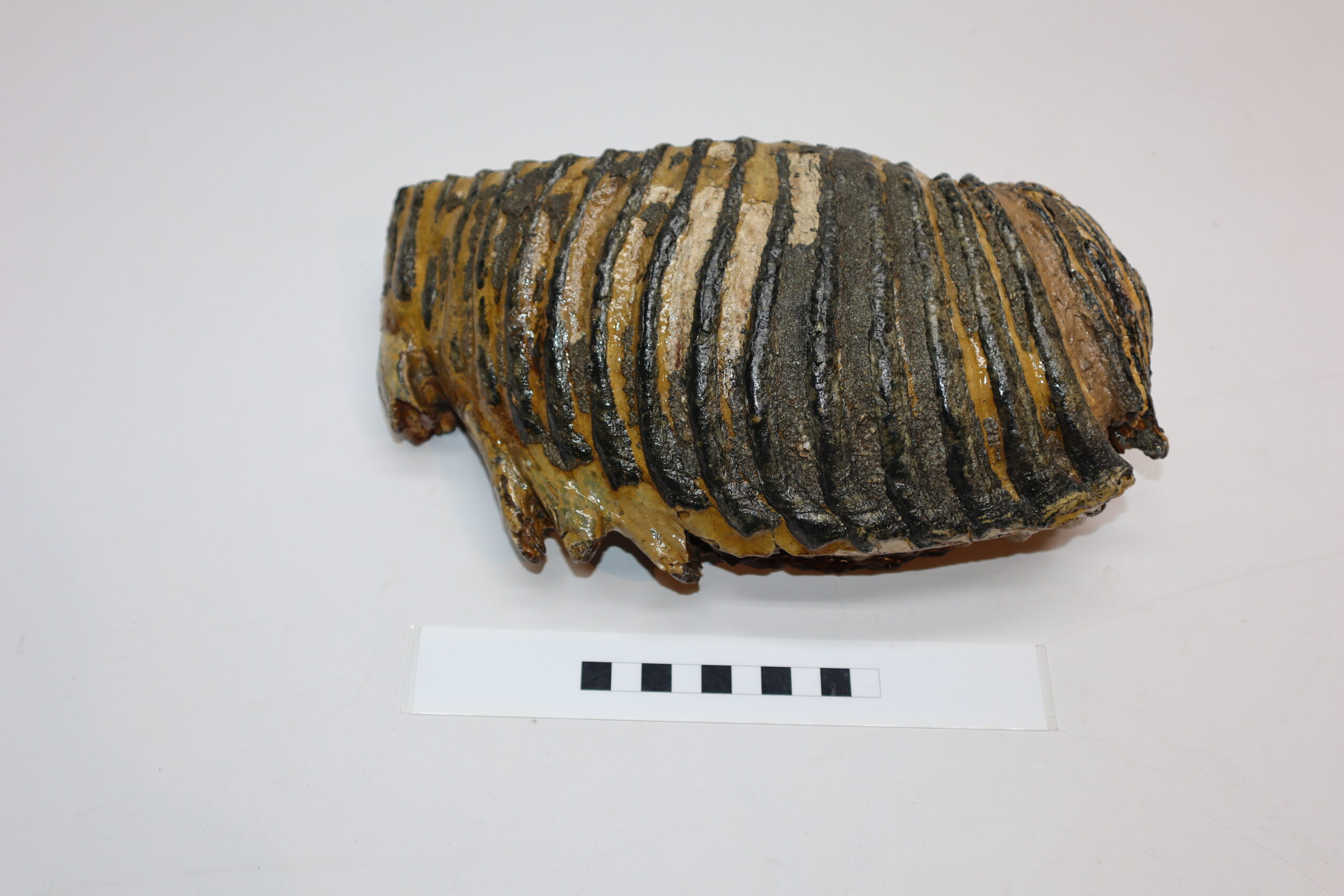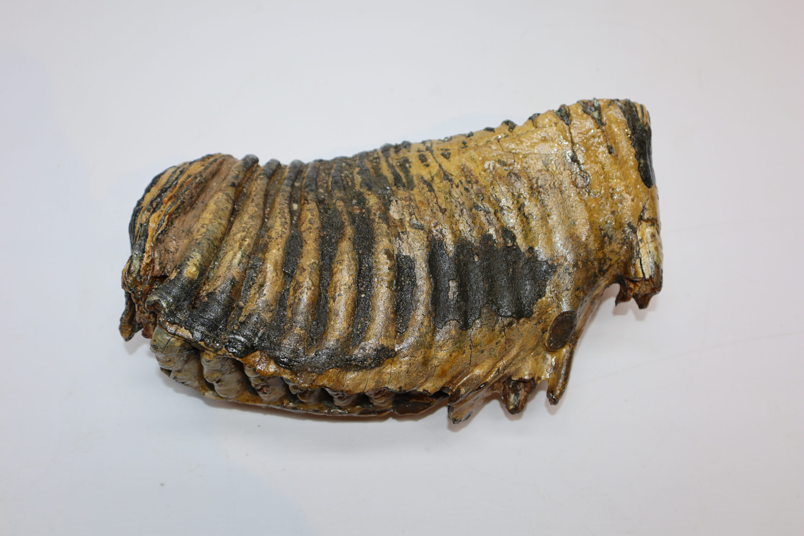 On offer is a fantastic and large M3 molar of a Woolly Mammoth from the Pleistocene era. This molar comes from the right lower jaw and is a beautiful example of a fully grown animal, in fantastic state of preservation and with a beautiful chewing surface as seen in the images. No restoration whatsoever. Judging from the size, this belonged to an adult Mammoth in the prime of its life. The black and white section of the ruler in the image represents 10 cm / 3.9 inch.