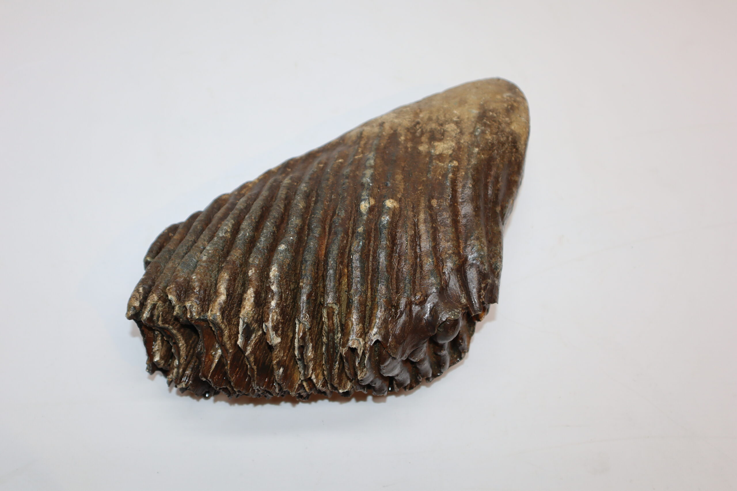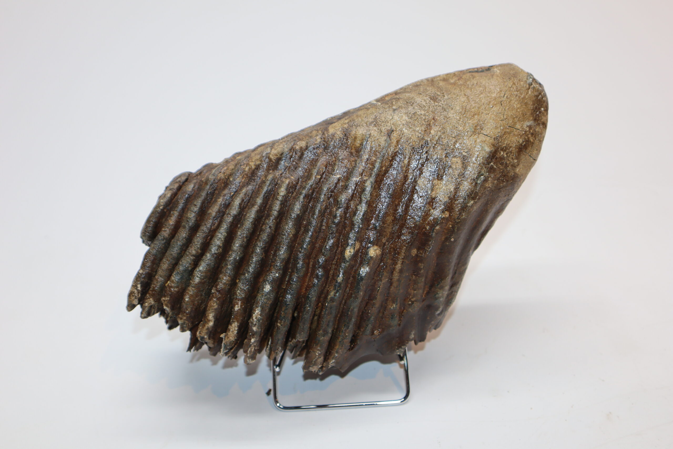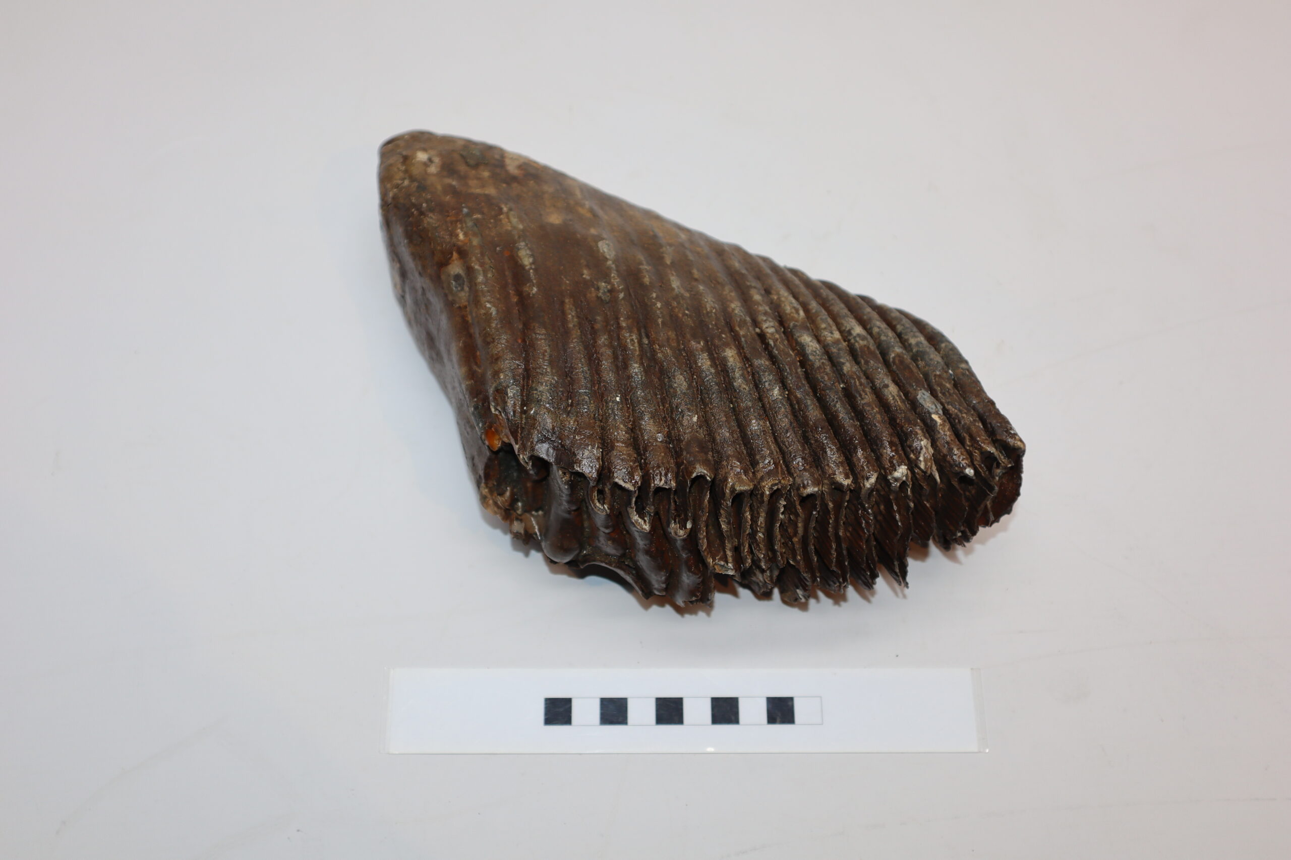 On offer is a good and large M3 molar of a Woolly Mammoth from the Pleistocene era. This molar comes from the right lower jaw and is a beautiful example of a fully grown animal. Missing a few ridges, but otherwise in good state of preservation and with a beautiful chewing surface as seen in the images. No restoration whatsoever. Judging from the size, this belonged to an adult Mammoth in the prime of its life. The black and white section of the ruler in the image represents 10 cm / 3.9 inch.