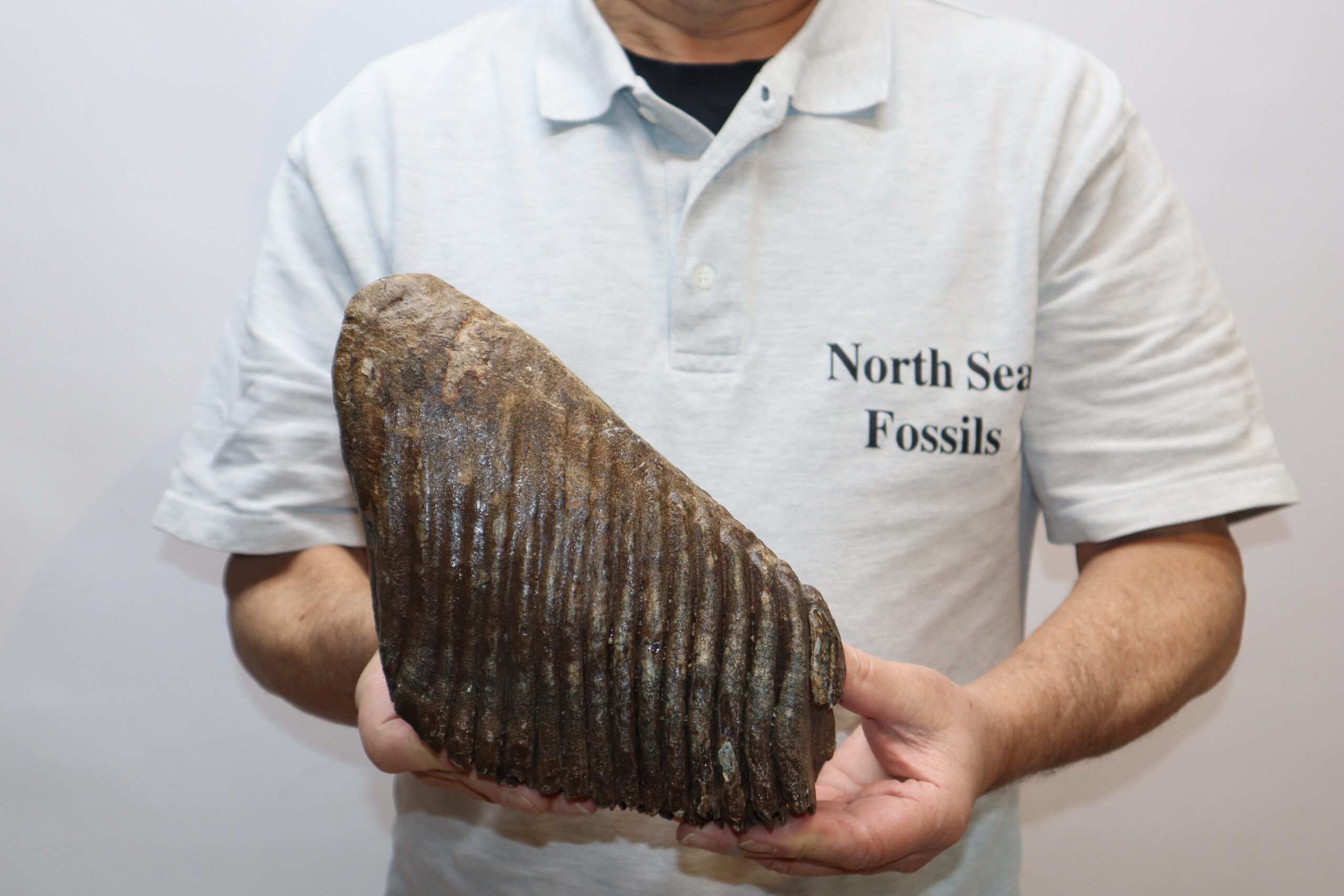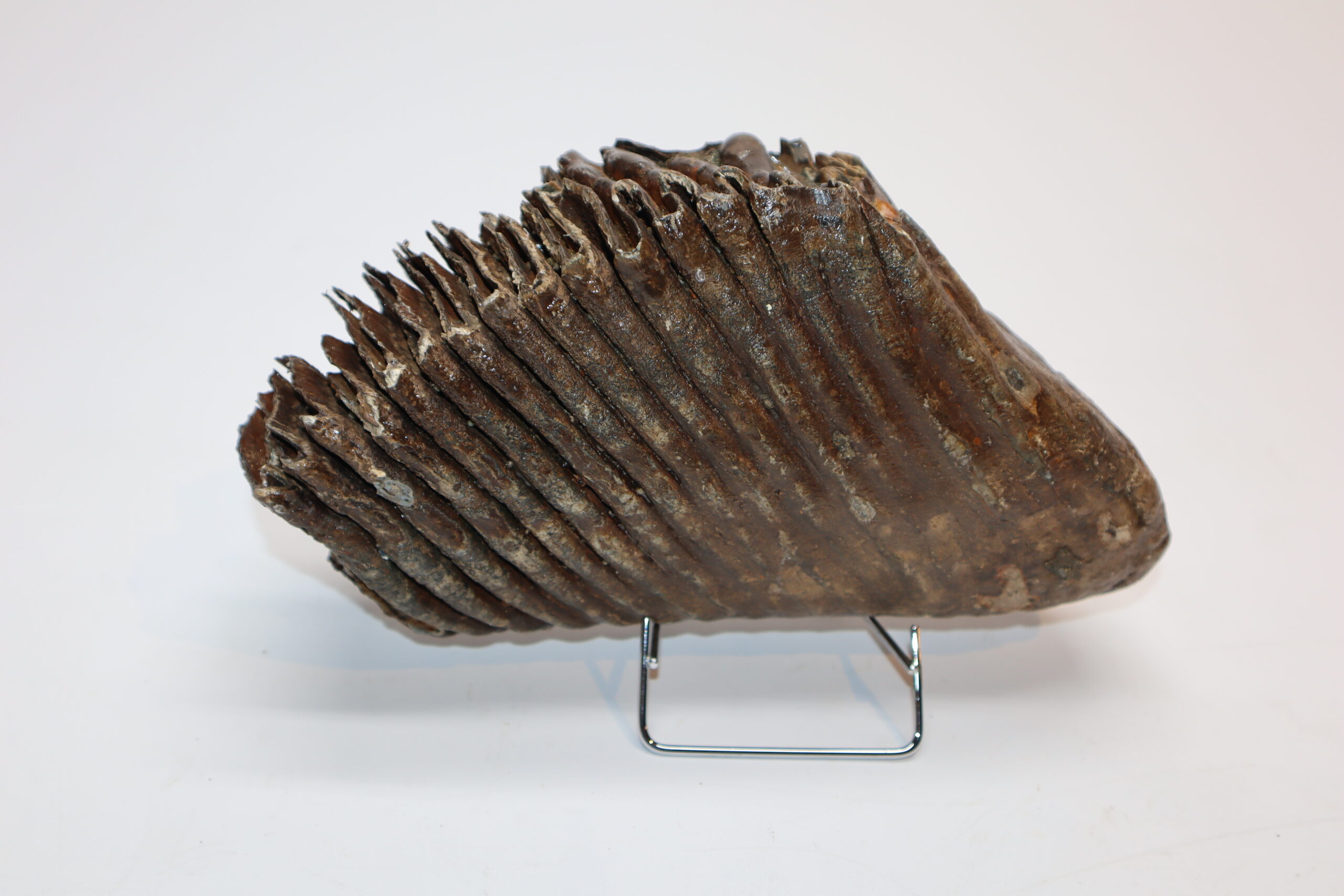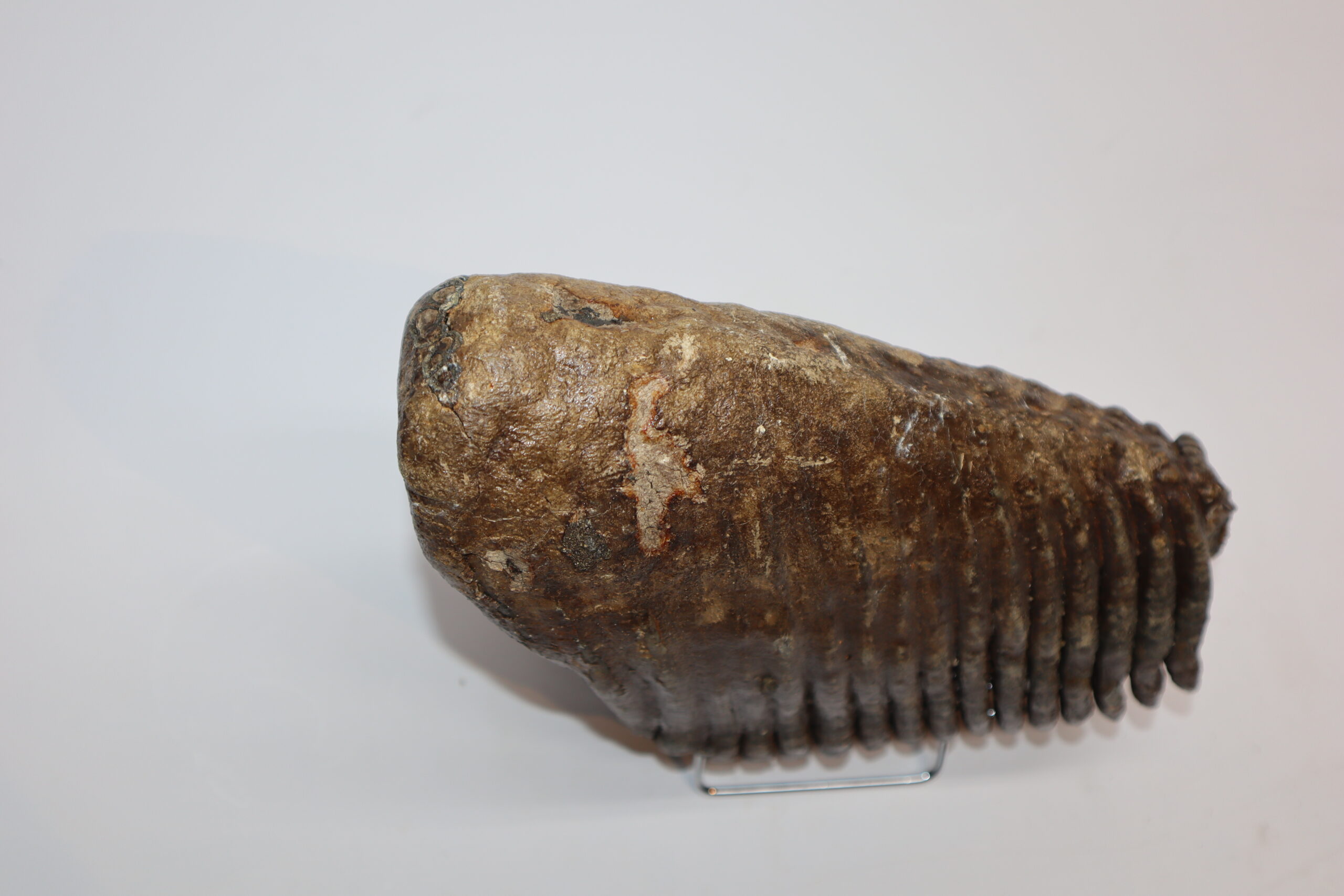 On offer is a good and large M3 molar of a Woolly Mammoth from the Pleistocene era. This molar comes from the right lower jaw and is a beautiful example of a fully grown animal. Missing a few ridges, but otherwise in good state of preservation and with a beautiful chewing surface as seen in the images. No restoration whatsoever. Judging from the size, this belonged to an adult Mammoth in the prime of its life. The black and white section of the ruler in the image represents 10 cm / 3.9 inch.