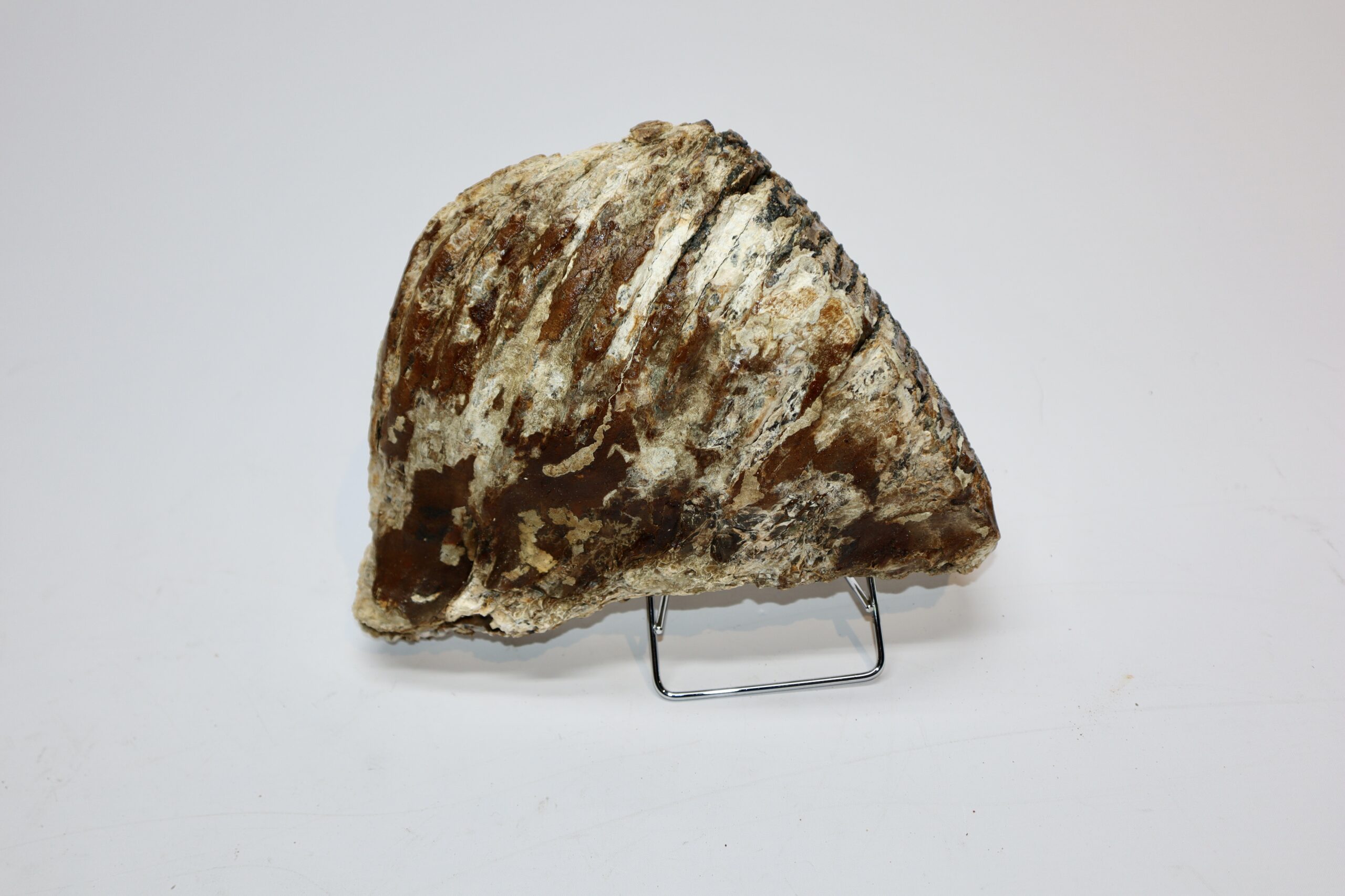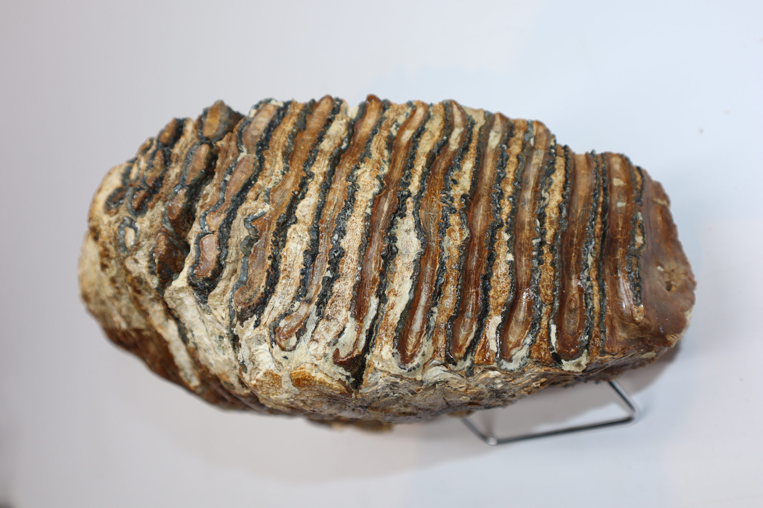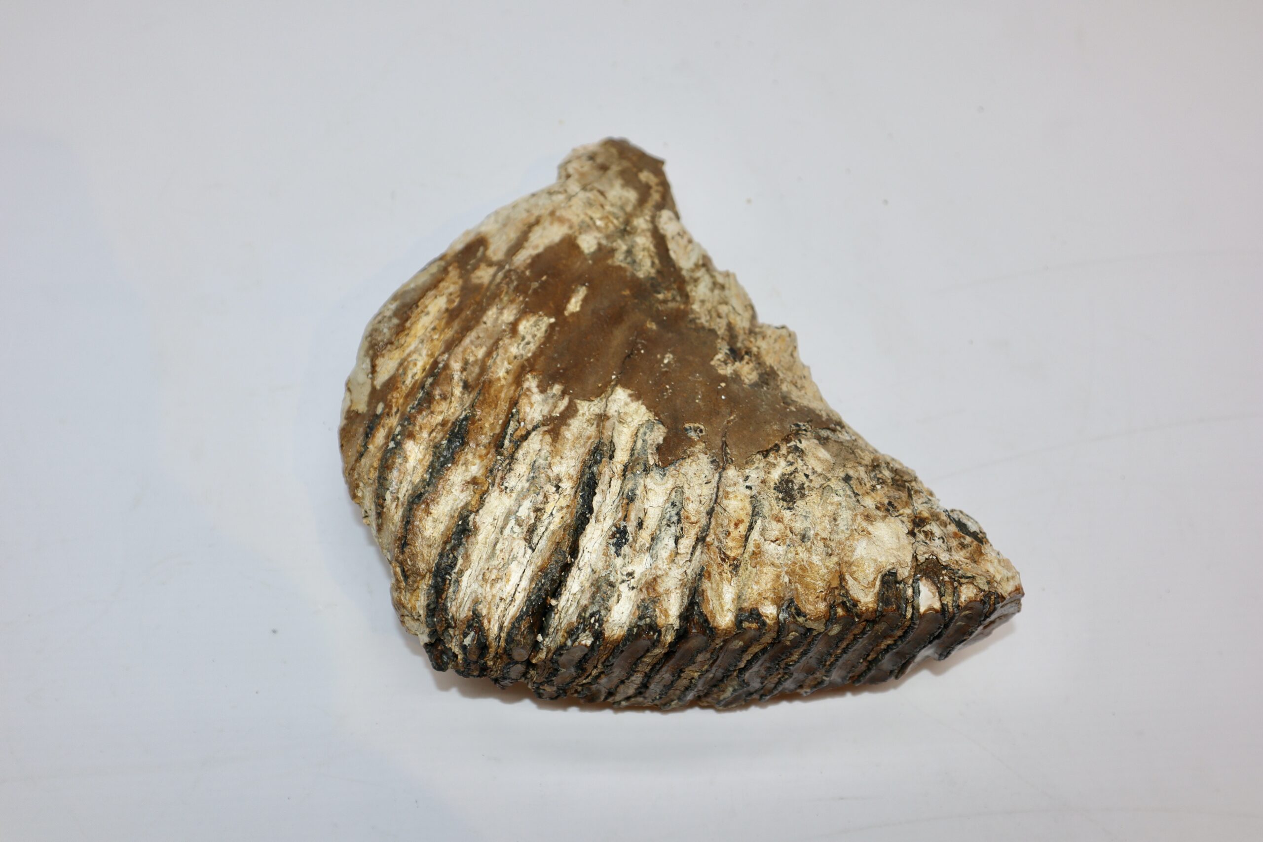On offer is a good and large M3 molar of a Woolly Mammoth from the Pleistocene era. This molar comes from the left upper jaw and is a beautiful example of a fully grown animal, in good state of preservation and with a beautiful chewing surface as seen in the images. No restoration whatsoever. Judging from the size, this belonged to an adult Mammoth in the prime of its life. The black and white section of the ruler in the image represents 10 cm / 3.9 inch.