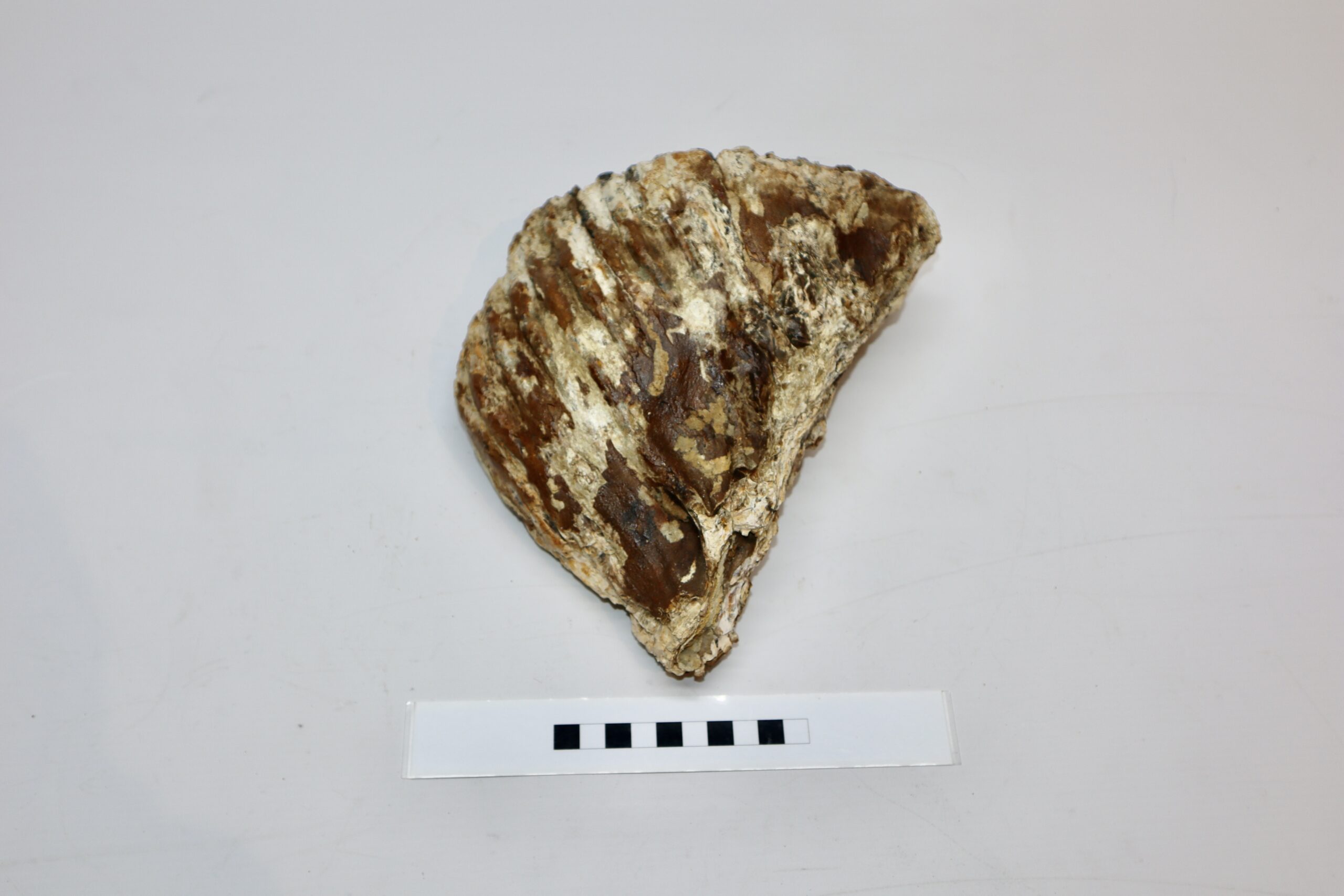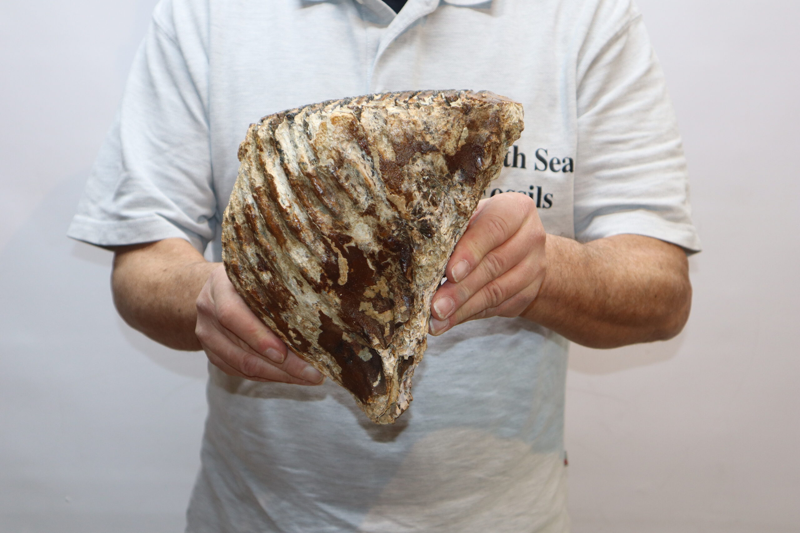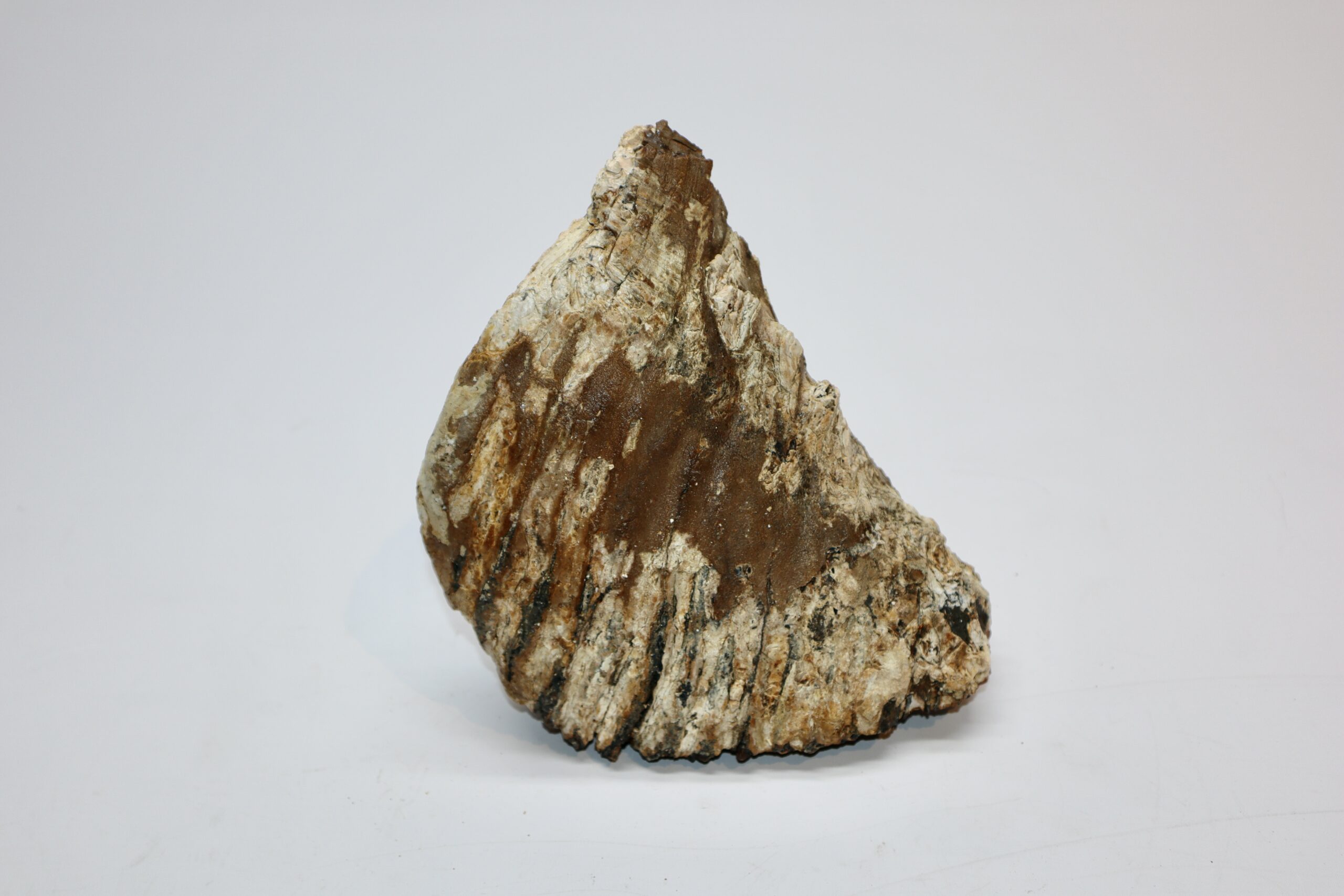 On offer is a good and large M3 molar of a Woolly Mammoth from the Pleistocene era. This molar comes from the left upper jaw and is a beautiful example of a fully grown animal, in good state of preservation and with a beautiful chewing surface as seen in the images. No restoration whatsoever. Judging from the size, this belonged to an adult Mammoth in the prime of its life. The black and white section of the ruler in the image represents 10 cm / 3.9 inch.