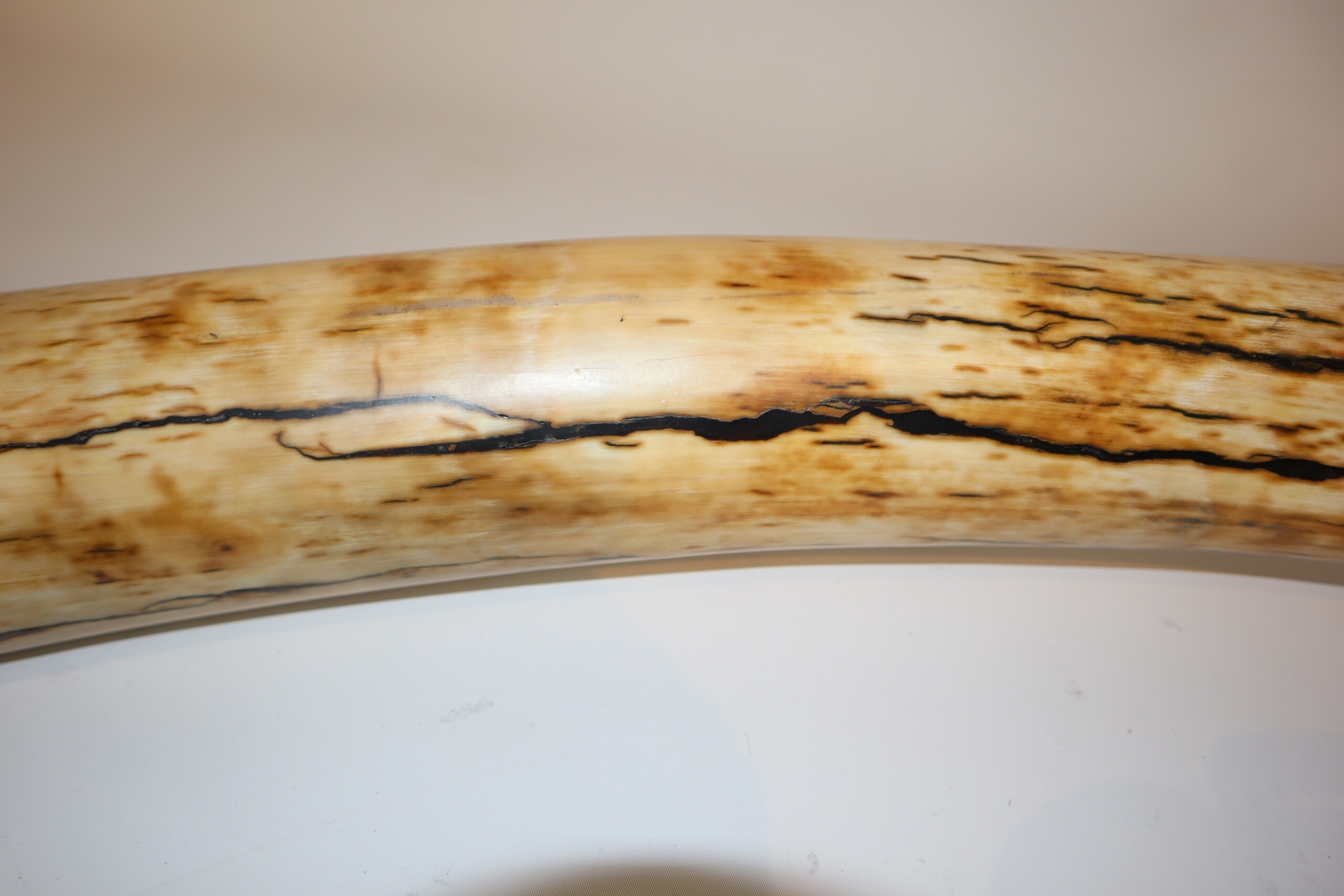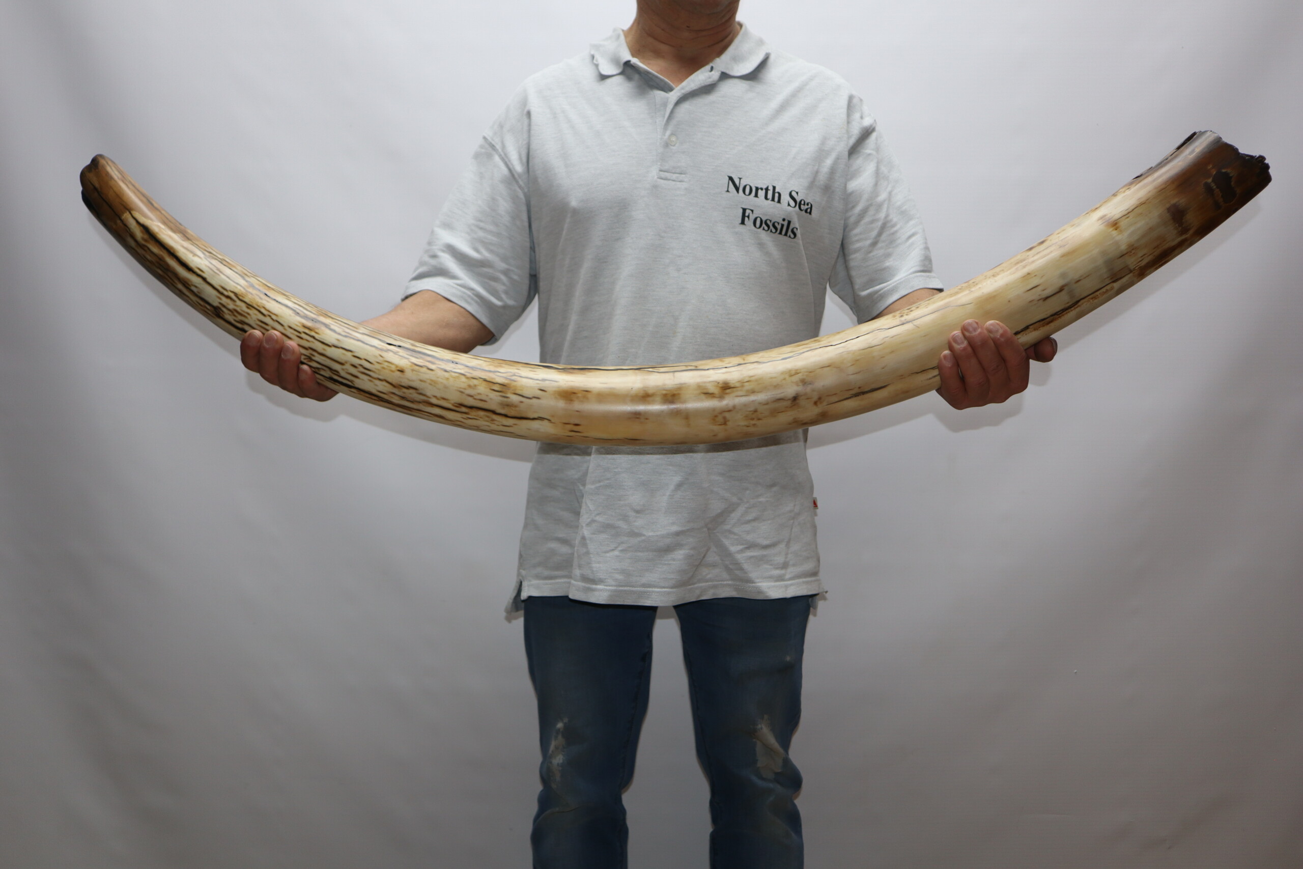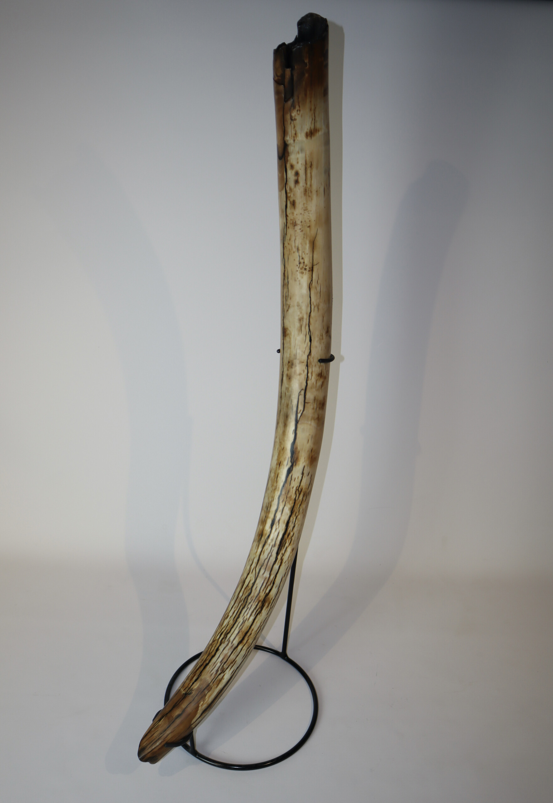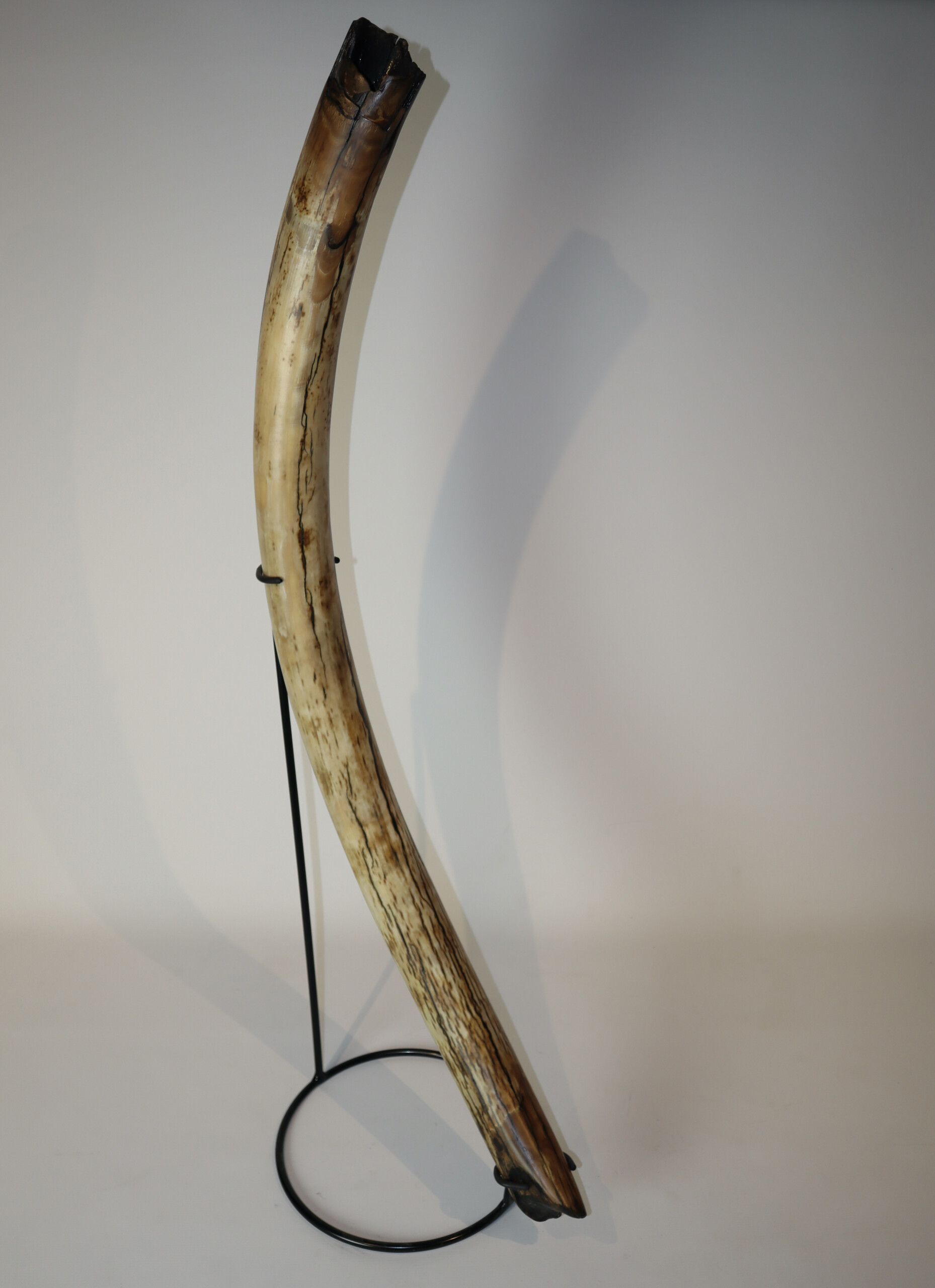 On offer is an almost complete tusk of a female Woolly Mammoth from the Pleistocene era. The tusk measures 137 cm (53.8 inch) over the curve and is a truly beautiful piece. The item has a wonderful curve and on top of that has some absolutely stunningย grey, brown and white colouring and fantastic patterning. A crack has been professionally repaired and the tip of the tusk is missing, but otherwise this tusk is in a good state of preservation. The black and white section of the ruler in the image represents 10 cm (3.9 inch). This piece has been applied with a matt finish, but it is also possible to order it with a glossy finish.