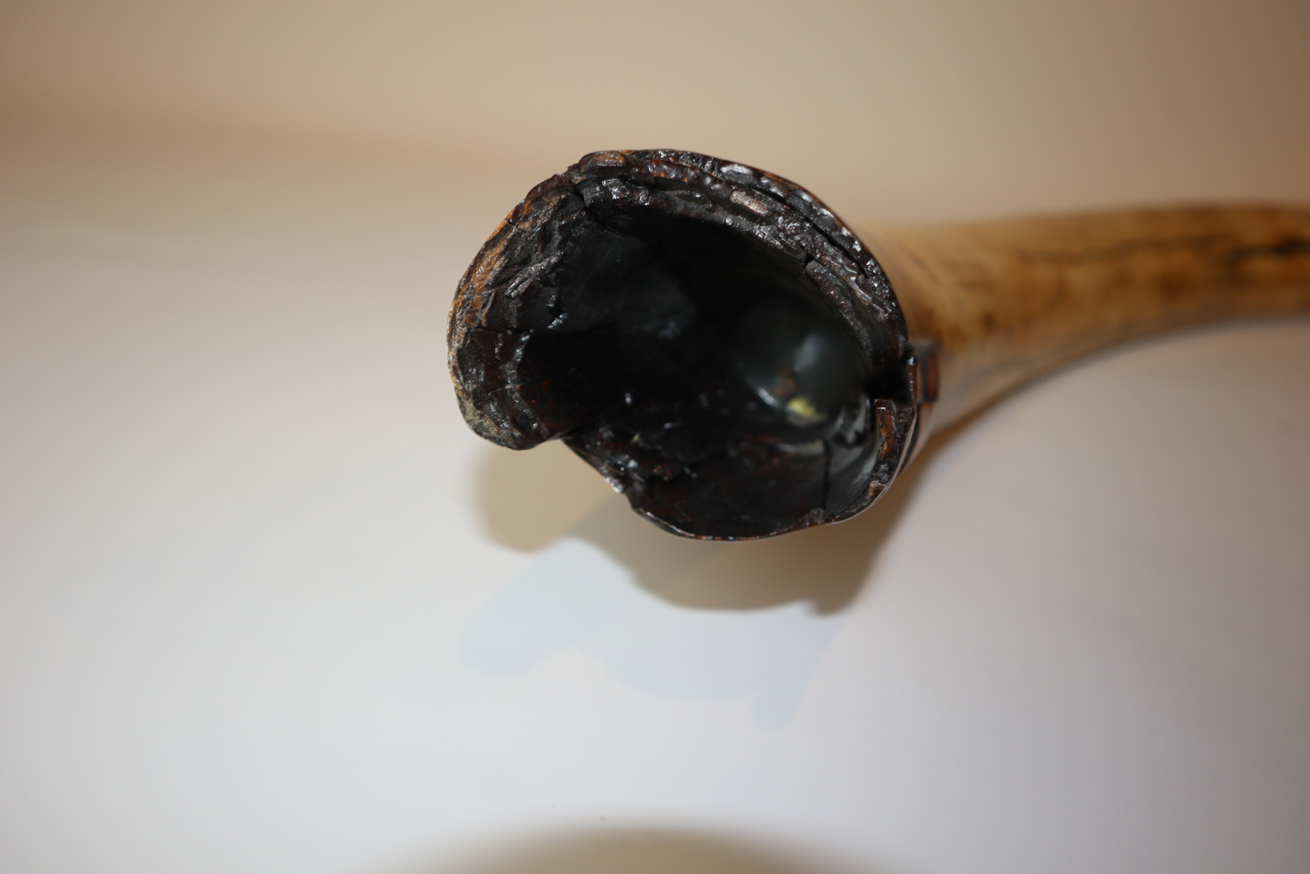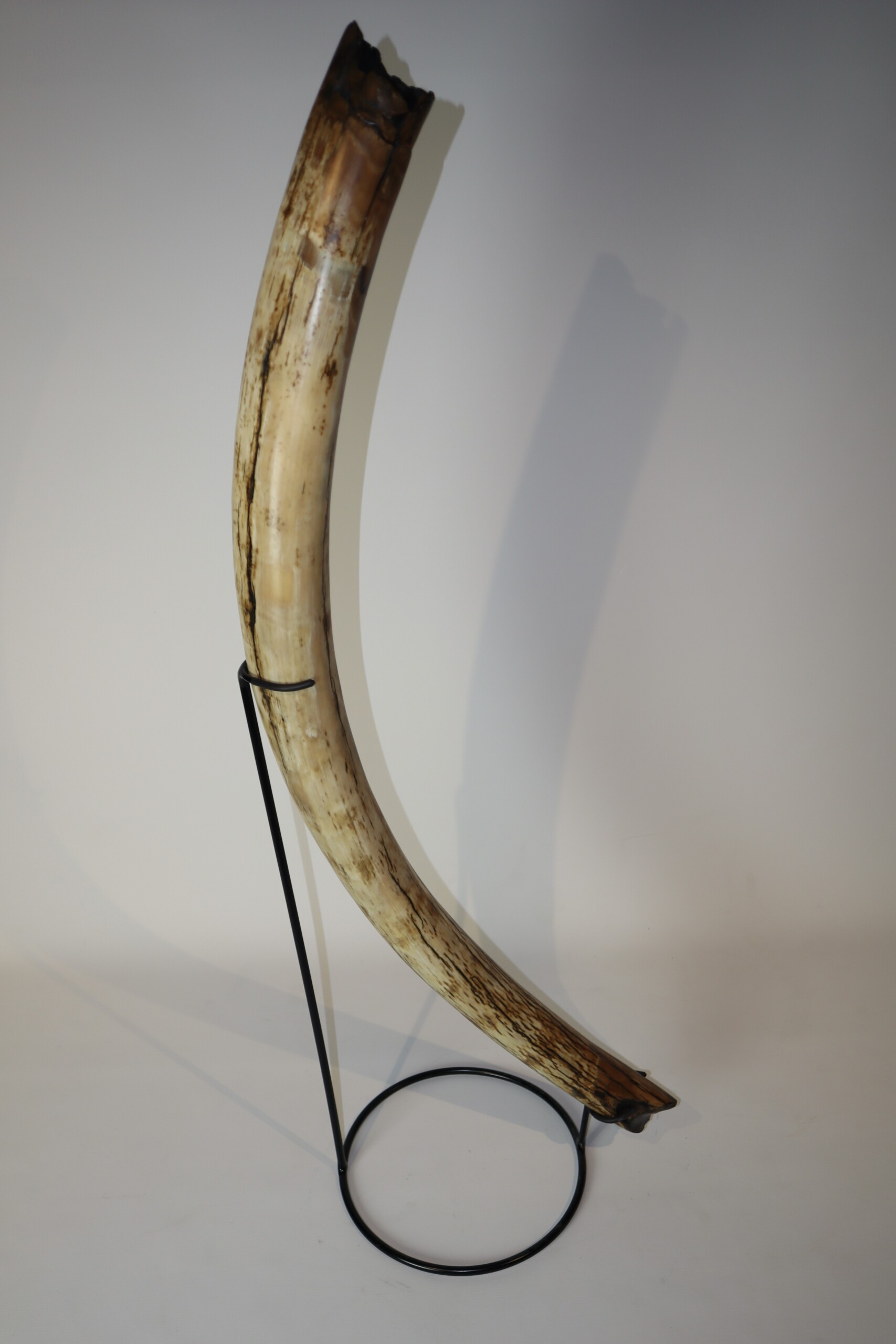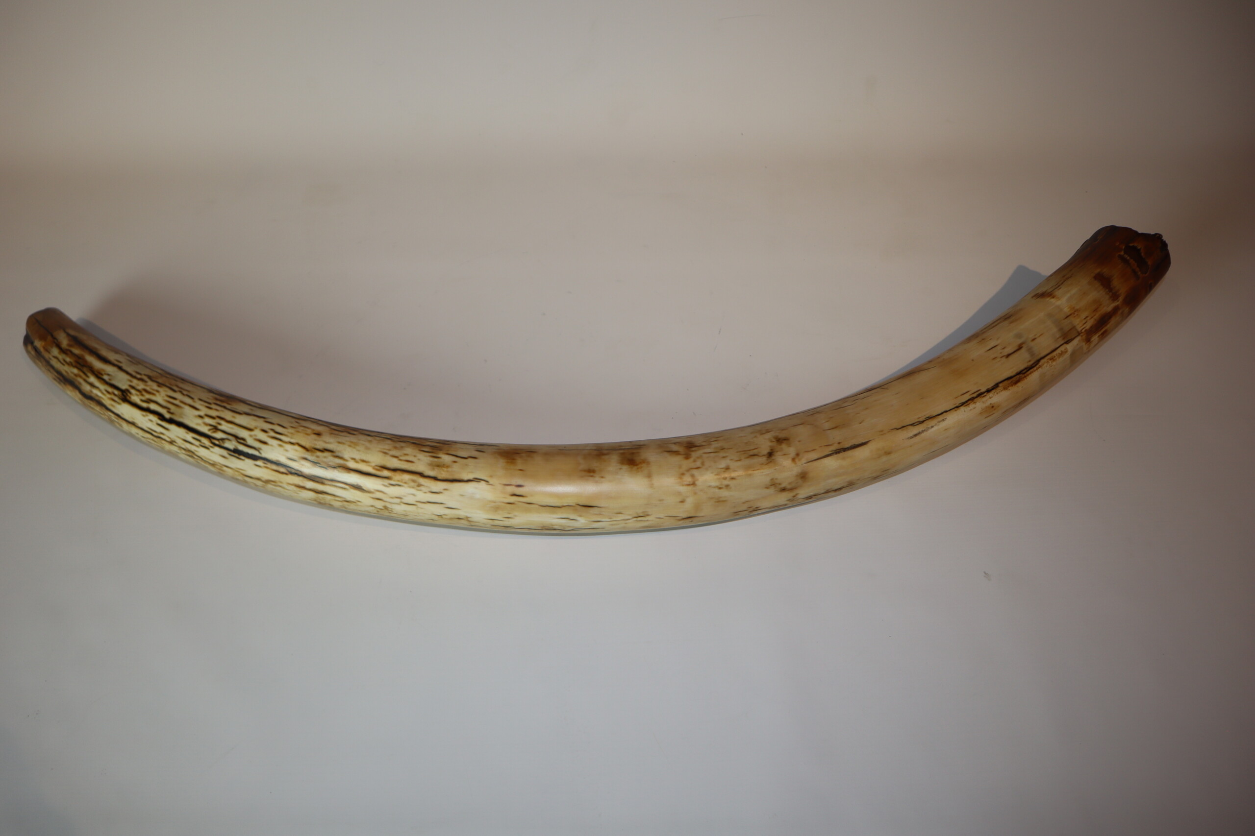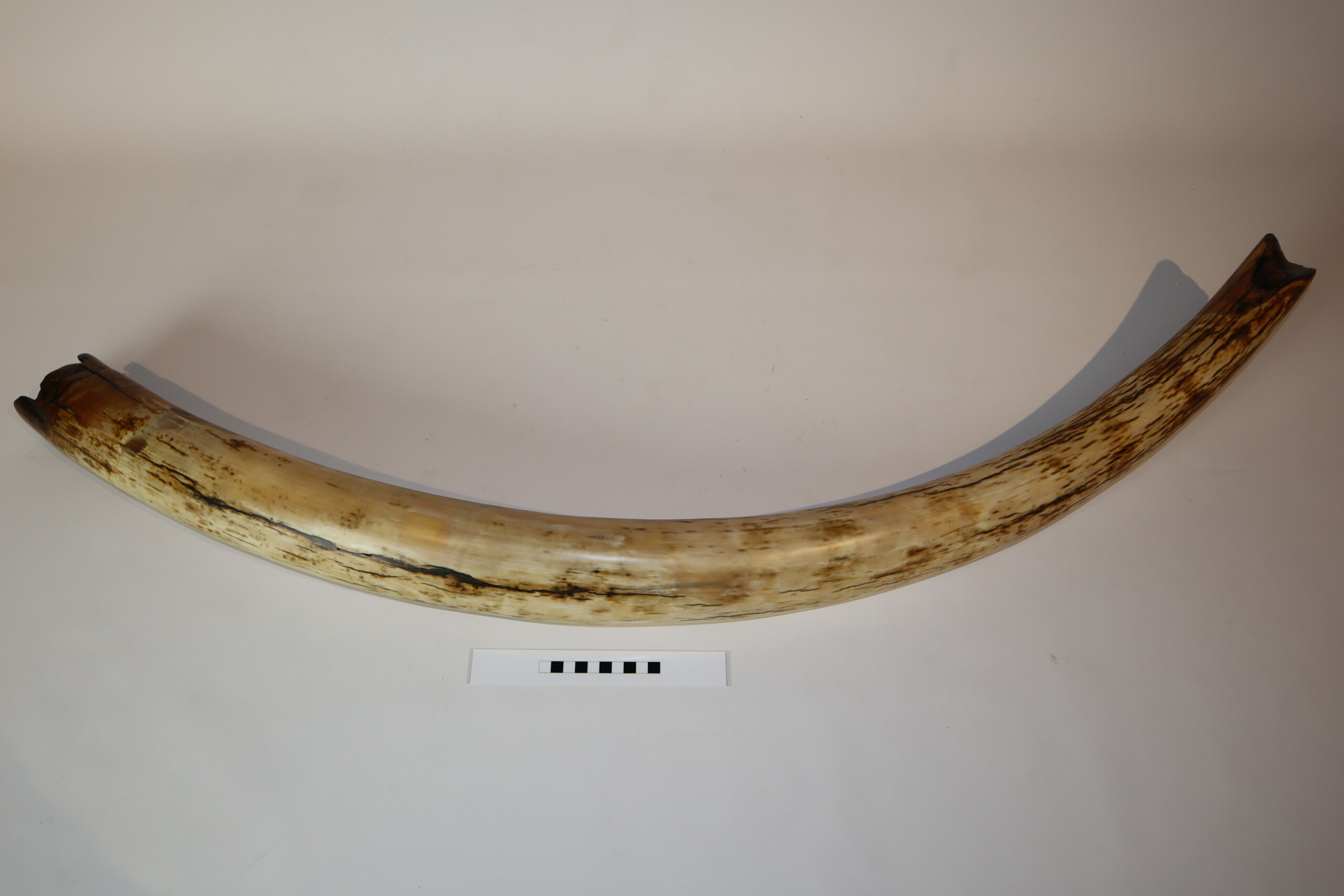 On offer is an almost complete tusk of a female Woolly Mammoth from the Pleistocene era. The tusk measures 137 cm (53.8 inch) over the curve and is a truly beautiful piece. The item has a wonderful curve and on top of that has some absolutely stunningย grey, brown and white colouring and fantastic patterning. A crack has been professionally repaired and the tip of the tusk is missing, but otherwise this tusk is in a good state of preservation. The black and white section of the ruler in the image represents 10 cm (3.9 inch). This piece has been applied with a matt finish, but it is also possible to order it with a glossy finish.