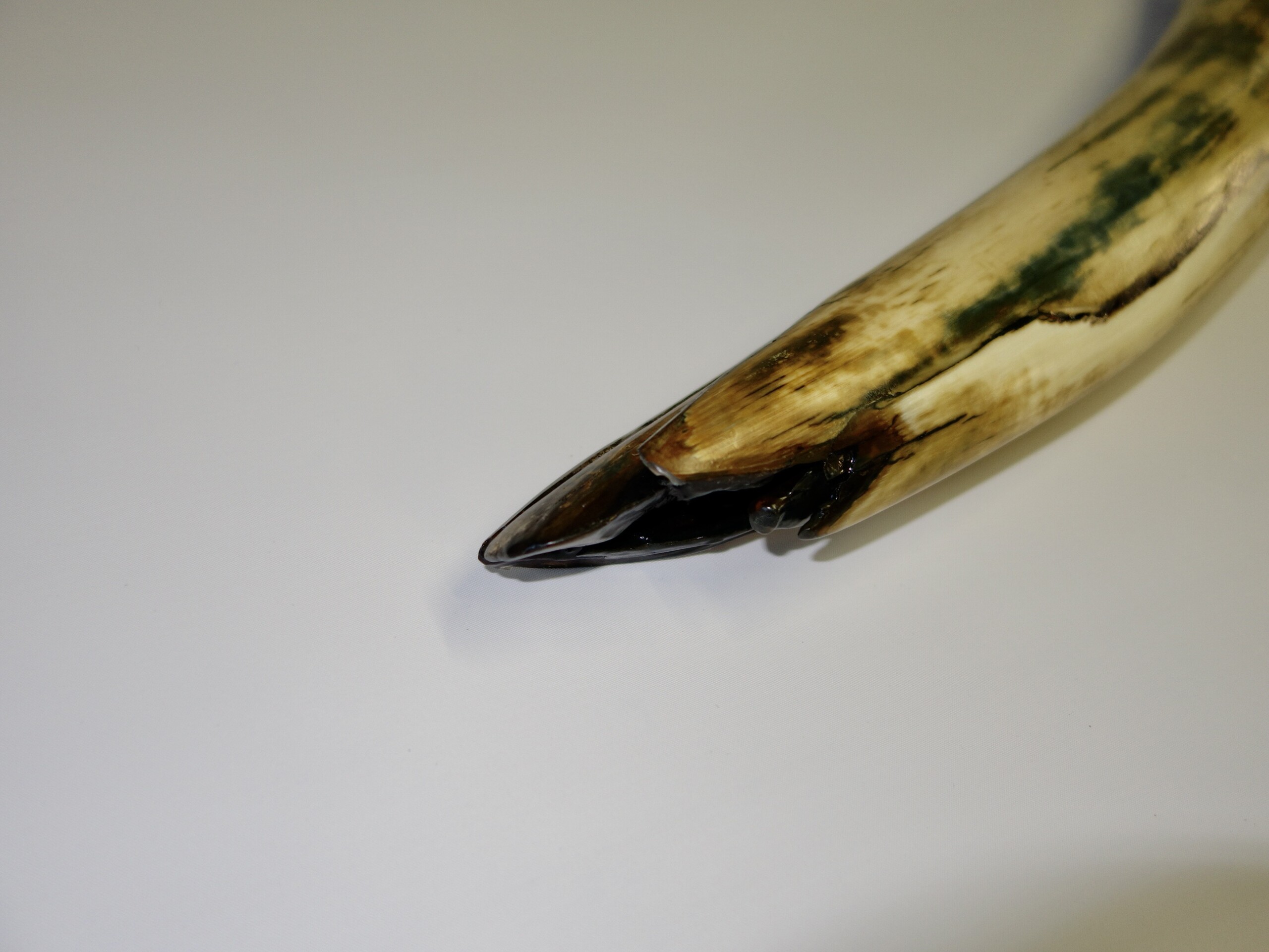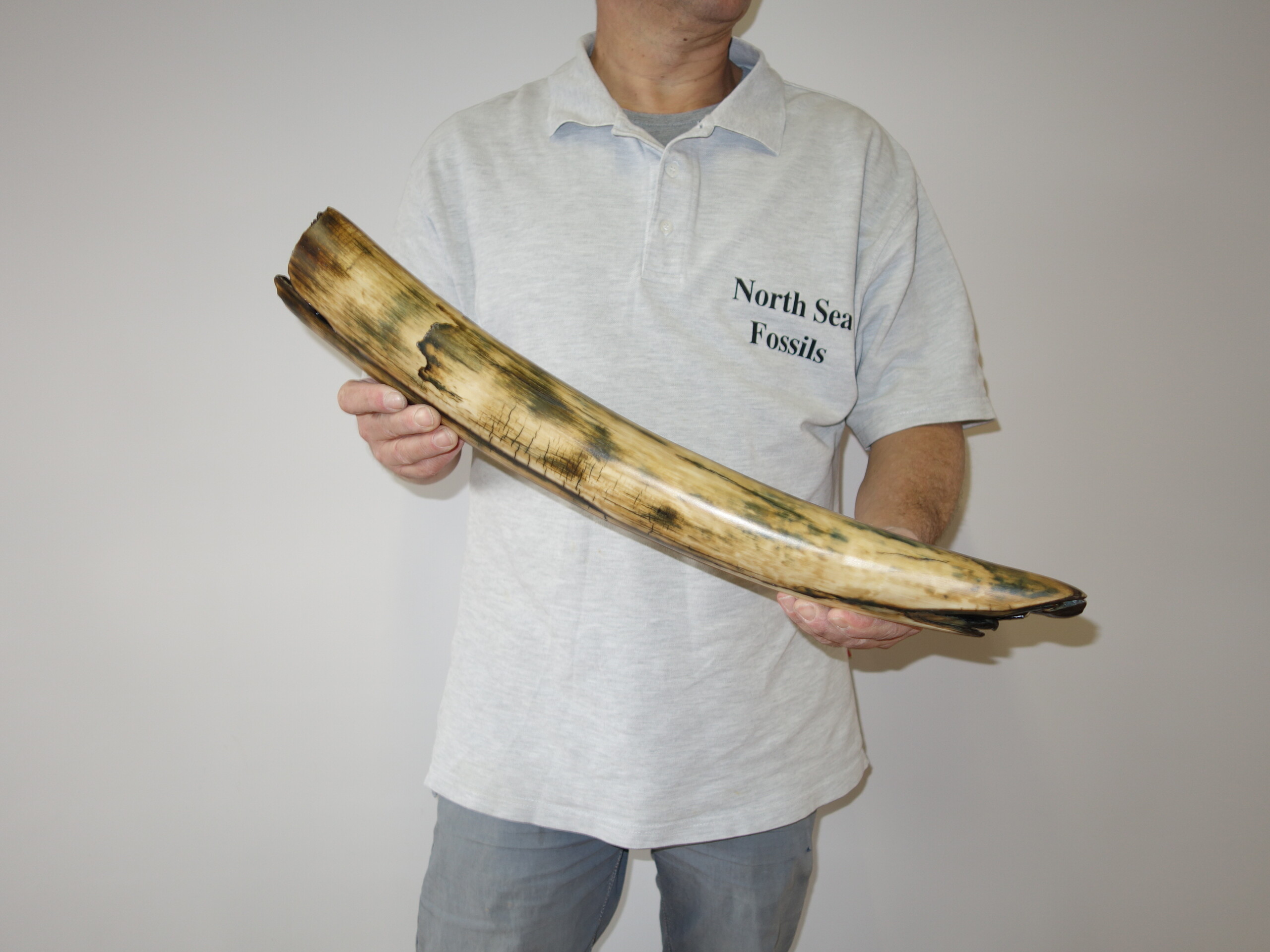On offer is a gorgeous piece of tusk of a Woolly Mammoth, in excellent condition. This tusk piece is of beautiful colouring of mainly white, gold, grey and black ivory, and with fantastic patterning. This is a large part of the middle part of the tusk, part of the base and the tip are still present. No restoration whatsoever. The black and white section of the ruler in the image represents 10 cm / 3.9 inch. Would have belonged to an adult Mammoth, judging from the circumference. This piece has been applied with a matt finish, but it is also possible to order it with a glossy finish.